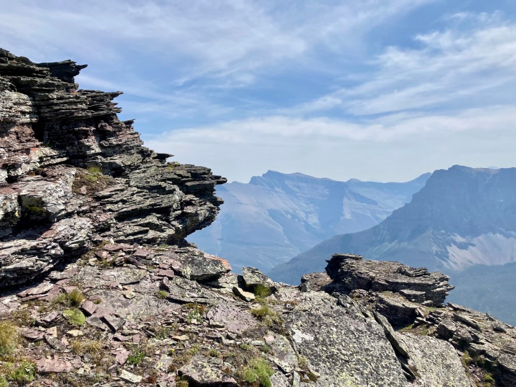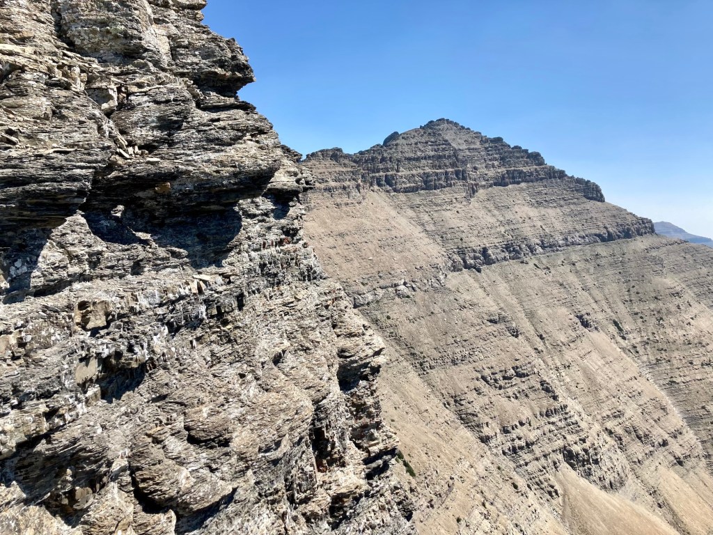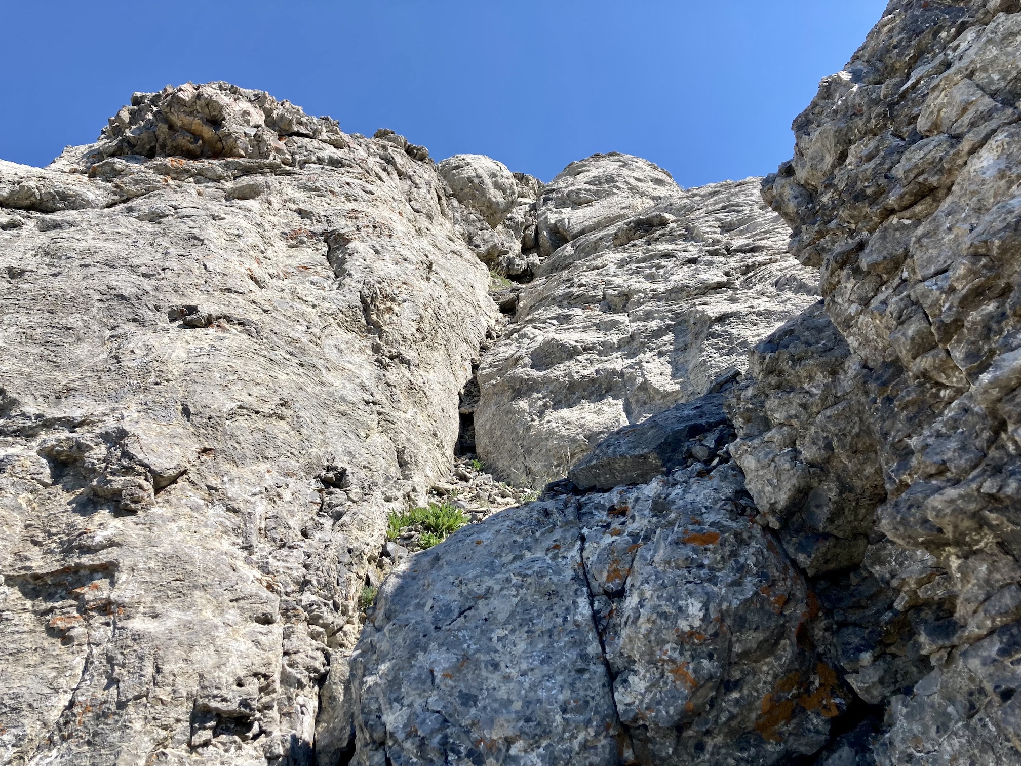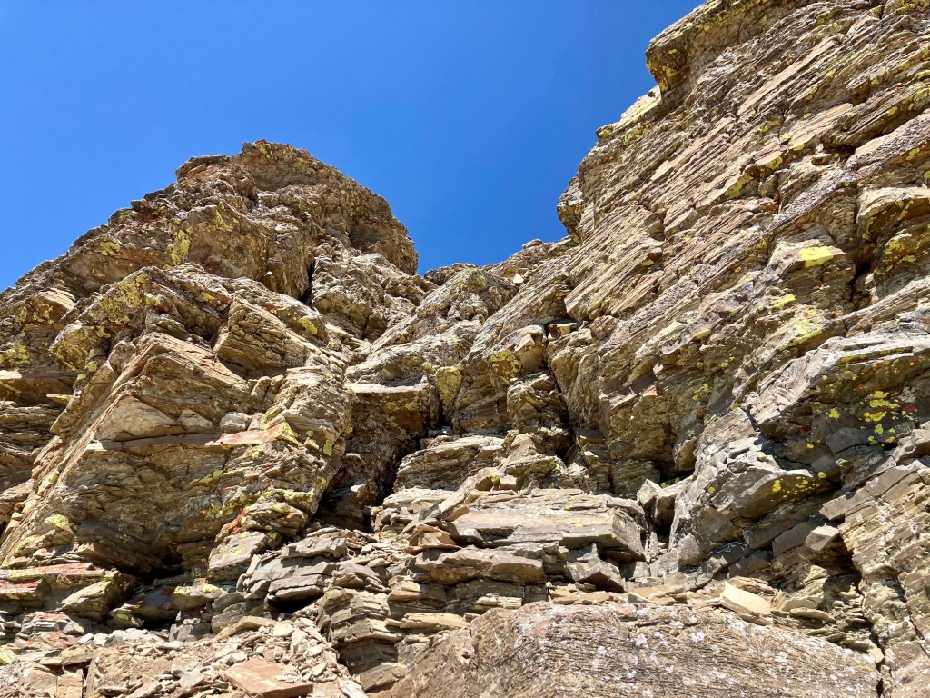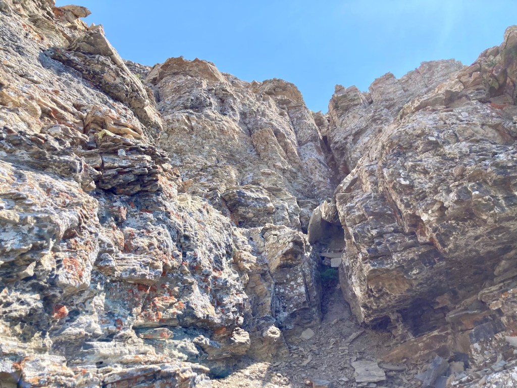 Like essentially all of the mountains in Waterton and the Castle, the rock changed to a black colour with green lichen near the top of the ridge. Nugara suggests departing the ridge at this point and traversing left to a boulder-filled gully, ascending it through the black rock band. I ended up staying on the ridge for some distance beyond that point (mostly because I forgot the advice) and engaged in some trickier scrambling. Eventually, while still on the black rock, I left the ridge and crossed to the left across a bay of rubble. On the other side of the rubble, I rounded a corner on the black rock and then traversed further until I found a weakness and ascended. Once back on sand-coloured rock I went left until I found a weakness. After ascending a scree slope I saw the summit a short distance ahead above one final rock band. A bit more moderate scrambling and I was up.
