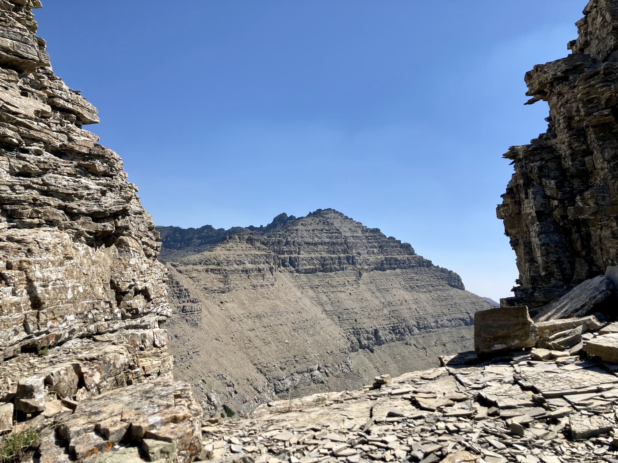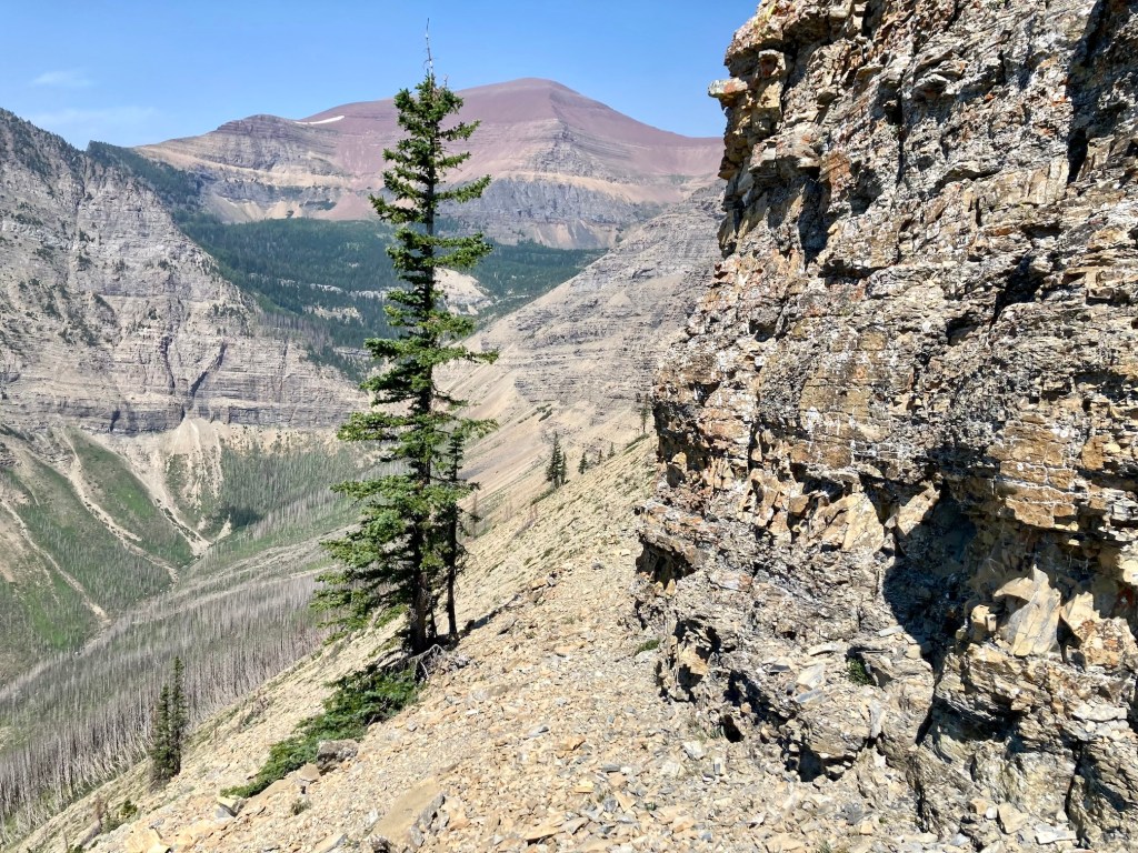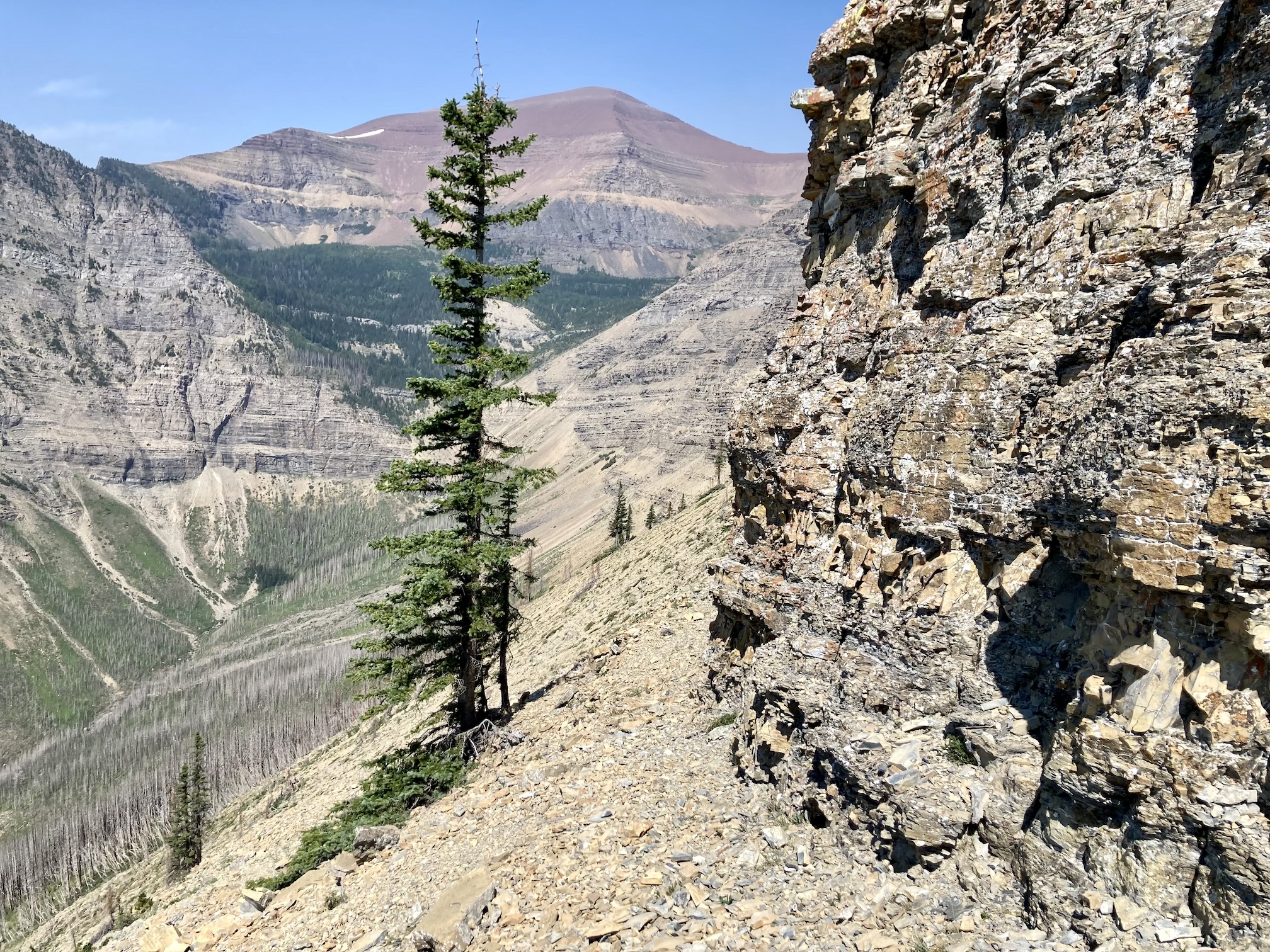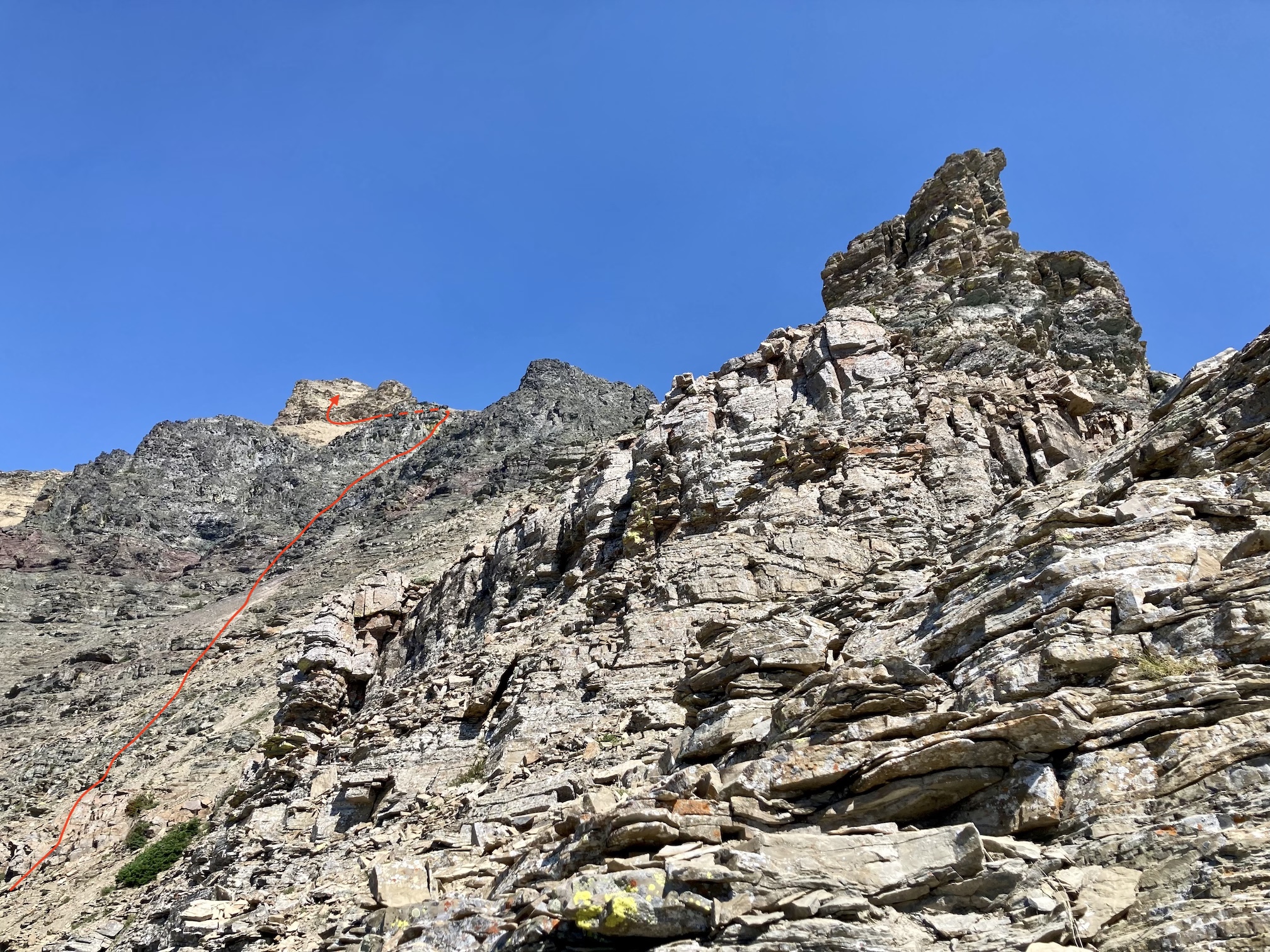 Route overviewA closer look at the route at and above the level of the black rocks. I sketched in the route that I think Nugara describes.The start of the off-trail route, a broad drainage a little over 2 km from the Snowshoe trailhead. I walked up it for a while then got up onto the left bank.After a short time, a slow and steady rise begins on both sides of the drainage. With the forest burned it’s easy to see which way to go. As long as you’re to the left of the drainage you can’t go wrong.If you stick near the edge of the trees, you’ll have a couple of chances to get nice views like this. The contour of the ascent ridge is apparent in the distance on the left – a series of rock bands with cliffs to the right side.Out of the burned forest. The scrambling starts straight ahead.Pick a route and go. Any place that looked too challenging for my liking I bypassed by going left until I found a weakness. The rock was reasonably supportive, but there was a lot of rubble and sometimes holds would pull out or crumble away.More scrambling.Traversing left around some vertical terrain. Newman Peak is in the background.A little chimney to ascend.Eventually I could see the black rocks in the distance. As much as possible I stayed on the ridge, but much of the scrambling could be avoided by heading left. At the top of the rocks straight ahead I found a little cairn.There was a white layer a short distance below the black layer. I once again found myself wishing I knew something about geology.The white rock was quite nice and solid. I climbed up here.Looking left, just above the white strata. The black rocks start soon.The smoke cleared briefly and I had a nice view south across the valley to Anderson Peak.Some pretty vertical terrain to the right side of the ridge.Taking a break in a little notch, looking towards the un-named outlier to the southeast.Almost to the black rocks. The red line is my sketch of what I’m guessing is Nugara’s suggested route. I ended up staying on the ridge and taking a more convoluted approach.One particular area of the black rocks had an interesting configuration, with a line like a zig-zag staircase up almost vertical rock. Notice that there are at least two large stones perched precariously over the edge at the top of this face.A red band interrupts the black rocks for a few meters.Climbing along the black rocks. Eventually I got to a point where I wasn’t so sure I’d be able to egress if needed. I started looking left.Crossing the bay of black rocks. In retrospect this may have been the upper reaches of the gully Nugara described.I went around the corner up ahead and found a way up. If the rocky bay was, in fact, Nugara’s ascent gully I just made things harder for myself. Oh well. It was all moderate scrambling terrain and I didn’t put myself into any precarious situations.After rounding the corner, I traversed left until I found a safe way up.Above the black rocks. The summit block is straight ahead, but the summit itself is still hidden.I wasn’t so sure I could climb this. I think McMurray did, though. I went left and found a short climb to a scree slope and ascended.A little cairn at the top of the scree slope, with the true summit and summit cairn beyond. I’m not sure what the little cairn was supposed to mark – maybe someone got to this point and said “screw it, I’m done”.The summit cairn. I didn’t capture it in this picture, but small pinnacles almost made a staircase from this spot up onto the summit.Summit panorama looking north. The long ridges and peaks of the Castle front ranges were out of the smoke for a short time. Newman Peak, Spionkop Ridge, Mount Roche, Loaf Mountain, Drywood Mountain, Pincher Ridge, Victoria Peak, and Windsor Mountain are visible. Lost in the haze in the distance are Mount Darrah and surrounding peaks.Looking down the ridge extending northeast from the summit, pointing towards Mount Roche (“Spread Eagle Mountain”).Looking east. Beyond the intervening ridge are Cloudy Ridge, Mount Dungarvan, “Rogan Peak”, and Mount Galwey.Looking south, where the smoke was more dense. Mount Blakiston dominates the view. The outline of Mount Cleveland can be seen in the background to the left.Anderson Peak directly across the valley. In the background are Kintla Peak, Long Knife Peak, King Edward Peak and Starvation Peak.Looking west into haze and smoke. Heading back down.Enjoying a break by the creek. I re-joined the initial ascent drainage a little upstream of where I left it so I could find some running water. It was a hot, smoky day.