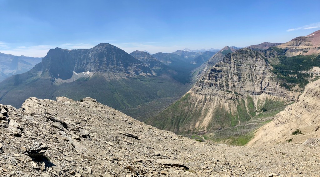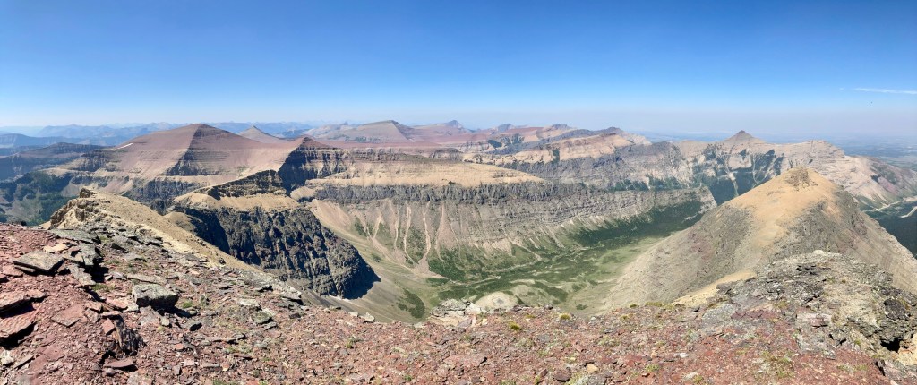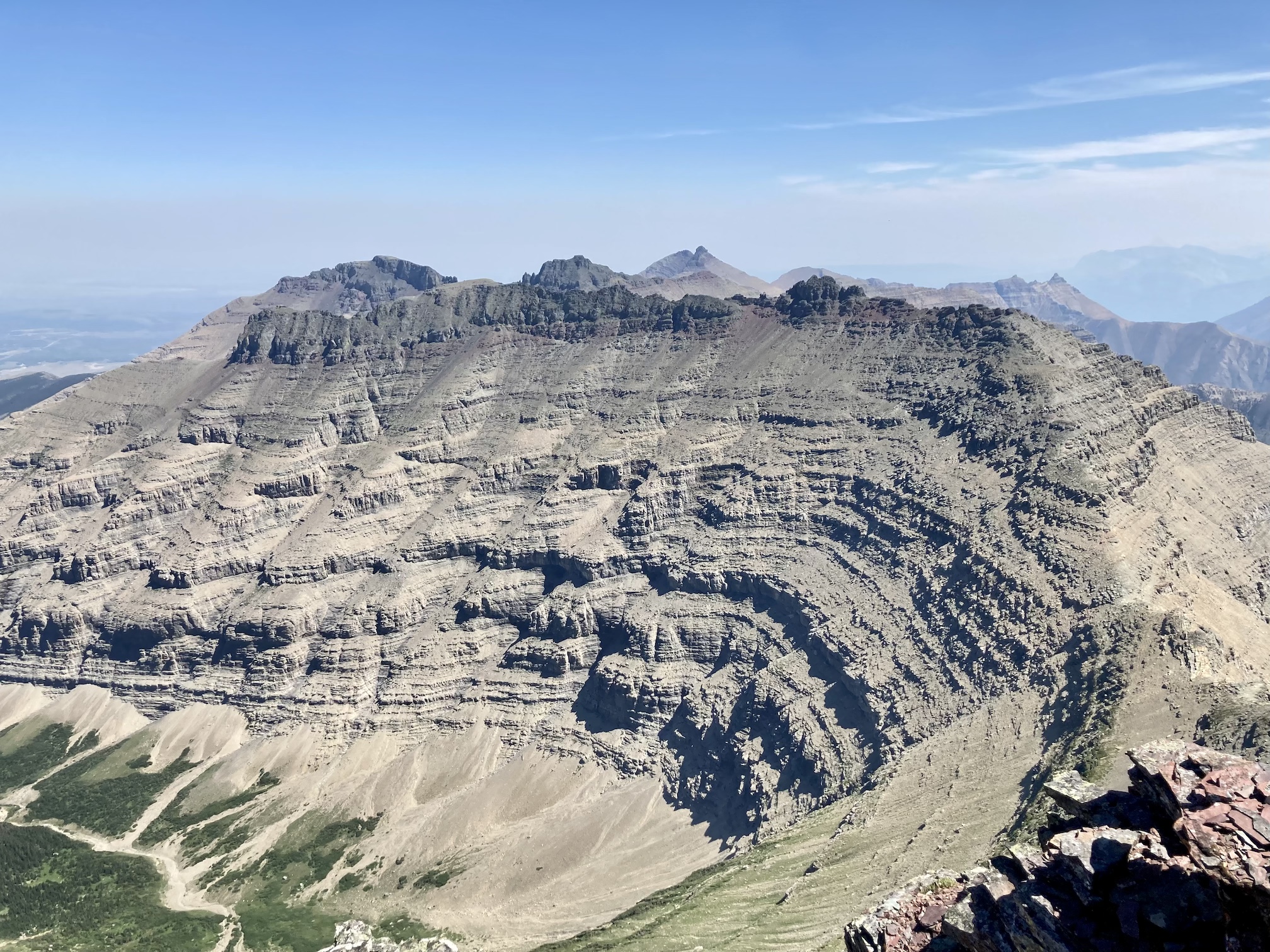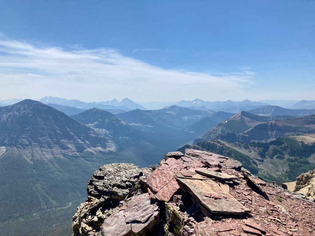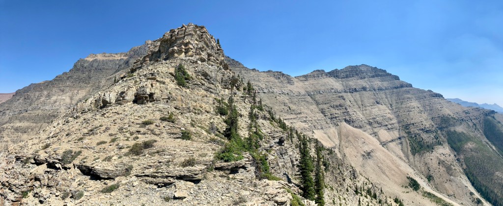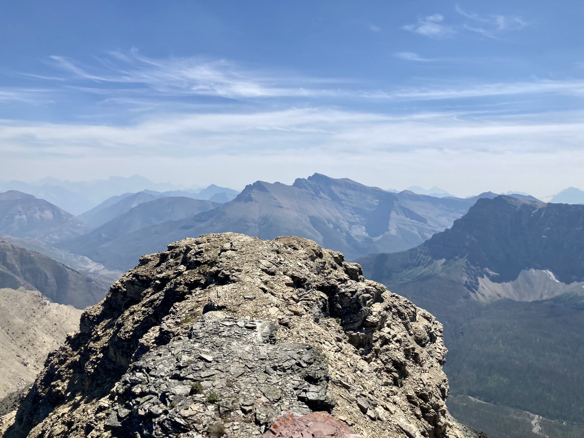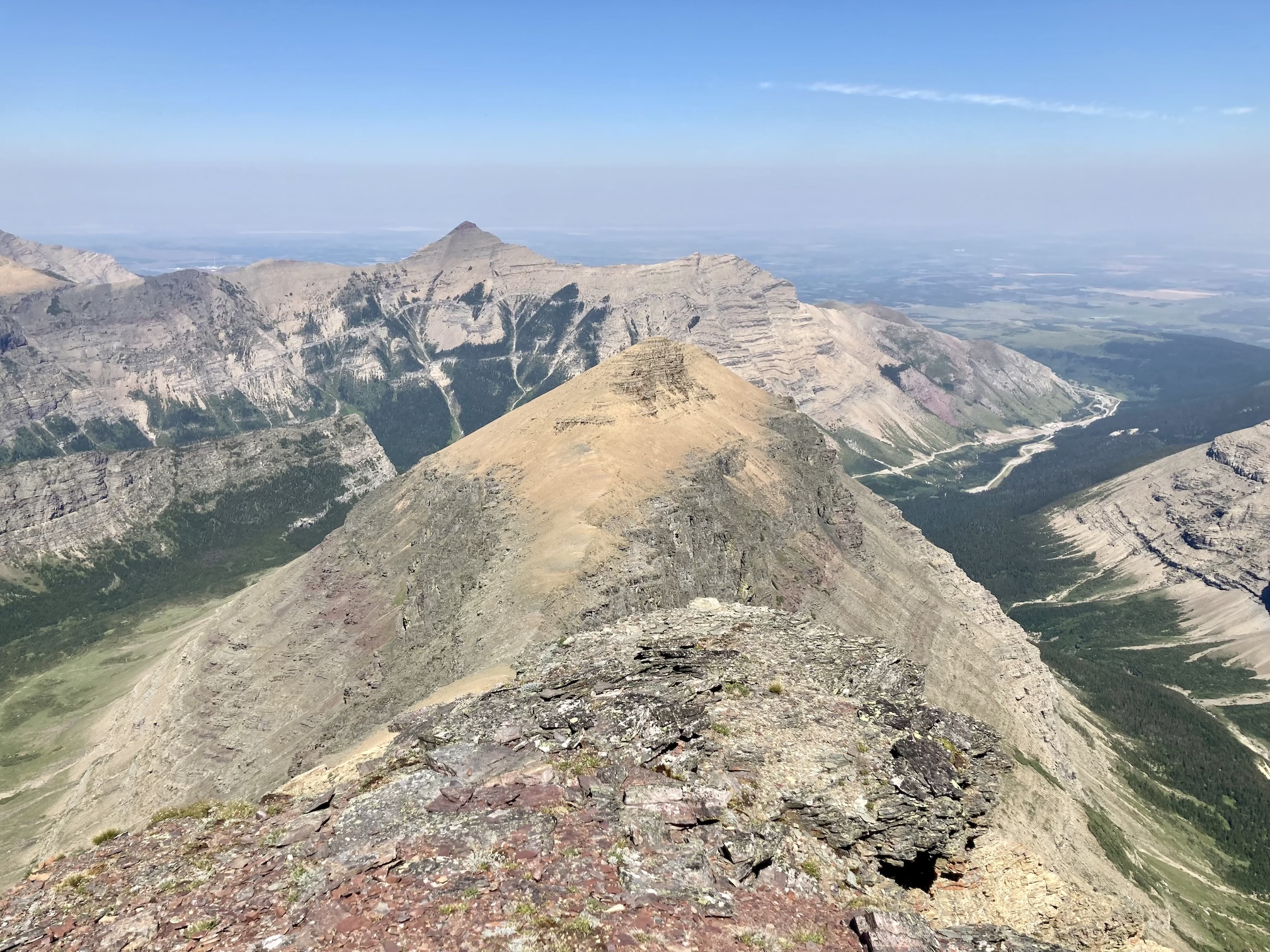 The smoke was thickest to the west and south when I reached the summit. Views to the north in the middle-distance were not bad. I had a good look at some of the peaks in the Castle. On a clear day I imagine there would have been great views all the way to the Crowsnest Pass in the north, B.C. to the west, and Glacier National Park to the south. I didn’t stay on the summit too long. It was very hot, the air smelled of smoke, and there were innumerable flies buzzing around.