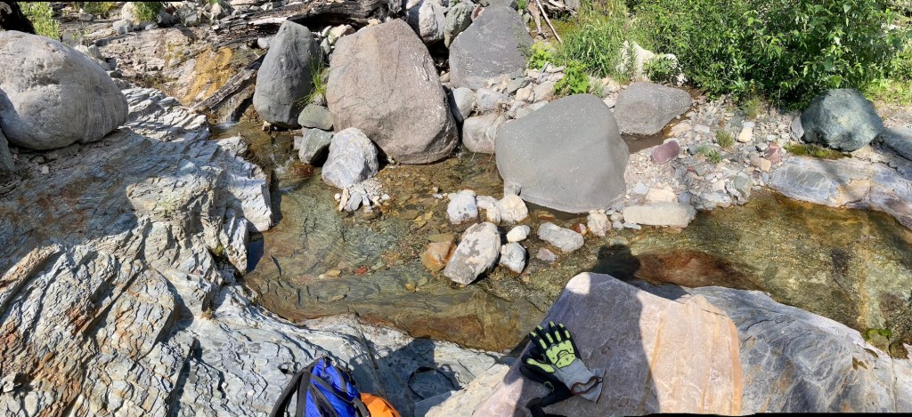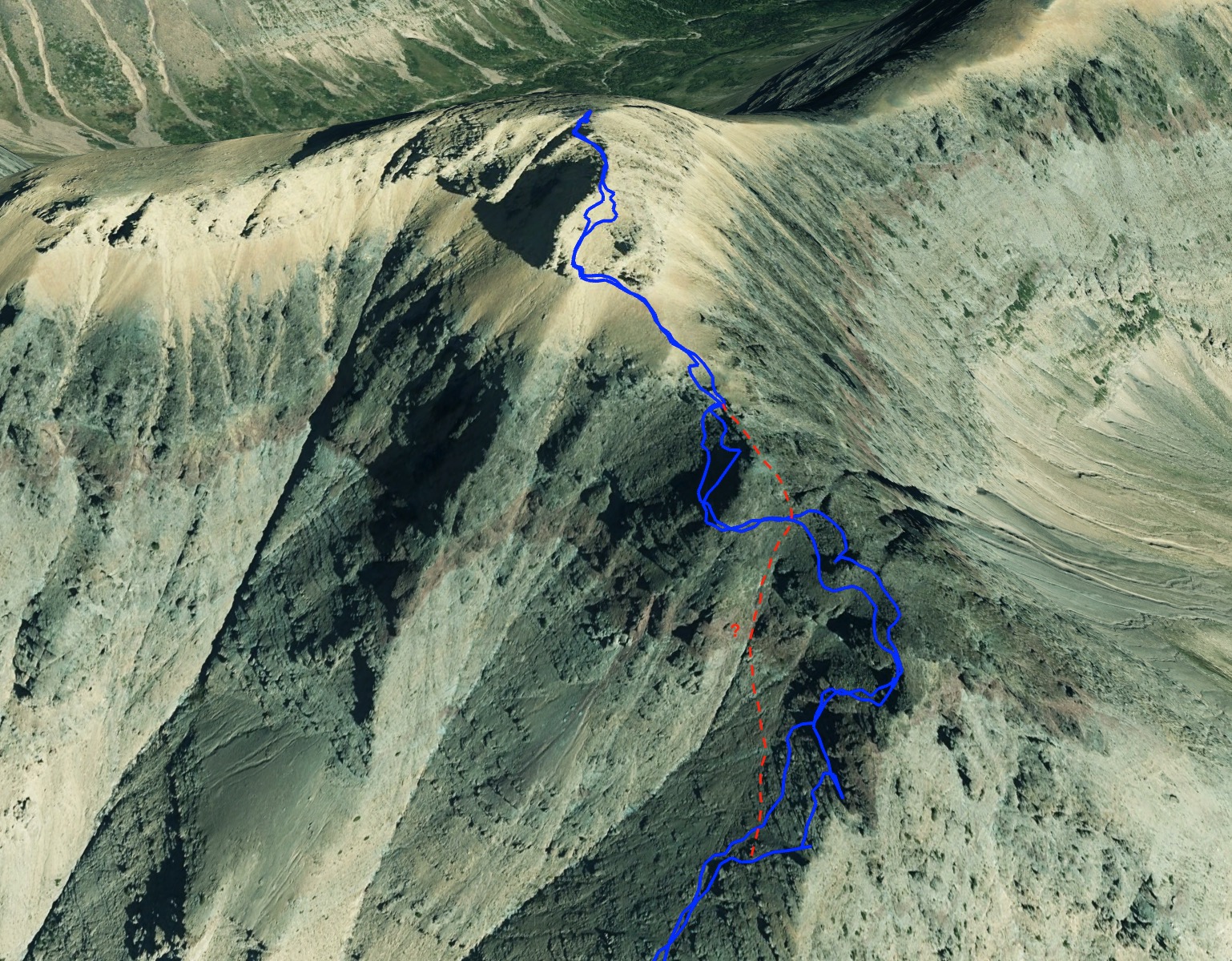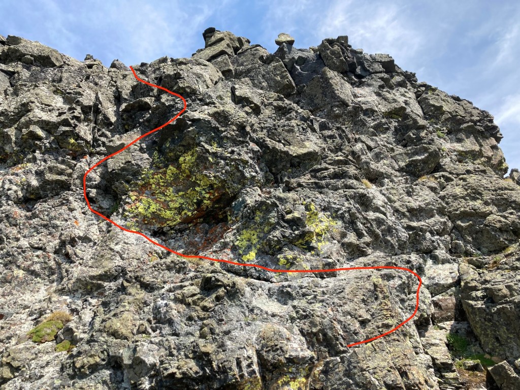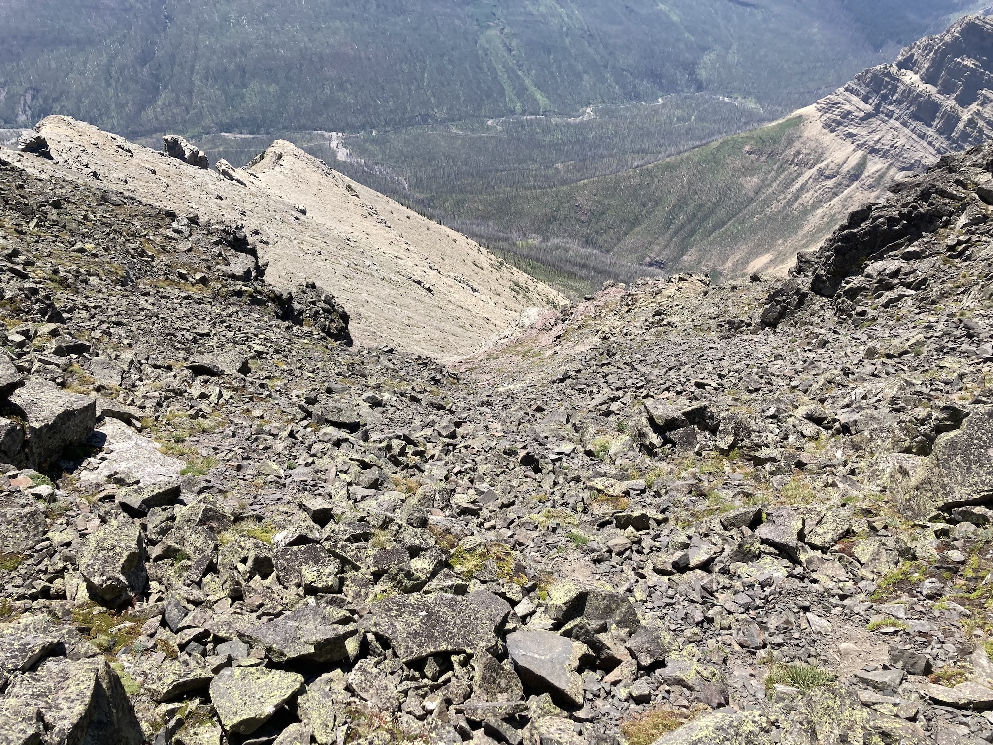 For my descent I retraced my steps. I bore a little to the right to bypass some down climbing, but I think I didn’t go far enough. I ended up dealing with annoying terrain that was scree-covered, but also strewn with slabs and ledges. I should have gone farther right to avoid the troublesome terrain then cut back to the ridge just above the tree line.
