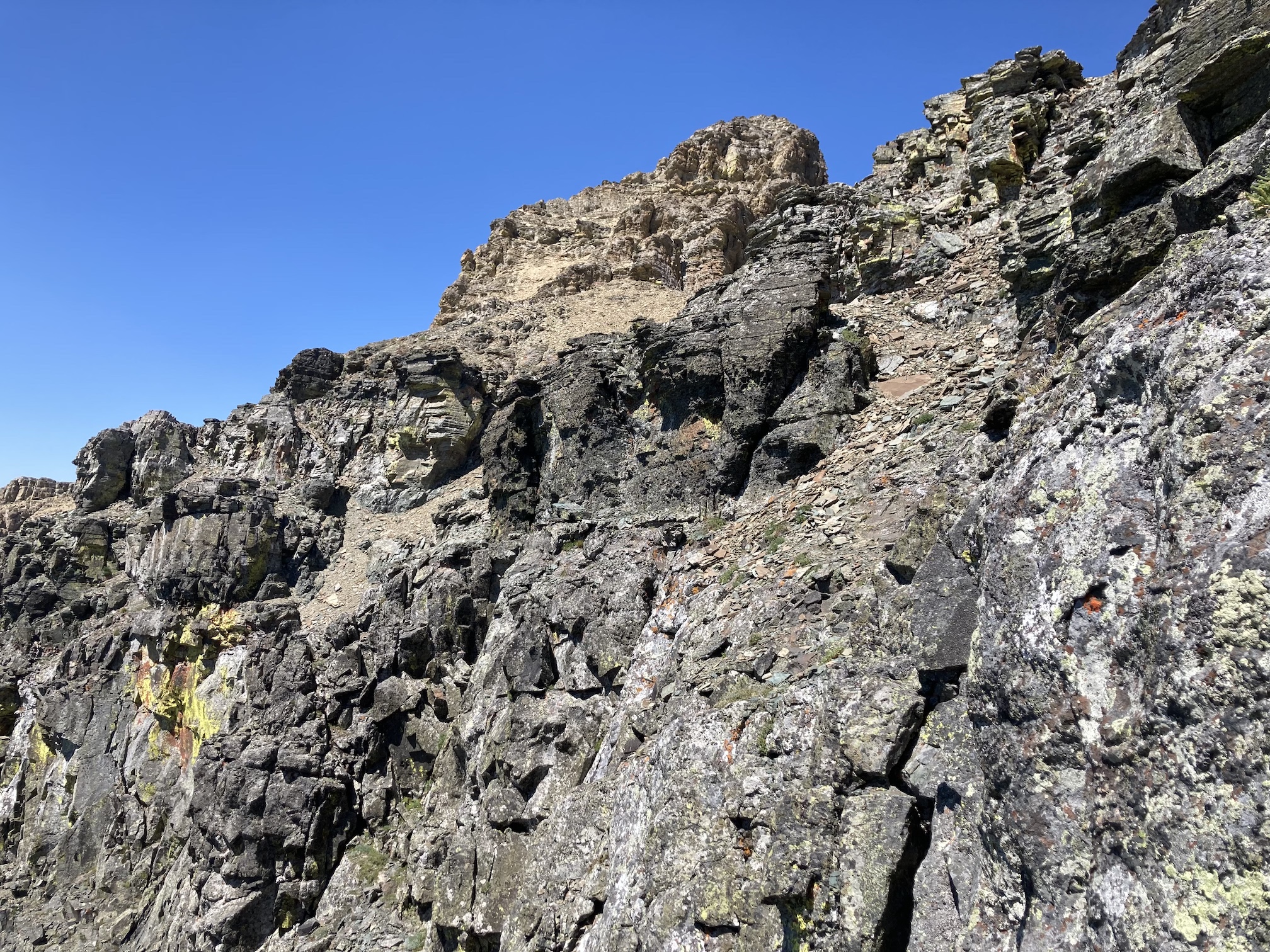 Once I was out of the trees, there was a very short walk up scree and rubble to the start of the scrambling. The entire remainder of the ascent was spent scrambling up successive rock bands on the ridge. Wherever things looked too risky for me I traversed left a bit to find a more agreeable route. Basically all of the scrambling could be avoided by staying far left from the ridge, but that would have turned this into a boring slog up scree on a hot and smoky day. Not exactly the reason anyone goes to the mountains. The rock along the ridge was mostly decent quality for scrambling, though the abundance of rubble on some ledges was aggravating. In a few places the rock was pretty awful – at one point I was very alarmed to pull a thick wedge of football-sized rock off a face I was about to climb.