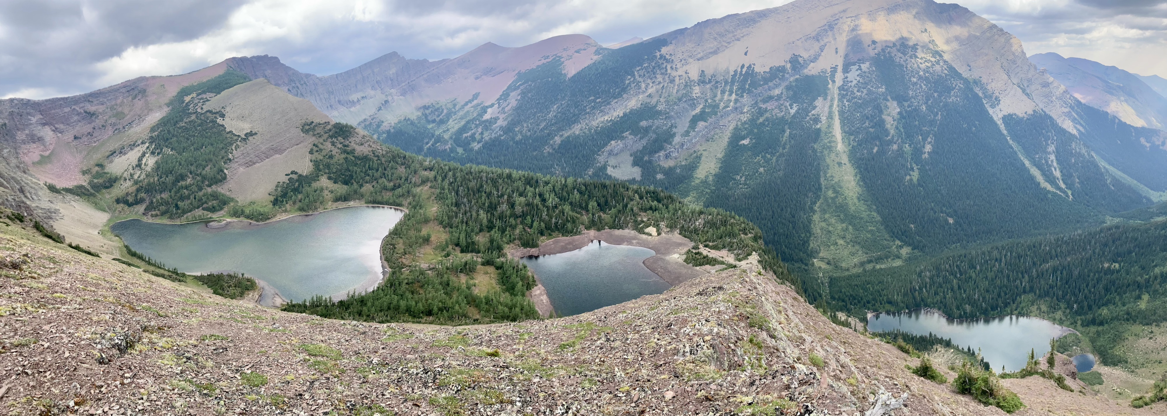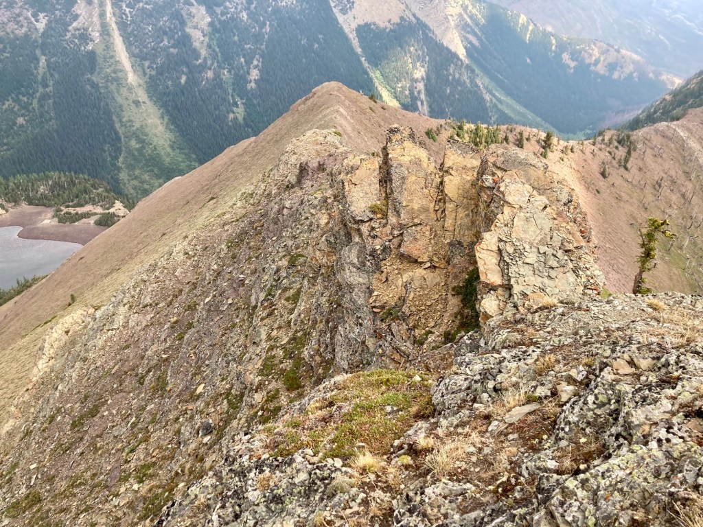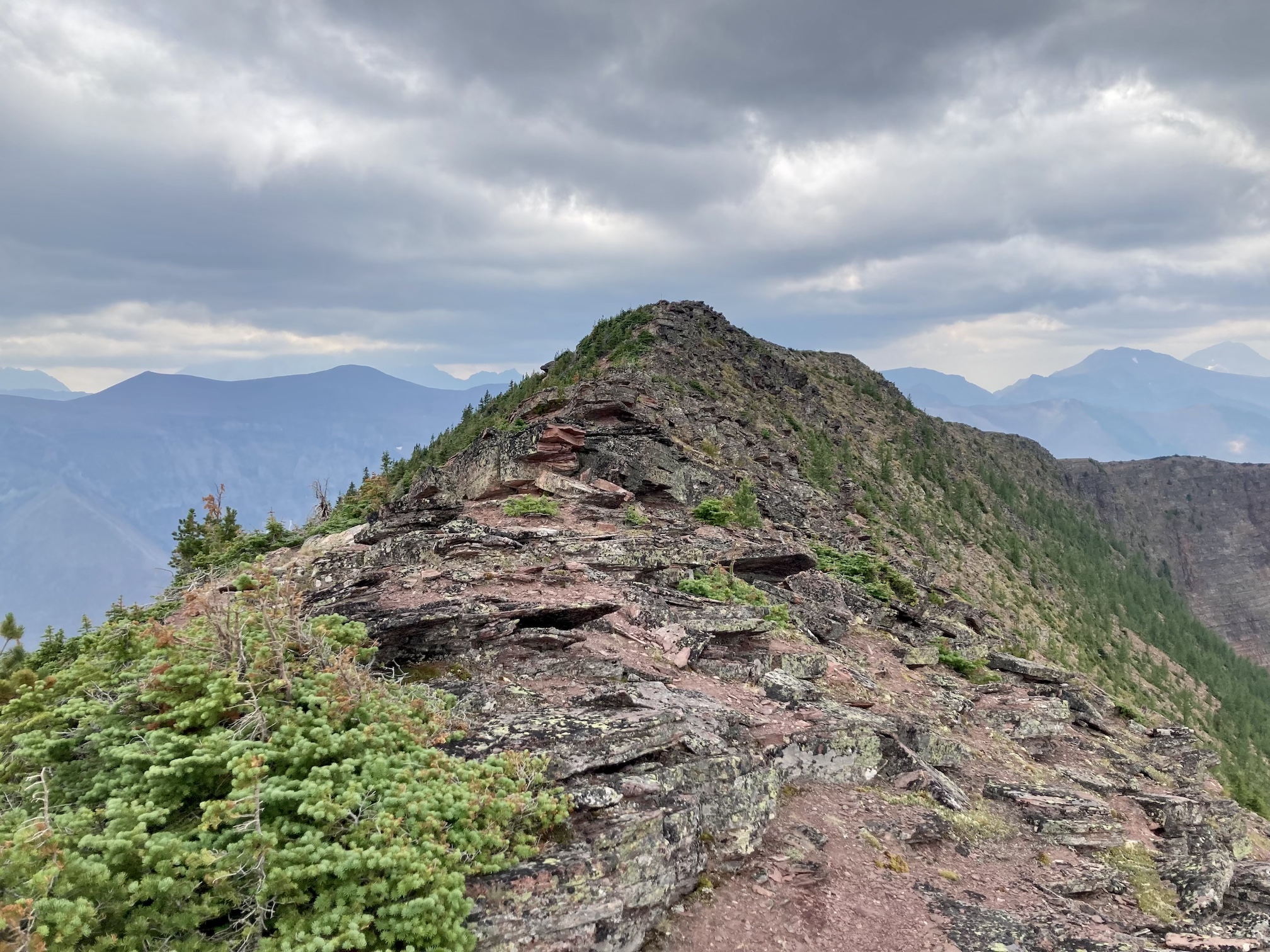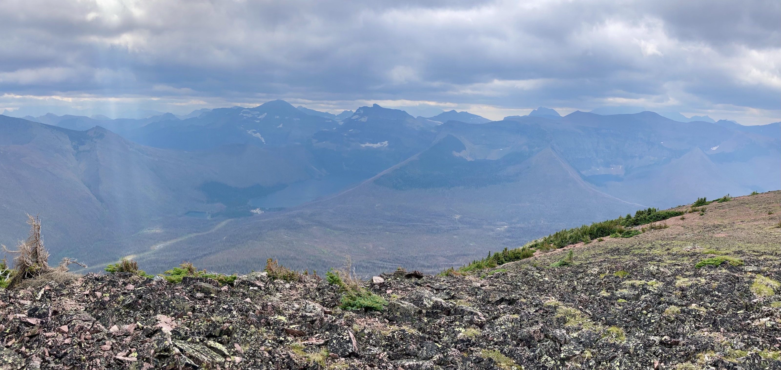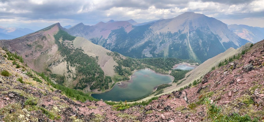 The weather was blustery and thick clouds combined with smoke to make the summit views to the west and south rather gloomy. Things were more clear north and east and I was pleased to see clear blue sky after a month of perpetual smoke. The views from the top include the environs of the Rowe Lakes as well as Cameron Lake and Akamina Pass (including Wall and Forum Lakes). Views into Glacier National Park are a little limited by Mount Rowe’s relatively low summit elevation, but I think they’d still be quite striking on a clear day.