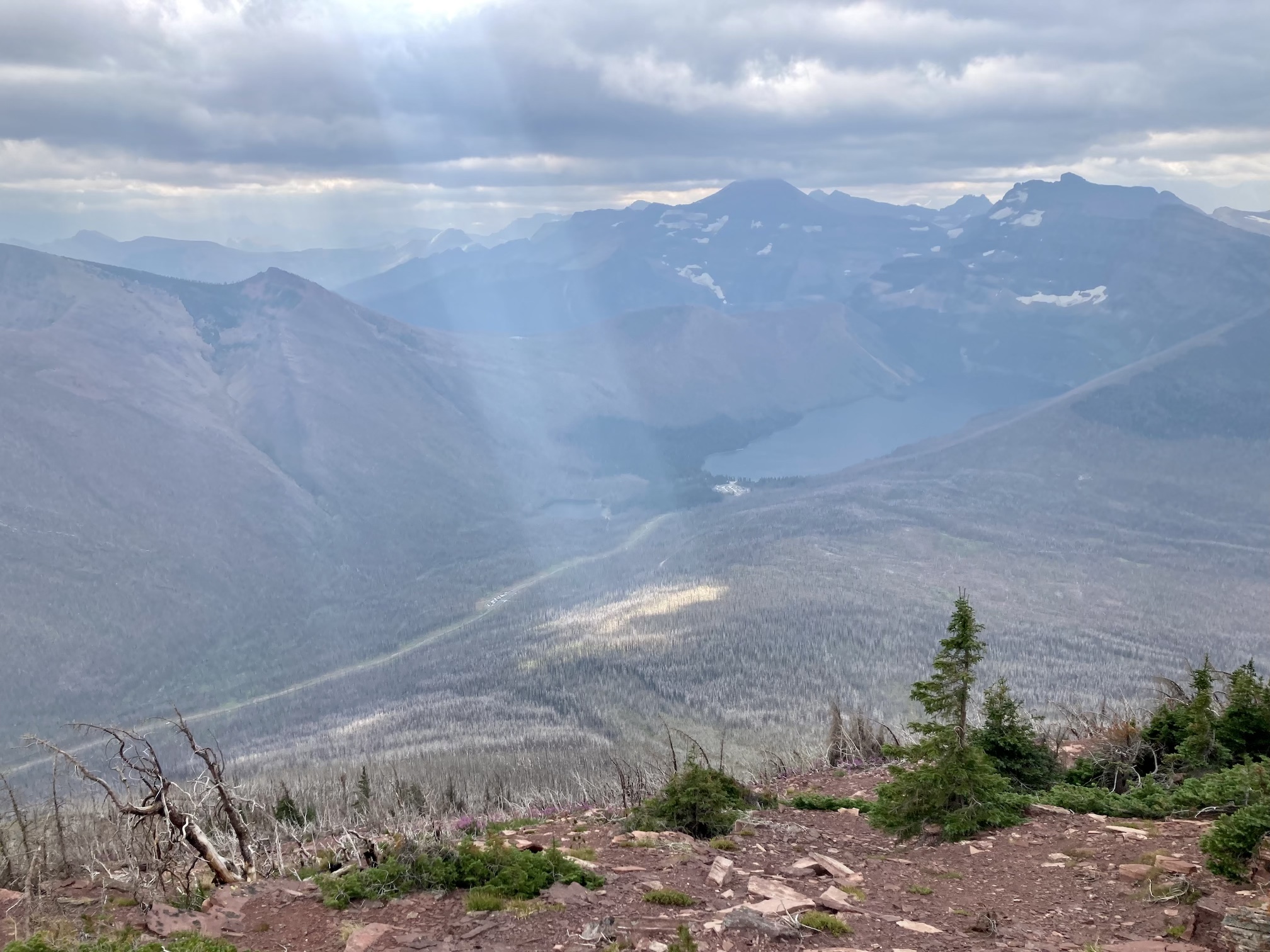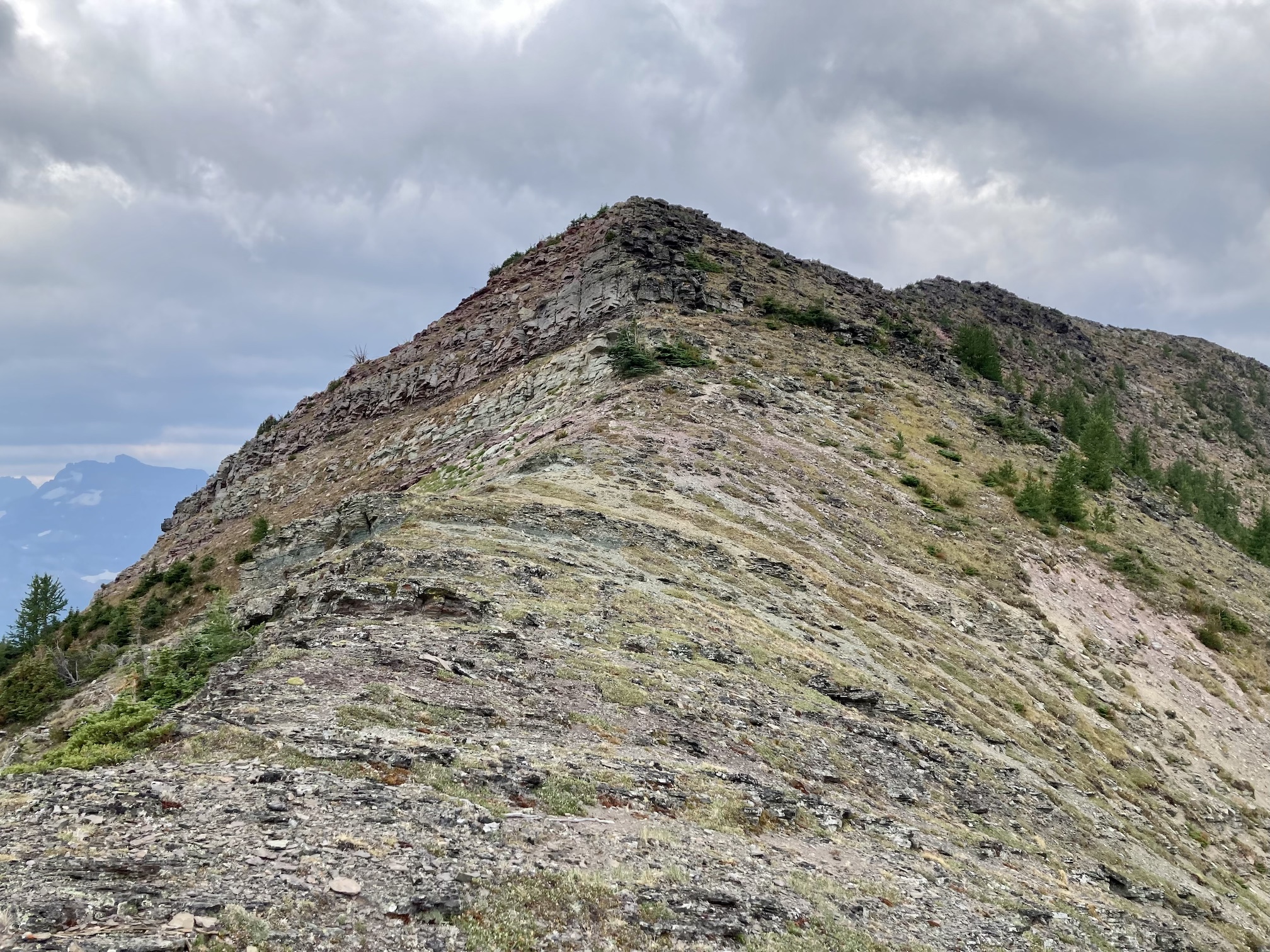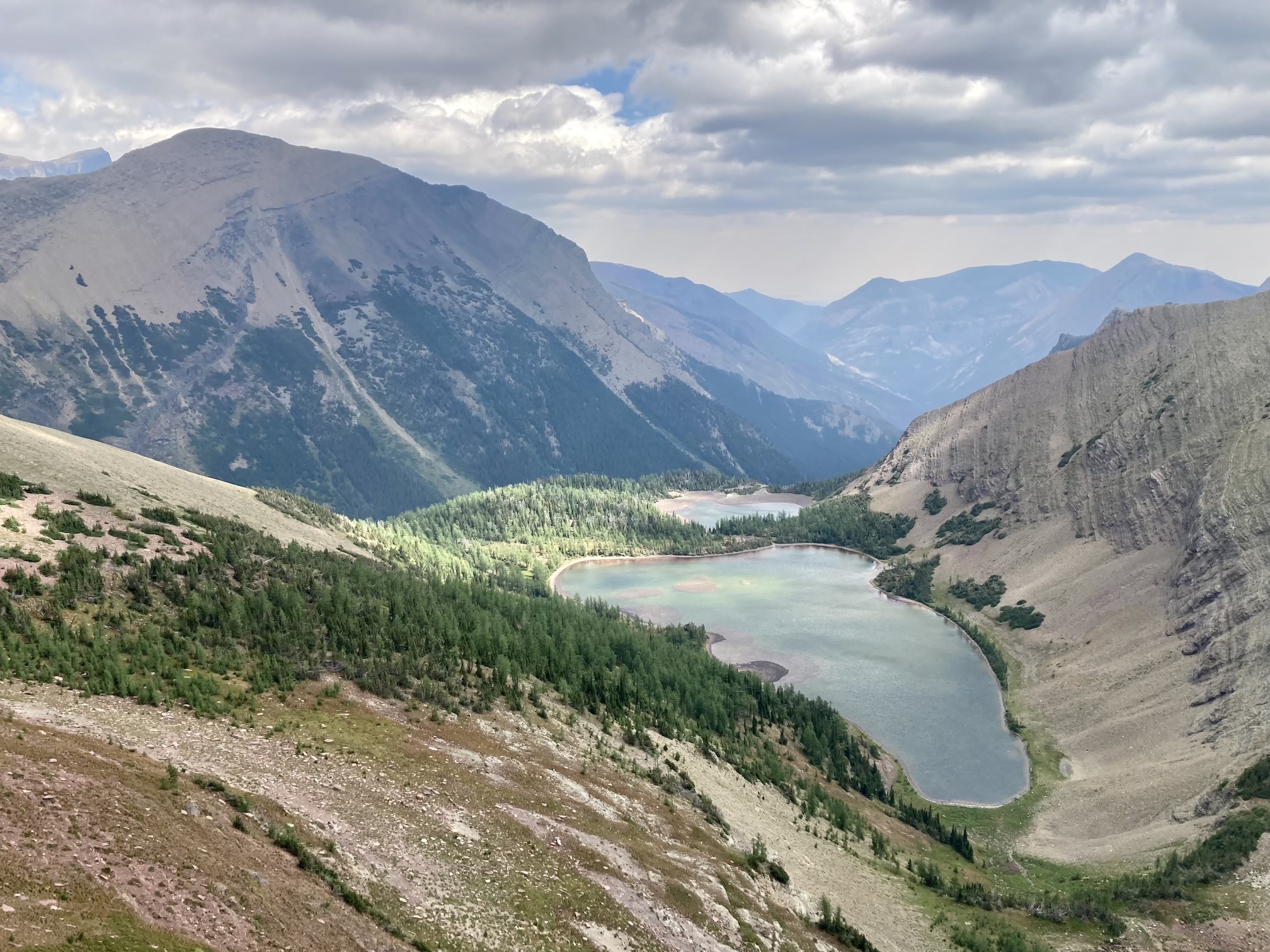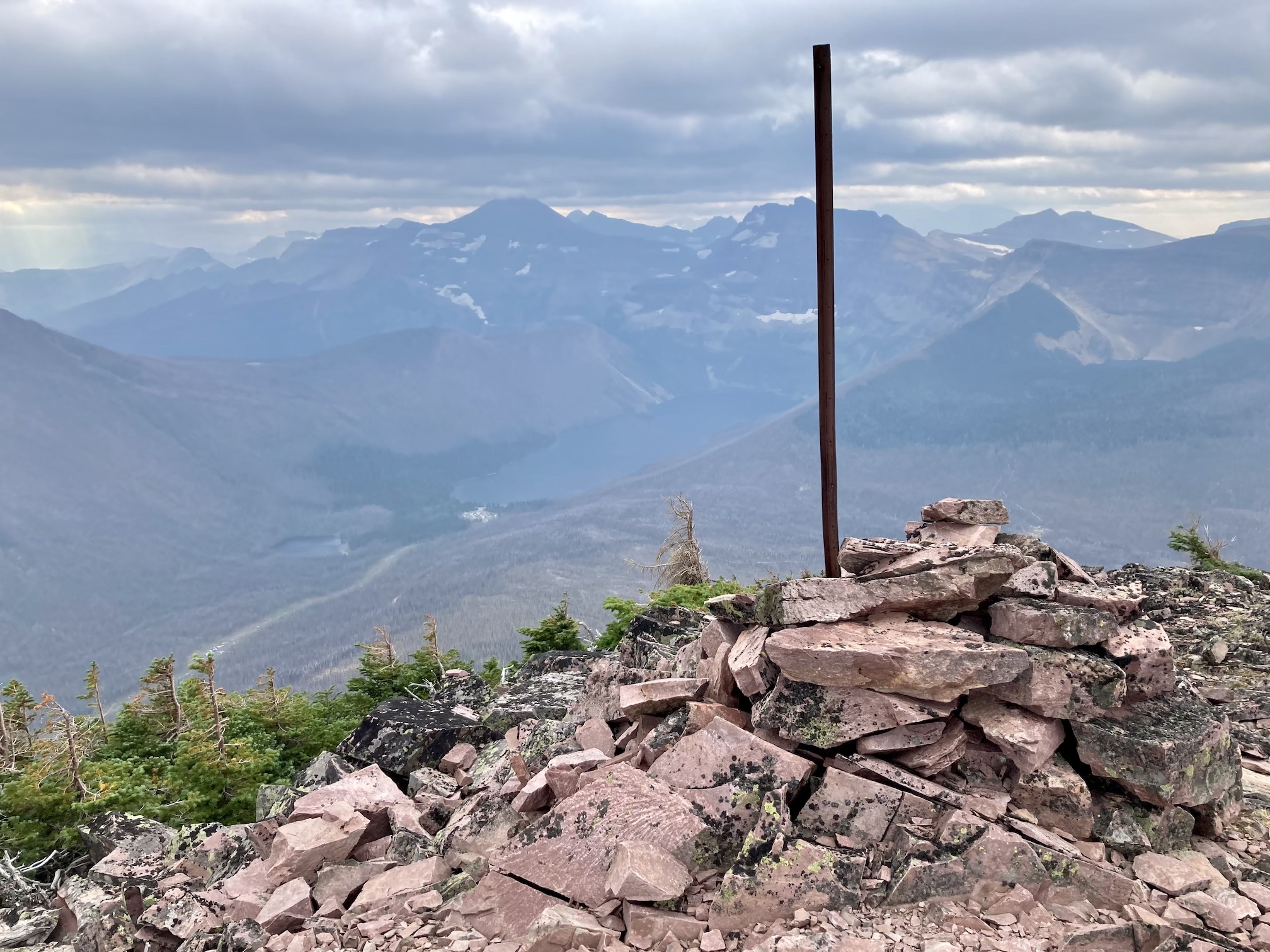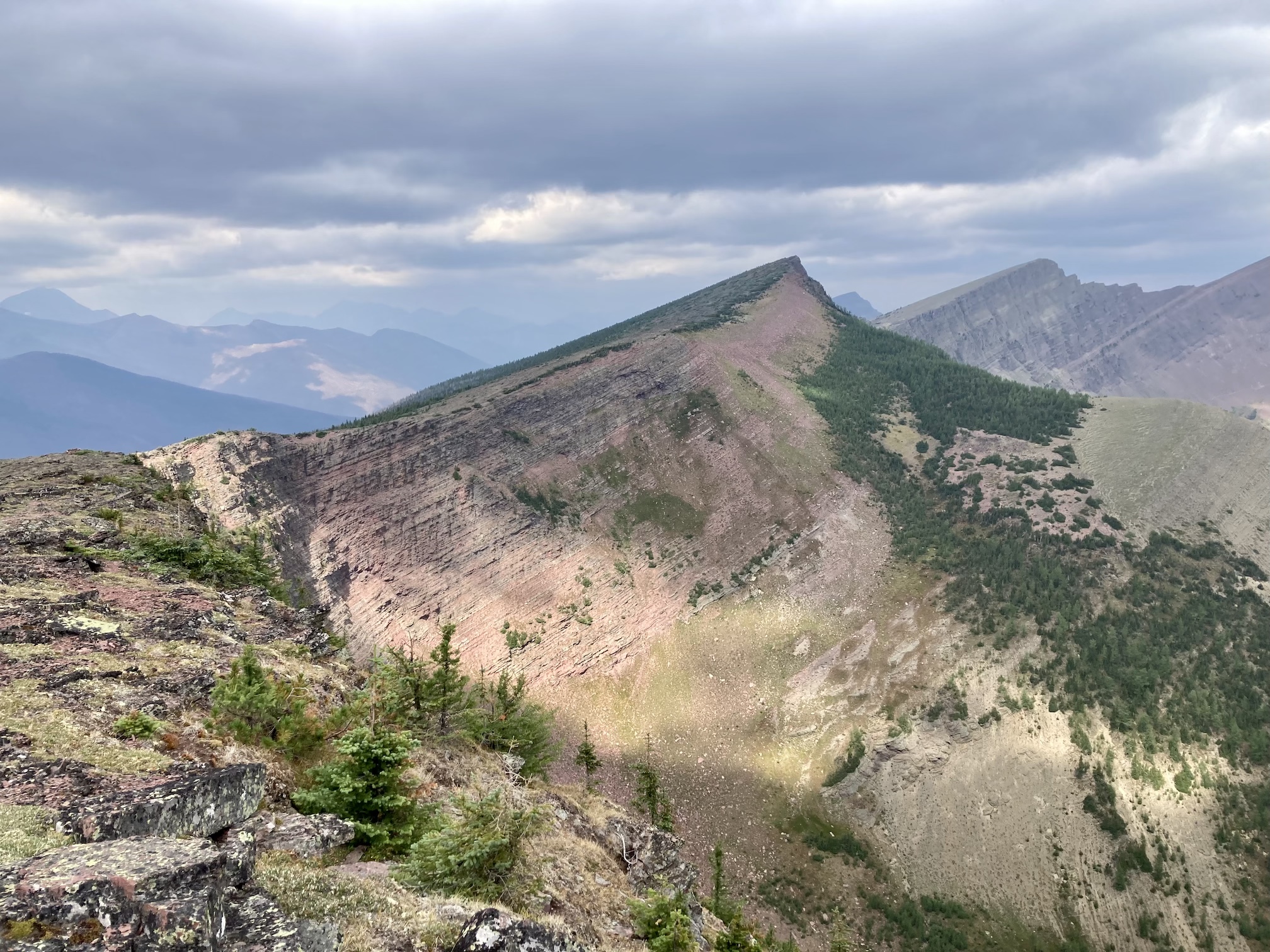 The weather was blustery and thick clouds combined with smoke to make the summit views to the west and south rather gloomy. Things were more clear north and east and I was pleased to see clear blue sky after a month of perpetual smoke. The views from the top include the environs of the Rowe Lakes as well as Cameron Lake and Akamina Pass (including Wall and Forum Lakes). Views into Glacier National Park are a little limited by Mount Rowe’s relatively low summit elevation, but I think they’d still be quite striking on a clear day.