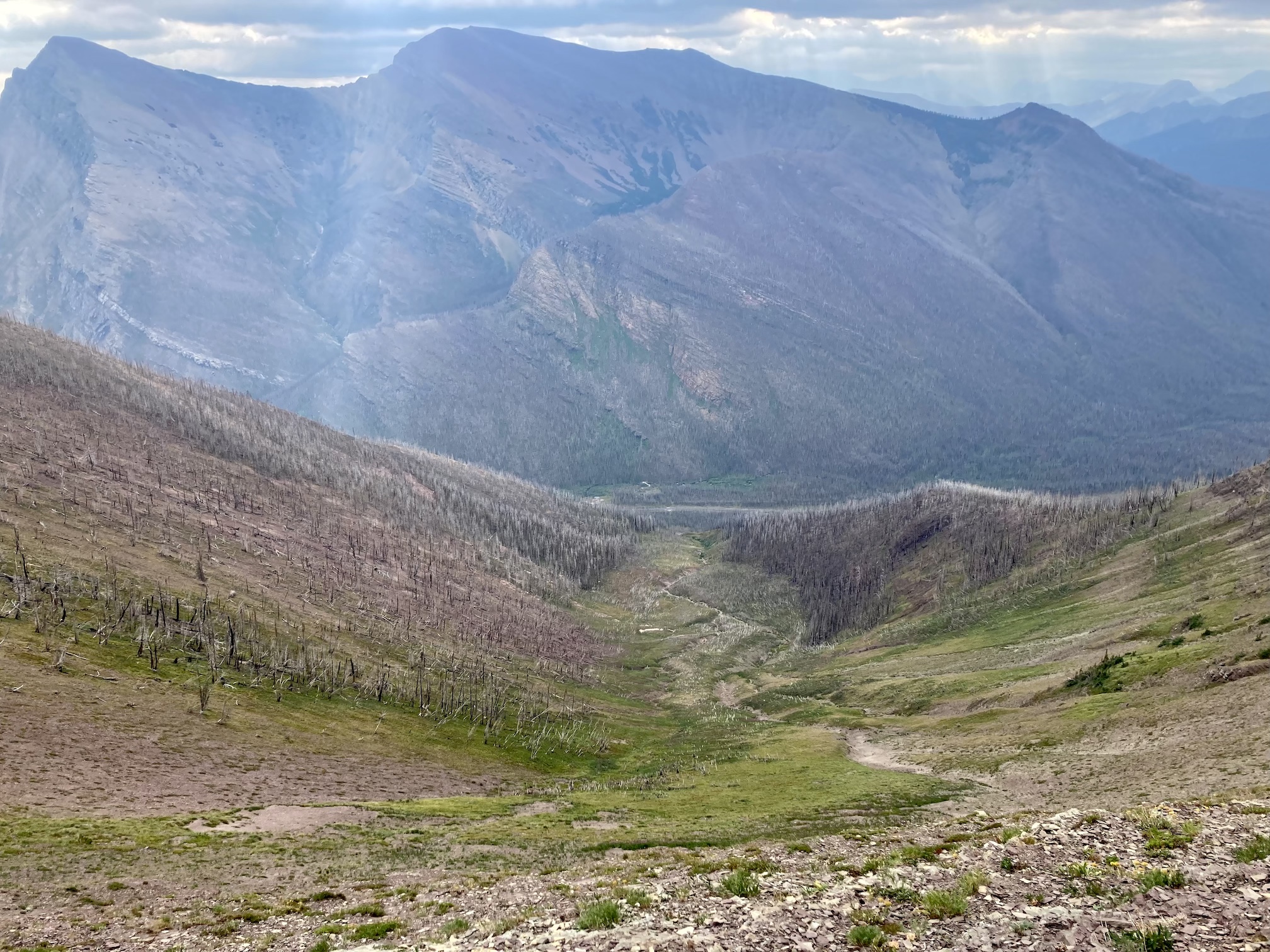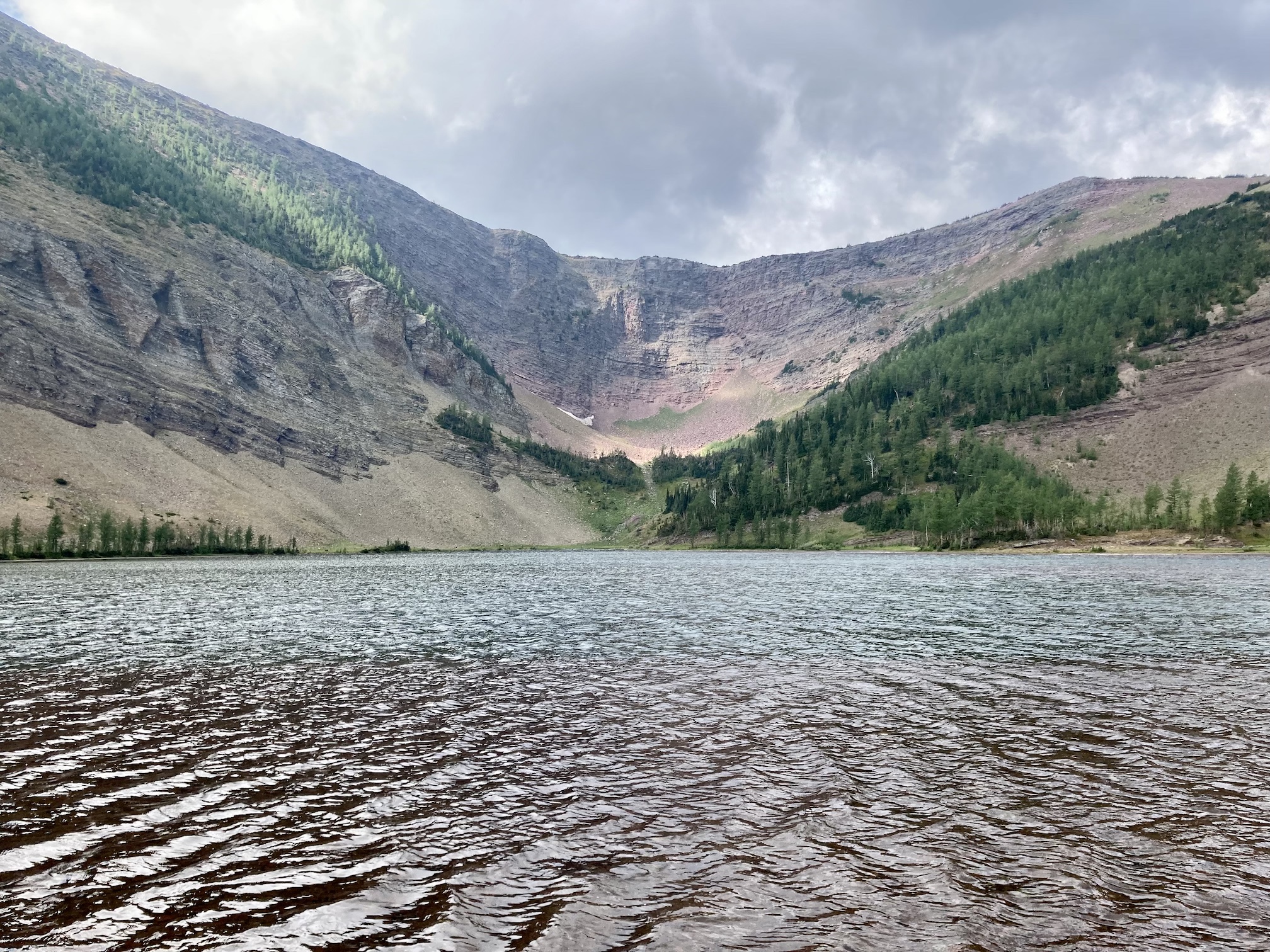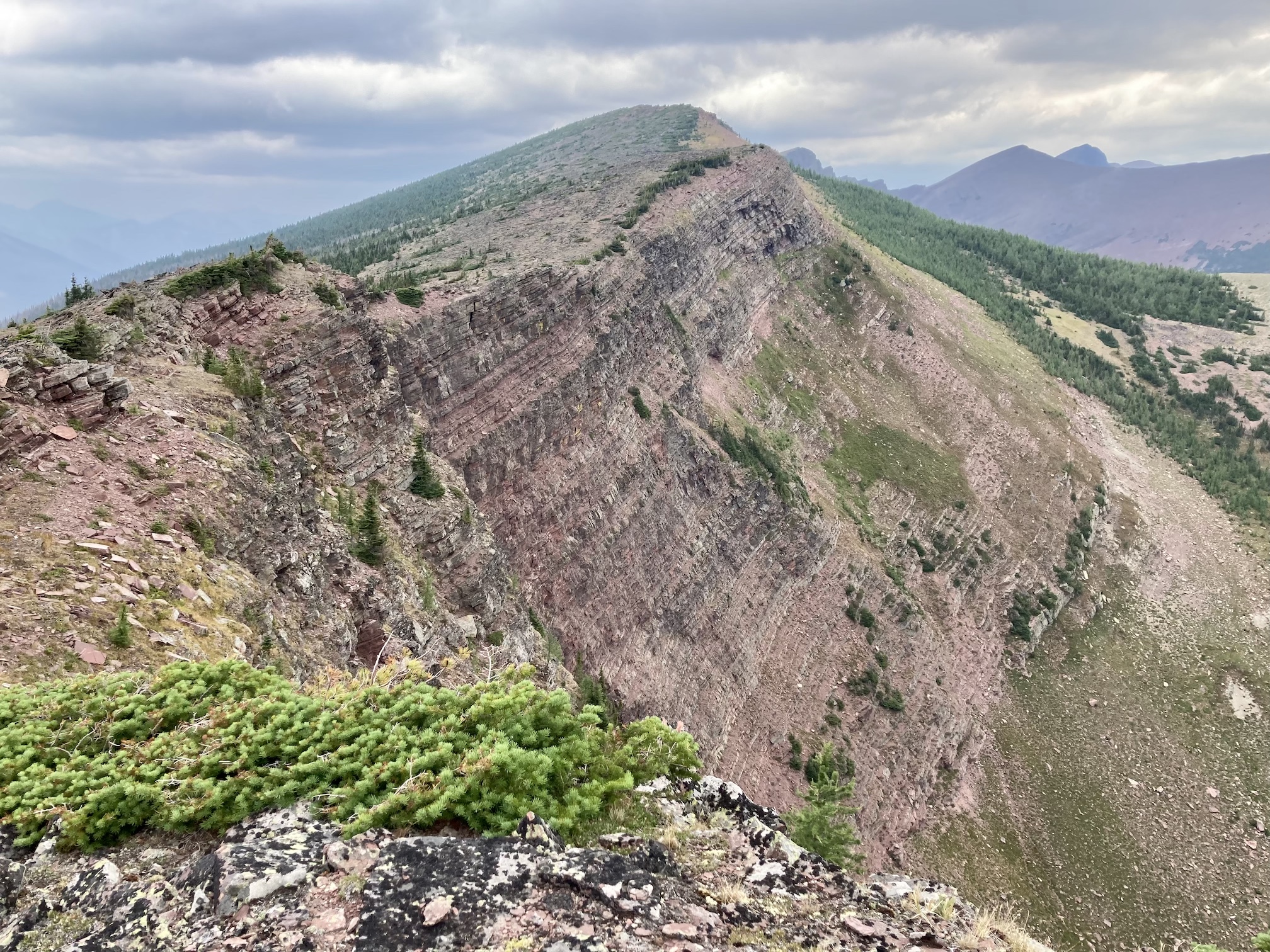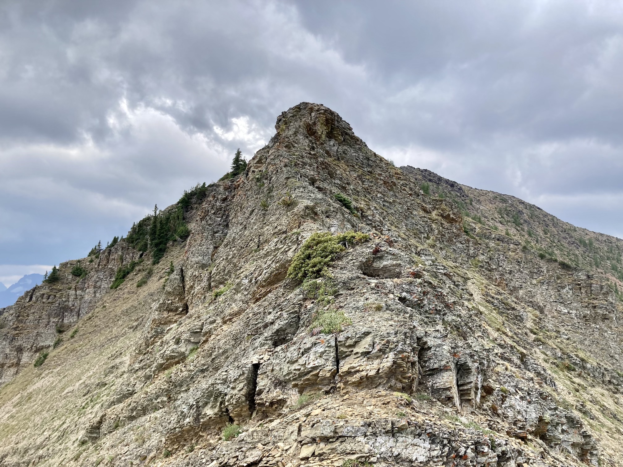The weather was blustery and thick clouds combined with smoke to make the summit views to the west and south rather gloomy. Things were more clear north and east and I was pleased to see clear blue sky after a month of perpetual smoke. The views from the top include the environs of the Rowe Lakes as well as Cameron Lake and Akamina Pass (including Wall and Forum Lakes). Views into Glacier National Park are a little limited by Mount Rowe’s relatively low summit elevation, but I think they’d still be quite striking on a clear day.