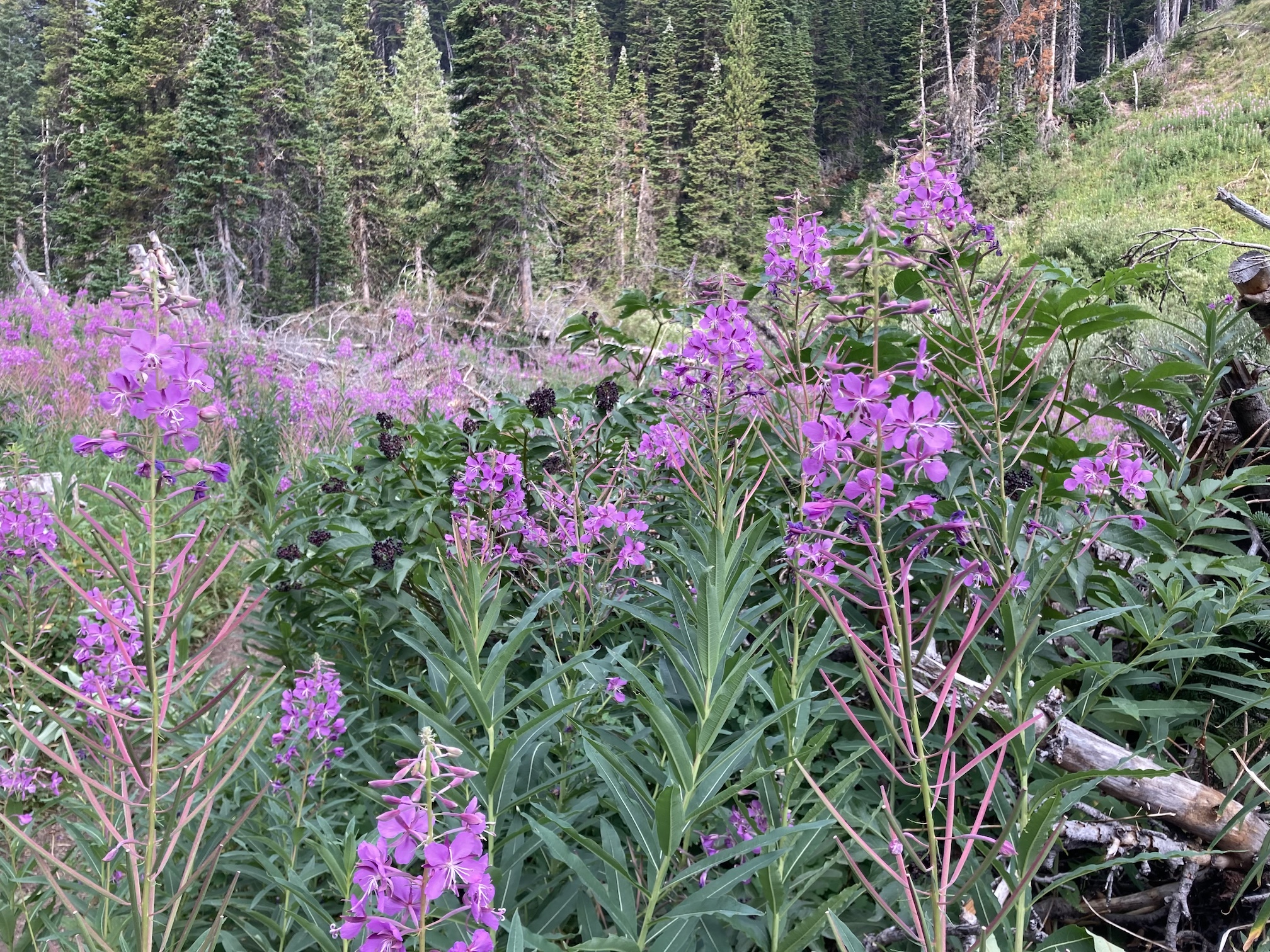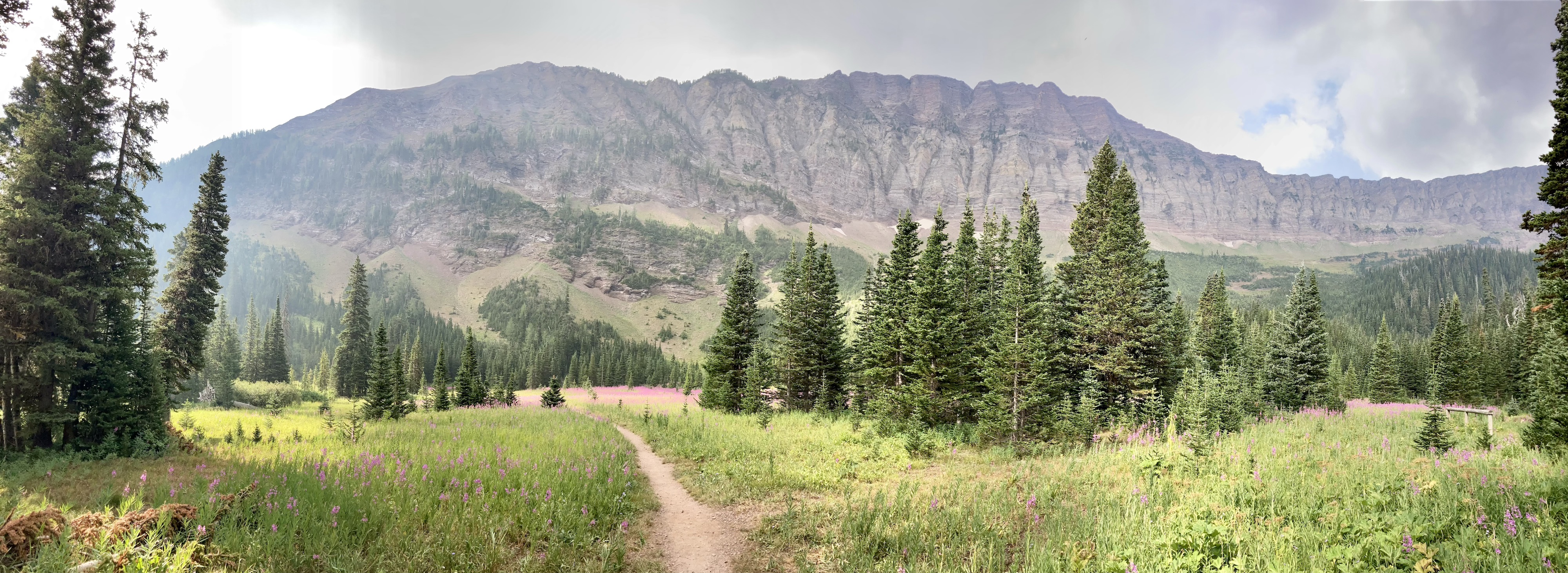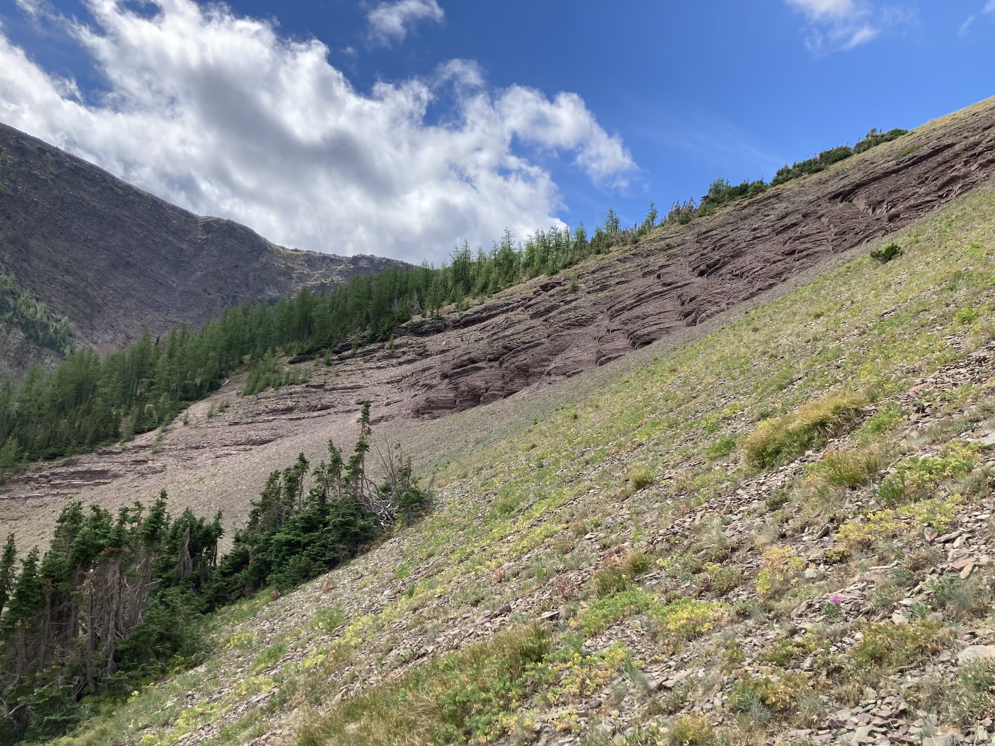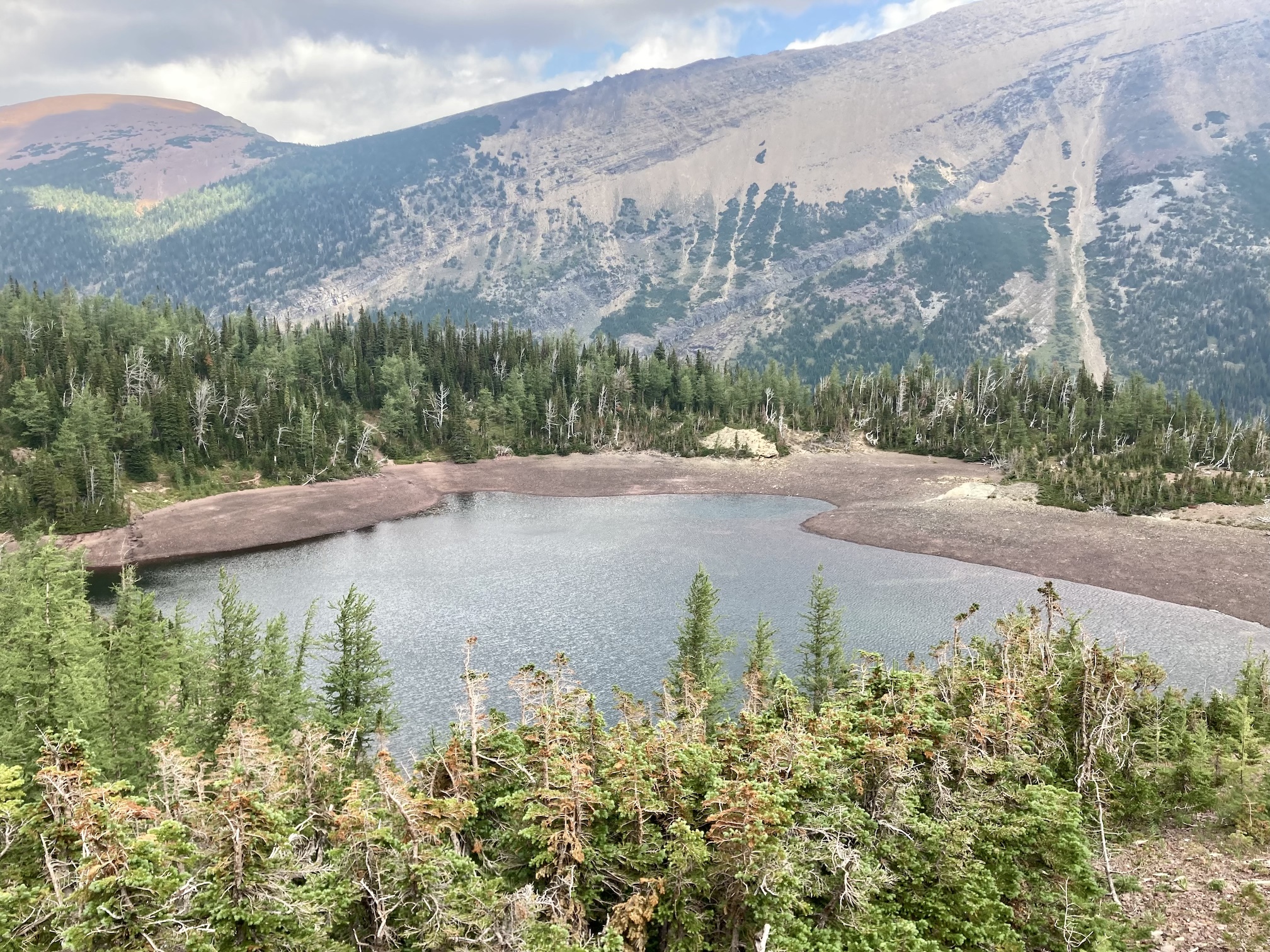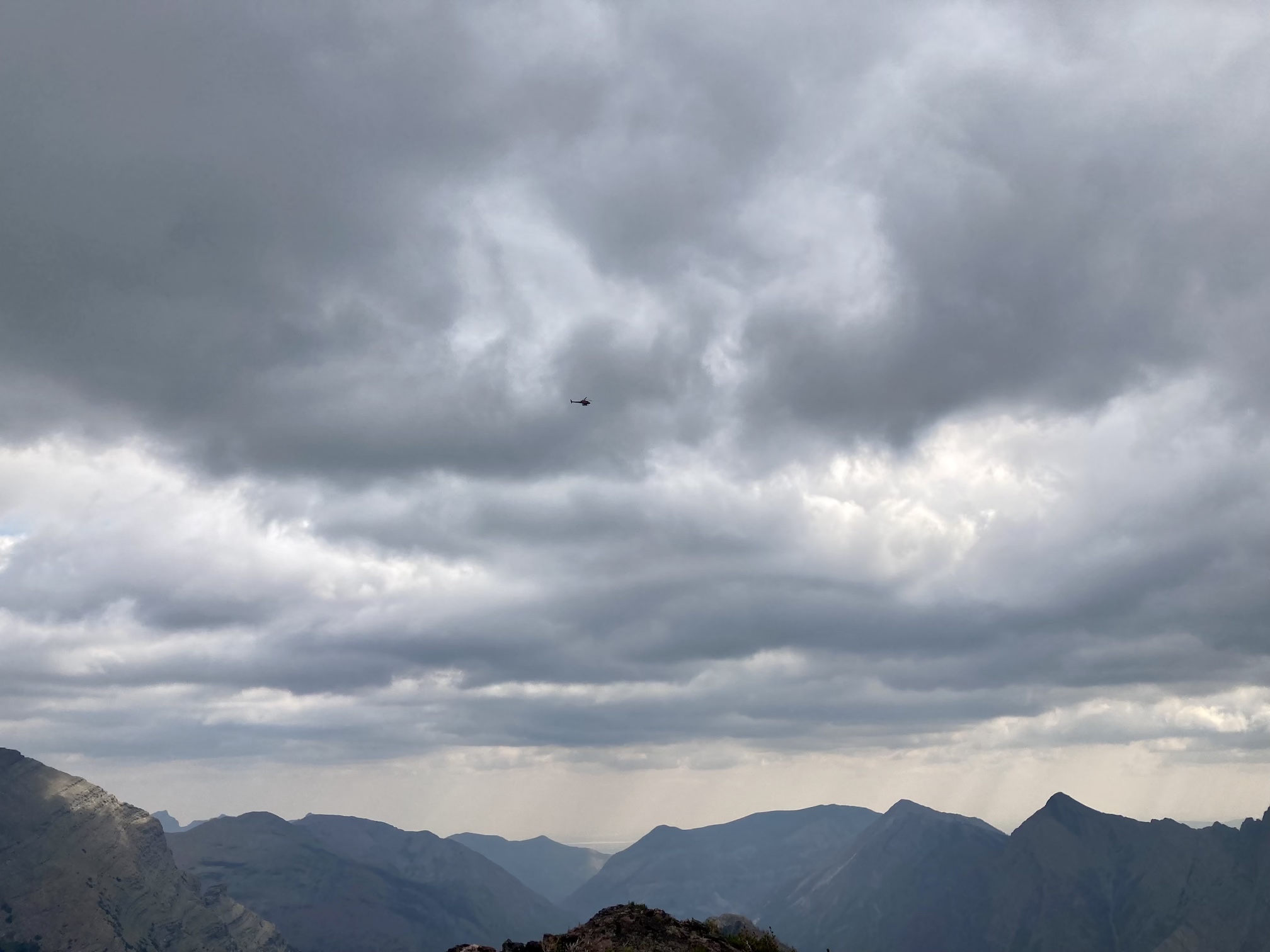 The weather was blustery and thick clouds combined with smoke to make the summit views to the west and south rather gloomy. Things were more clear north and east and I was pleased to see clear blue sky after a month of perpetual smoke. The views from the top include the environs of the Rowe Lakes as well as Cameron Lake and Akamina Pass (including Wall and Forum Lakes). Views into Glacier National Park are a little limited by Mount Rowe’s relatively low summit elevation, but I think they’d still be quite striking on a clear day.