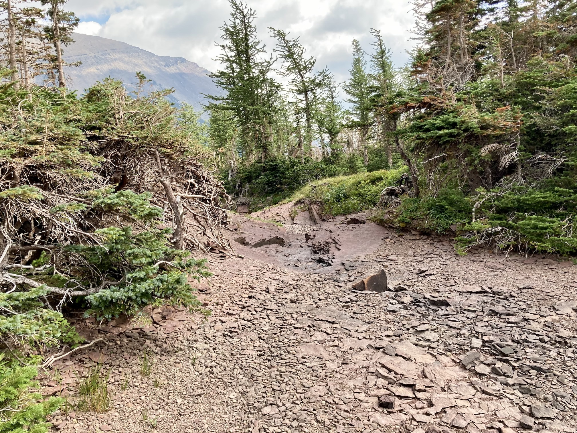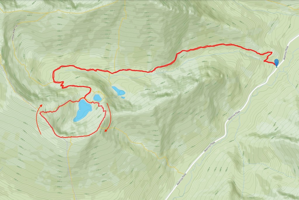 Access is from the Akamina Parkway in Waterton. The Rowe trailhead and large parking area are clearly marked about 10 km up the road from the townsite. Click here for the Google map. I followed the official trails to the Upper Rowe Lakes. Along the way I was pleased to see only the lowest reaches of the trail passed through burned forest. The valley between Mount Rowe and Mount Lineham escaped the fires in 2017. Things looked more or less the same as when I was last on the trail – you can check out the pictures here. Once at the upper lakes I had a good view of the summit.