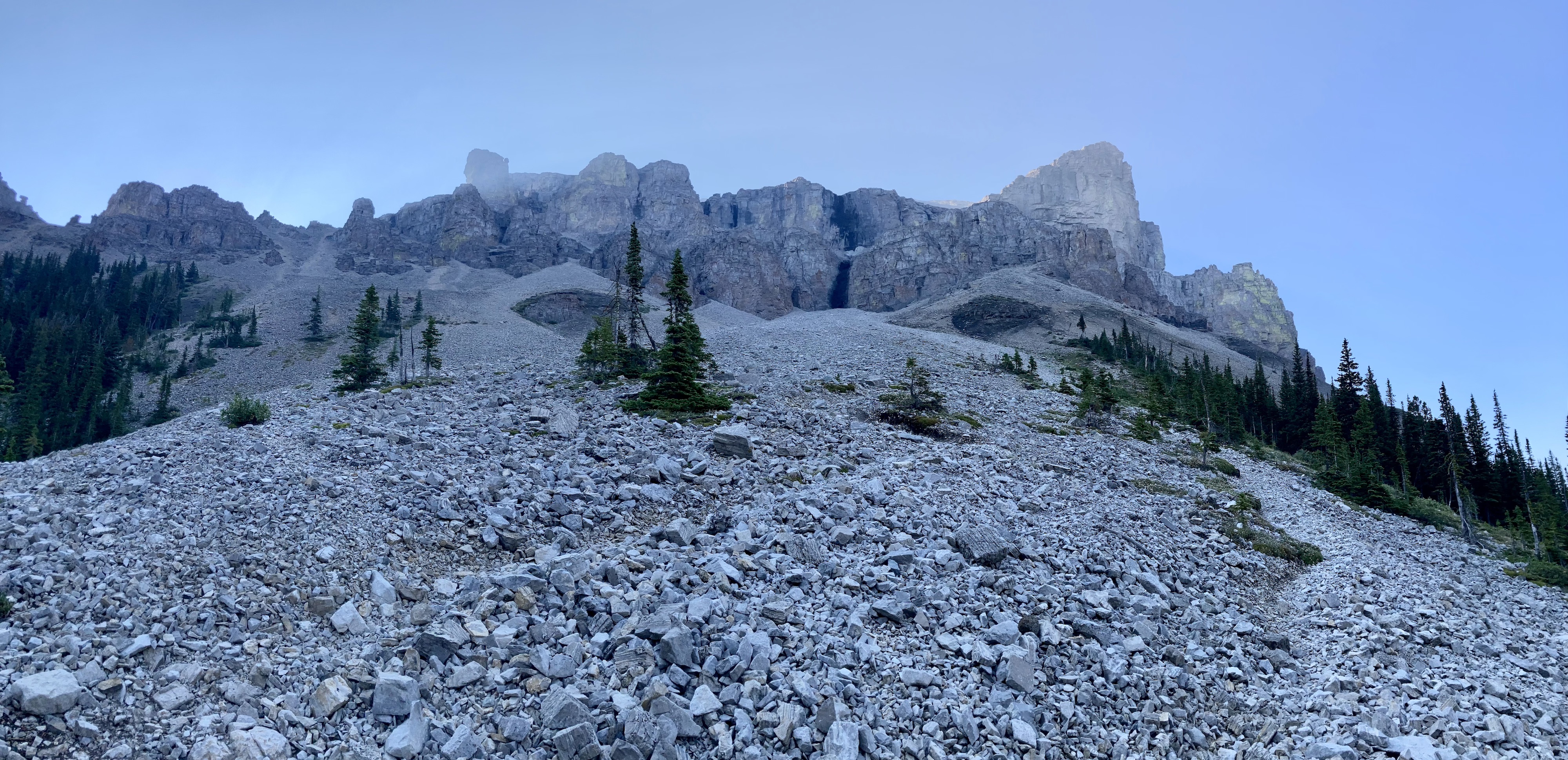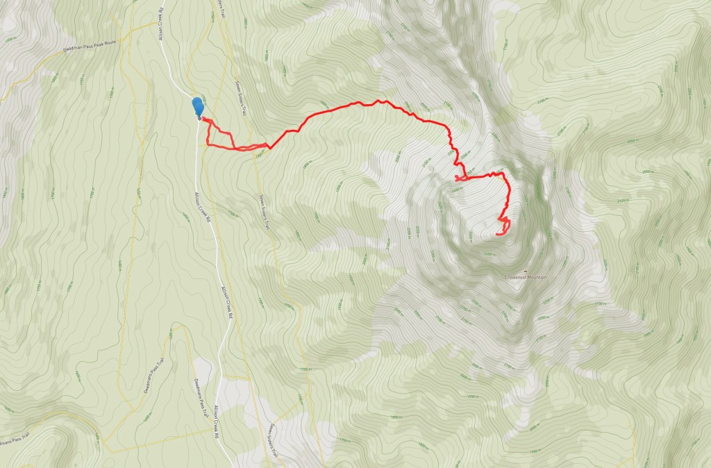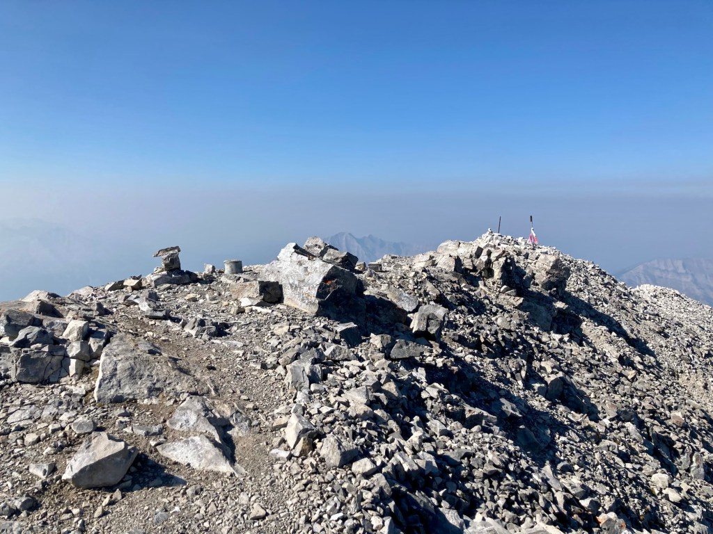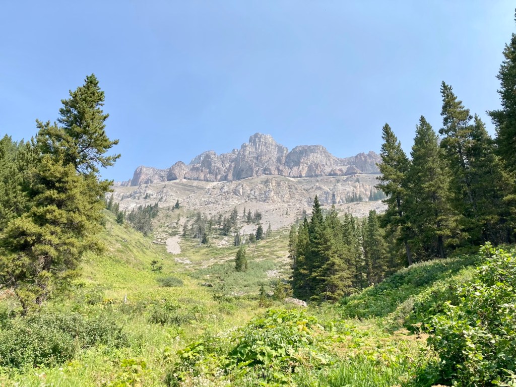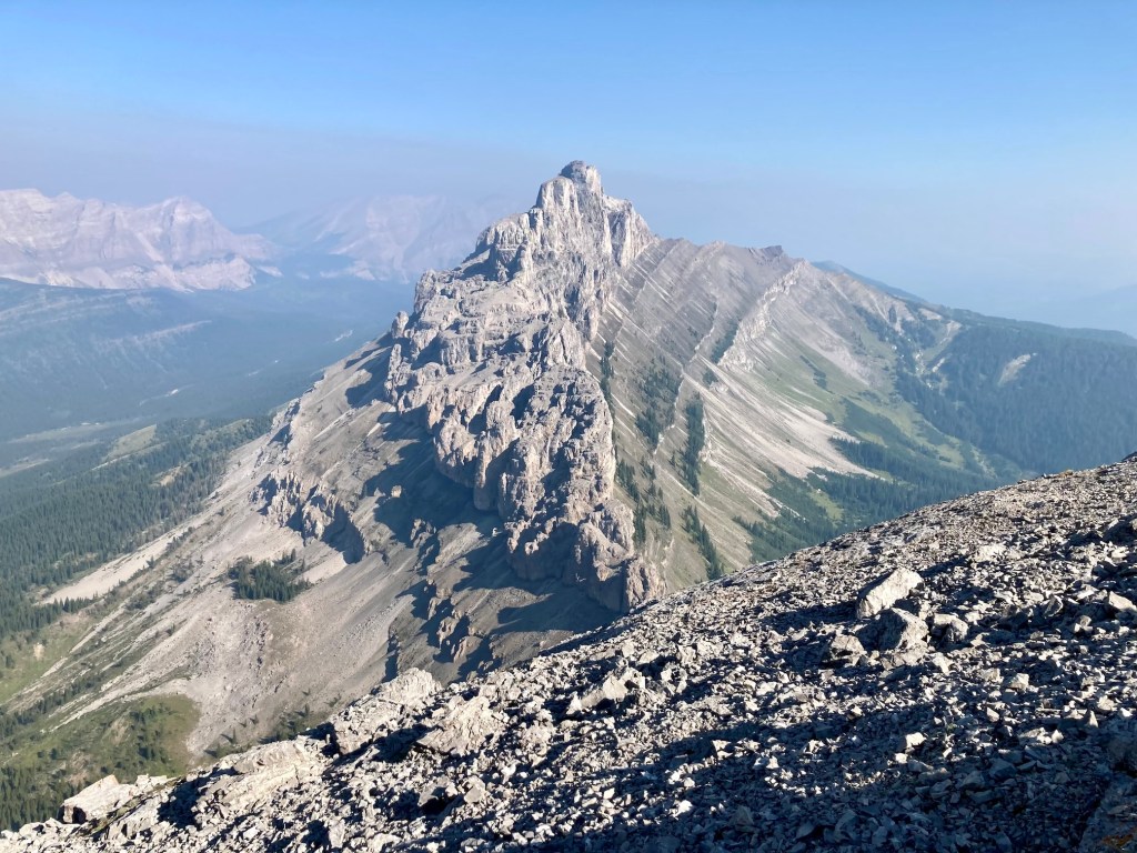 I first climbed Crowsnest Mountain about 21 years ago. It was an August ascent, but there was a cold wind blowing and a few stray snowflakes began to fall as we ascended. When we reached the summit thick clouds rolled in. The wind picked up and more snow started to fall, so we descended right away. It was a worthwhile trip just for the fun of the scramble, but I always felt a little sad that I didn’t get to enjoy the views from the summit. Fast-forward more that 2 decades and on another August day I climbed Crowsnest Mountain again. This time it was while a “heat dome” sat over western Canada and smoke from forest fires blanketed the landscape. The views were once again limited, but the climb was once again great fun.