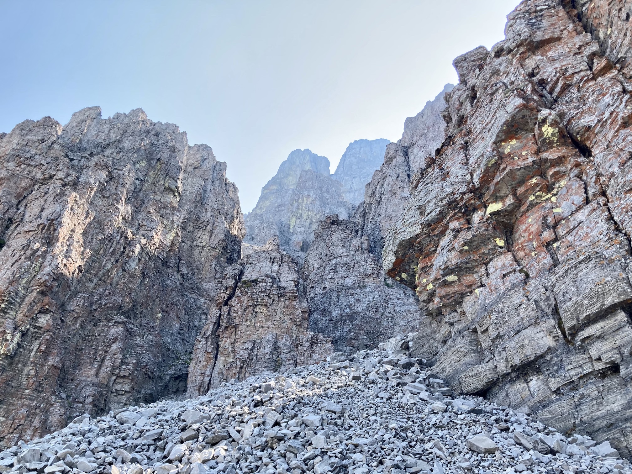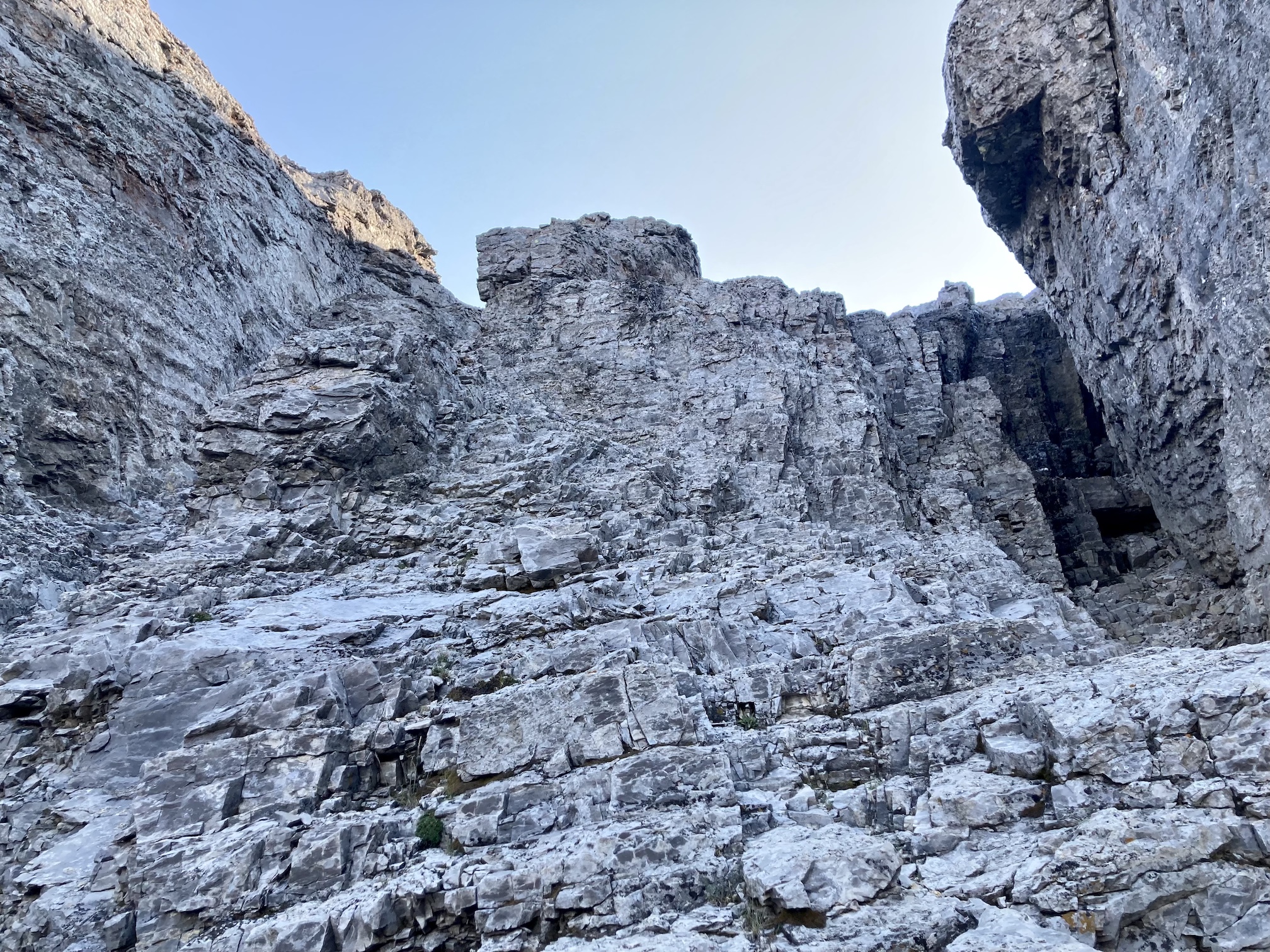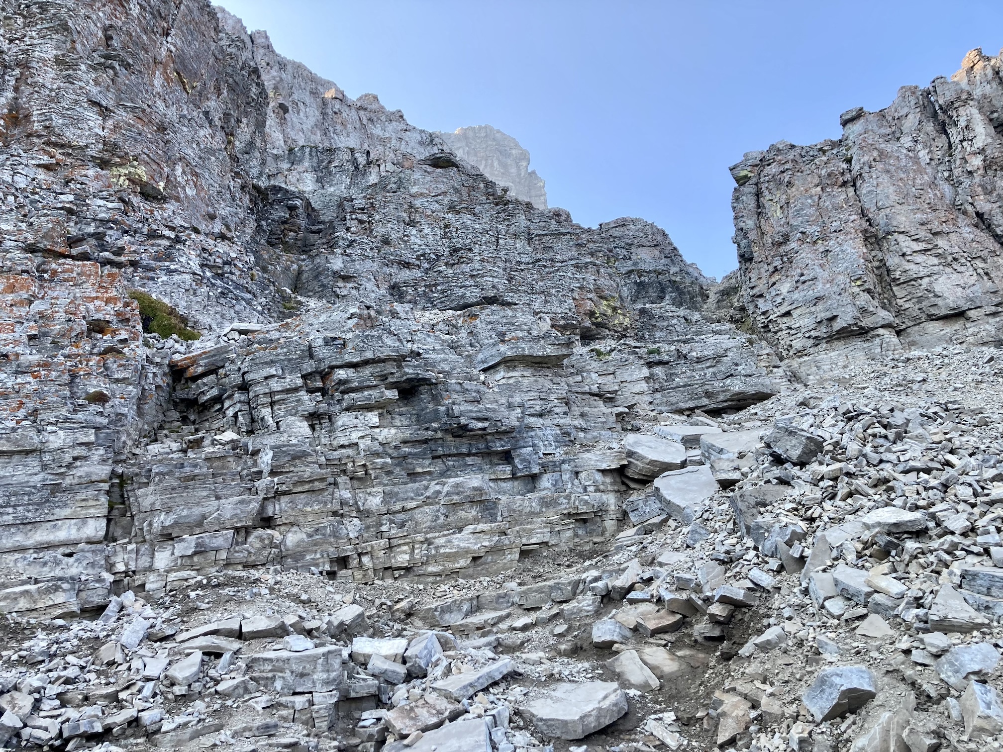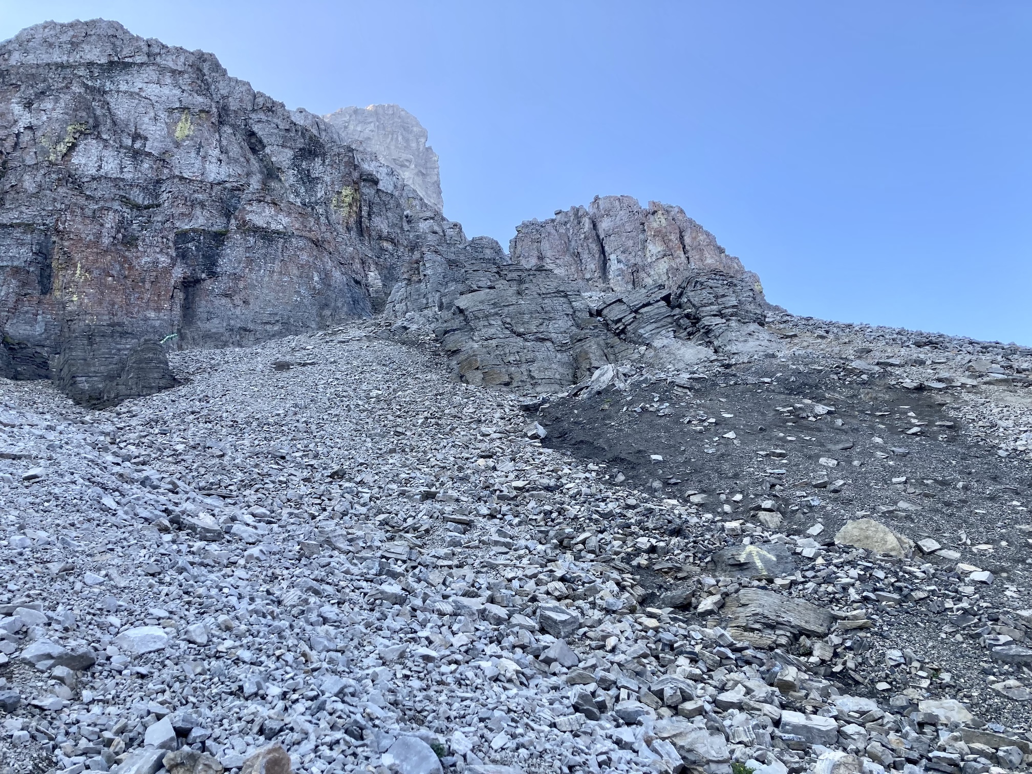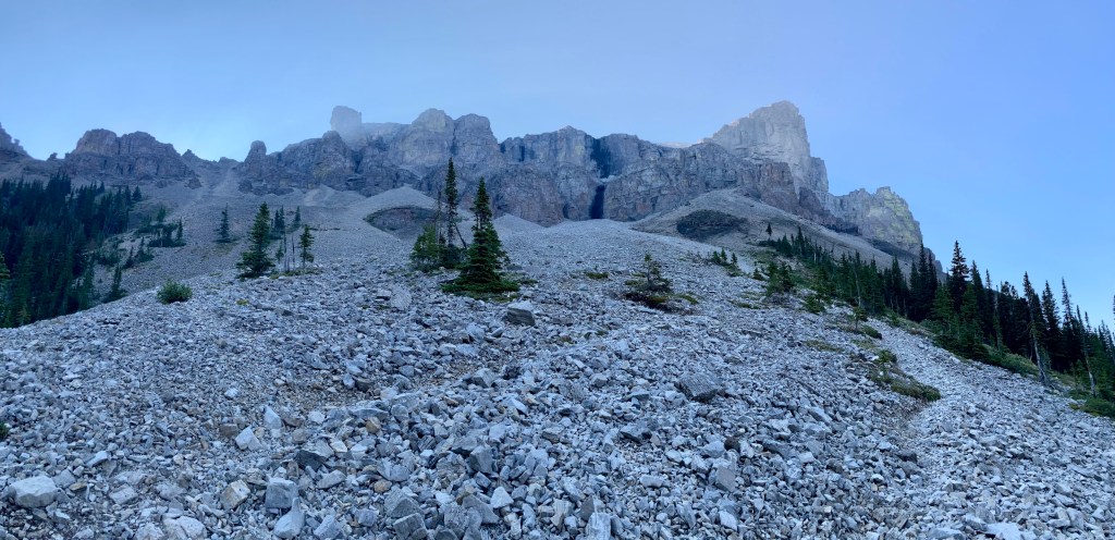 The old ATV trail climbs steadily through the woods for about 2 km before emerging on the rocky lower slopes of Crowsnest Mountain’s northwest face. The route is well-travelled enough that there are visible paths in the scree and rubble. A few cairns dot the route. As I approached the bottom of the first cliff band I noticed an arrow spray-painted on a boulder indicating the way towards a weakness in the cliffs – what Kane describes as the lower rock steps. These made for some easy and fun hands-on scrambling. From the top of the rock steps I could once again see an obvious path in the rubble, traversing left and ascending to the base of the second cliff band. A key landmark, a section of the cliffs which are notably dark from trickling water, was easy to see. To the left of it was the entrance to the ascent gully through the second set of cliffs.