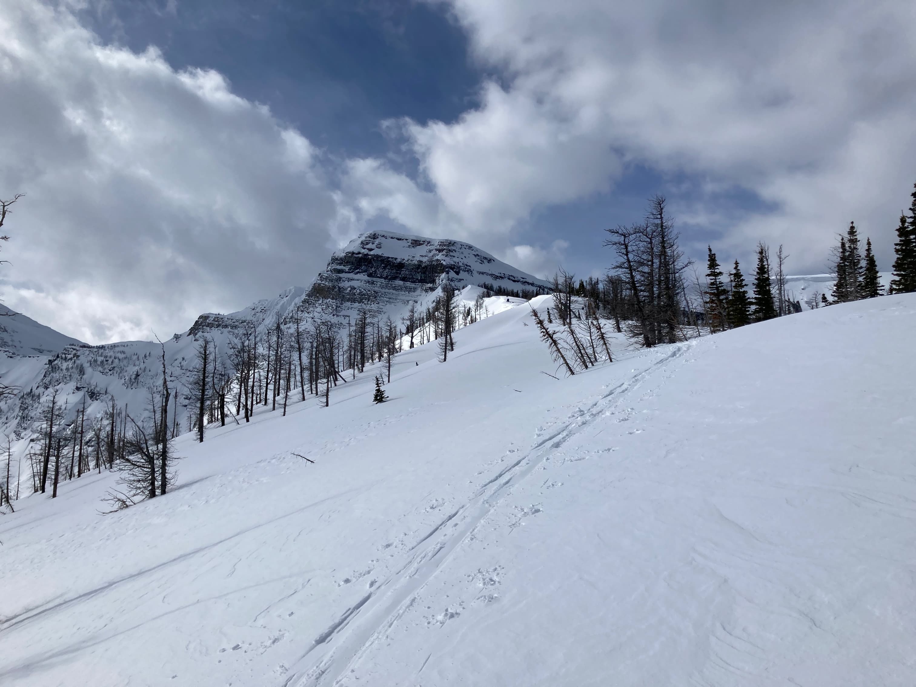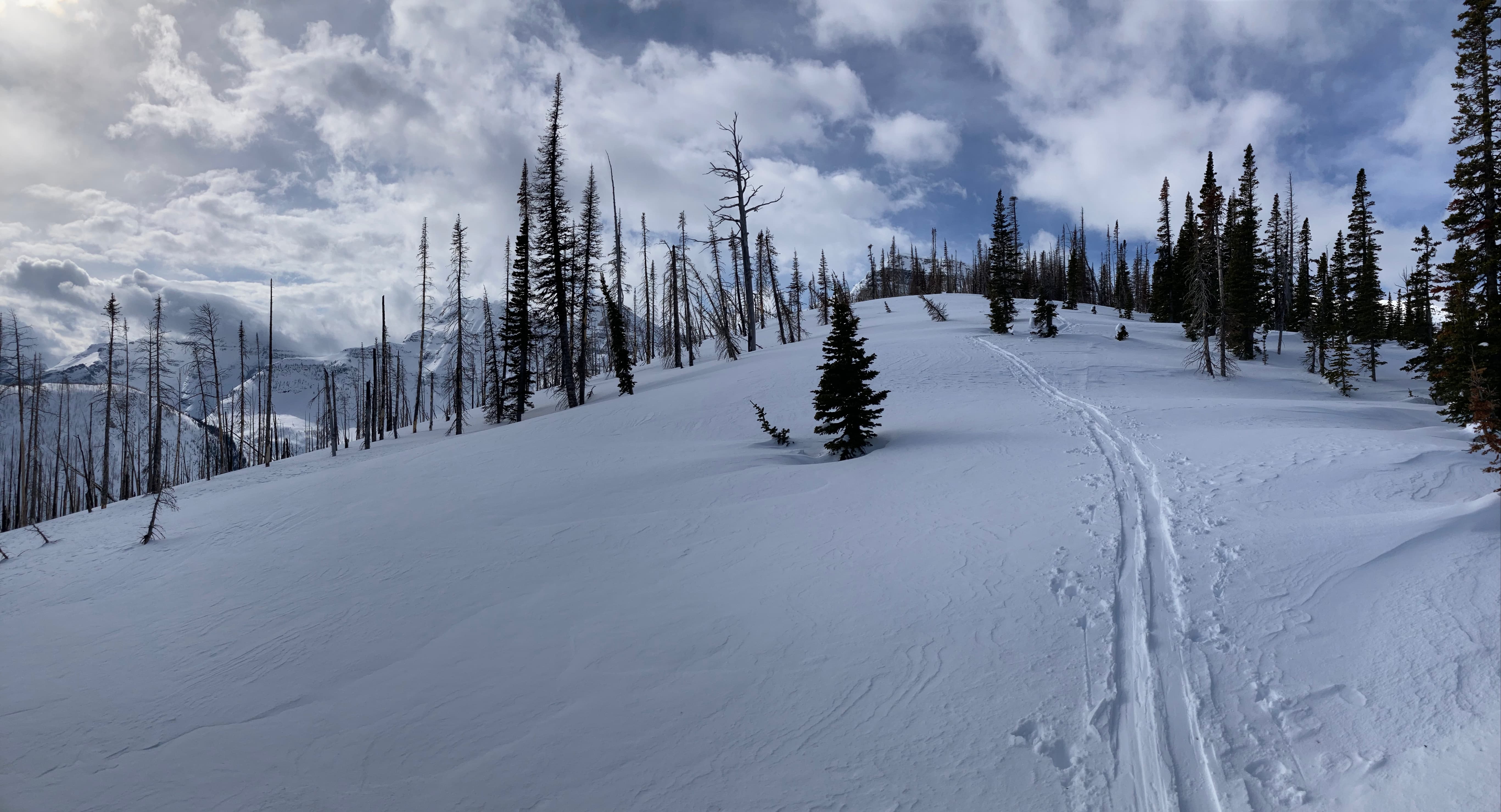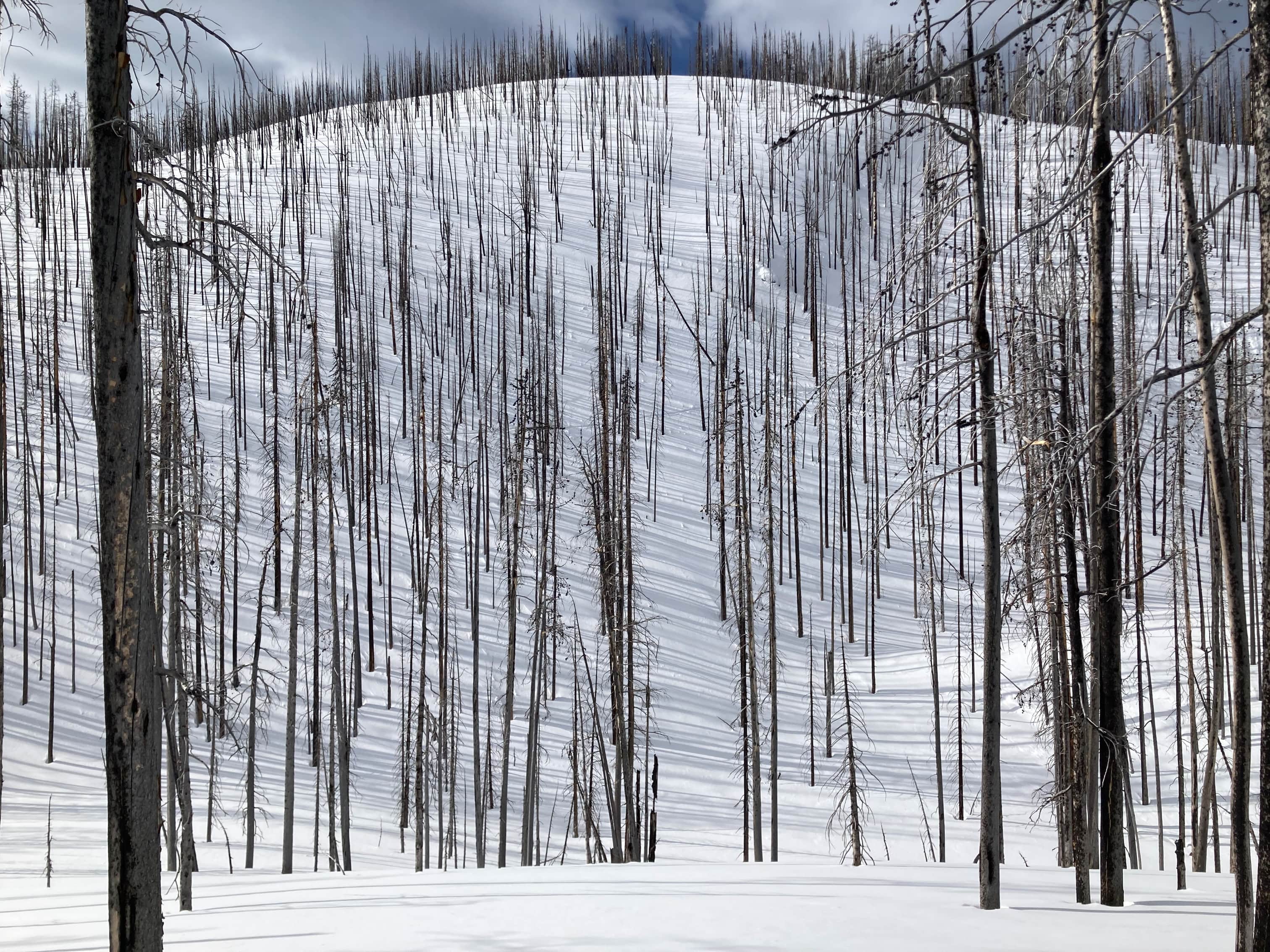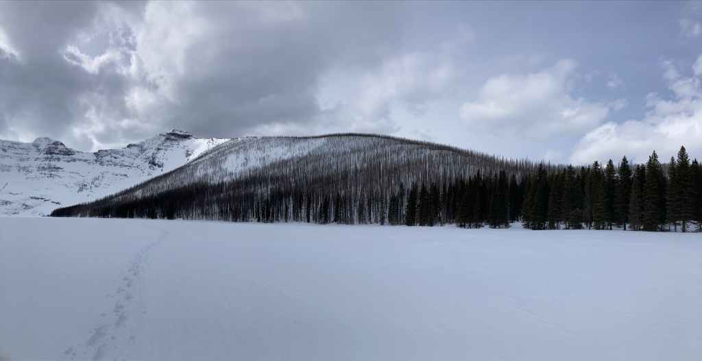 For the descent I decided to follow Nugara’s advice and go down to the lake. Parks Canada’s website had some advice regarding assessing the safety of burned forested slopes. It was basically “if the standing standing tree trunks are sparse enough to ski between then consider it an open slope”. I backtracked to where the angle of the slopes became more shallow and the trees were still thick and made my way down.
