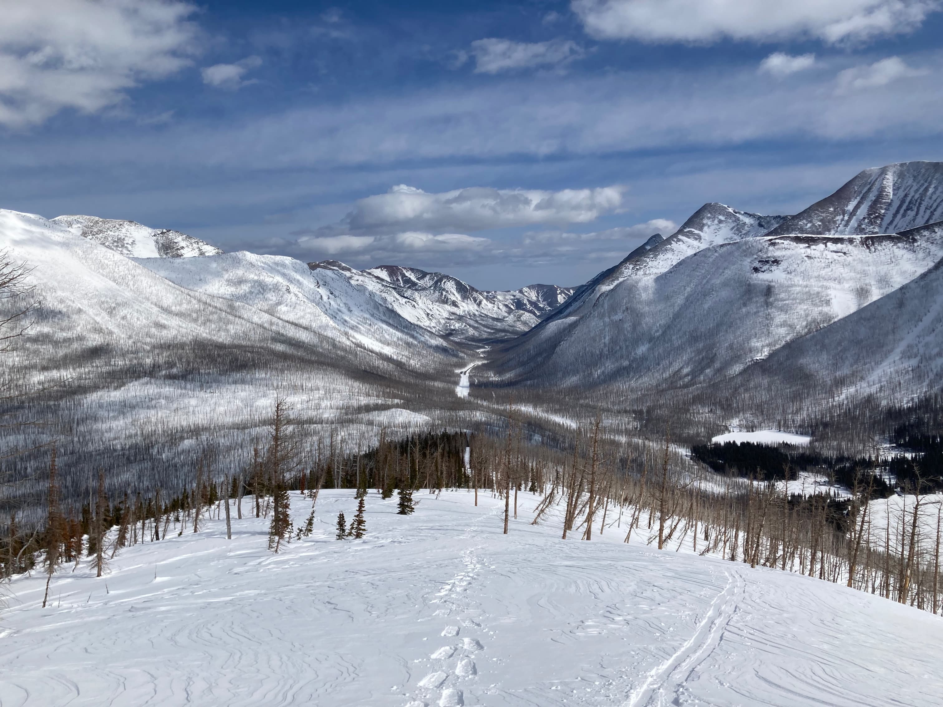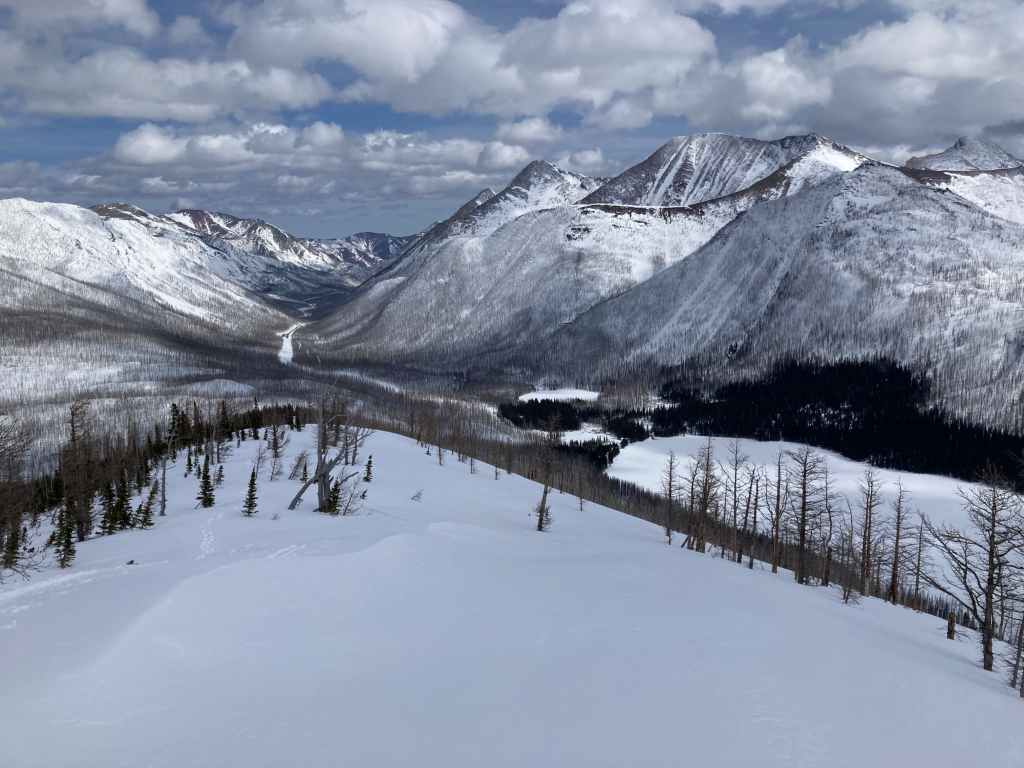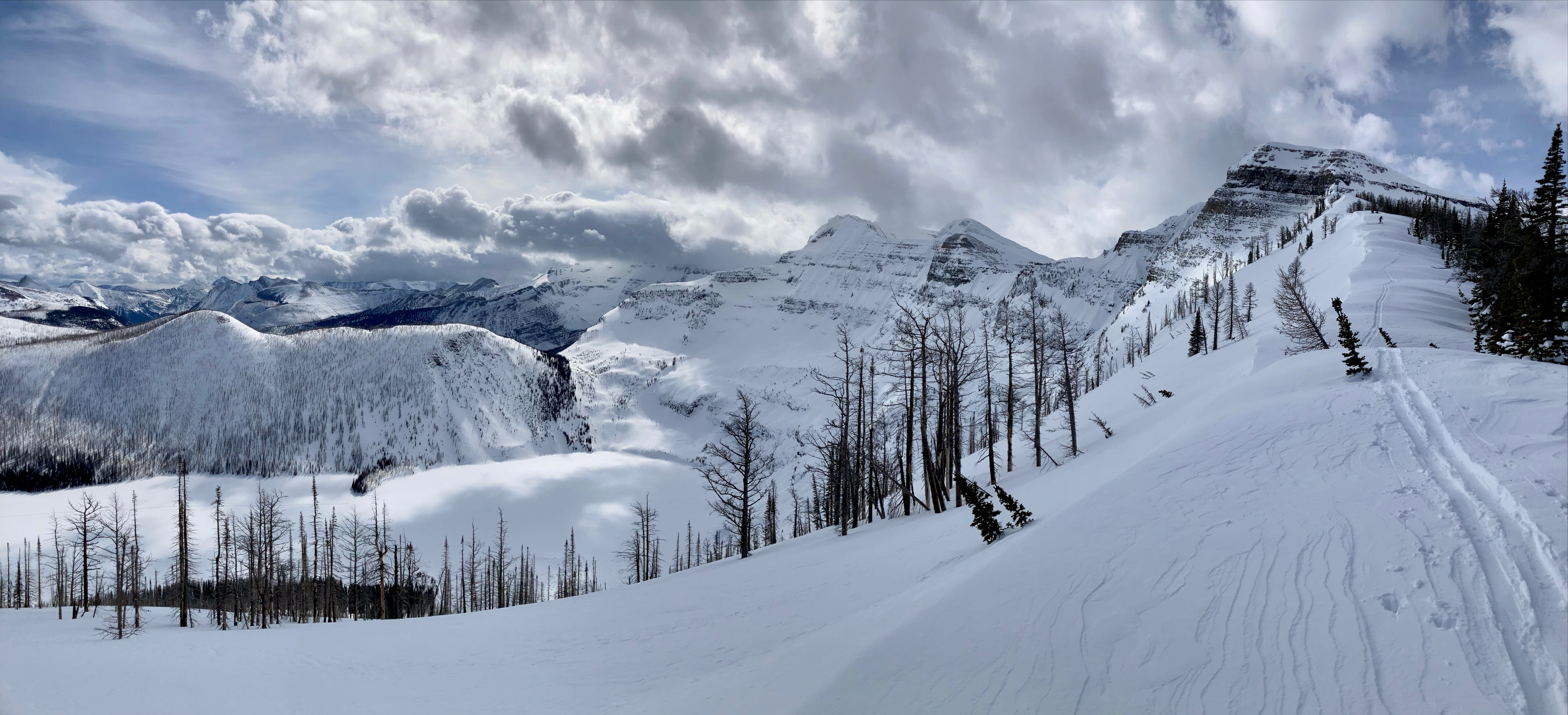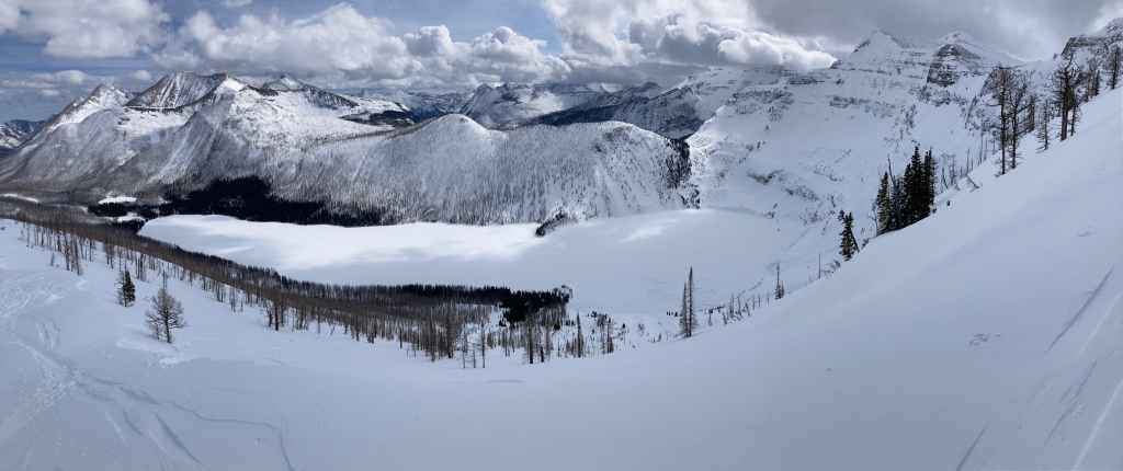 For the descent I decided to follow Nugara’s advice and go down to the lake. Parks Canada’s website had some advice regarding assessing the safety of burned forested slopes. It was basically “if the standing standing tree trunks are sparse enough to ski between then consider it an open slope”. I backtracked to where the angle of the slopes became more shallow and the trees were still thick and made my way down.