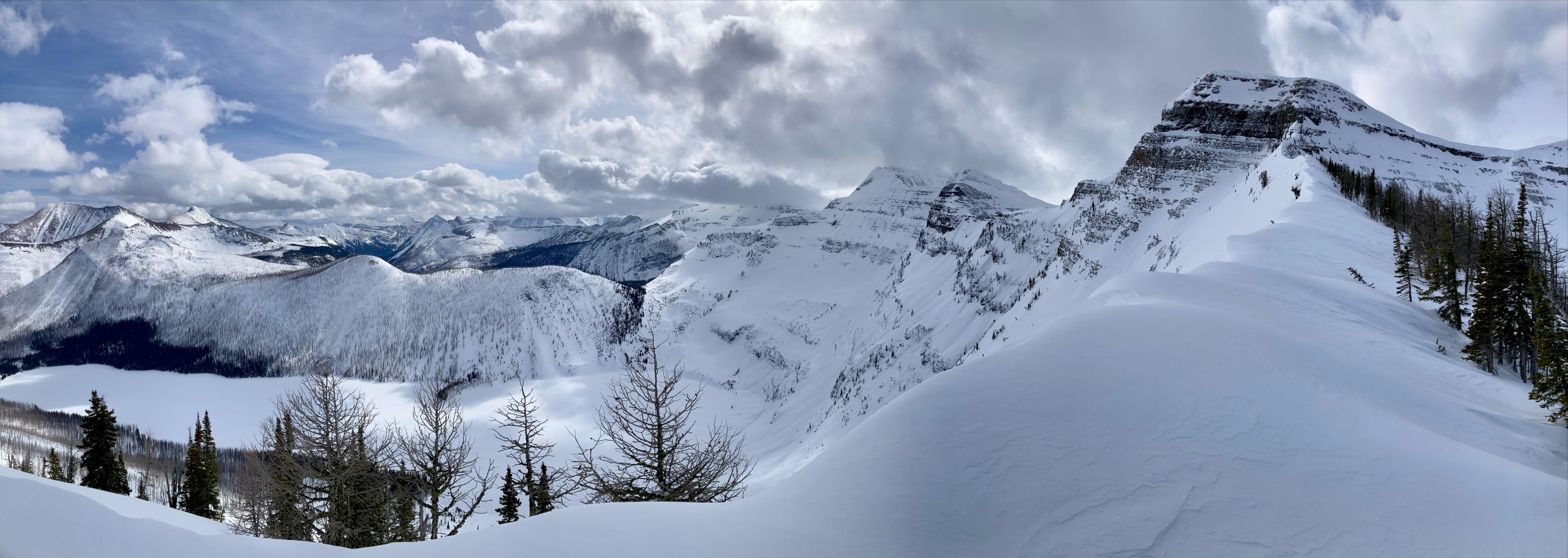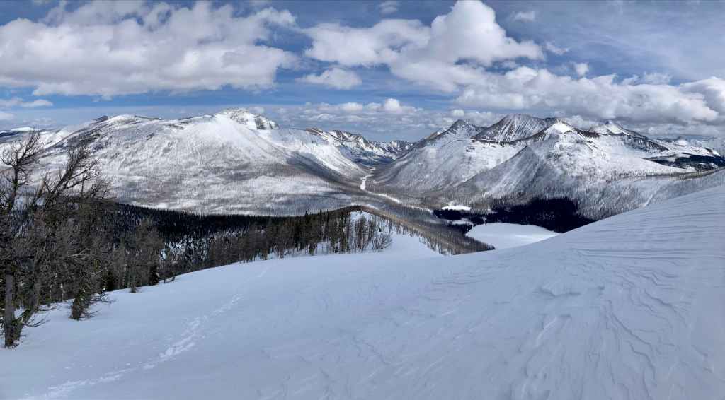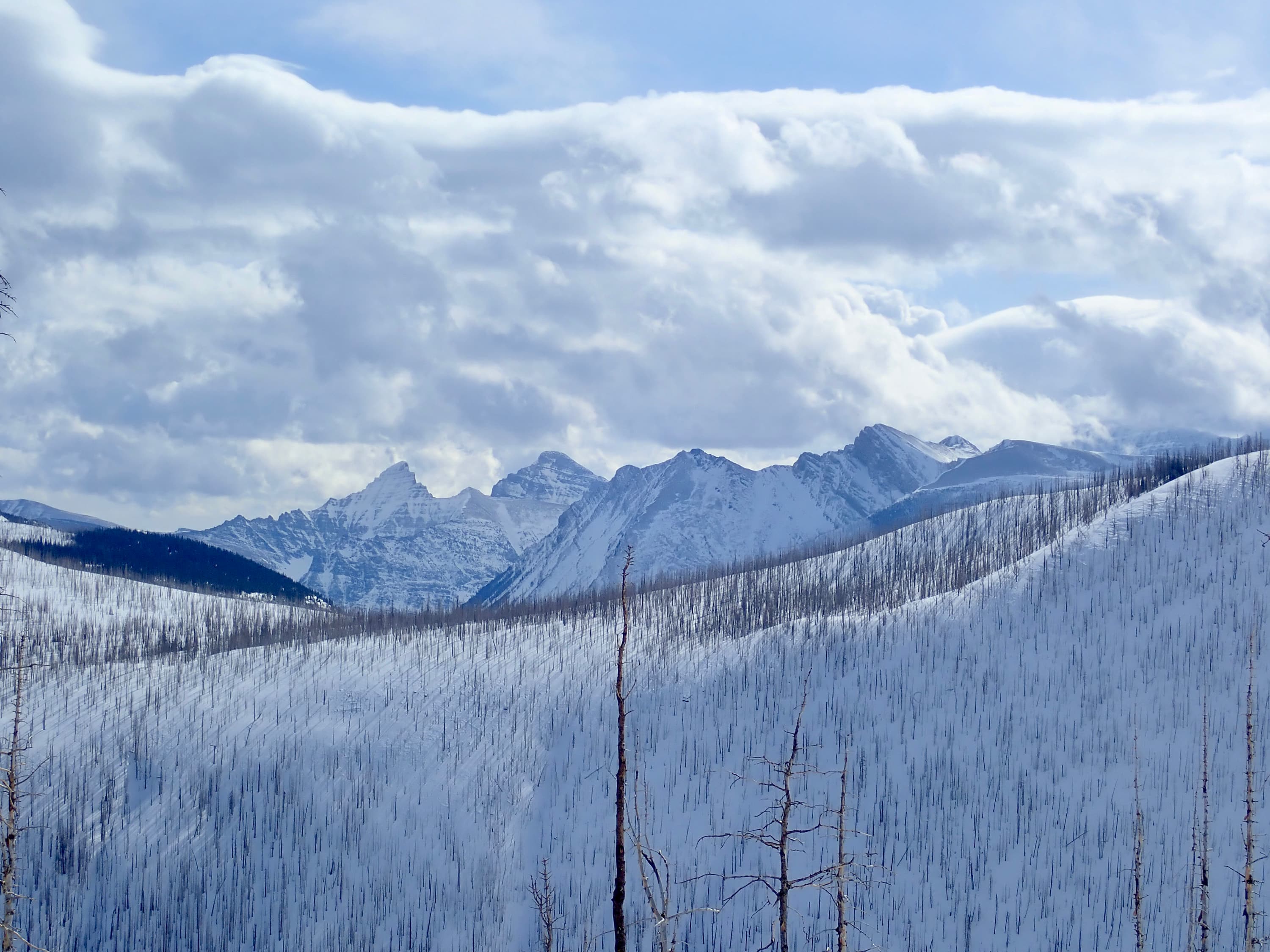 Route overview looking northwest. The red line follows the fairly gentle contour of Forum Ridge as it descends to the north end of the lake.Looking at the objective from Akamina Pass. Part of the cutline and the broad shape of the ridge is apparent from this angle. I would end up following the ridge to where the trees thin out, just before it becomes substantially narrower.Coming up on the start of the Akamina Pass trail. Mount Custer in the background.On the Akamina trail. As I got closer to the provincial border I kept a lookout to my left for the cutline.On the cutline. It was actually hard to make this out from the trail. I got to a point where I figured I’d gone past it so I left the trail and ascended a slope to the left (south) and backtracked until my point-of-view lined up with the axis of the cutline and it sprang into view.“The big hill”. This picture doesn’t do justice to the steepness of the lower reaches of this hill. I descended to the base then stayed in the woods to the left, angling for the gentler angled slopes. It looks like some skiers traversed this hill near the middle.Looking back down from the top of the steep portion of the hill.Up on the broad ridge top, looking southwest at some distant peaks in Glacier National Park.Telephoto view of those same peaks. A little more climbing and more peaks come into view. The clouds began to roll in as well.Ascending along the broad, friendly ridge top. I encountered the ascent route of some skiers.Mount Custer came into better view once I was on the ridge. To its left the top of Chapman Peak was covered in cloud.Telephoto view of Mount Custer’s summit, which isn’t visible until you’ve climbed well above the valley bottom.Carrying on along the ridge. Forum Peak’s summit comes into view.Looking north, back the way I came. The cutline is visible in the trees below. You can see where my route and the skiers’ ascent converged. Diminutive Akamina Lake is to the right with the northern edge of Cameron Lake behind the trees further right.Looking northwest. I think that’s Festubert Mountain.Looking northeast at Buchanan Ridge.Some trees continue to enhance the view, even when they’re dead.The top of the ridge finally came into view.Lots of broken clouds rolling over the peaks. The skiers are visible in the distance. I went a short distance beyond them and stopped.The summit of Forum Peak. Apparently, competent mountaineers with the right gear can gain the summit from this direction. I was content to enjoy the view from here.Mount Custer. Chapman Peak’s summit was still stubbornly in the clouds.Telephoto view of the upper reaches of Mount Custer. A full view of snow-covered Cameron Lake and the north face of Mount Custer.A slightly different view.The north end of Cameron Lake. The Carthew-Alderson trail ascends the slopes on the other side of Cameron Lake heading towards Summit Lake.Telephoto view across the lake towards Mount Alderson. The Carthew-Alderson trail is visible zig-zagging towards the ridge.Looking southeast into Glacier National Park.The south end of Cameron Lake. The international border cuts across the lake roughly where broad stripe of trees is, just to the right of centre.Looking back the way I came. Mount Rowe is on the left with Mount Lineham peeking up from behind it. Buchanan Ridge and Mount Alderson are on the right.More Mount Custer.One more full panorama of Cameron Lake.Starting my descent.A final look at Mount Custer from the ridge.Down on Cameron Lake looking back up at where I was.A look at the broad, gentle lower part of Forum Ridge as it comes to the level of Cameron Lake. Given the changes brought about by the fires, I think in the future I’ll just ascend and descend along that ridge. It avoids “the big hill” and stays in simple terrain.