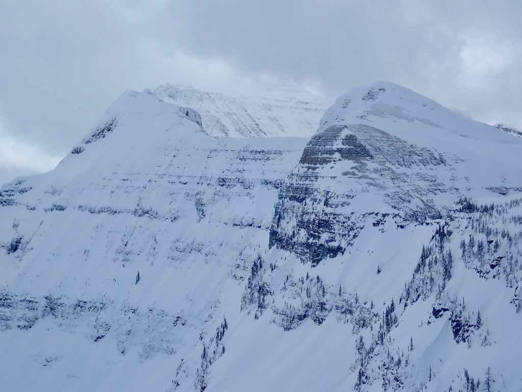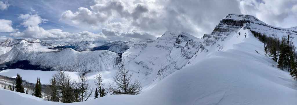 From the top of that ascent I rejoined the cutline and carried on through a couple patches of un-burned forest. I was now up on the broad northeast portion of Forum Ridge. Views began to open up in all directions and I carried on until I could see the end of the trees. The major avalanche pathways down to Cameron Lake begin around there and I could see plenty of cornices overhanging towards the lake. Some backcountry skiers were up there cutting a test block before descending beneath the cornices. We exchanged greetings and they expressed the standard sentiment I encounter from skiers (along the lines of “why would you climb something you’re not going to ski down?”). I found a place to sit on a big drift beside the trees and enjoyed the views.