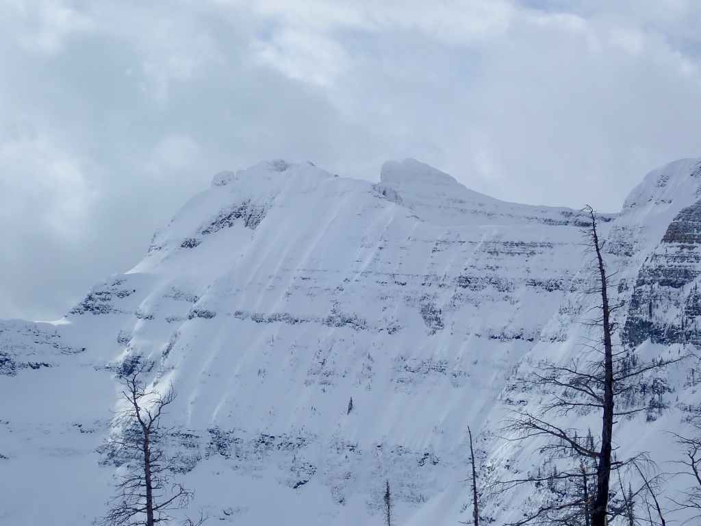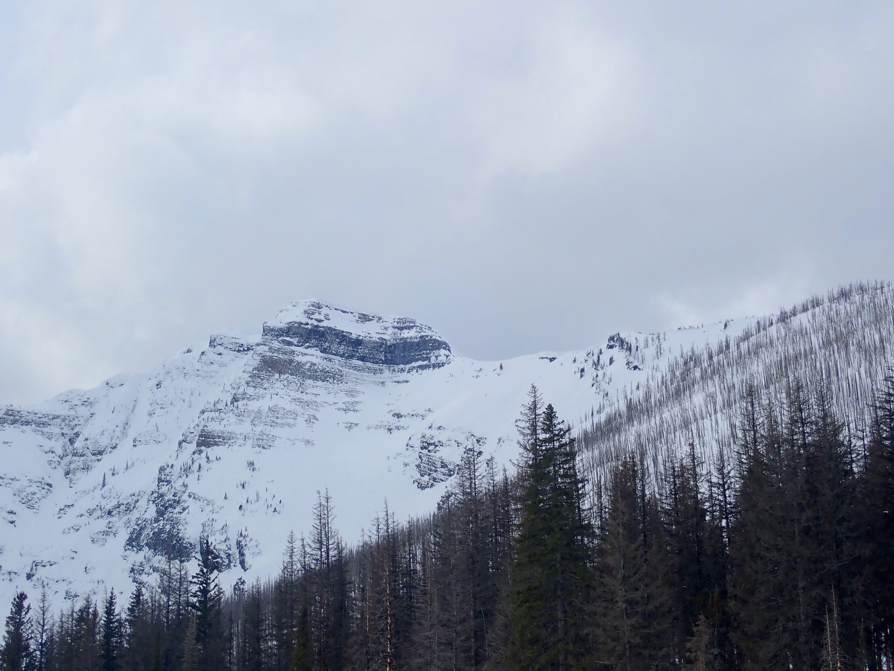 Access is via the Akamina Parkway. I parked at the winter closure site and walked up the road to the Akamina Pass trail. I followed the trail looking for the cutline marking the provincial boundary. The forest had been burned by recent fires so it was actually a little tricky to see the cutline at first. When I reached a kiosk near the top of the pass I ascended up a hill to my left (south) then backtracked until suddenly the cutline came into view. I followed this southwest until it descended to the base of what Nugara calls “the big hill”. The cutline goes straight up the hill, but I zigzagged a bit then diverted diagonally to my left (east) to get to some more gentle slopes. This ascent was a slog. There was lots of snow on the hill. Plenty of burned trees were still standing and acting as anchors but as time goes on and the trees fall I get the feeling it will be quite unsafe to charge directly up the path of that cutline.