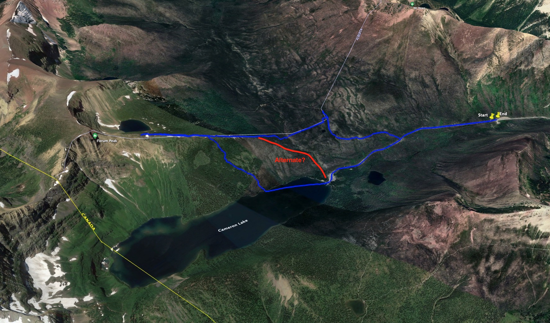 This route will likely become more hazardous in the coming years as the natural anchors on these slopes fall away (that’s just an opinion, I’m not an expert). It may be safest to ascend and descend on the broad, shallow-angled toe of Forum Ridge that starts near the north end of Cameron Lake (which I think was the route taken by the skiers I met).