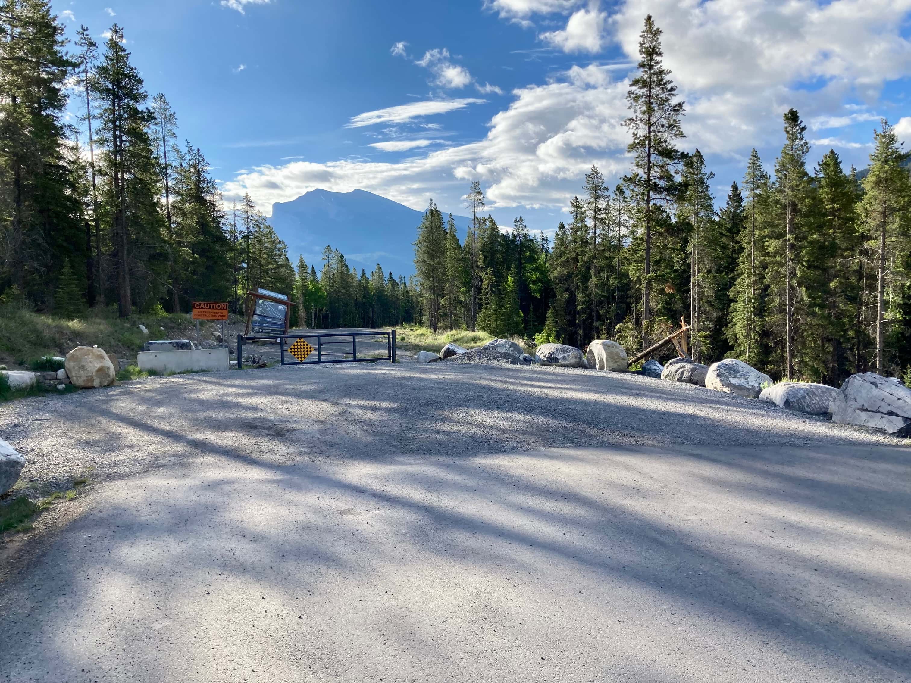 The route starts just east of an area of active housing development next to Stewart Creek Golf and Country Club. We parked where the Three Sisters Parkway ends. Click here for the Google map. We followed the gravel road southeast for a little over a kilometre, until we passed a roped-off fork heading west. Just past there, in a small clearing, a trail headed off into the trees to the west. We followed this path until it intersected Stewart Creek. This area of the creek bed had been cleared of rubble and there was a small dam across the creek. We crossed over the creek onto a well defined trail on the north side. This trail went through the trees then very soon led us to the rubble and boulders of the creek bed upstream of the cleared area.