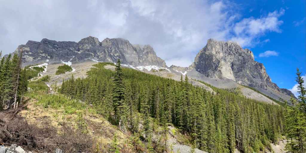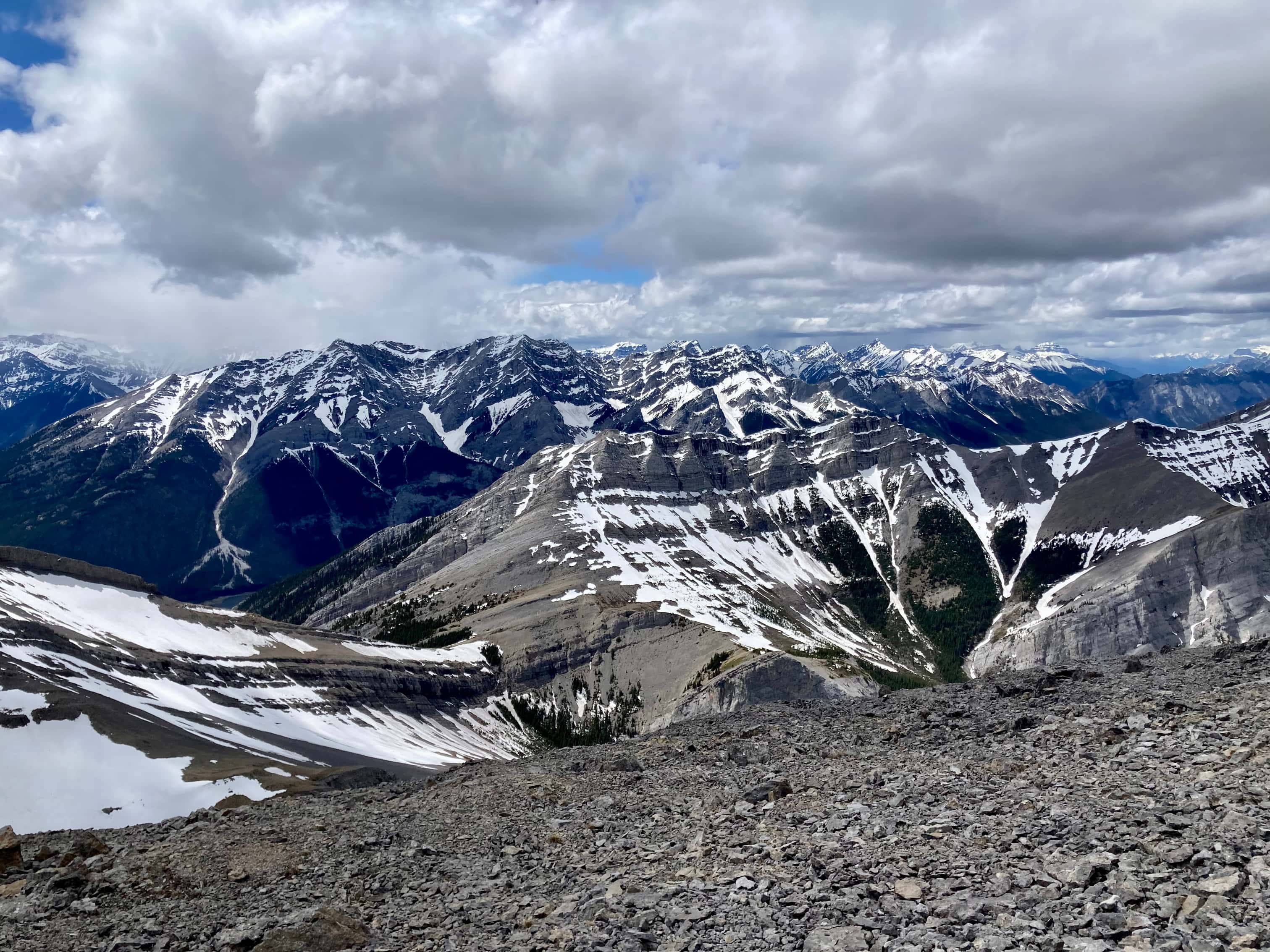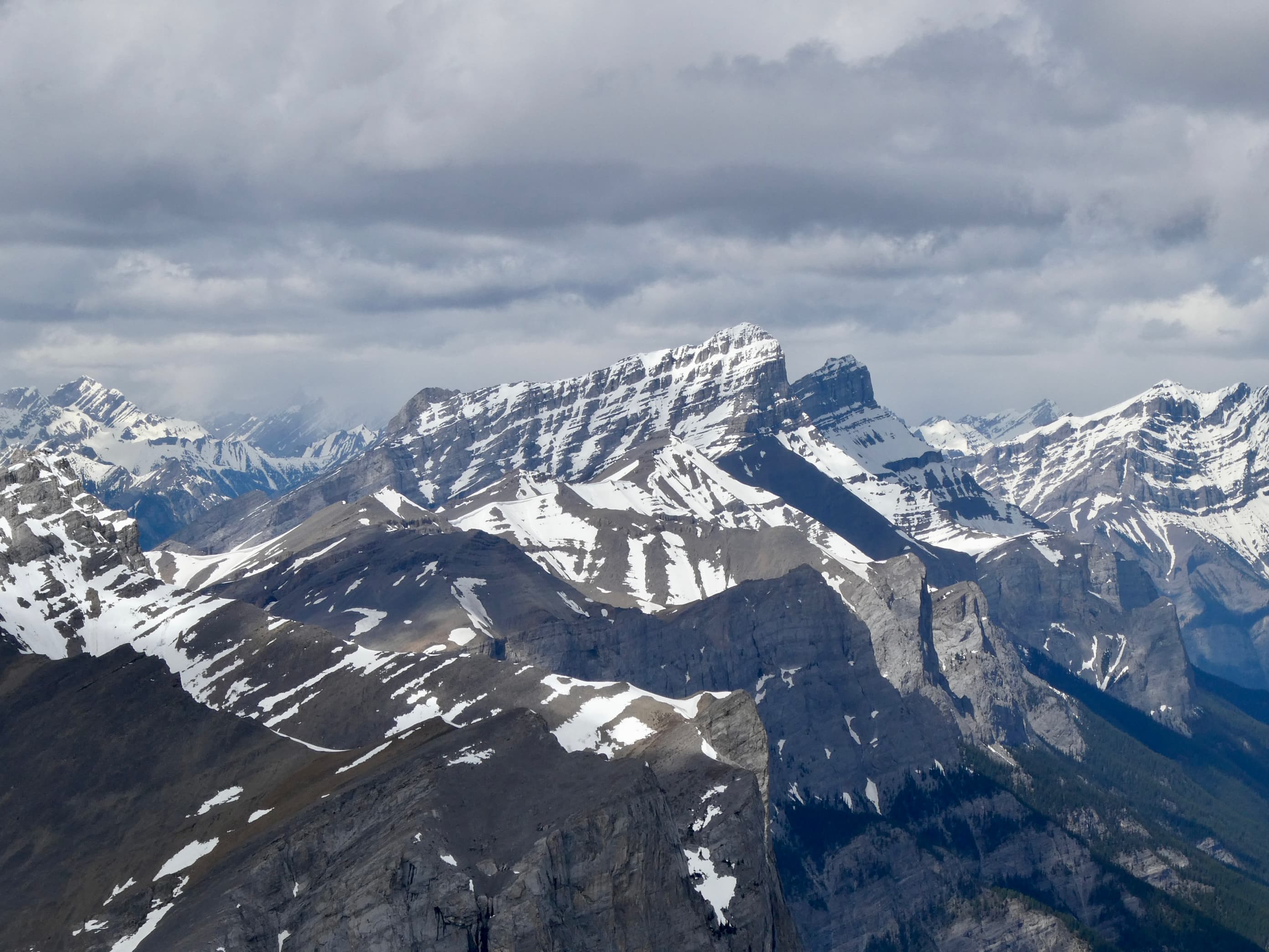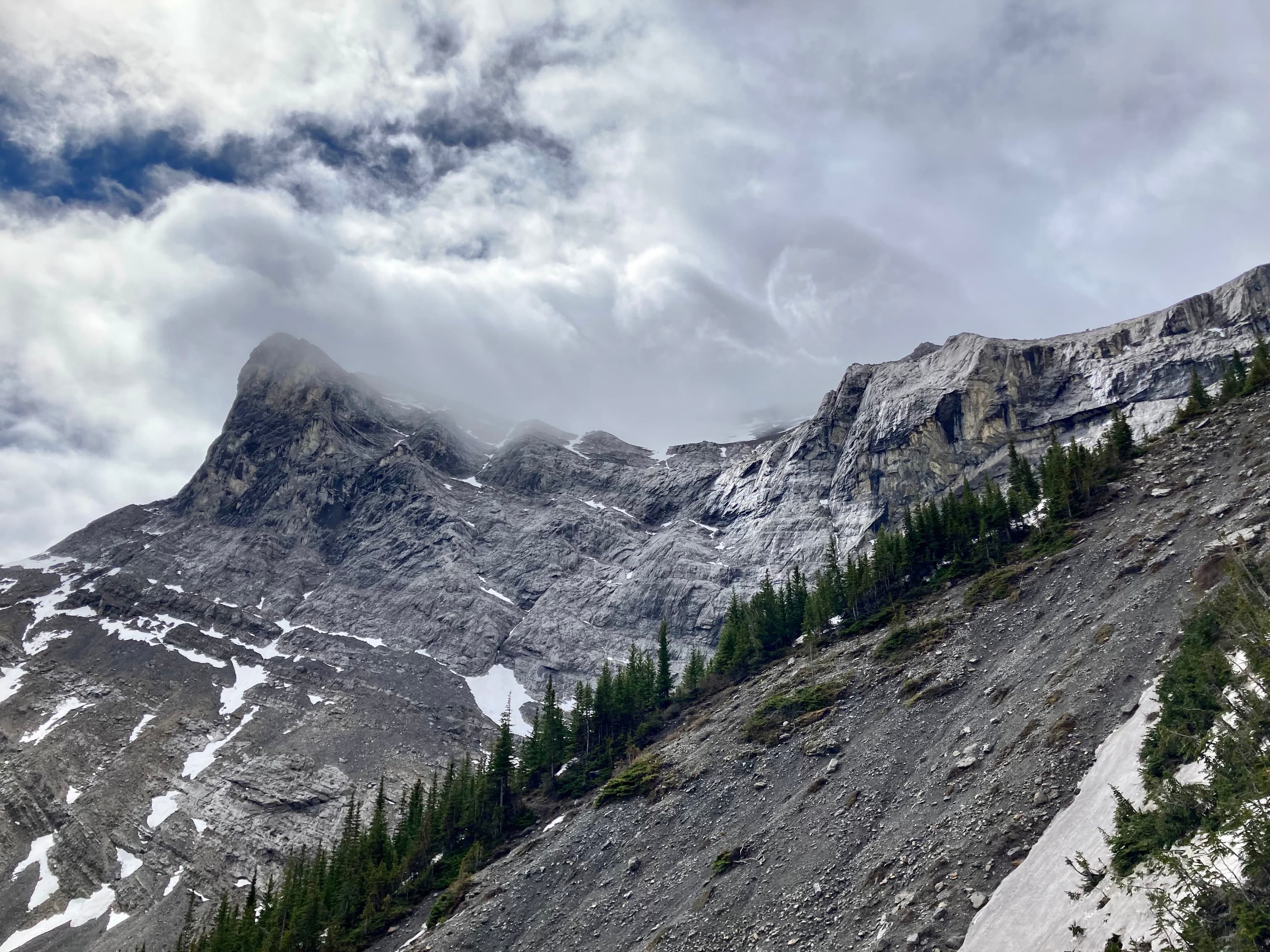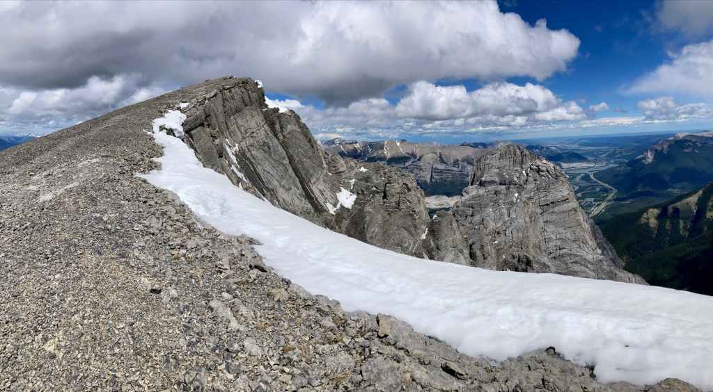 Route overview looking northwestThree Sisters as seen from Canmore. Our ascent of Middle Sister would be from the far side.The parking area – where Three Sisters Parkway ends. We headed out along that road, dodging dog poop that owners did not feel obliged to pick up.The start of the footpath through the woods. Just before this clearing there was a more substantial trail/road splitting off and heading west from the main road but it was roped off.The path through the woods eventually led us to the cleared creek bed featuring this dam. A 2×8 sitting across the top seems to be intended as a bridge. An actual bridge was sitting on the gravel some distance left of this frame. I’m guessing that someone eventually intends to properly place it. After crossing over the creek we followed a trail through the woods until it brought us back to the creek bed.Typical terrain in the creek bed.Taking shelter during the worst of the rain under a big boulder with an overhang.Once the sky cleared a bit we pressed on with navigating the rubble.The clouds cleared enough for us to get our first clear views of Middle Sister and Little Sister.The summit of The Orphan appears from out of the clouds.As we started the climb up to the bowl beneath Big Sister we encountered some snow. In places this complicated the ascent but it did speed our descent at the end of the day. We couldn’t glissade, and we had to watch out for snow bridges over running water, but there were several places we could safely boot ski.Higher up now, looking north while clouds roll through. Middle Sister’s cliffs are at centre. We had to ascend left until those cliffs petered out below the face of Big Sister, then hook around the end and start ascending. Big Sister is hidden in the clouds to the left. Little Sister is off to the right.Little waterfalls coming down from the cliffs of Middle Sister.The spot where Middle Sister’s cliffs end.In the cirque south of Big Sister. The cliffs ahead close off the valley and connect to Rimwall W2 and The Orphan.After hooking around the end of the cliffs we ascended northeast towards the col between Big and Middle Sister.Looking back from part way up.Nearing the col. False summit on the right.The first sight upon reaching the col – Ship’s Prow Mountain across the valley to the north, the taller peaks of the Goat Range beyond that.Big Sister seen from a short distance above the col.The summit finally came into sight.The summit of Middle Sister.Looking down at Canmore in the Bow Valley.Looking eastLooking southLooking westLooking northMount Rundle and Cascade MountainA closer look at Mount Rundle.I think this is Mount Temple.Mount Inglismaldie, Mount Girouard, and Mount PeecheeLittle SisterRimwall Summit, which we had climbed the day before, in the foreground. Mount Lougheed’s peaks are in the clouds beyond.Another look towards Ship’s Prow Mountain and the Goat Range. The clouds kept shifting. You can see precipitation incoming in a few spots.Heading down.During the descent was the first time we had Big Sister’s southern aspect full in view.Back down to the bowl. Sunshine, rain, waterfalls. There were even some marmots.A rainbow welcomed us back to the valley.