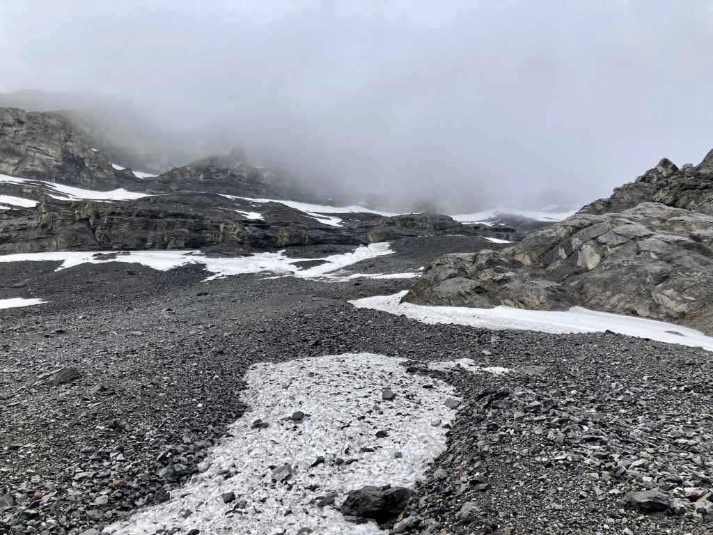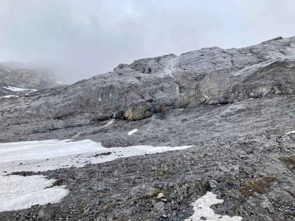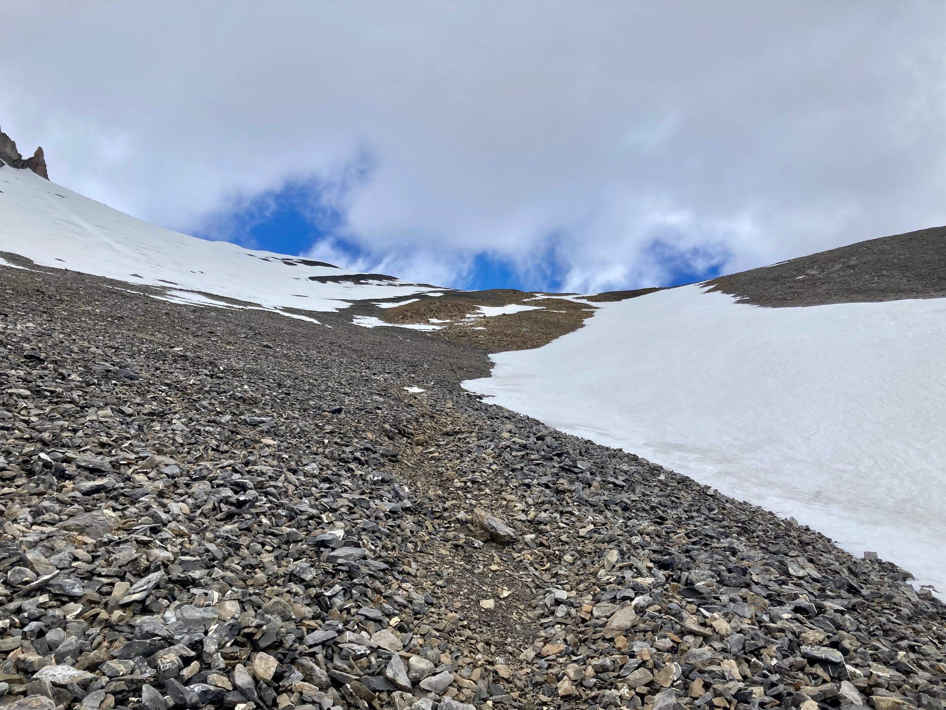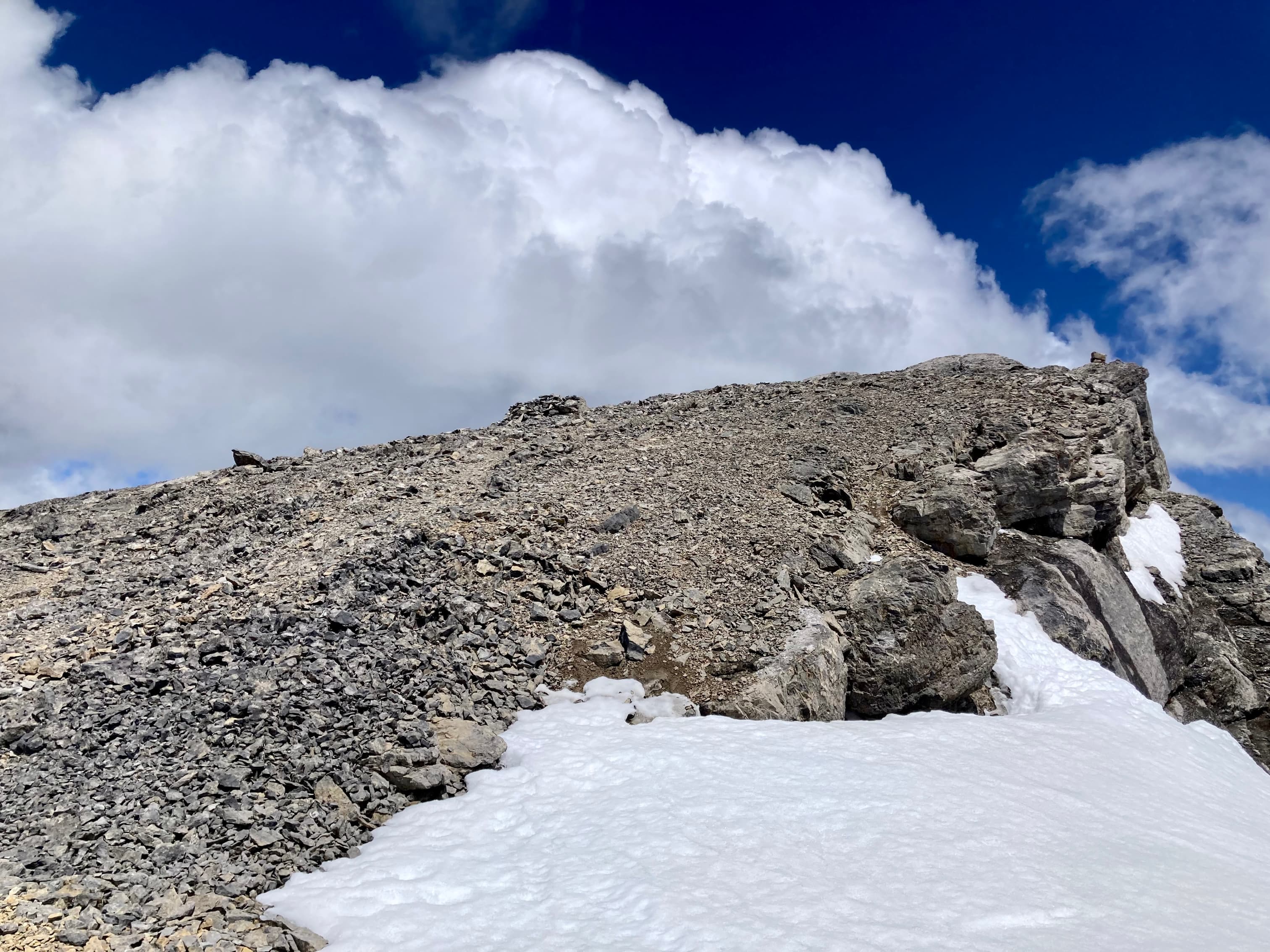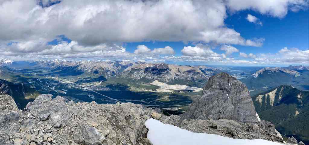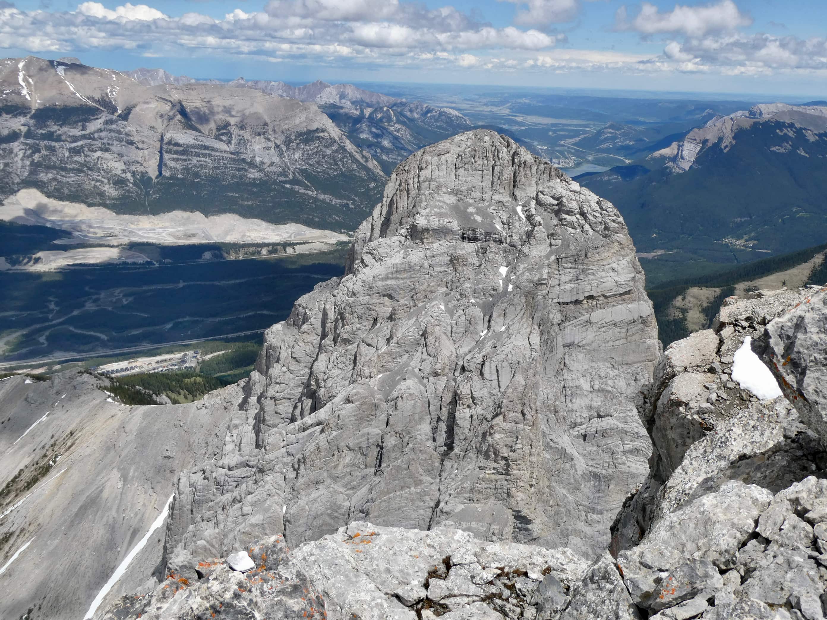 Route overview looking northwestThree Sisters as seen from Canmore. Our ascent of Middle Sister would be from the far side.The parking area – where Three Sisters Parkway ends. We headed out along that road, dodging dog poop that owners did not feel obliged to pick up.The start of the footpath through the woods. Just before this clearing there was a more substantial trail/road splitting off and heading west from the main road but it was roped off.The path through the woods eventually led us to the cleared creek bed featuring this dam. A 2×8 sitting across the top seems to be intended as a bridge. An actual bridge was sitting on the gravel some distance left of this frame. I’m guessing that someone eventually intends to properly place it. After crossing over the creek we followed a trail through the woods until it brought us back to the creek bed.Typical terrain in the creek bed.Taking shelter during the worst of the rain under a big boulder with an overhang.Once the sky cleared a bit we pressed on with navigating the rubble.The clouds cleared enough for us to get our first clear views of Middle Sister and Little Sister.The summit of The Orphan appears from out of the clouds.As we started the climb up to the bowl beneath Big Sister we encountered some snow. In places this complicated the ascent but it did speed our descent at the end of the day. We couldn’t glissade, and we had to watch out for snow bridges over running water, but there were several places we could safely boot ski.Higher up now, looking north while clouds roll through. Middle Sister’s cliffs are at centre. We had to ascend left until those cliffs petered out below the face of Big Sister, then hook around the end and start ascending. Big Sister is hidden in the clouds to the left. Little Sister is off to the right.Little waterfalls coming down from the cliffs of Middle Sister.The spot where Middle Sister’s cliffs end.In the cirque south of Big Sister. The cliffs ahead close off the valley and connect to Rimwall W2 and The Orphan.After hooking around the end of the cliffs we ascended northeast towards the col between Big and Middle Sister.Looking back from part way up.Nearing the col. False summit on the right.The first sight upon reaching the col – Ship’s Prow Mountain across the valley to the north, the taller peaks of the Goat Range beyond that.Big Sister seen from a short distance above the col.The summit finally came into sight.The summit of Middle Sister.Looking down at Canmore in the Bow Valley.Looking eastLooking southLooking westLooking northMount Rundle and Cascade MountainA closer look at Mount Rundle.I think this is Mount Temple.Mount Inglismaldie, Mount Girouard, and Mount PeecheeLittle SisterRimwall Summit, which we had climbed the day before, in the foreground. Mount Lougheed’s peaks are in the clouds beyond.Another look towards Ship’s Prow Mountain and the Goat Range. The clouds kept shifting. You can see precipitation incoming in a few spots.Heading down.During the descent was the first time we had Big Sister’s southern aspect full in view.Back down to the bowl. Sunshine, rain, waterfalls. There were even some marmots.A rainbow welcomed us back to the valley.