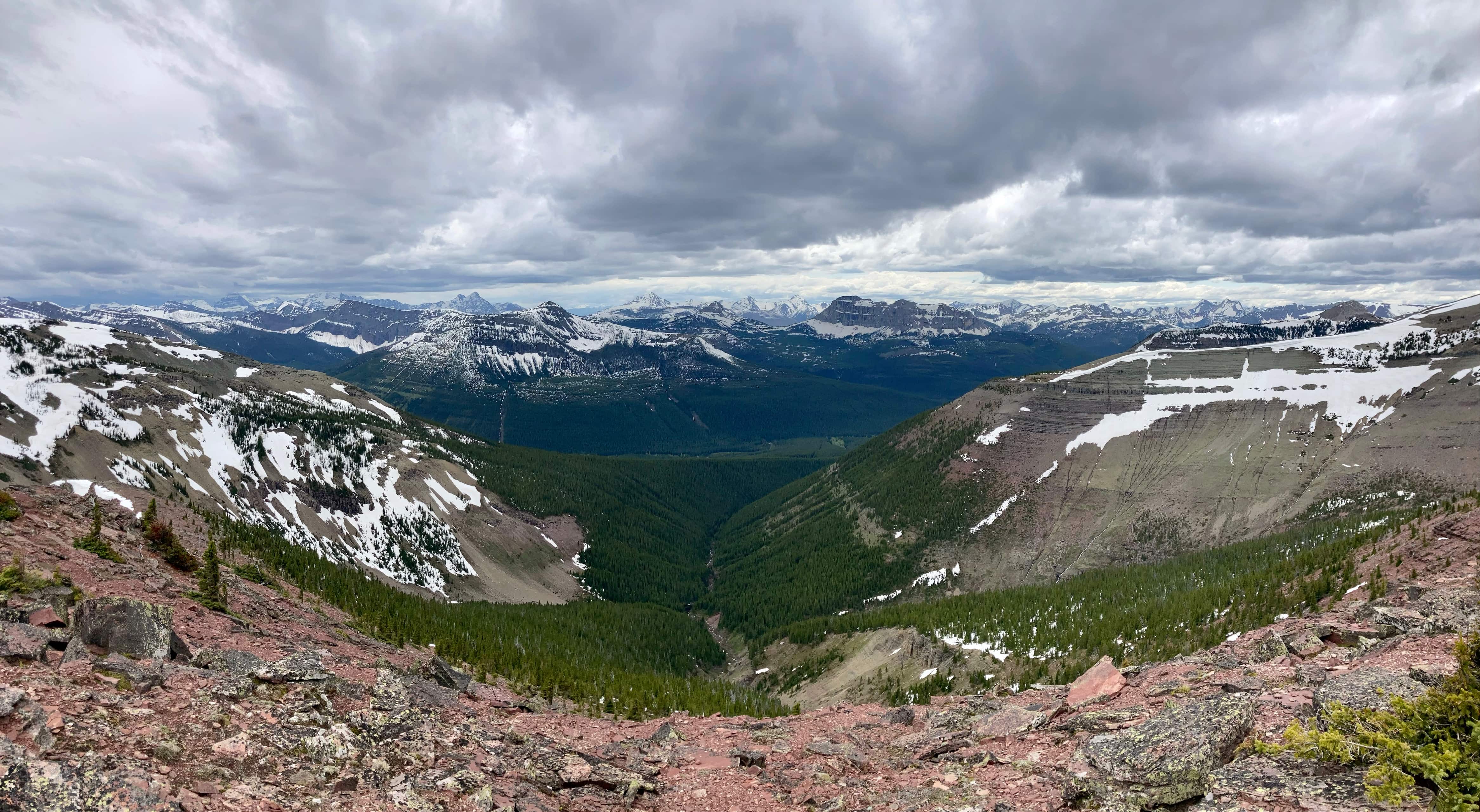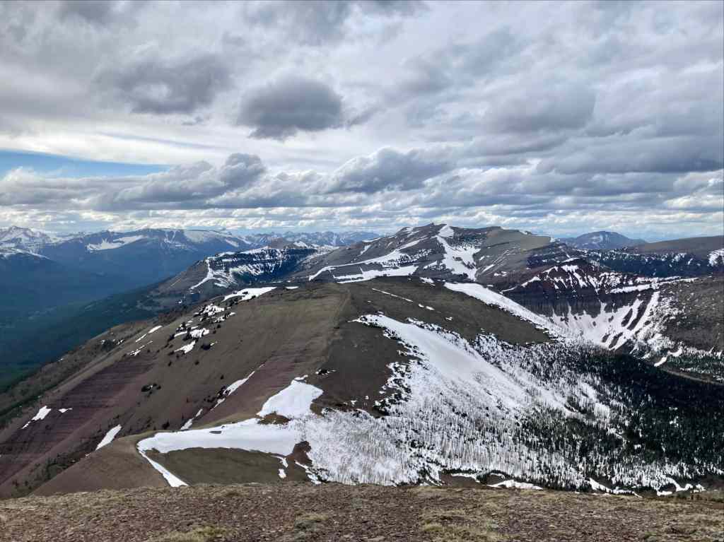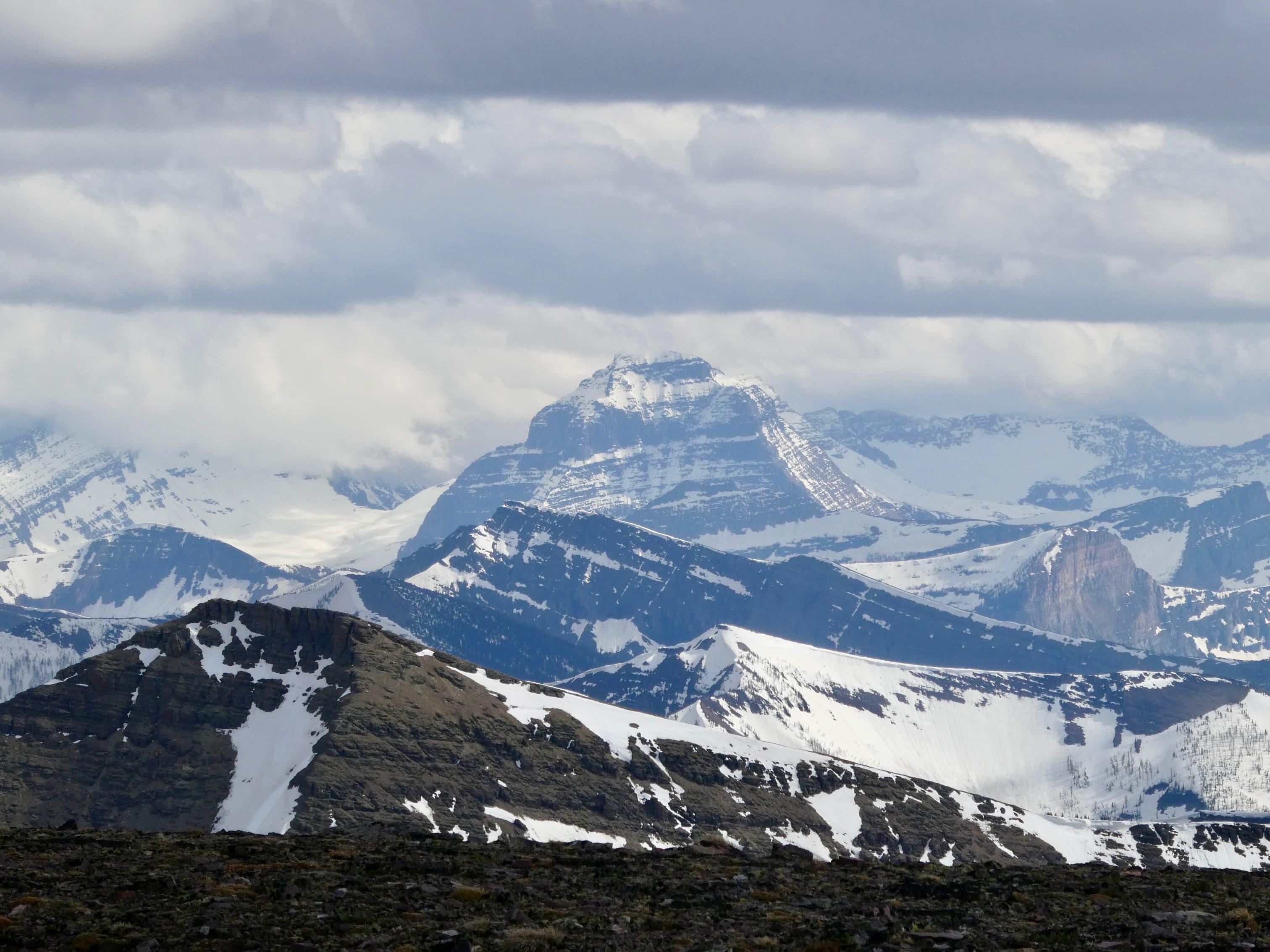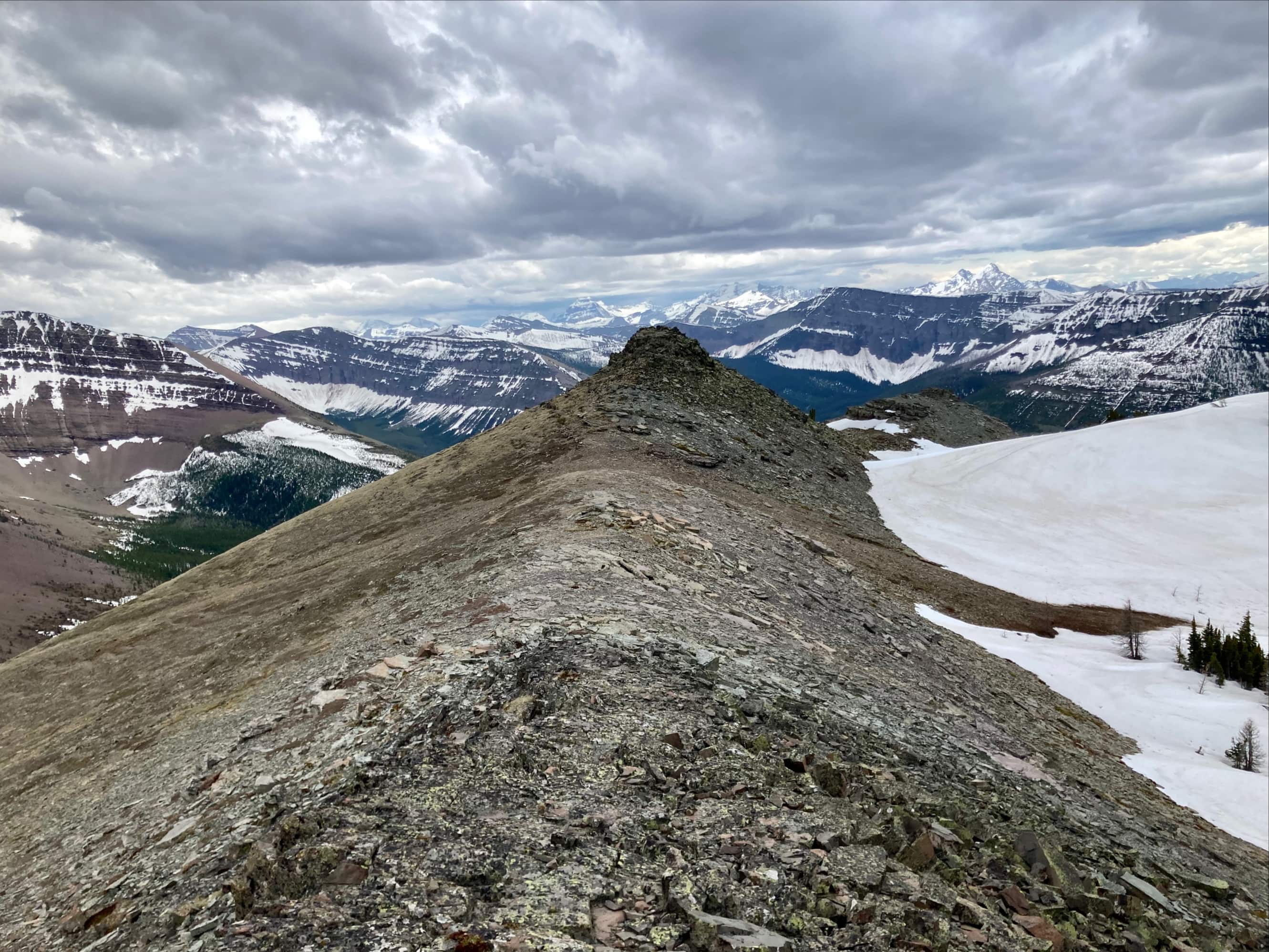 The long days around the time of the summer solstice call for long hikes, so I was pleased to be invited to join a group tackling one of the Castle’s “Ultimate High-Level Ridgewalks”: The Drywood Mountain to Loaf Mountain traverse. The “ultimate” label is from Nugara’s More Scrambles in the Canadian Rockies, and I think it’s an apt descriptor. After an initial bike ride and then a climb out of the valley bottom we spent the entire day walking on a high ridge surrounded by mountain peaks including views into British Columbia and Montana. Clouds came and went through the day but we were spared any major precipitation and even the wind stayed calm. The only hiccup in the day was near the end when we encountered difficulties finding a safe place to cross a very high and fast South Drywood Creek.