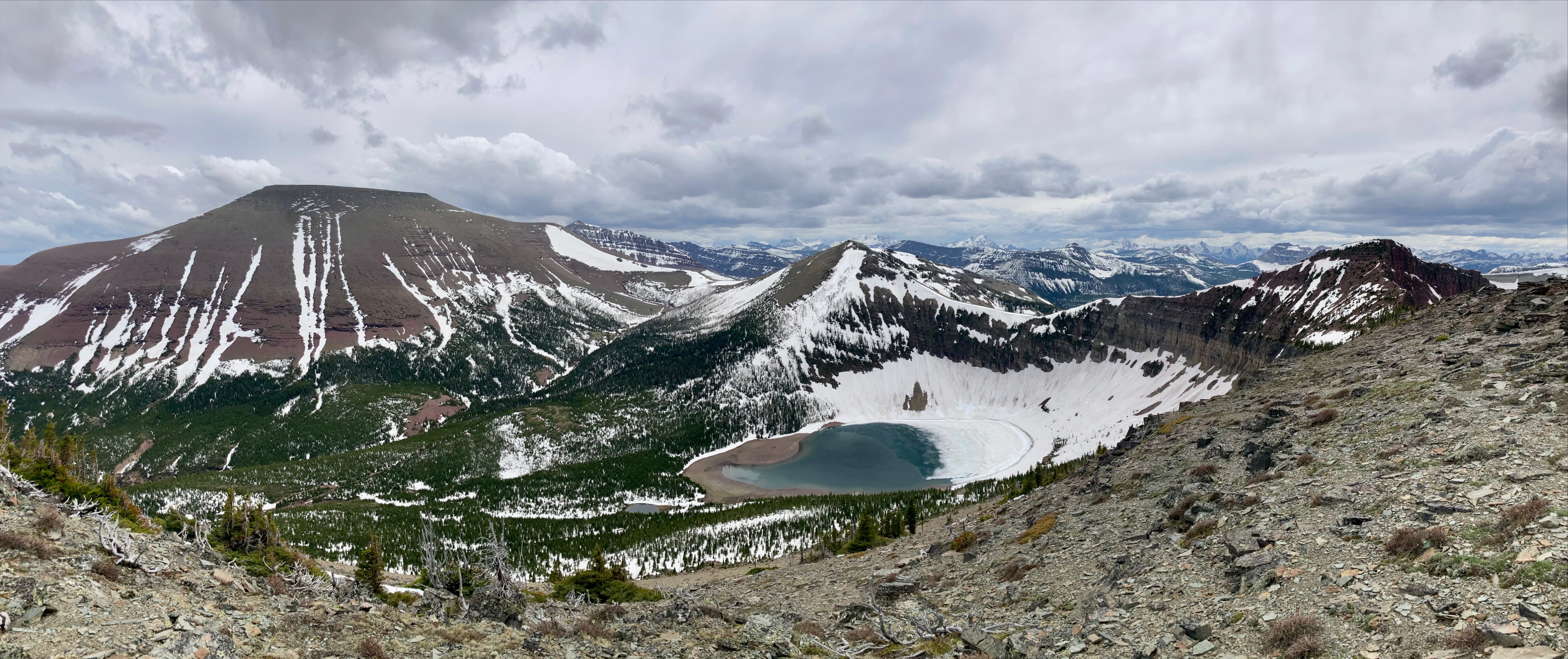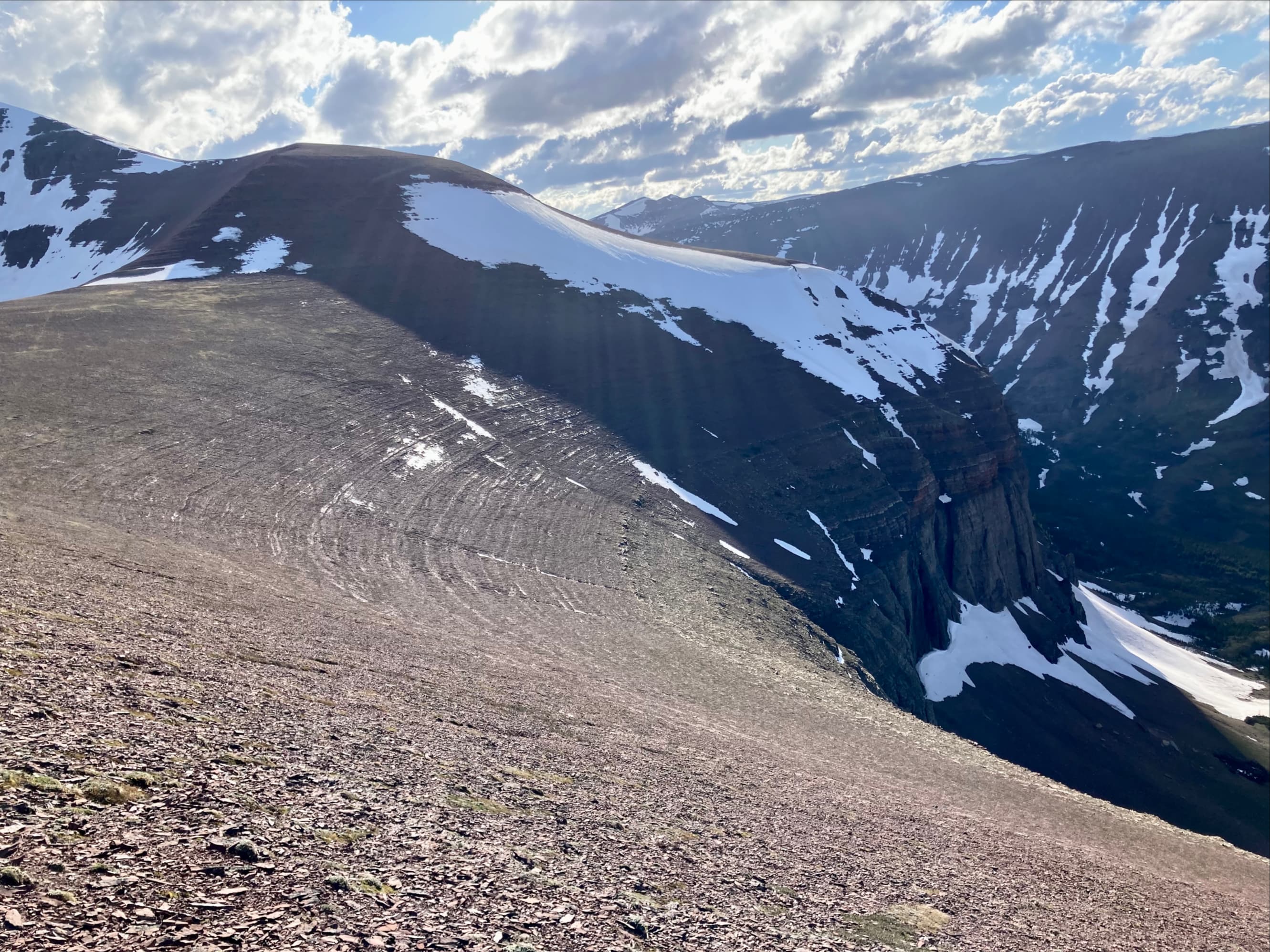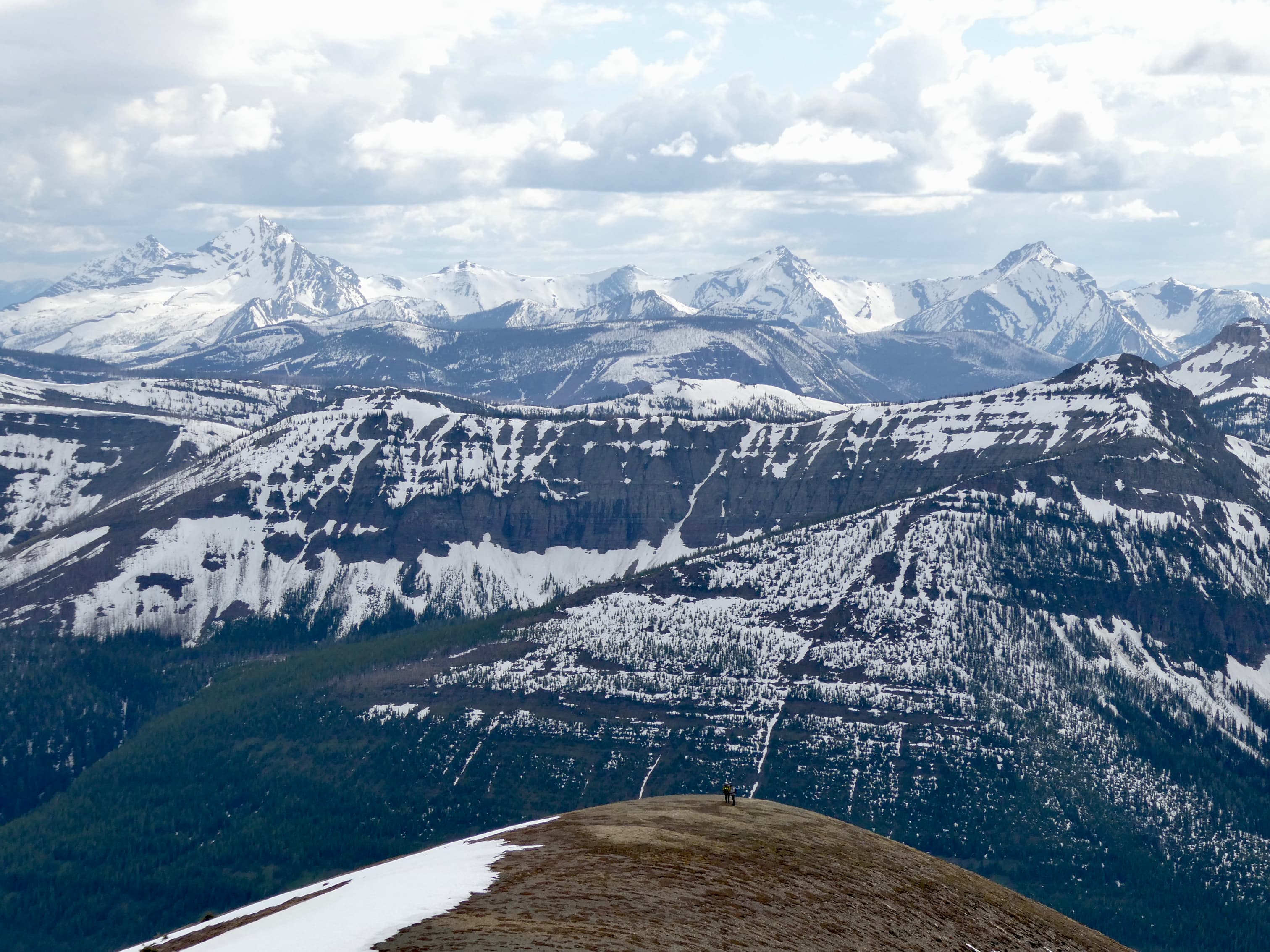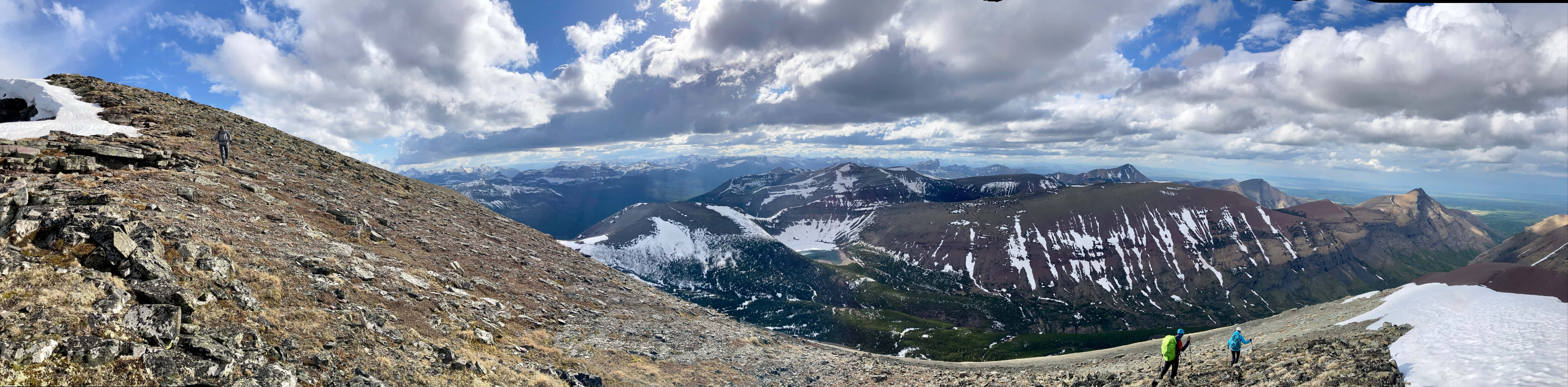 The long days around the time of the summer solstice call for long hikes, so I was pleased to be invited to join a group tackling one of the Castle’s “Ultimate High-Level Ridgewalks”: The Drywood Mountain to Loaf Mountain traverse. The “ultimate” label is from Nugara’s More Scrambles in the Canadian Rockies, and I think it’s an apt descriptor. After an initial bike ride and then a climb out of the valley bottom we spent the entire day walking on a high ridge surrounded by mountain peaks including views into British Columbia and Montana. Clouds came and went through the day but we were spared any major precipitation and even the wind stayed calm. The only hiccup in the day was near the end when we encountered difficulties finding a safe place to cross a very high and fast South Drywood Creek.