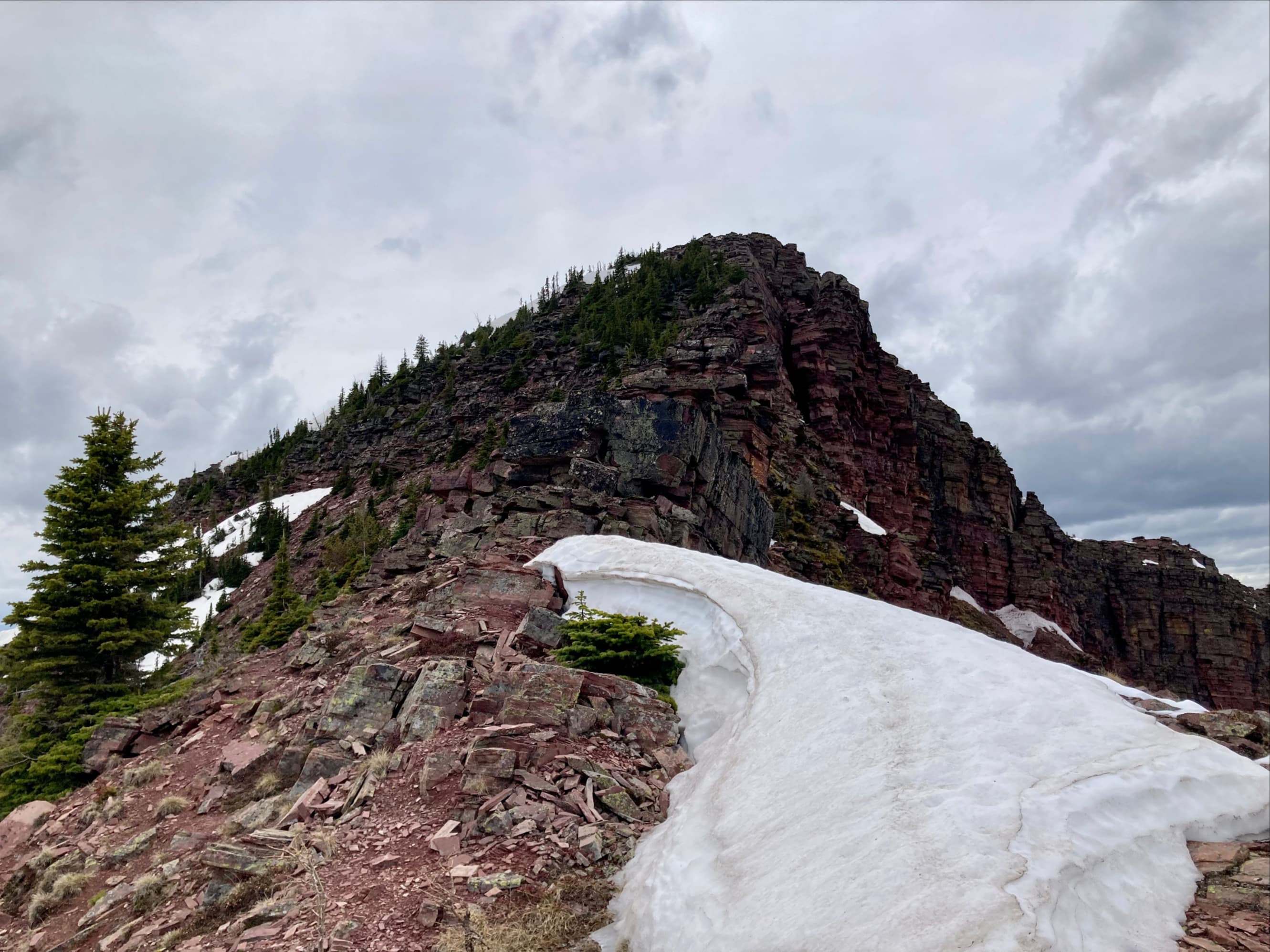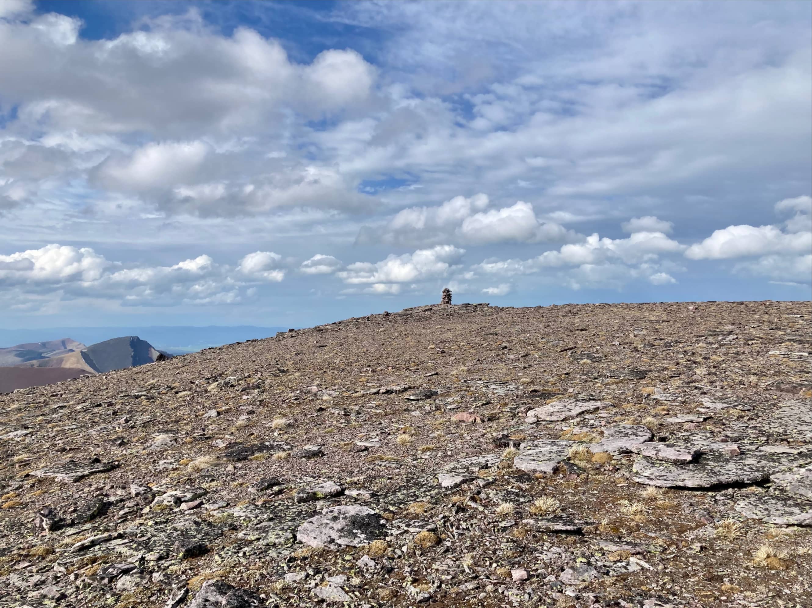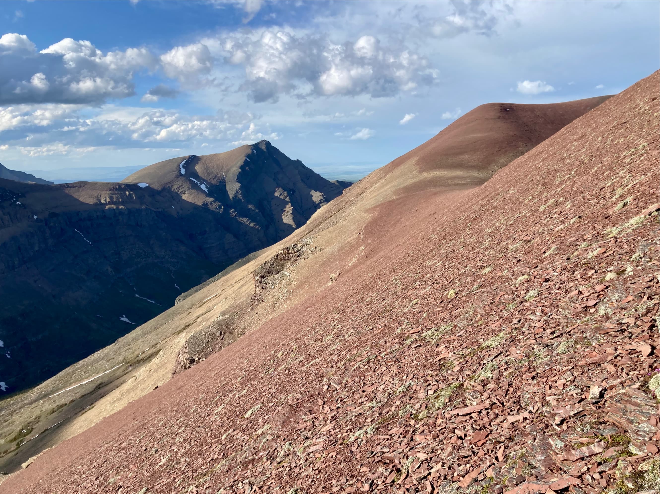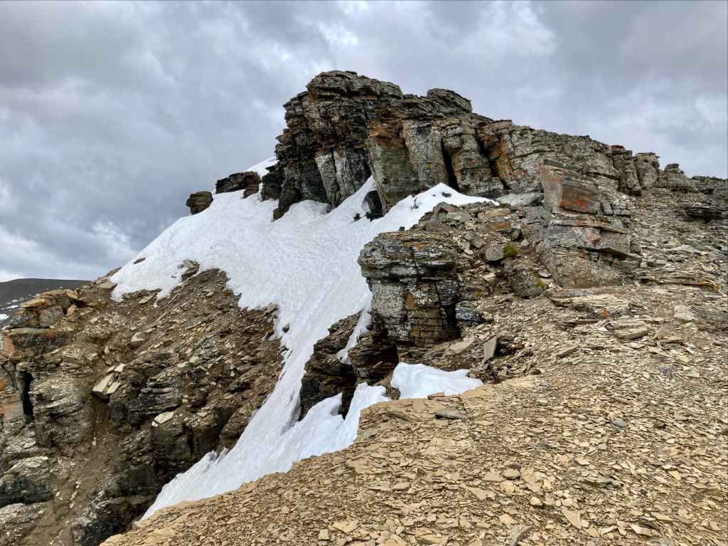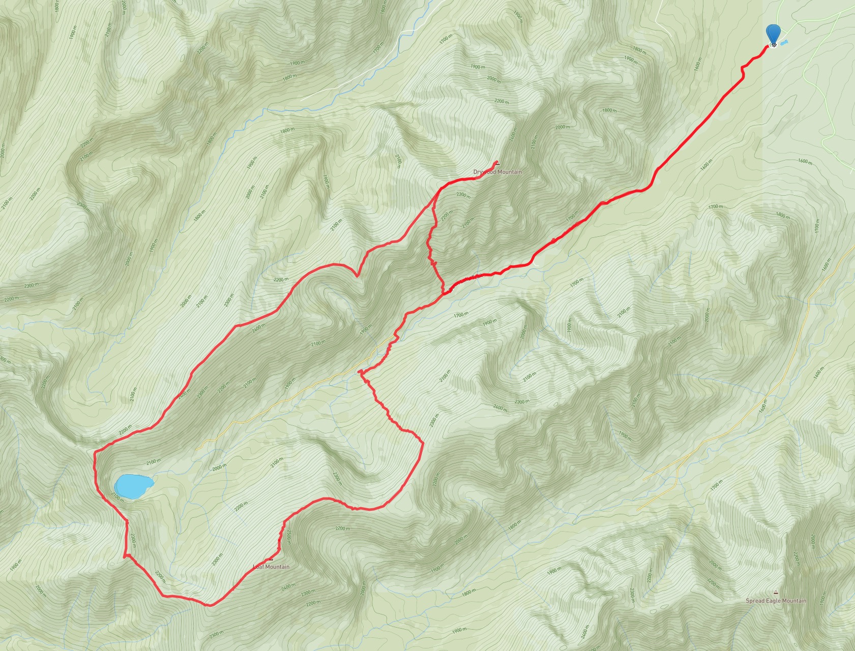 Access and the initial approach on bicycle is the same as for Drywood Mountain. Detailed information and pictures can be found in my post from 2020. That trip involved a ridge walk to the western high point of Drywood Ridge then descending down to Bovin Lake and returning along the trail in the valley bottom. In order to complete the traverse to Loaf Mountain, we instead remained on the ridge and followed it west towards a red argillite peak overlooking Bovin Lake which Dave McMurray named “Little Bo-peak”. After tagging that summit we descended along the ridge and then climbed a second little peak which McMurray named “Little Bo-blue”. Following the ridgeline as it hooked around we then turned east and ascended Loaf Mountain along its western ridge (I’d been up that way before on a sunny day in 2018).