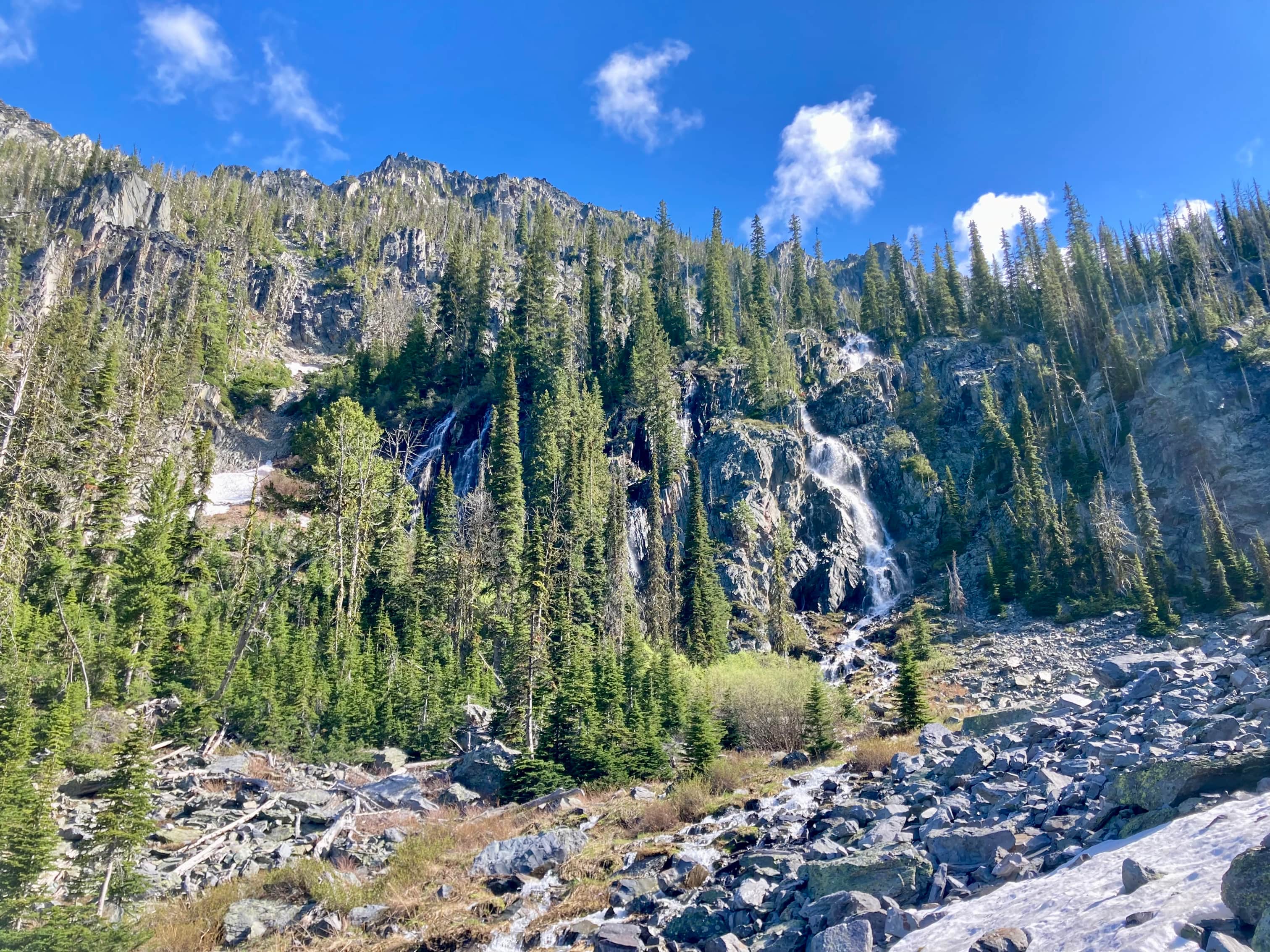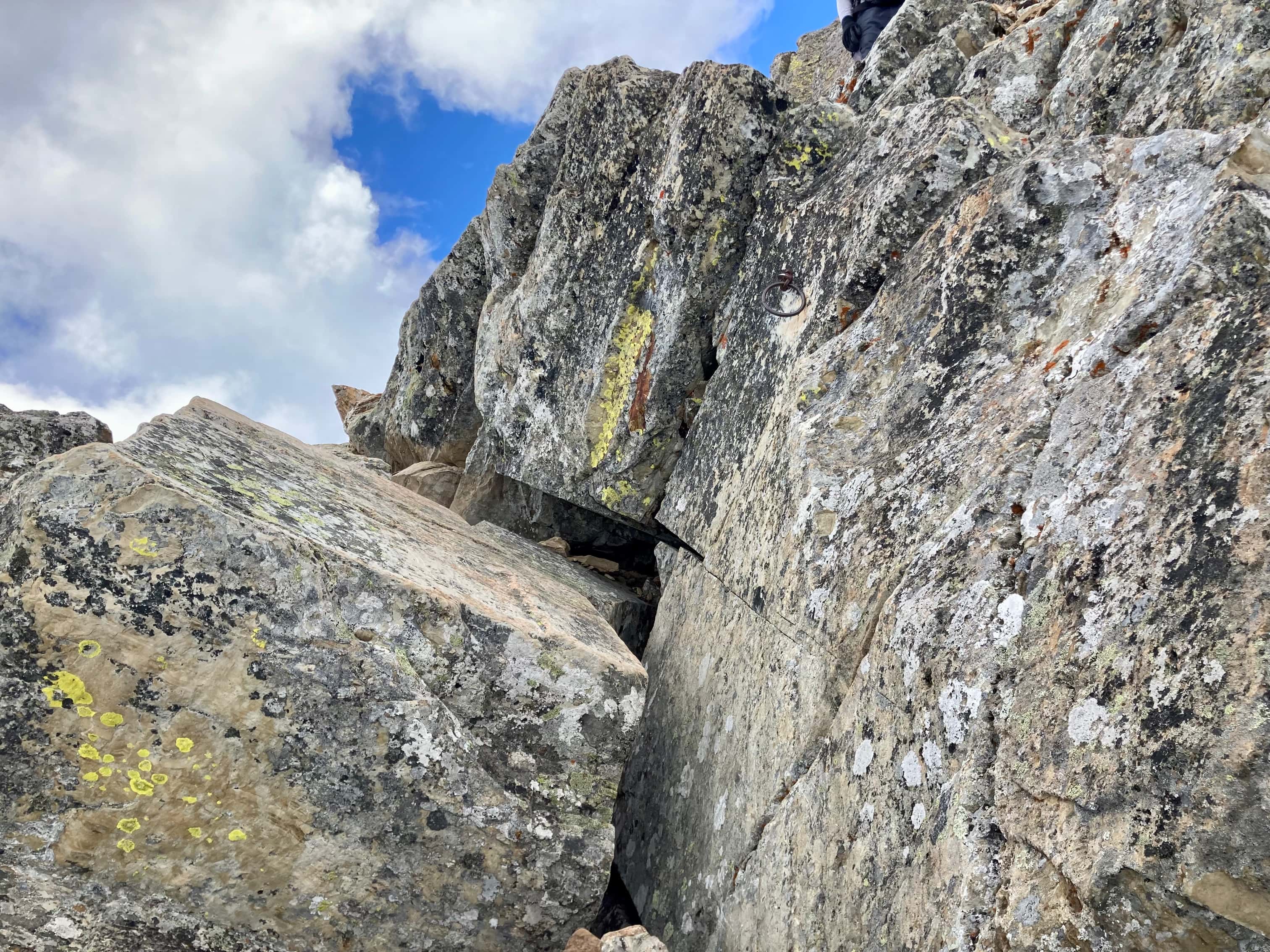 The trail briefly levelled out as we moved onto the rockfall. There were cairns guiding us in the right general direction. A headwall with a cluster of small waterfalls coming down it came into view and we cut left into the woods, finding the trail and following it as it ascended above the waterfalls. We then came out into the elongated valley leading to the cirque beneath Mount Fisher and the connecting ridge between it and an unnamed southern outlier. We were able to identify the “notch” in the col which was the next objective for the ascent. We crossed some residual snow and started sharply uphill towards the col. Once at the col we turned left and followed cairns and a few bolted-on signs. Initially the route doesn’t go directly up the ridge but deviates slightly east (right) before swinging back for the last part of the ascent. After ascending the crux, marked by a bolt and ring, we were soon on the summit.