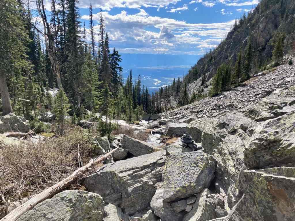 From the trailhead, we began a steep ascent through the woods. A kiosk is present a short distance up the trail with pictures pointing out key navigation spots along the route. The path was pretty obvious and we just had to go over or around a couple of fallen trees. Soon the path came alongside a creek cascading down from the valley above. We climbed along the right-hand side of the creek and eventually encountered the spot where it emerged from beneath a large rockfall. Crossing over the rocks it was fascinating to listen to the creek gurgling unseen beneath us.