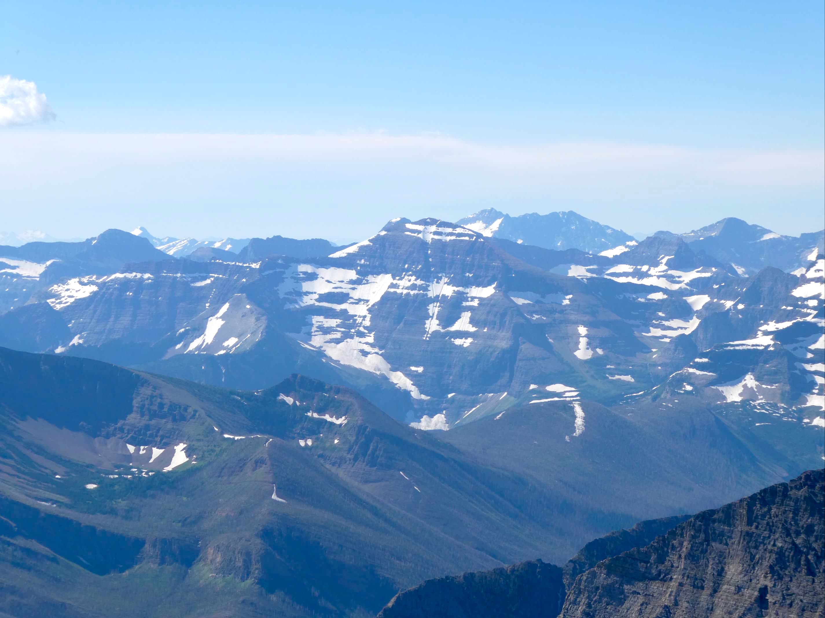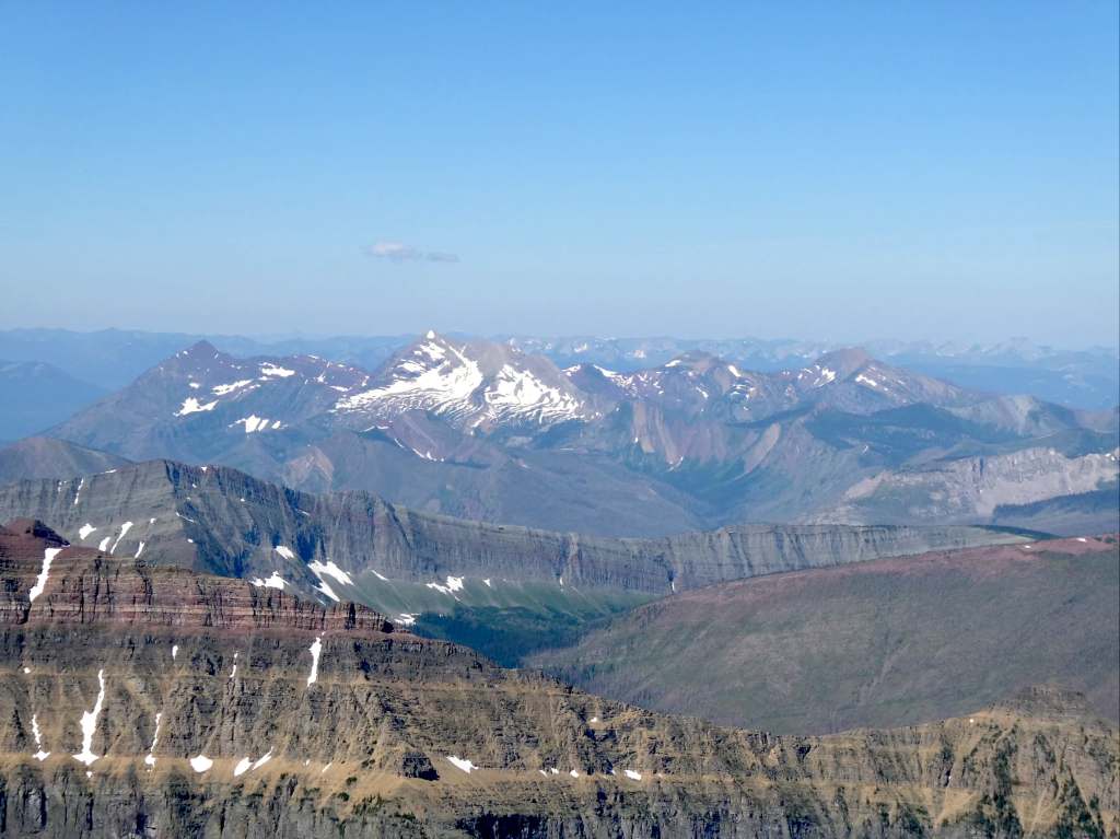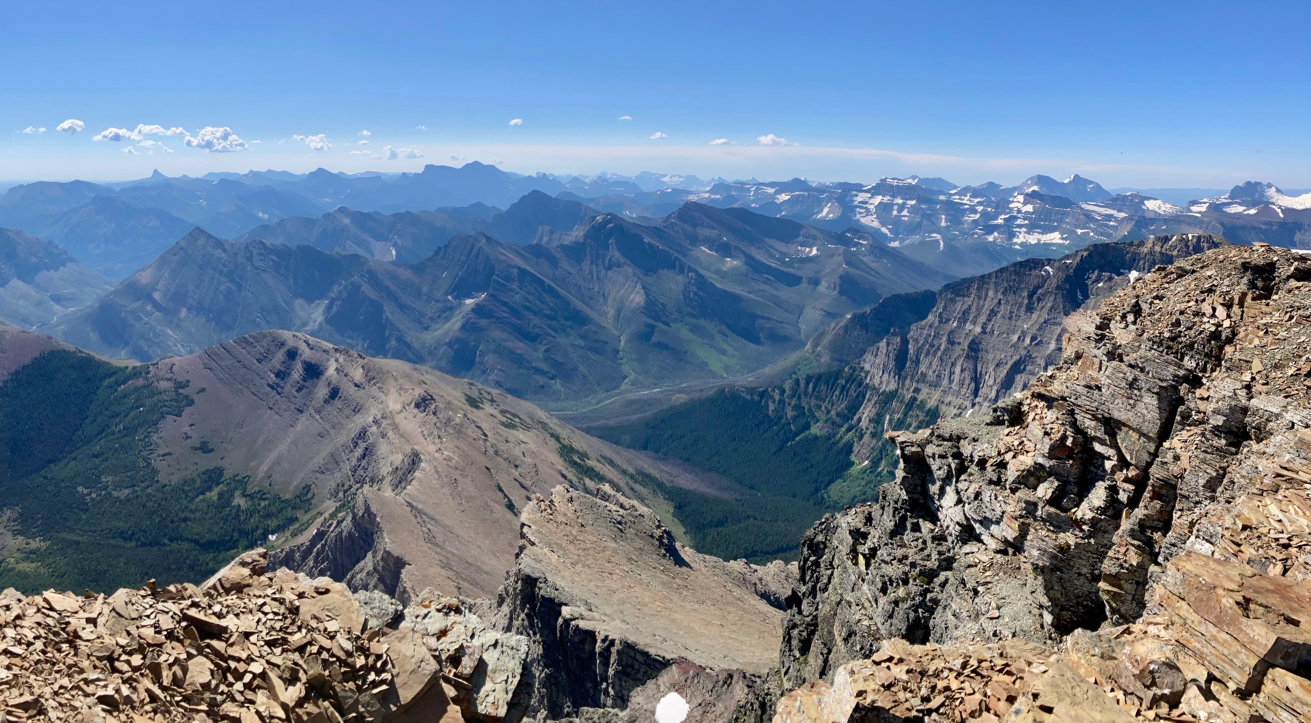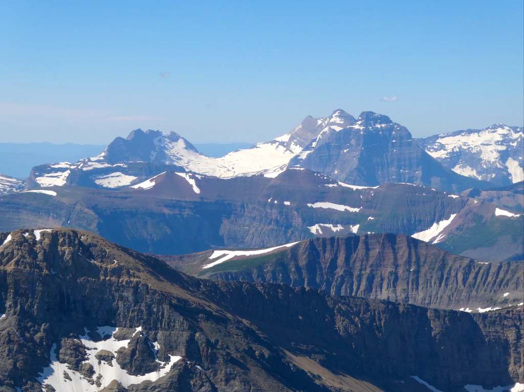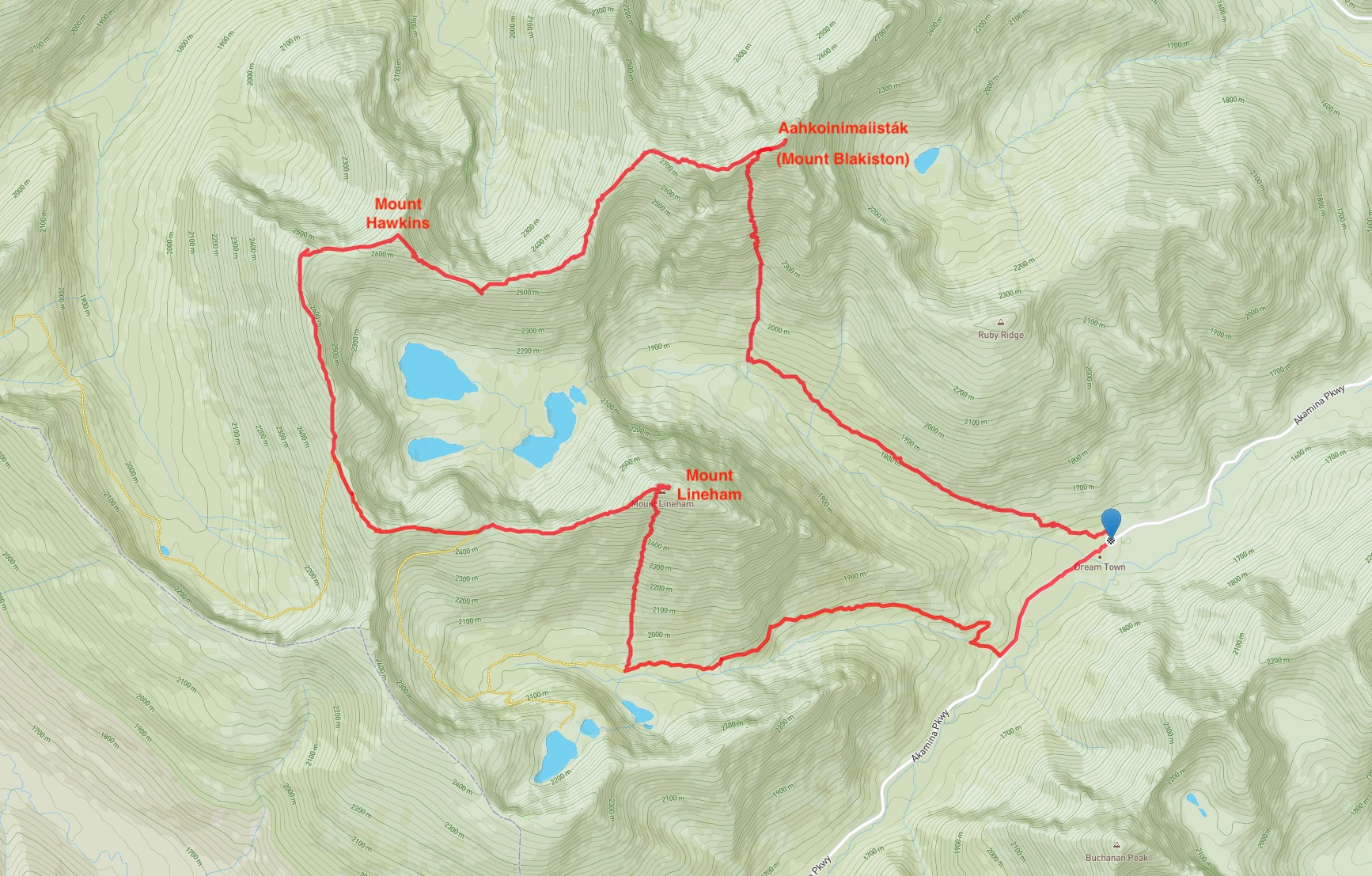 Overview of the entire Hawkins Horseshoe Route, travelled counter-clockwise.If anyone’s interested in how my route deviated from the “usual” one, here’s my track (blue) and the track from Topo Maps Canada – which I think is Bob Spirko’s (red). At the spot were the ascent drainage splits around an island of trees, I carried on following the leftward limb instead of cutting hard back to the right.Early morning on the Lineham Falls trail. Mount Lineham’s north face is lit up.On my own again. After several weeks of group outings, I was back in my usual state.A portion of the Lineham trail goes through burned forest. The underbrush was growing vigorously.Thimbleberry bushesThimbleberry flowersThe first clear view to Lineham Falls coming down the headwall at the end of the valley. Just past here the trail descends into the avalanche pathway.A closer look at the falls. Hiking to the foot of Lineham Falls makes for a great outing in itself.Looking up the ascent drainage. Aahkoinimaiisták’s Summit block is at centre. The foreshortened view makes the mountain seem somewhat squat in a photograph. The summit is still something like 1100 vertical meters above this point.Ascending to the right of the drainage. As I got higher the angle of the mountain slope resulted in a loss of line-of-sight to the summit block, but at this point the route was clearly visible.Staying close to the drainage allowed for a steep but easy ascent, with areas of step-like rock.Where the exposed rock of the ascent drainage fizzles away there’s this view of two subsidiary drainages descending on either side of a treed rocky outcrop. The summit block is now out of sight – the tall cliffs to the left of centre are west of the summit. I decided to go through the obvious weakness on the left and then angle back towards the right. Turns out I didn’t angle back enough (or at all). I ended up just continuing to climb straight up.Moderate scrambling territory without any major exposure.Taking a break to look back at Mount Lineham.With some more climbing I soon got to the very well defined stratum of the Purcell Sill. I knew that the tall rocks to the left were not the summit, nor the prominent rocks to the far right. I figured I’d see the summit block once I got over the Sill.Looking towards Lineham Falls, I could see that I had climbed above the level of the headwall and could see into the Lineham Lakes’ hanging valley.Up against the Purcell Sill. The usual route ascends through it some distance to the right. At this point I was still blithely doing my own route-finding so I climbed up a short ways left of here. Above the Sill. The black rocks of the summit block come into view but now I can see I’m too far to the left to be on the usual route.I took a little break to check out some flowers. I haven’t successfully identified this one.Admiring the rock towers as I close in on the summit ridge.Looking at Lineham Falls again. I had climbed high enough that peaks in Glacier National Park were visible beyond the intervening ridges.Carrying on, I could see that I was a short and easy climb away from the summit ridge. At this point I did take out my GPS and confirmed my suspicions of my location.This high point came into view on my left and I could tell I was running out of mountain to climb.Once I was up on the ridge, I turned right and walked up to the summit.The summit of Aahkoinimaiisták (Mount Blakiston).Looking southeast. Ninaiistako (Chief Mountain) is seen at the left. Just left of centre is Nii’tsitsspitaa (Mount Cleveland). Buchanan Ridge is across the valley.Chapman PeakMount Carter and Rainbow Peak in the distance. Mount Custer is at centre just in front of them.Looking southwest. Mount Peabody, Kintla Peak, and Kinnerly Peak on the left. Long Knife Peak, King Edward Peak, and Starvation Peak near centre. Miskwasini Peak, Kenow Mountain, and Langemarck Mountain on the right.Mount Peabody and Kintla Peak with the Agassiz Glacier between them. Kinnerly Peak is right of centre blocking out part of Kintla Peak.Long Knife PeakKing Edward Peak and Starvation Peak.Miskwasini Peak, Kenow Mountain, and Langemarck Peak.Looking northwest. Anderson Peak is at centre. Newman Peak, Mount Glendowan, Cloudy Ridge, and Mount Dungarvan are beyond Anderson from centre to right.Looking southwest. Mount Galwey is near centre. “Rogan Peak” is to Galwey’s left along the ridge. Mount Dungarvan is to the left of Rogan. Ruby Ridge is across the valley to the right. Mount Crandell is right of centre, beyond Ruby Ridge. A little off the summit I had a better line of site to the west. Mount Lineham is across the valley. Lineham Lakes and Falls are to the right.A closer look at the lakes.Looking directly east and down. Ruby Lake sits in its little valley between Aahkoinimaiisták and Ruby Ridge.Setting off to the west. Part 2 of this trip report will detail the ridge walk to Mount Hawkins.