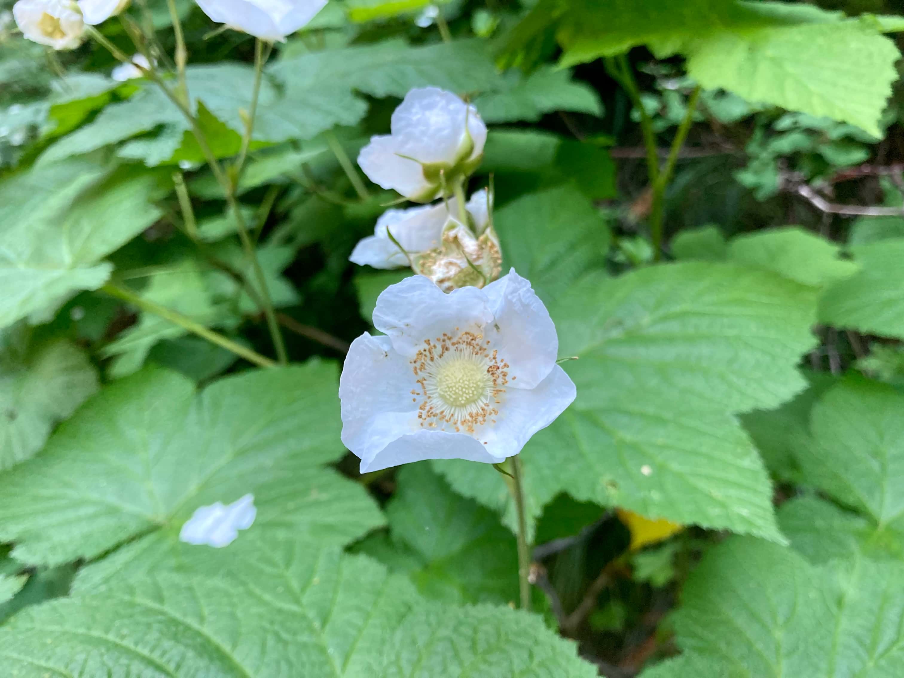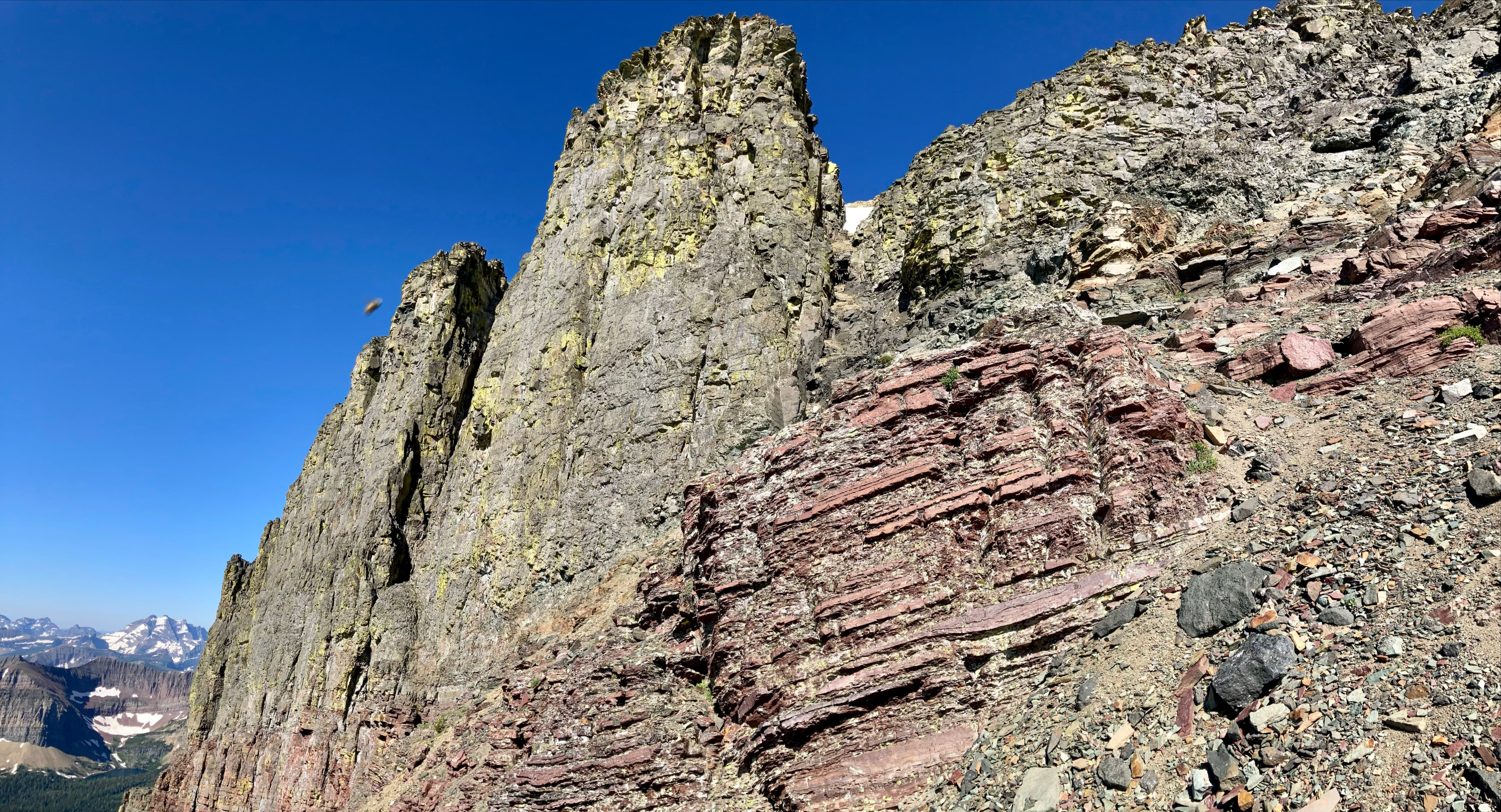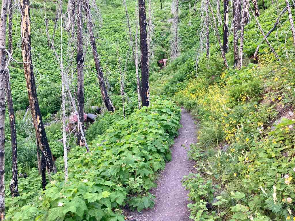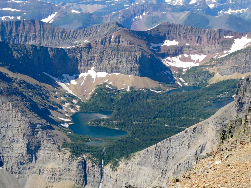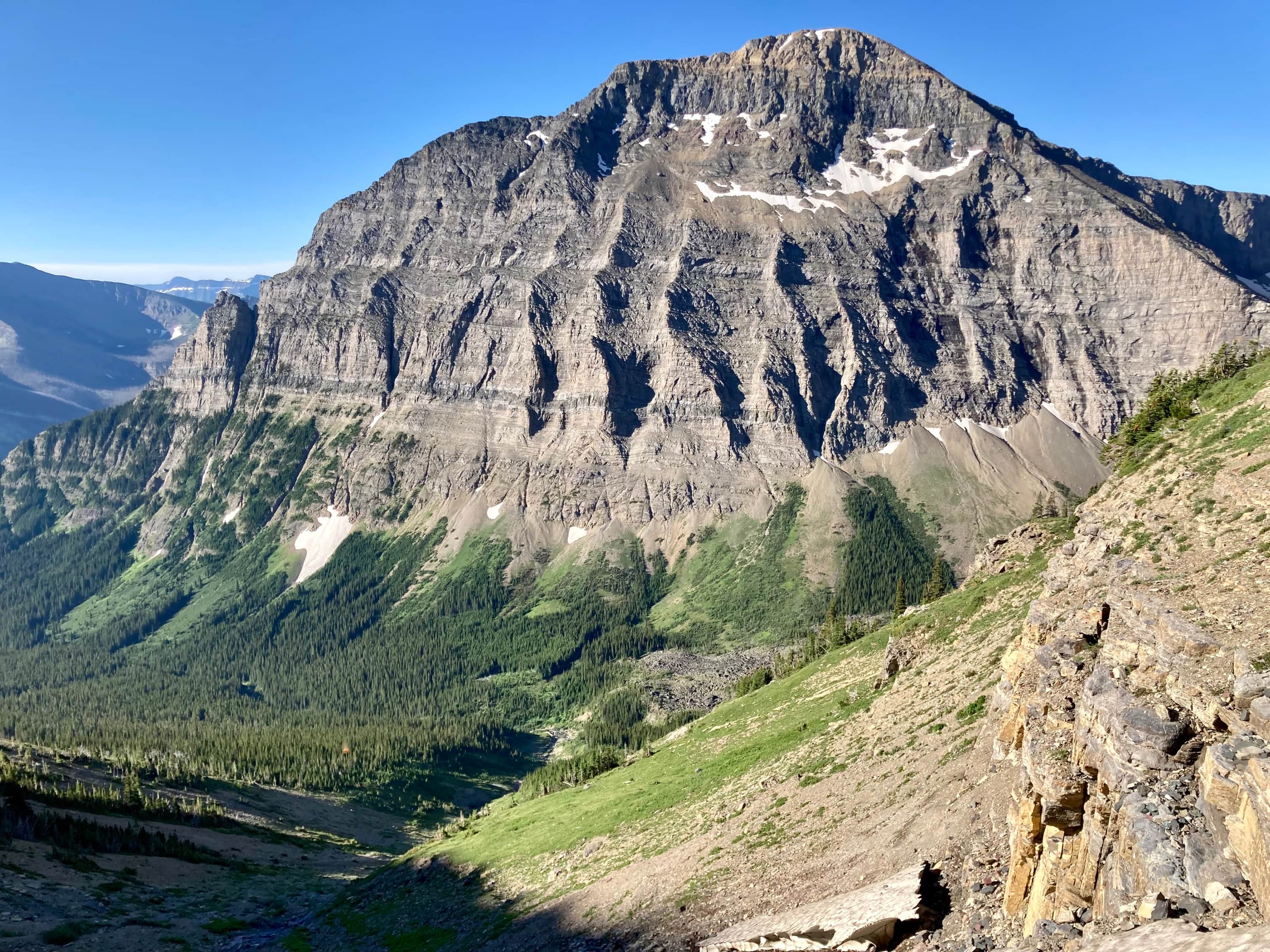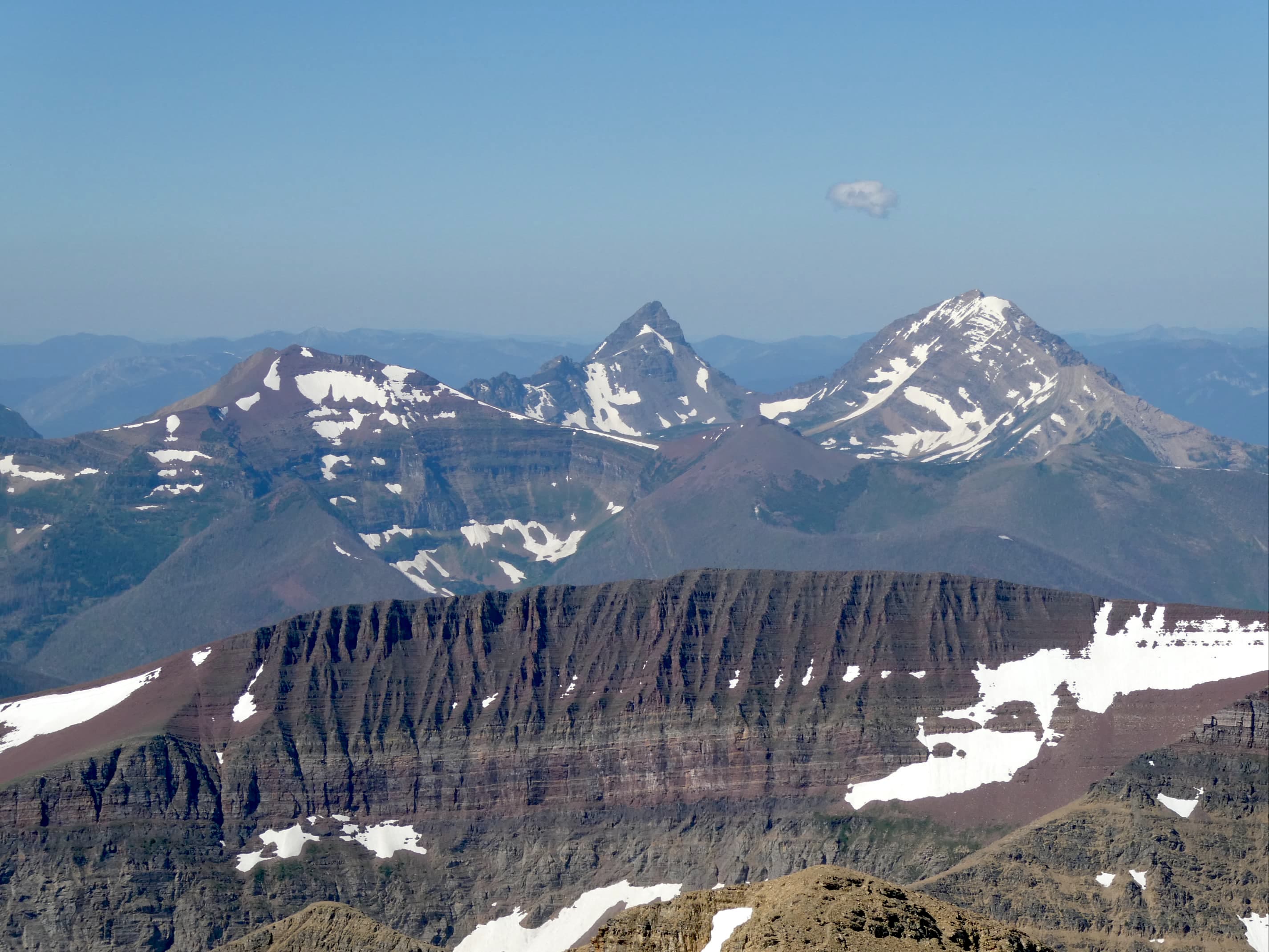 Overview of the entire Hawkins Horseshoe Route, travelled counter-clockwise.If anyone’s interested in how my route deviated from the “usual” one, here’s my track (blue) and the track from Topo Maps Canada – which I think is Bob Spirko’s (red). At the spot were the ascent drainage splits around an island of trees, I carried on following the leftward limb instead of cutting hard back to the right.Early morning on the Lineham Falls trail. Mount Lineham’s north face is lit up.On my own again. After several weeks of group outings, I was back in my usual state.A portion of the Lineham trail goes through burned forest. The underbrush was growing vigorously.Thimbleberry bushesThimbleberry flowersThe first clear view to Lineham Falls coming down the headwall at the end of the valley. Just past here the trail descends into the avalanche pathway.A closer look at the falls. Hiking to the foot of Lineham Falls makes for a great outing in itself.Looking up the ascent drainage. Aahkoinimaiisták’s Summit block is at centre. The foreshortened view makes the mountain seem somewhat squat in a photograph. The summit is still something like 1100 vertical meters above this point.Ascending to the right of the drainage. As I got higher the angle of the mountain slope resulted in a loss of line-of-sight to the summit block, but at this point the route was clearly visible.Staying close to the drainage allowed for a steep but easy ascent, with areas of step-like rock.Where the exposed rock of the ascent drainage fizzles away there’s this view of two subsidiary drainages descending on either side of a treed rocky outcrop. The summit block is now out of sight – the tall cliffs to the left of centre are west of the summit. I decided to go through the obvious weakness on the left and then angle back towards the right. Turns out I didn’t angle back enough (or at all). I ended up just continuing to climb straight up.Moderate scrambling territory without any major exposure.Taking a break to look back at Mount Lineham.With some more climbing I soon got to the very well defined stratum of the Purcell Sill. I knew that the tall rocks to the left were not the summit, nor the prominent rocks to the far right. I figured I’d see the summit block once I got over the Sill.Looking towards Lineham Falls, I could see that I had climbed above the level of the headwall and could see into the Lineham Lakes’ hanging valley.Up against the Purcell Sill. The usual route ascends through it some distance to the right. At this point I was still blithely doing my own route-finding so I climbed up a short ways left of here. Above the Sill. The black rocks of the summit block come into view but now I can see I’m too far to the left to be on the usual route.I took a little break to check out some flowers. I haven’t successfully identified this one.Admiring the rock towers as I close in on the summit ridge.Looking at Lineham Falls again. I had climbed high enough that peaks in Glacier National Park were visible beyond the intervening ridges.Carrying on, I could see that I was a short and easy climb away from the summit ridge. At this point I did take out my GPS and confirmed my suspicions of my location.This high point came into view on my left and I could tell I was running out of mountain to climb.Once I was up on the ridge, I turned right and walked up to the summit.The summit of Aahkoinimaiisták (Mount Blakiston).Looking southeast. Ninaiistako (Chief Mountain) is seen at the left. Just left of centre is Nii’tsitsspitaa (Mount Cleveland). Buchanan Ridge is across the valley.Chapman PeakMount Carter and Rainbow Peak in the distance. Mount Custer is at centre just in front of them.Looking southwest. Mount Peabody, Kintla Peak, and Kinnerly Peak on the left. Long Knife Peak, King Edward Peak, and Starvation Peak near centre. Miskwasini Peak, Kenow Mountain, and Langemarck Mountain on the right.Mount Peabody and Kintla Peak with the Agassiz Glacier between them. Kinnerly Peak is right of centre blocking out part of Kintla Peak.Long Knife PeakKing Edward Peak and Starvation Peak.Miskwasini Peak, Kenow Mountain, and Langemarck Peak.Looking northwest. Anderson Peak is at centre. Newman Peak, Mount Glendowan, Cloudy Ridge, and Mount Dungarvan are beyond Anderson from centre to right.Looking southwest. Mount Galwey is near centre. “Rogan Peak” is to Galwey’s left along the ridge. Mount Dungarvan is to the left of Rogan. Ruby Ridge is across the valley to the right. Mount Crandell is right of centre, beyond Ruby Ridge. A little off the summit I had a better line of site to the west. Mount Lineham is across the valley. Lineham Lakes and Falls are to the right.A closer look at the lakes.Looking directly east and down. Ruby Lake sits in its little valley between Aahkoinimaiisták and Ruby Ridge.Setting off to the west. Part 2 of this trip report will detail the ridge walk to Mount Hawkins.