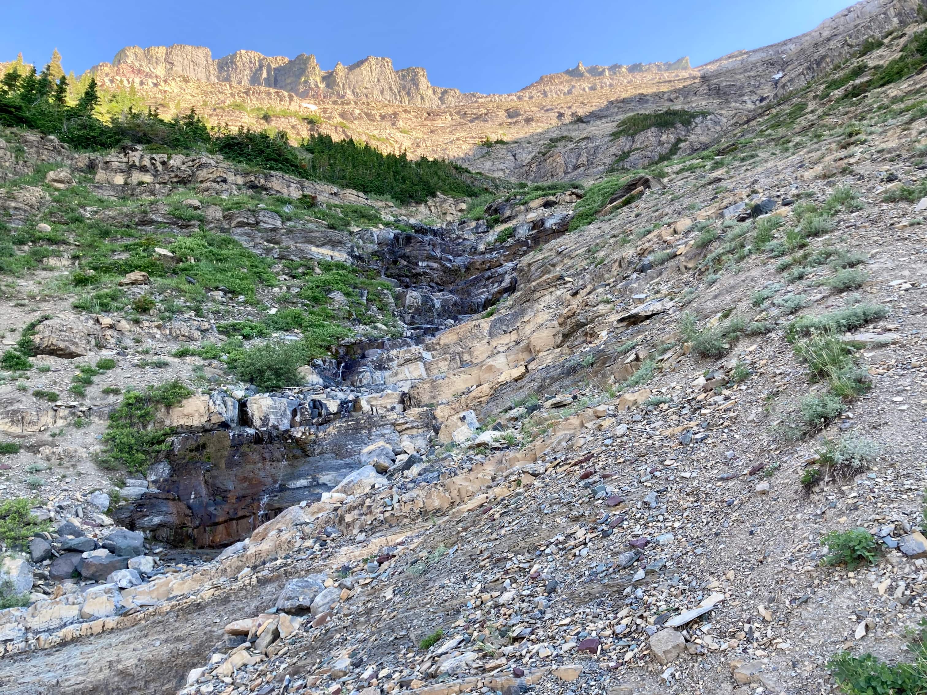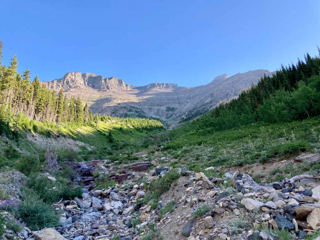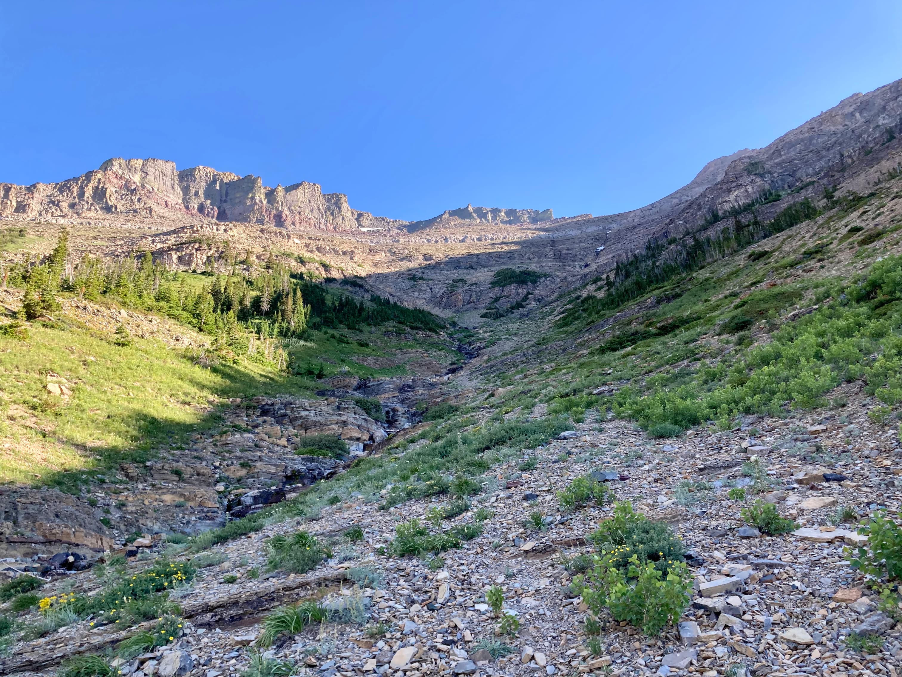 The route begins at Lineham trailhead. The large, clearly signed parking area is about 9 km up the Akamina Parkway from the Waterton townsite. At roughly 3.4 km the trail emerges from the trees and you get a clear view of Lineham Falls in the distance. The clearing is one of the major drainages/avalanche pathways coming down from Blakiston’s south face. The scramble starts here. I ascended along the right side of the drainage, seeing signs of a trail here and there. I knew that I wanted to direct myself to the right side of the huge black summit block far above. As I ascended, the block went out of sight, but I continued ascending along the easiest route visible, eventually bearing a little left and finding myself on decent scrambling terrain, intending to veer right eventually. I carried on like this until I could once again see the black rocks of the summit, and could also see that I was fairly far left of where the usual ascent route was.