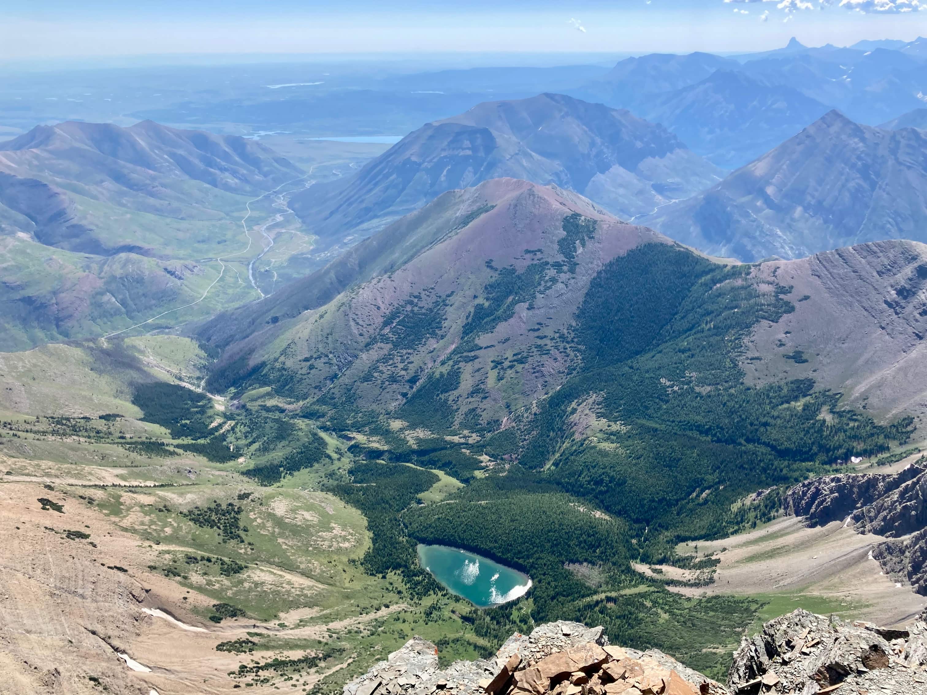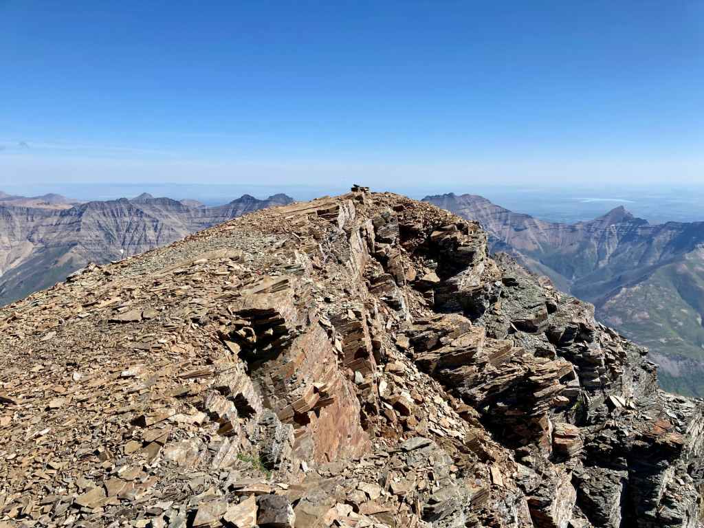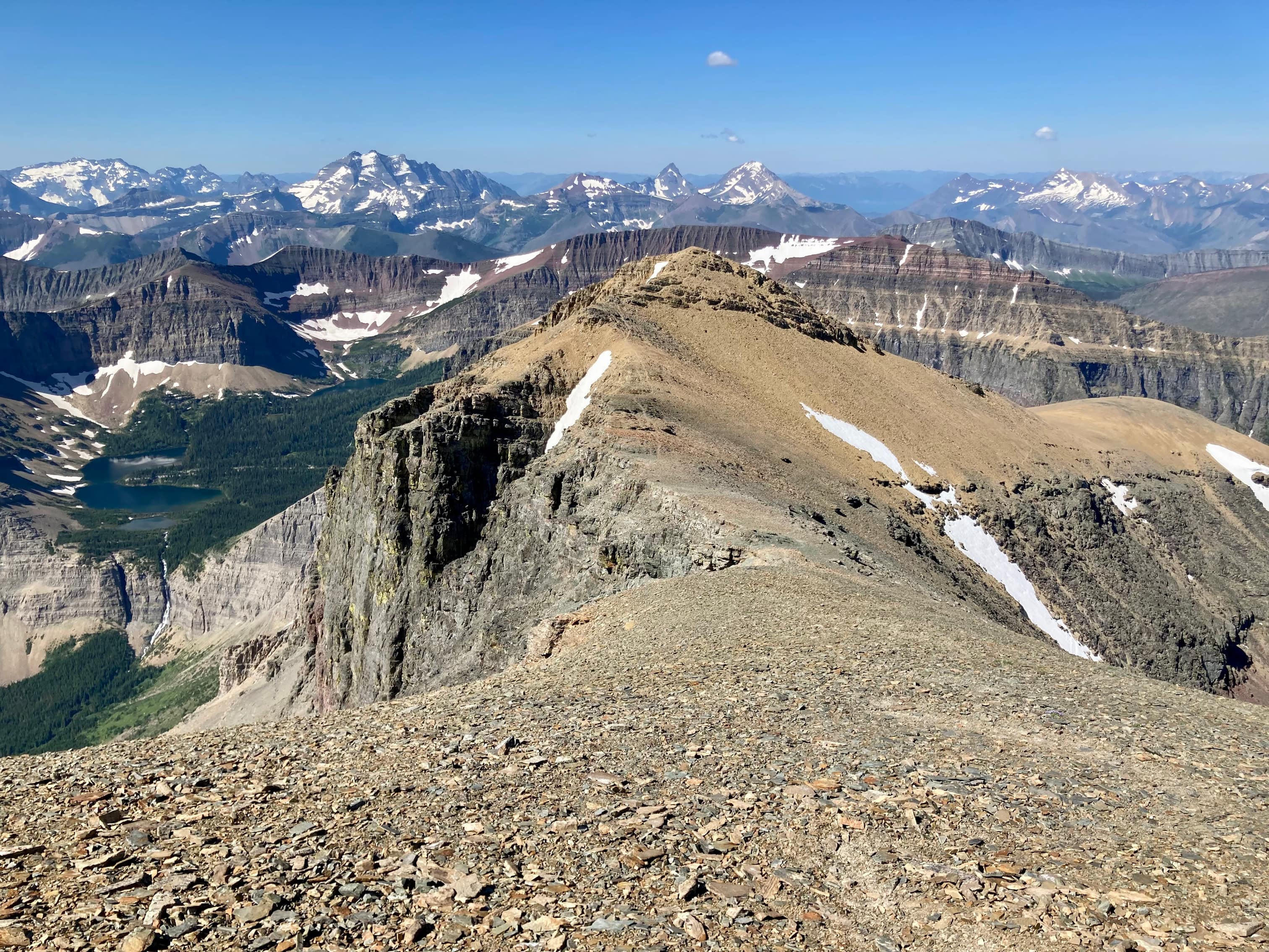 I’ve been waiting to do this trip for a long time but between work, weather, family, and forest fires the time never seemed right. So as July 2022 neared its conclusion, and I had a free day which was forecast to be scorching hot but clear, I knew I had to get this one done. The Hawkins Horseshoe is a full day ridge walk, which starts with a scramble to the summit of Aahkoinimaiisták (Mount Blakiston), which is the highest peak in Waterton. From there the route continues around the “horseshoe” ridge which encloses the sapphire Lineham Lakes on the north, west, and south. Mount Hawkins is tagged along with way, and the ridge walk concludes at the top of Mount Lineham, Waterton’s 2nd highest peak. The beginning of the trip is on the Lineham Falls trail, and the end is on the Rowe Lakes trail. The trip is Waterton’s scrambling tour de force.