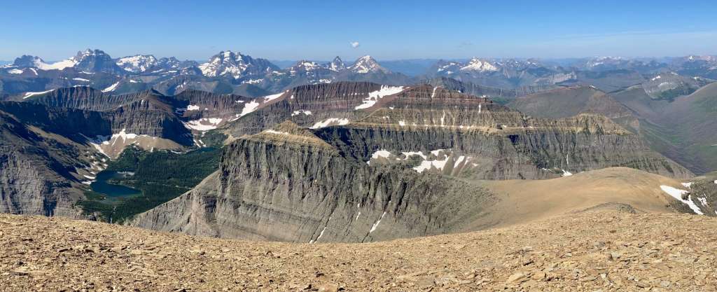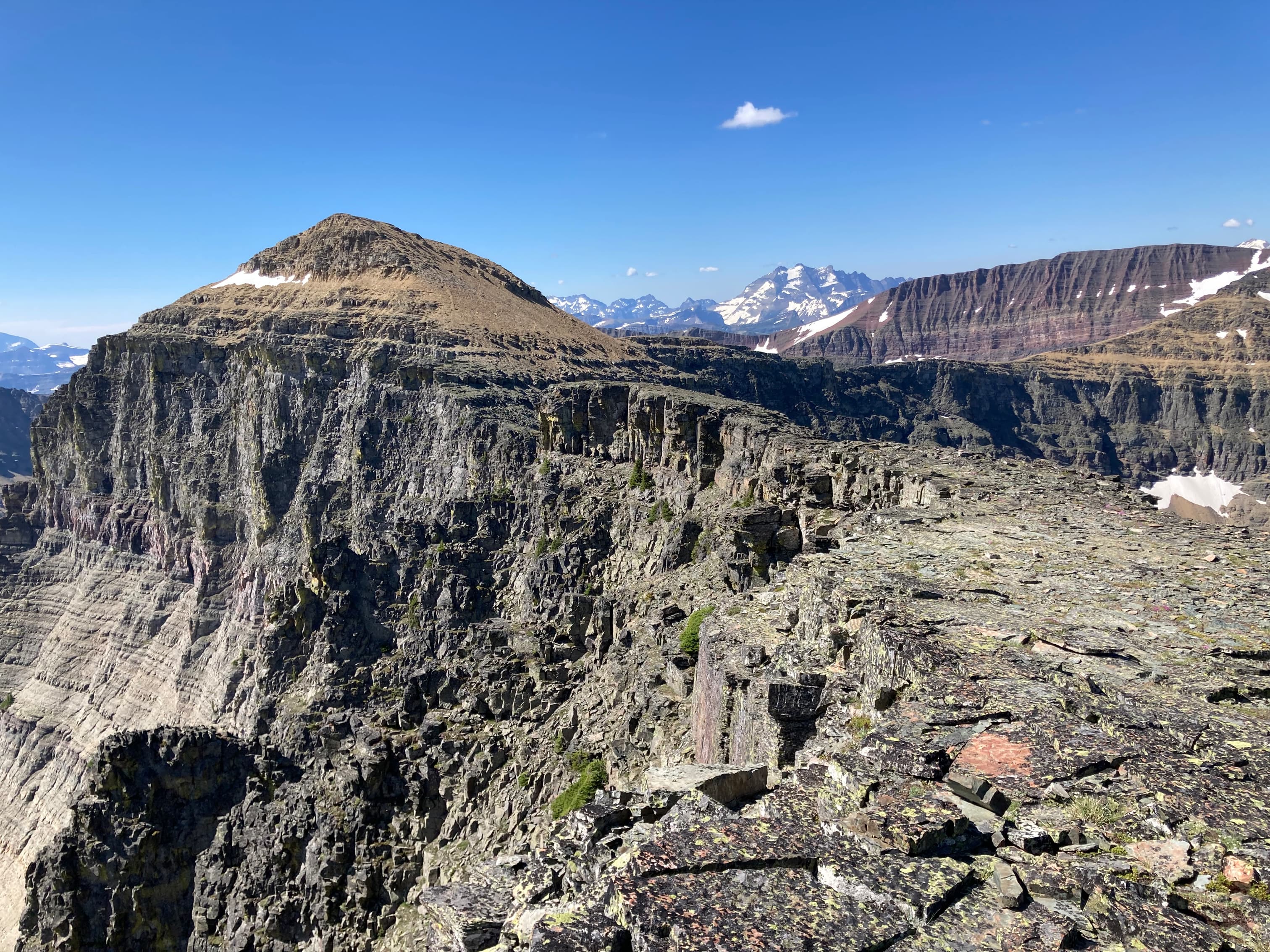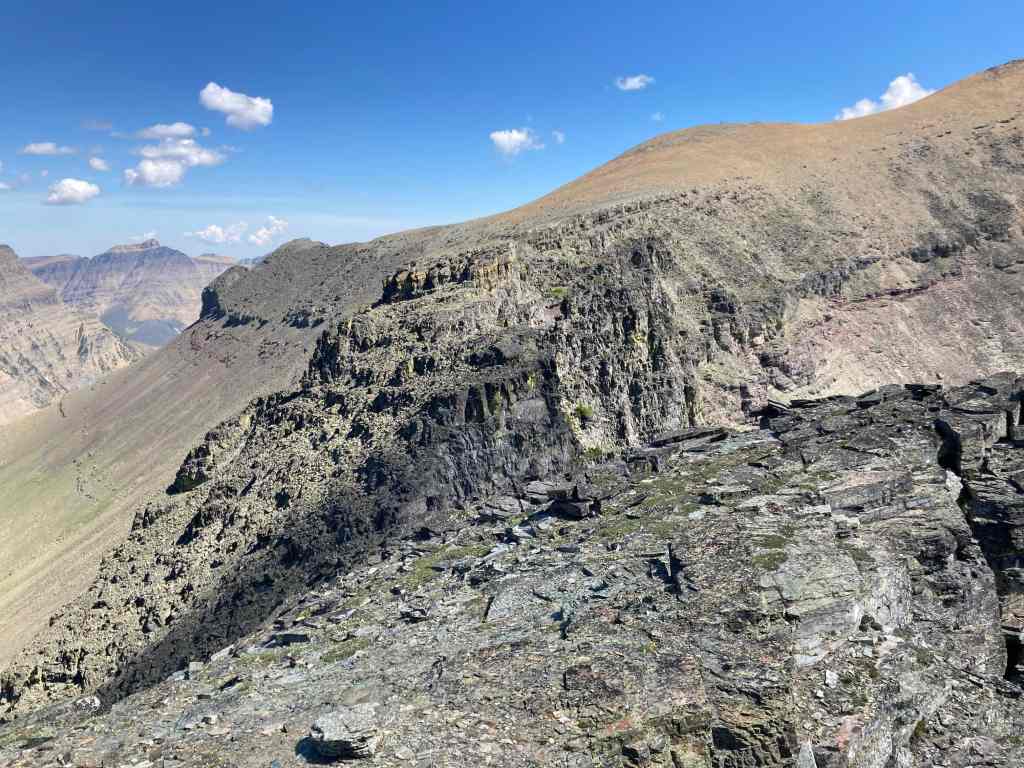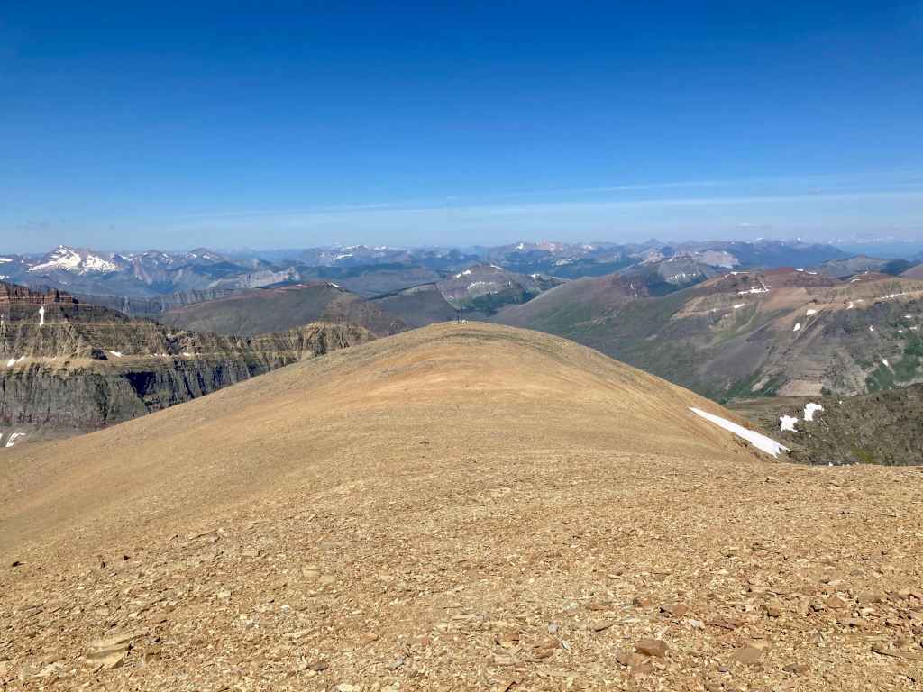 Departing from Aahkoinimaiisták, I proceeded west along the ridge top to a slightly lower adjacent high point before descending further to some sort of sensor or transmitter situated on a broad, gentle part of the ridge. To the southwest was a distinct high point. I think the typical route bypasses it to the right, but I wanted to see the view from the top. It turns out the view down to the Lineham Lakes was worth the small additional climb. The terrain becomes quite broken up before the ridge ascends towards the high point. From afar this didn’t look like a big deal, but up close it was clear that staying on the ridge top wasn’t feasible. I frequently deviated to the right onto passable terrain then returned to the ridge top, only to find that I had to get off the ridge again and go right. Eventually I got past that area and was able to easily walk to the high point and enjoy the view.