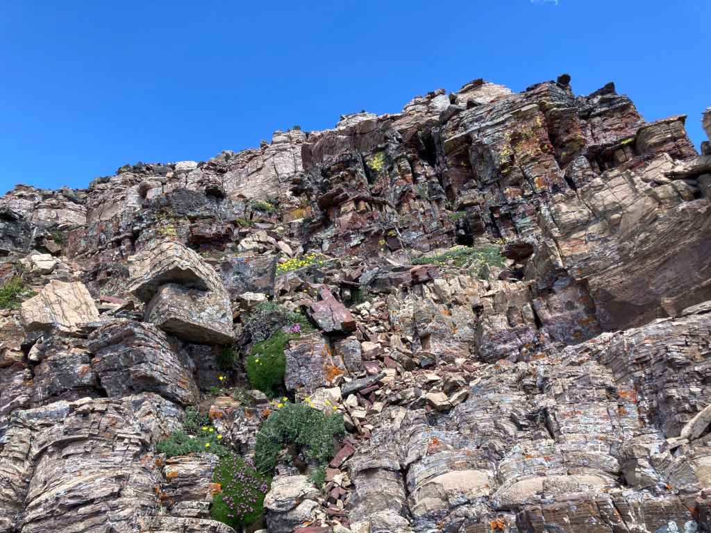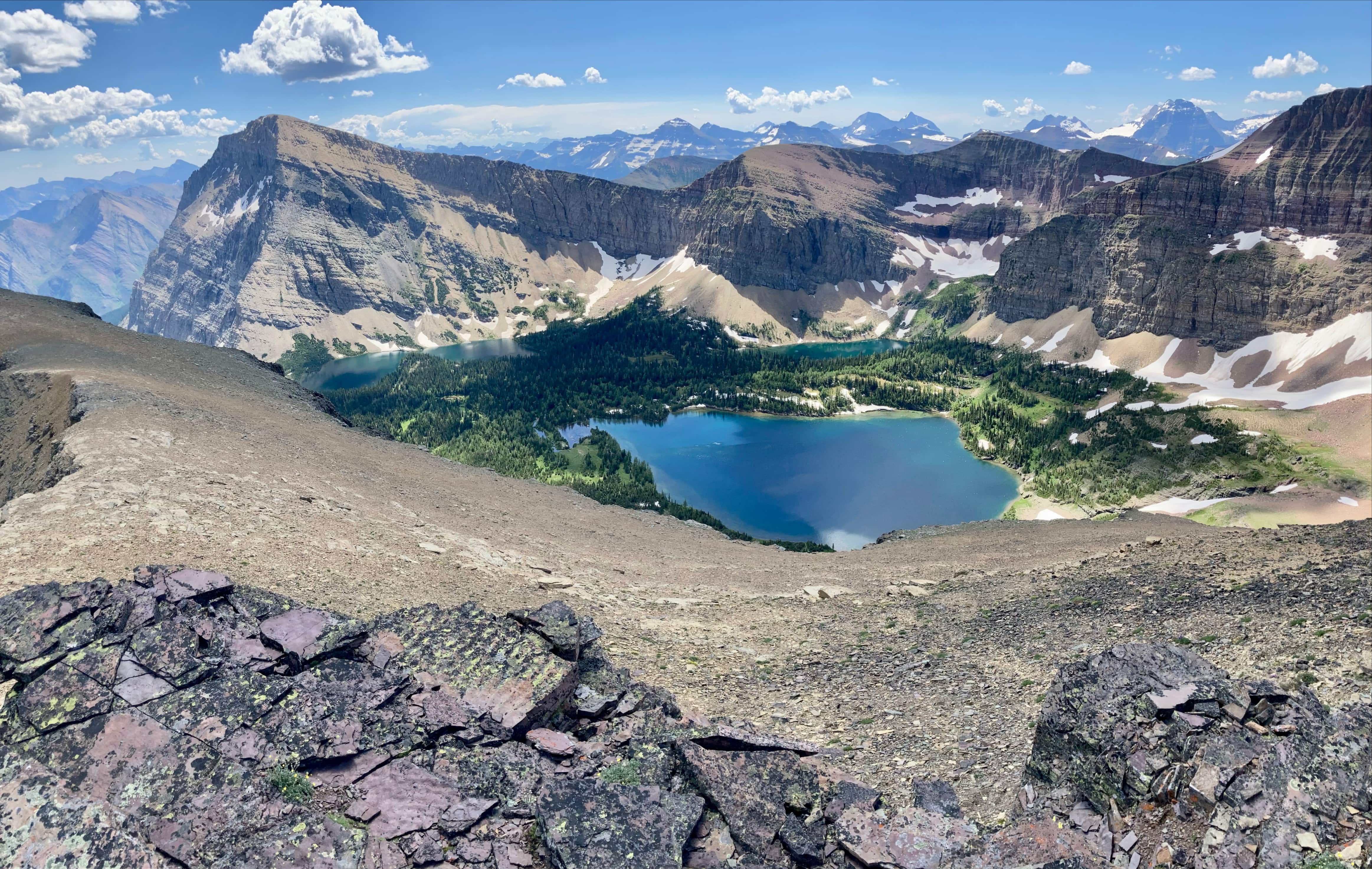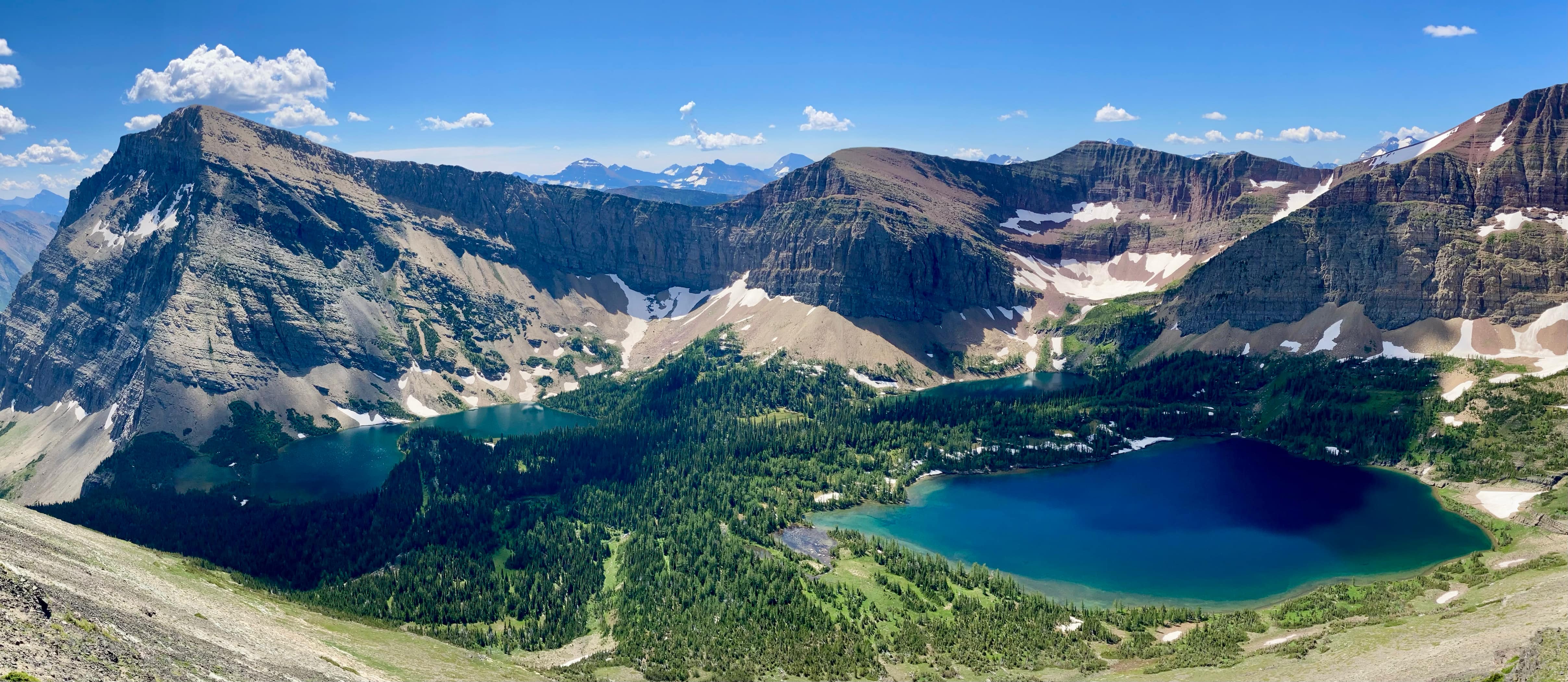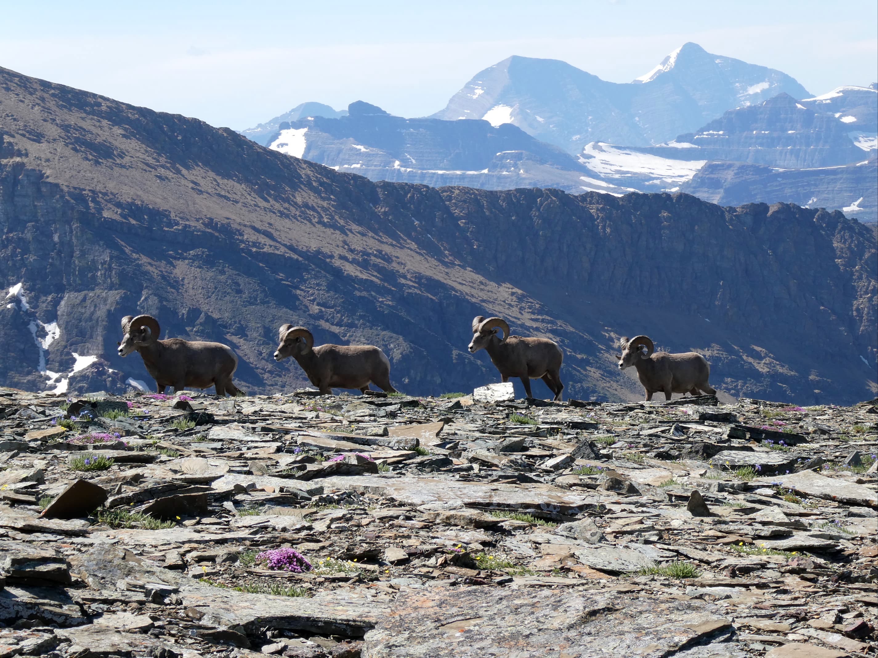 Walking down from Aahkoinimaiisták’s summit. A high point is immediately encountered that’s easy to climb up and over.There was a little busted-down cairn at the top of the high point.Continuing from the high point. There was a gentle descent to a broad, rounded hump where there was an antenna of some kind. Mount Hawkins is the red-topped peak at centre. Between the antenna and Hawkins there was a distinct high point. The usual route bypasses it to the right, but I decided to go up and over. The high point itself posed no difficulties, but I had to deviate off the ridge to the right in the area of the black rock.Heading for the antenna.I have no idea what this is for.Continuing along the ridge. The high point is to the left. Mount Hawkins is to the right. Some sheep were walking by (look closely on the left). Around here I could clearly see that in the area of the black rocks there was a discontinuity of the ridge top.Four rams going for a walk.They were not in a hurry.As I got closer I could see that it wouldn’t be feasible to stick to the ridge top. I went to the right and passed the first big gap. On returning to the ridge top I found I had to deviate again a couple times because of more gaps that I didn’t appreciate from this vantage.Some of the terrain to the right of the ridge top.The very dramatic drop to the left.A look back after passing beyond the black rocks.Climbing up to the high point. There’s also a faint trail which bypasses this entirely to the right.The top of the high point features another mini-cairn.Looking east, back the way I came.Anderson Peak and Lost Mountain to the north.The view to the south and west – this is the reason you shouldn’t bypass high point. This route involves a full day of evolving views down into this little valley. Pictures don’t necessarily convey it well, but in real life this spot was the most captivating.Down on the col between the high point and Mount Hawkins there was a bit of a promontory overlooking the valley. I made my way down to it and found that it provided completely unobstructed views of the lakes.Time to climb Mount Hawkins.Some hands-on scrambling terrain. Easier terrain could be found to climber’s left. The rocks change from yellow to black to red as you ascend.Yellow meets black.It was impossible not to keep stopping to look back at the lakes.Black meets red.Between the rocks, moss, lichen, and flowers you get pretty much the full colour spectrum.Above the scramble, looking at the lakes again.The final walk to the summit.The summit of Mount Hawkins.Panorama looking northwest.Panorama looking southeast.Looking back along the route so far.From the summit of Mount Hawkins it was an easy descent to this col. The Hawkins Horseshoe report will conclude in Part 3 with Mount Lineham.