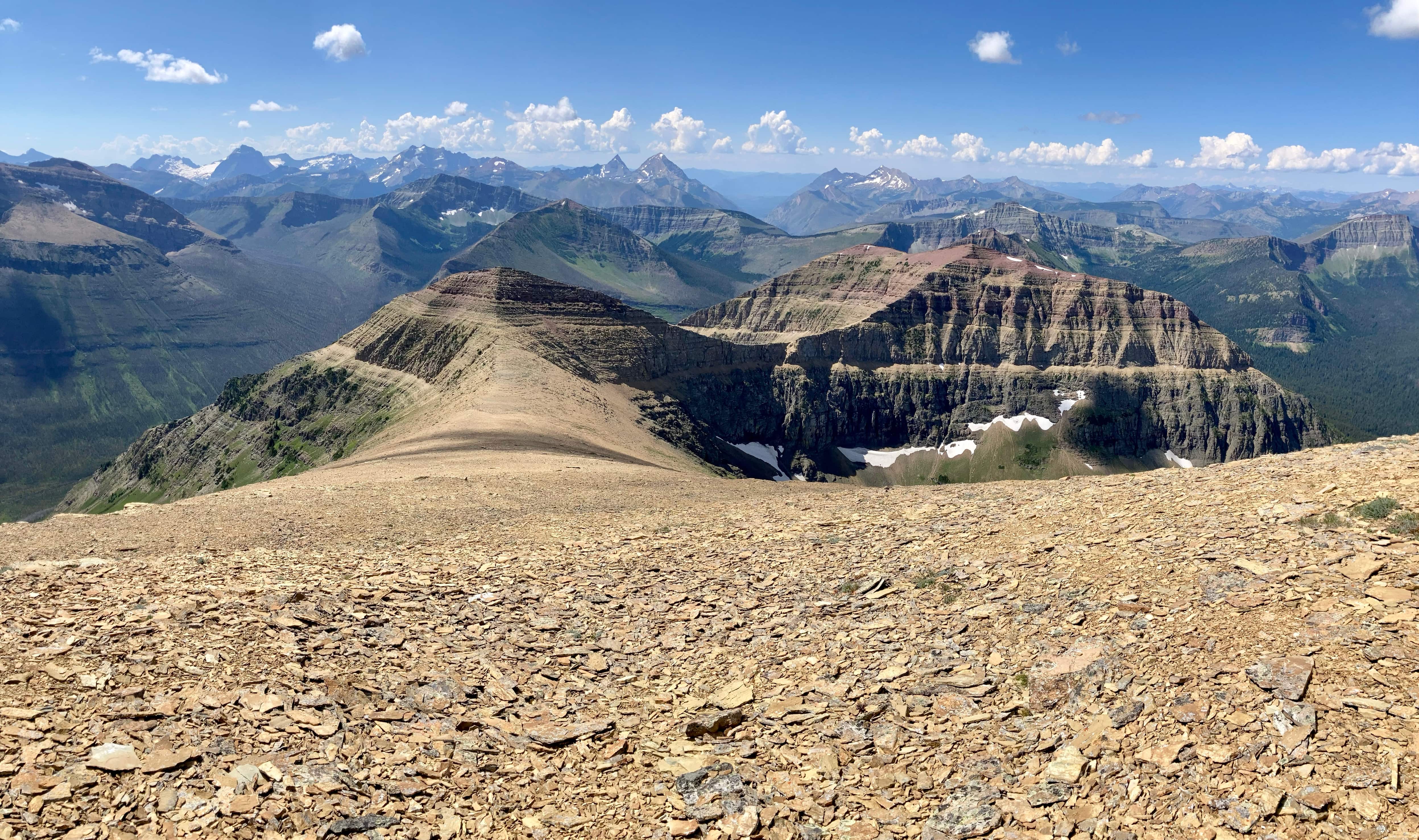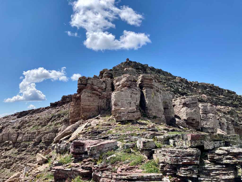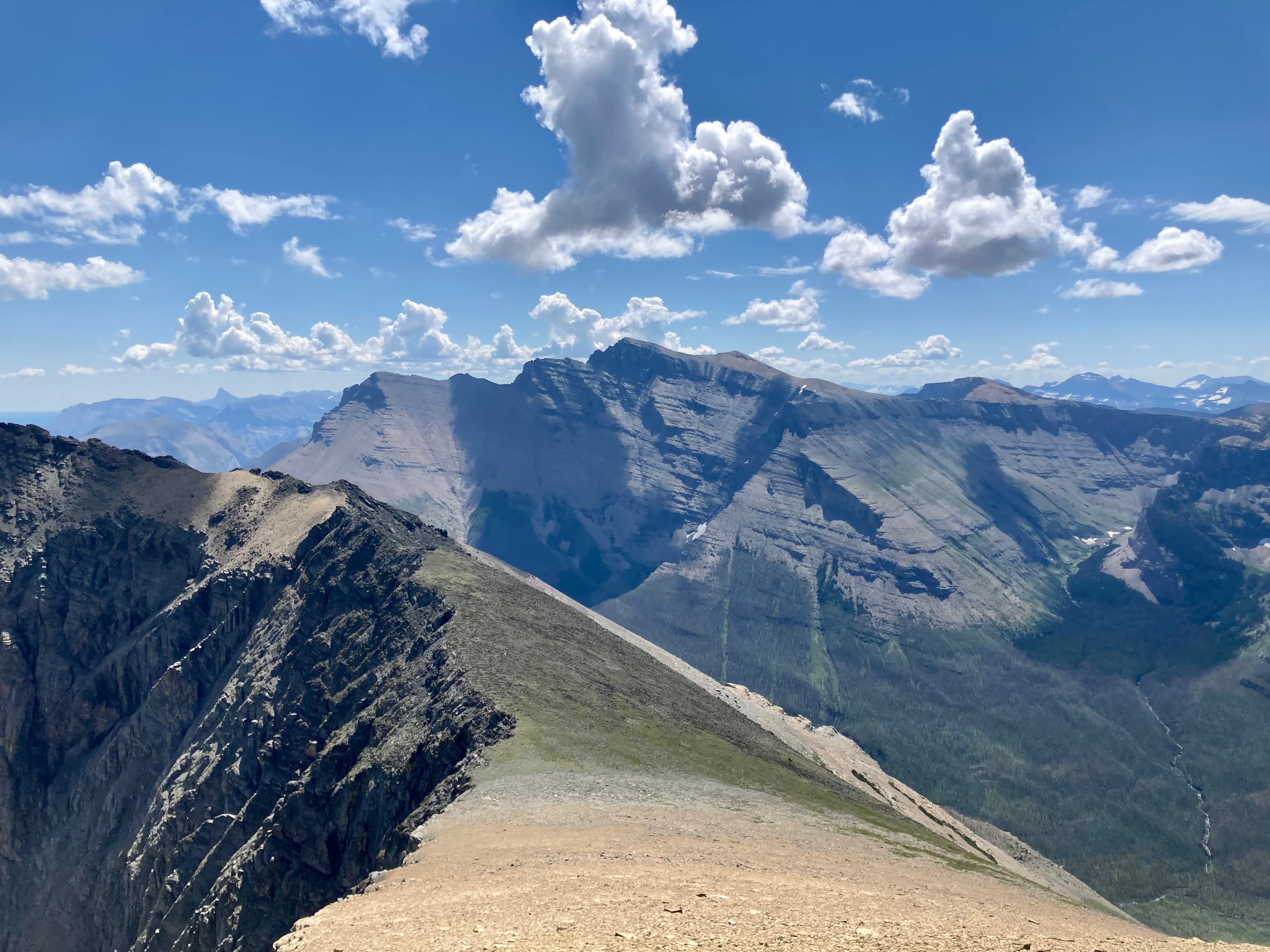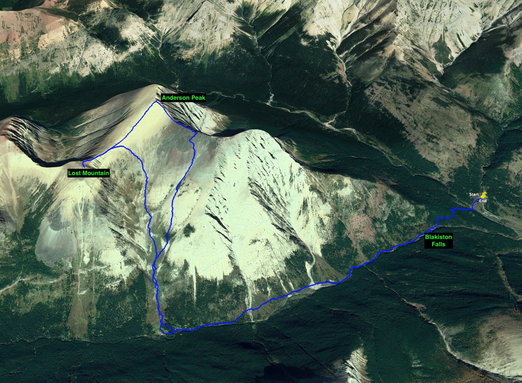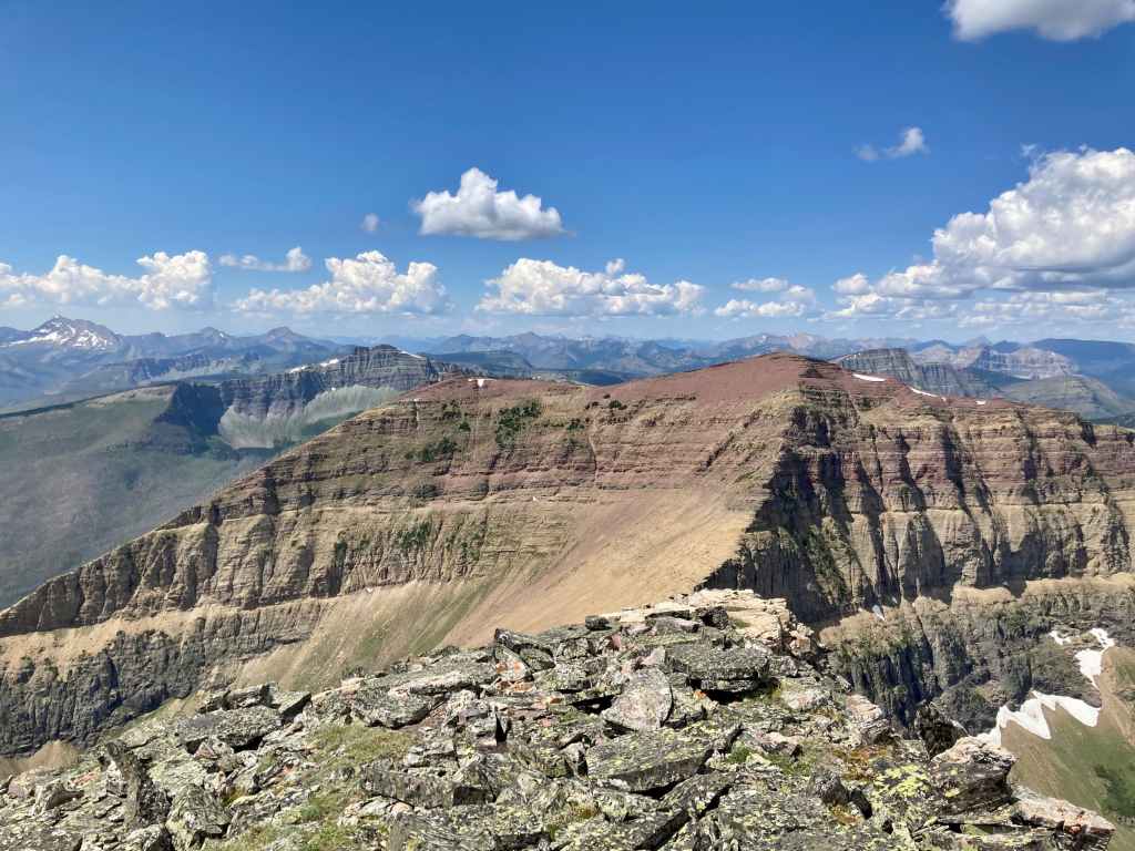 Route overview looking north.Anderson Peak, as seen from the Red Rock Canyon Parking area. The nearest peak is the eastern summit.Following the Blakiston Creek Trail. Just over 1 km along is Blakiston Falls. There are two viewing platforms that extend over the edge of the canyon.Blakiston FallsContinuing past Blakiston Falls.A section of the creek with exposed red argillite.The first drainage coming down from Anderson Peak.Continuing along the trail. Aahkoinimaiisták/Mount Blakiston and Mount Hawkins are on the other side of the valley.The second drainage. This is the start of Nugara’s scrambling route.The third drainage, just under 5 km from the trailhead. Anderson Peak’s summit isn’t visible. It’s beyond the yellow rocks at the centre of the col. Lost Mountain is on the left. I departed from the trail here and picked my way through thinner areas of vegetation to the creek bed, then crossed over. The dried creek bed actually intersected the trail a short distance before this clearing. It would have been fine to just start following it from back there, though following it on my return trip I found it full of debris and shrubs. Travel wasn’t much easier than simply being alongside the creek bed.In the shrubbery to the right of the creek bed. It thinned out up ahead.Despite it being August there was still water cascading down the drainage.Climbing up alongside the cascade. Enjoyable terrain.I came across a boulder with some interesting whorls in its rock.A close look at patterns in the rock of the boulder. Are these stromatolites?Around here I departed from the watercourse and climbed to the right because I saw all the bushes ahead. It turns out I could have carried on following the water without having to deal with any problematic bushwhacking.Away from the drainage now, heading for the exposed rocks up ahead. As I climbed I veered slightly right. If I’d stayed in the depression to the left I would have continued on a straight shot towards the summit.Taking a break and looking back across the valley.Looking over at Lost Mountain.Continuing the ascent. If I’d made directly for those grey rocks I’d be going right for the summit. I ended up staying right.Off the grassy slopes now.Looking to my right. The grade was pretty steep the whole way.I found myself in another drainage and followed it until I reached the black rocks. Then I veered left.By this time I was pretty tired of climbing this slope. I was pretty sure I’d see the top right away.I was wrong. The grade lessened a bit but I wasn’t on top yet.When I finally reached the summit ridge I was greeted by this view of Mount Glendowan.Looking to the left, the summit was finally in sight.Walking over to the final climb to Anderson Peak’s summit. Lost Mountain on the left.Looking back to the black rocks where I’d climbed up.The summit cairn on Anderson Peak.Looking northeast. Mount Glendowan, Cloudy Ridge, Mount Dungarvan, “Rogan Peak”, and Mount Galwey.Looking south. Aahkoinimaiisták/Mount Blakiston and Mount Hawkins are across the valley. Lost Mountain is to the right. Beyond Lost are Lone Mountain and Festubert Mountain. Further beyond are Long Knife Peak, Starvation Peak, and King Edward Mountain.Looking west. At centre is “Kootenay Brown Peak”. The top of Mount Bauerman is visible just beyond KB’s peak. Beyond that is Kishinena Peak. Avion Ridge is to the right. Festubert Mountain and Lone Mountain are to the left.Looking north. Avion Ridge is straight ahead.Another look over to Aahkoinimaiisták/Mount Blakiston. Nínaiistáko/Chief Mountain is in the distance on the left.Down on the col, heading towards Lost Mountain.Ascending from the col. Some scrambling terrain ahead.Here I went left and climbed some straightforward scrambling terrain.Looking right, towards the cliffs below “Kootenay Brown”‘s summit.Here, the terrain on the left was unfriendly and I didn’t immediately see a weakness on the right, so I went right up the middle.The summit cairn on Lost Mountain.Looking back towards Anderson Peak.Looking west towards “Kootenay Brown Peak”. I had read somewhere that they were working on making that an official name. Kishinena Peak is beyond KBP to the left. Lone MountainThe steep drop immediately east of the summit.Back down at the col.A look back at the terrain east of Lost Mountain’s summit. The cairn is just visible.DescendingBack alongside the drainage.Almost down. Steep dirt, grassy rock-strewn slopes, shallow scree, and pebbles on slabs prevented any carefree rapid descent.Down in the valley again. As mentioned above, I tried following the creek bed back to the trail but it was so full of rubble and brush that it was more aggravating than the terrain adjacent to it.Back on the trail.Alongside Blakiston Creek.Walking out.