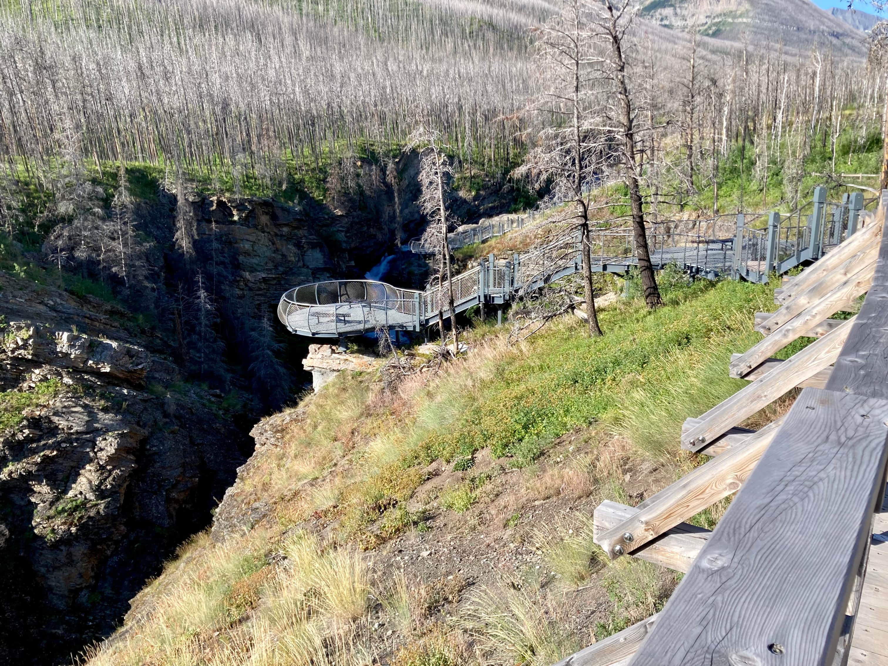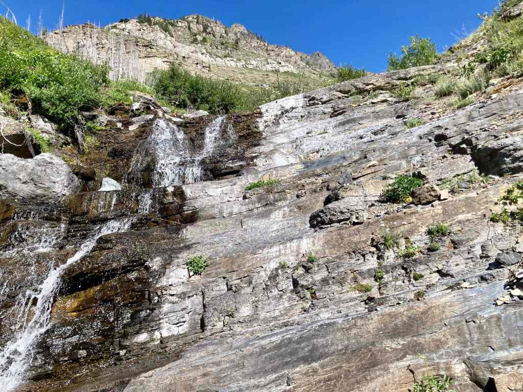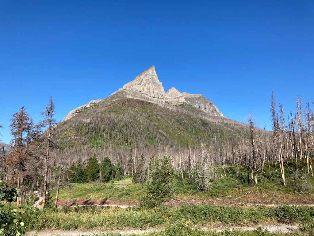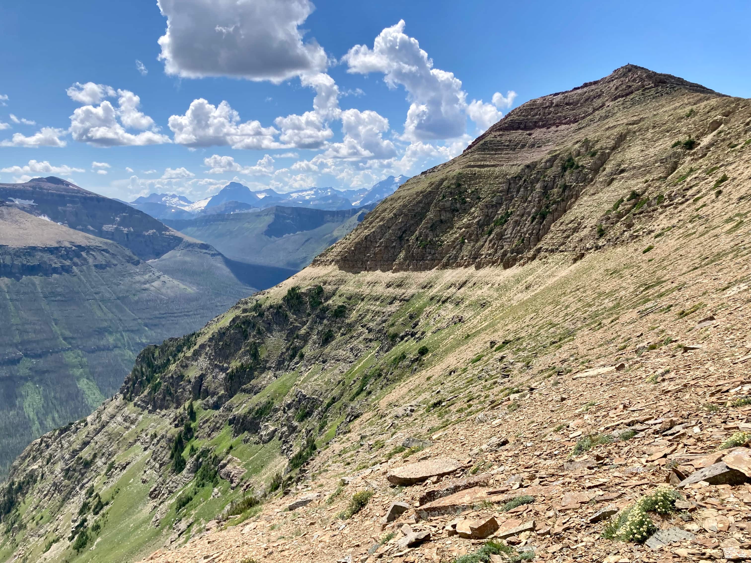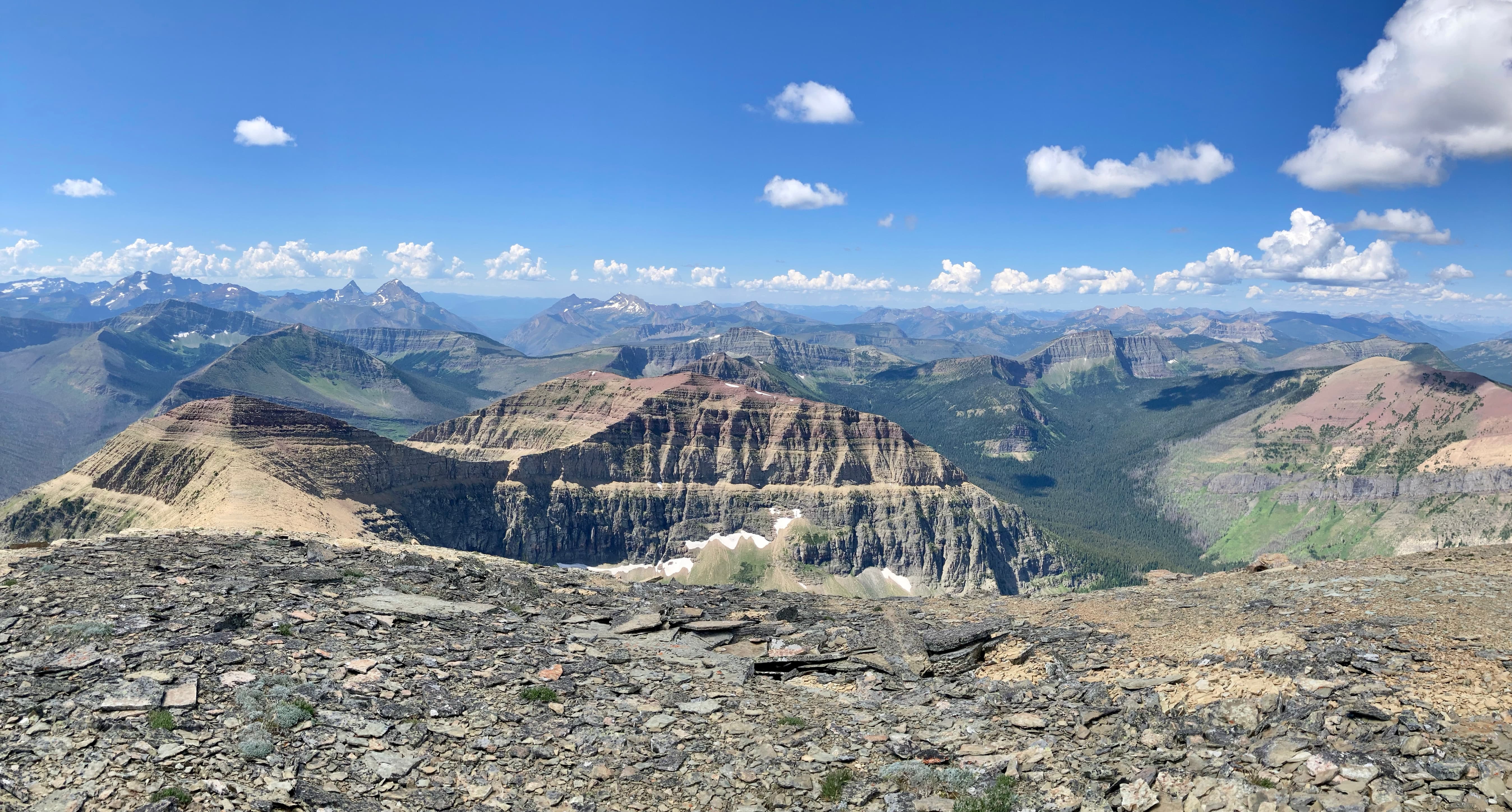 Route overview looking north.Anderson Peak, as seen from the Red Rock Canyon Parking area. The nearest peak is the eastern summit.Following the Blakiston Creek Trail. Just over 1 km along is Blakiston Falls. There are two viewing platforms that extend over the edge of the canyon.Blakiston FallsContinuing past Blakiston Falls.A section of the creek with exposed red argillite.The first drainage coming down from Anderson Peak.Continuing along the trail. Aahkoinimaiisták/Mount Blakiston and Mount Hawkins are on the other side of the valley.The second drainage. This is the start of Nugara’s scrambling route.The third drainage, just under 5 km from the trailhead. Anderson Peak’s summit isn’t visible. It’s beyond the yellow rocks at the centre of the col. Lost Mountain is on the left. I departed from the trail here and picked my way through thinner areas of vegetation to the creek bed, then crossed over. The dried creek bed actually intersected the trail a short distance before this clearing. It would have been fine to just start following it from back there, though following it on my return trip I found it full of debris and shrubs. Travel wasn’t much easier than simply being alongside the creek bed.In the shrubbery to the right of the creek bed. It thinned out up ahead.Despite it being August there was still water cascading down the drainage.Climbing up alongside the cascade. Enjoyable terrain.I came across a boulder with some interesting whorls in its rock.A close look at patterns in the rock of the boulder. Are these stromatolites?Around here I departed from the watercourse and climbed to the right because I saw all the bushes ahead. It turns out I could have carried on following the water without having to deal with any problematic bushwhacking.Away from the drainage now, heading for the exposed rocks up ahead. As I climbed I veered slightly right. If I’d stayed in the depression to the left I would have continued on a straight shot towards the summit.Taking a break and looking back across the valley.Looking over at Lost Mountain.Continuing the ascent. If I’d made directly for those grey rocks I’d be going right for the summit. I ended up staying right.Off the grassy slopes now.Looking to my right. The grade was pretty steep the whole way.I found myself in another drainage and followed it until I reached the black rocks. Then I veered left.By this time I was pretty tired of climbing this slope. I was pretty sure I’d see the top right away.I was wrong. The grade lessened a bit but I wasn’t on top yet.When I finally reached the summit ridge I was greeted by this view of Mount Glendowan.Looking to the left, the summit was finally in sight.Walking over to the final climb to Anderson Peak’s summit. Lost Mountain on the left.Looking back to the black rocks where I’d climbed up.The summit cairn on Anderson Peak.Looking northeast. Mount Glendowan, Cloudy Ridge, Mount Dungarvan, “Rogan Peak”, and Mount Galwey.Looking south. Aahkoinimaiisták/Mount Blakiston and Mount Hawkins are across the valley. Lost Mountain is to the right. Beyond Lost are Lone Mountain and Festubert Mountain. Further beyond are Long Knife Peak, Starvation Peak, and King Edward Mountain.Looking west. At centre is “Kootenay Brown Peak”. The top of Mount Bauerman is visible just beyond KB’s peak. Beyond that is Kishinena Peak. Avion Ridge is to the right. Festubert Mountain and Lone Mountain are to the left.Looking north. Avion Ridge is straight ahead.Another look over to Aahkoinimaiisták/Mount Blakiston. Nínaiistáko/Chief Mountain is in the distance on the left.Down on the col, heading towards Lost Mountain.Ascending from the col. Some scrambling terrain ahead.Here I went left and climbed some straightforward scrambling terrain.Looking right, towards the cliffs below “Kootenay Brown”‘s summit.Here, the terrain on the left was unfriendly and I didn’t immediately see a weakness on the right, so I went right up the middle.The summit cairn on Lost Mountain.Looking back towards Anderson Peak.Looking west towards “Kootenay Brown Peak”. I had read somewhere that they were working on making that an official name. Kishinena Peak is beyond KBP to the left. Lone MountainThe steep drop immediately east of the summit.Back down at the col.A look back at the terrain east of Lost Mountain’s summit. The cairn is just visible.DescendingBack alongside the drainage.Almost down. Steep dirt, grassy rock-strewn slopes, shallow scree, and pebbles on slabs prevented any carefree rapid descent.Down in the valley again. As mentioned above, I tried following the creek bed back to the trail but it was so full of rubble and brush that it was more aggravating than the terrain adjacent to it.Back on the trail.Alongside Blakiston Creek.Walking out.