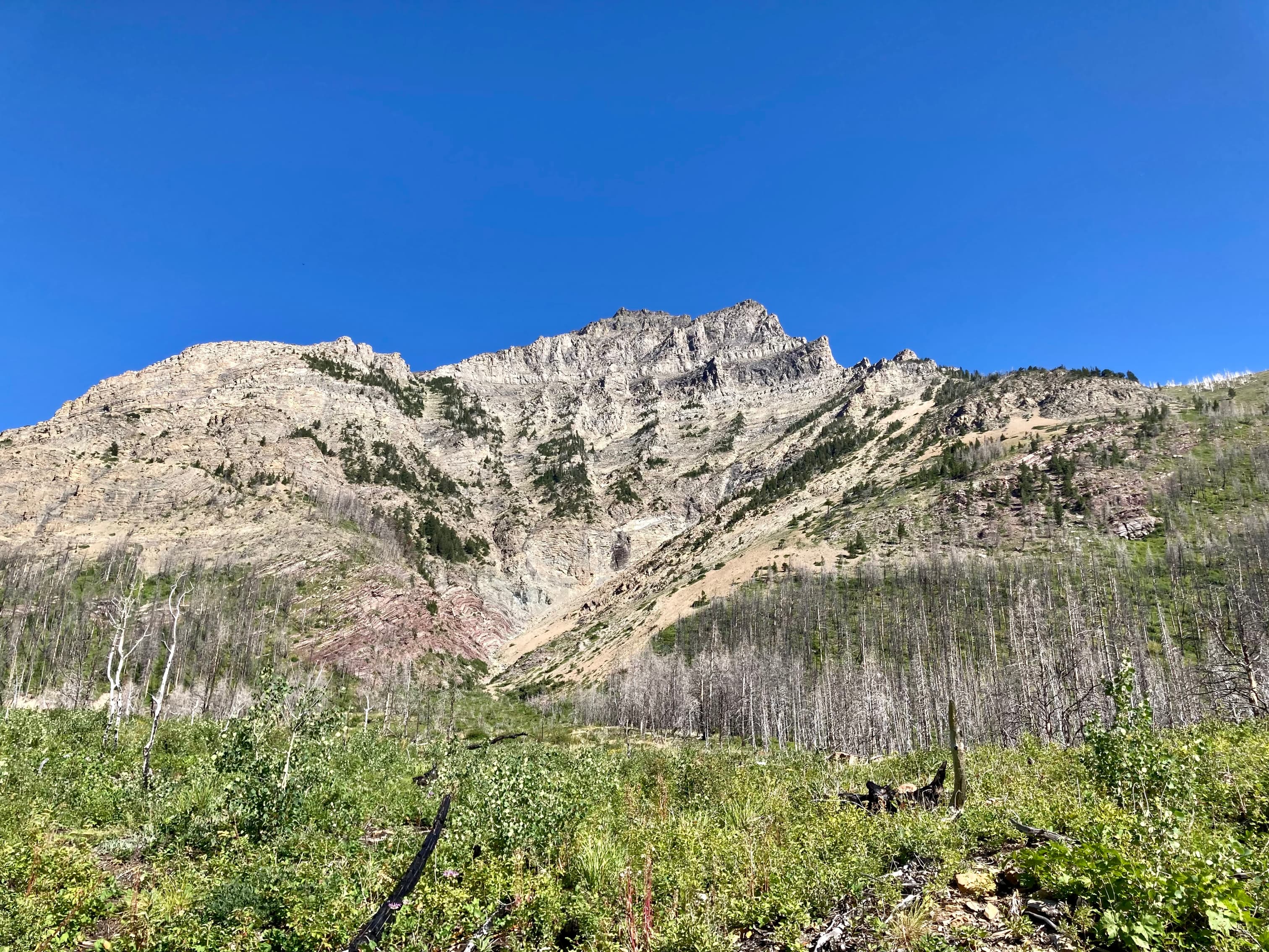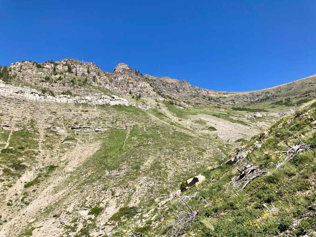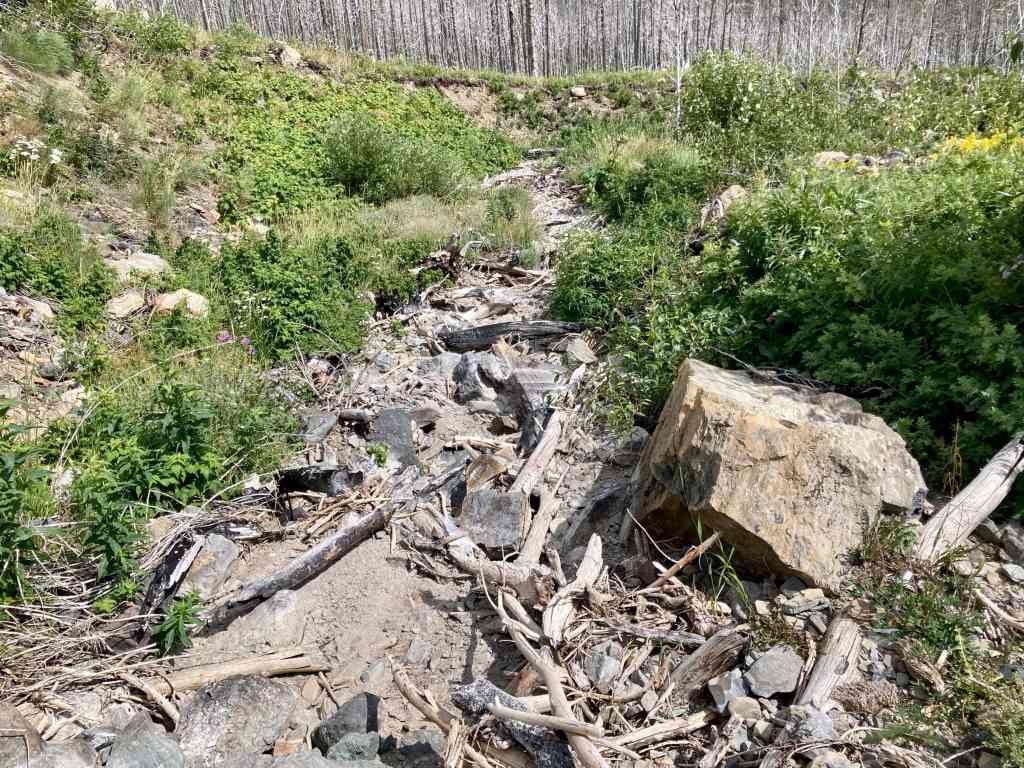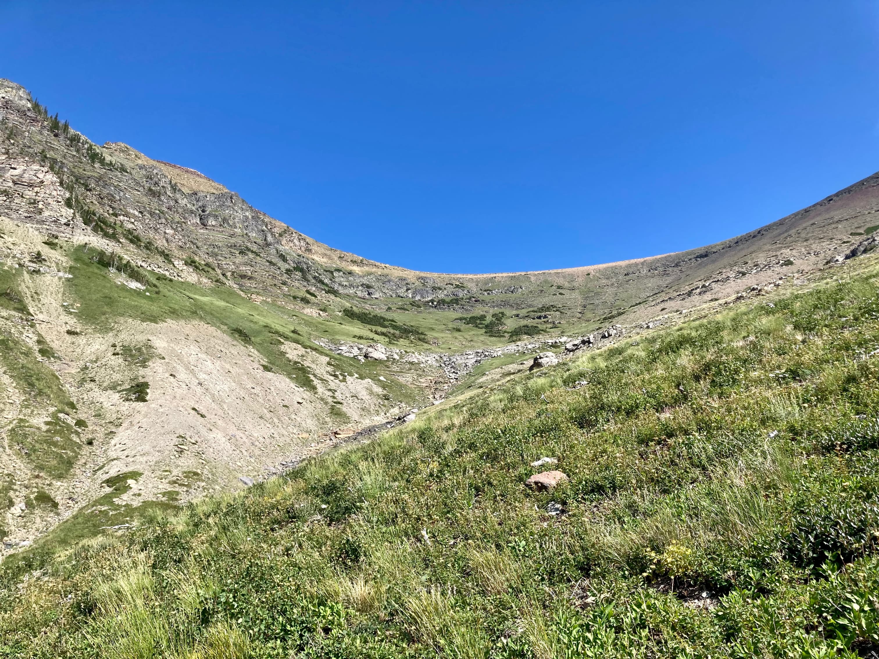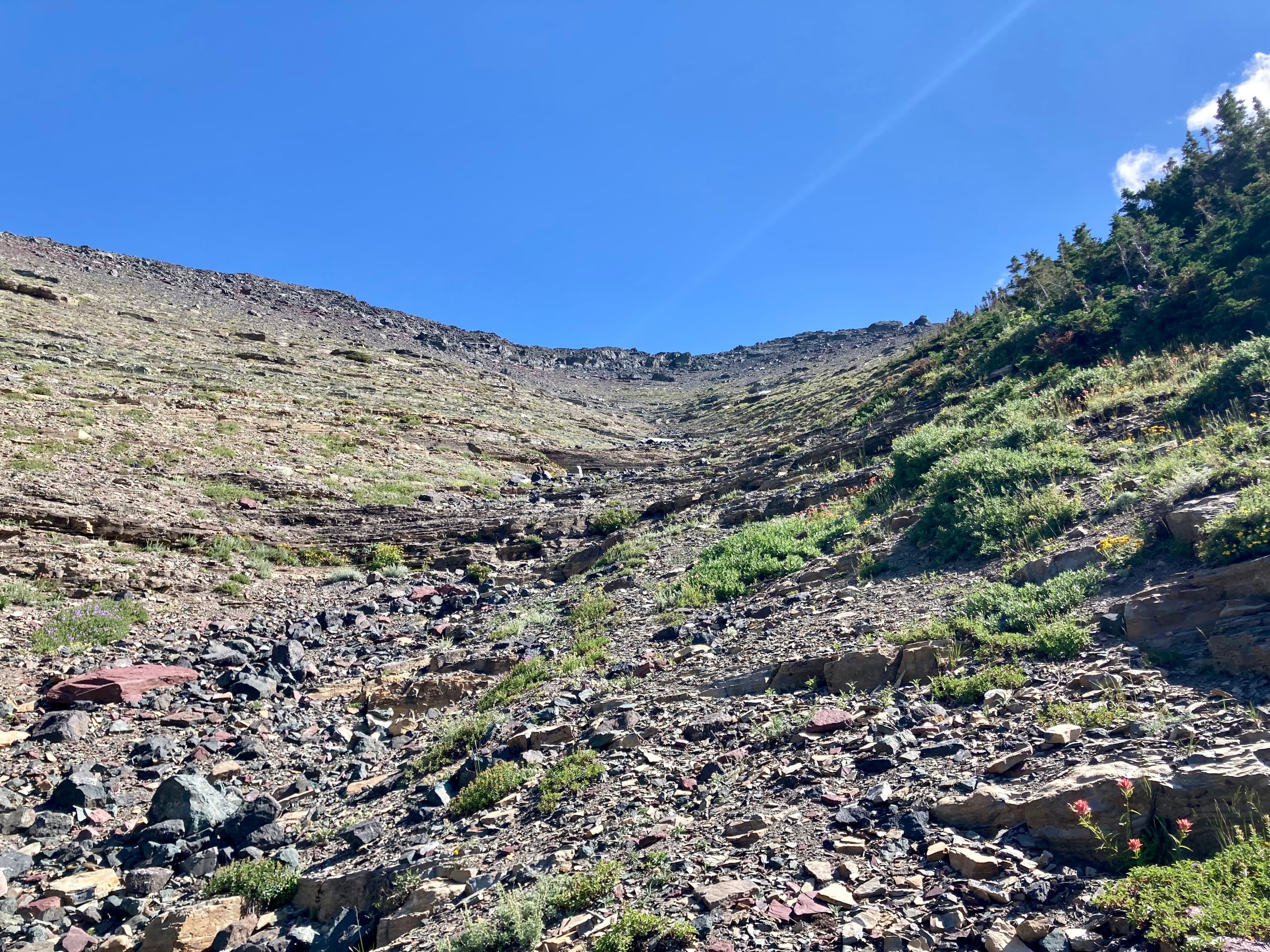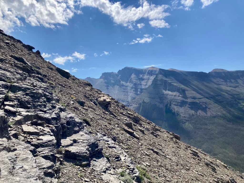 Access is from the Red Rock Parkway in Waterton. After parking at the Red Rock Canyon parking lot I followed the Blakiston Creek Trail west for a little under 5 km to the 3rd major drainage coming down from the slopes to the north. I left the trail there and bushwhacked a bit, following alongside a dried creek bed. I crossed over to the right side and after crashing through low bushes for a time was on clear slopes and ascending. Pretty soon I found myself down on the rocky part of the drainage since there was bare rock there that was easy to ascend. I did this for as long as possible before finally having to climb up alongside the drainage again on the right side.