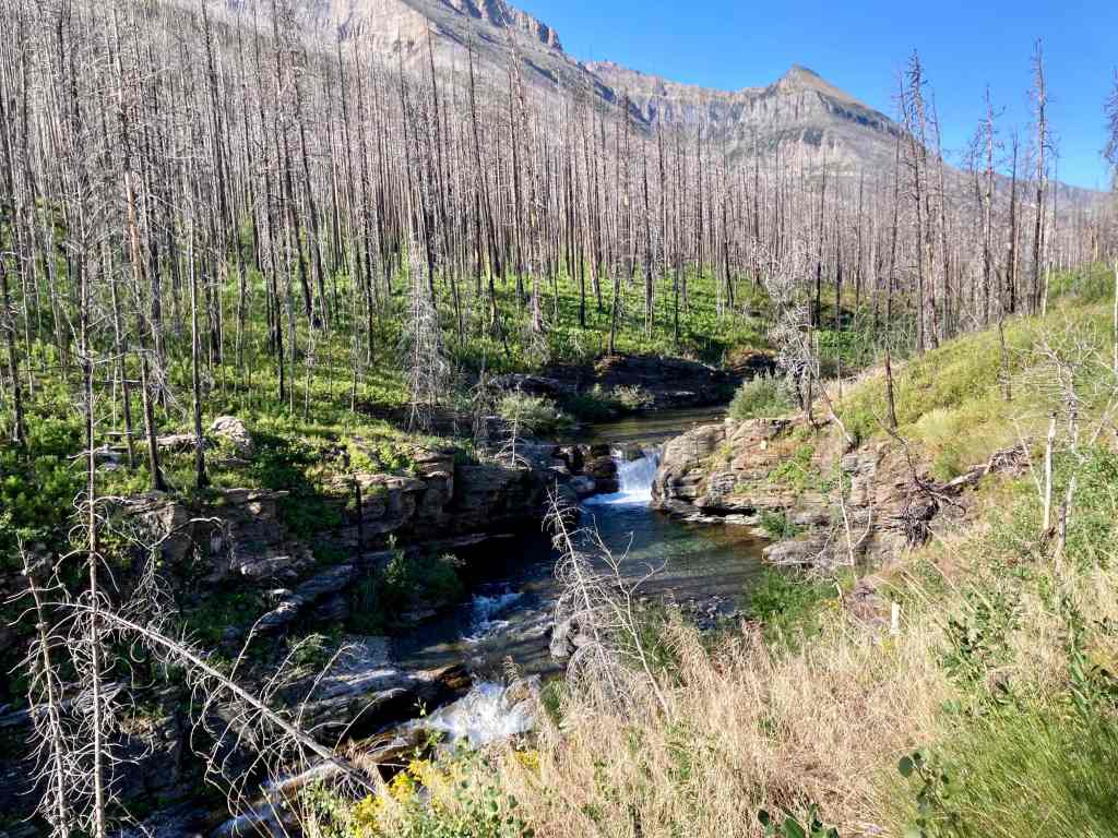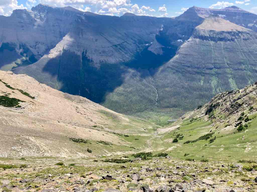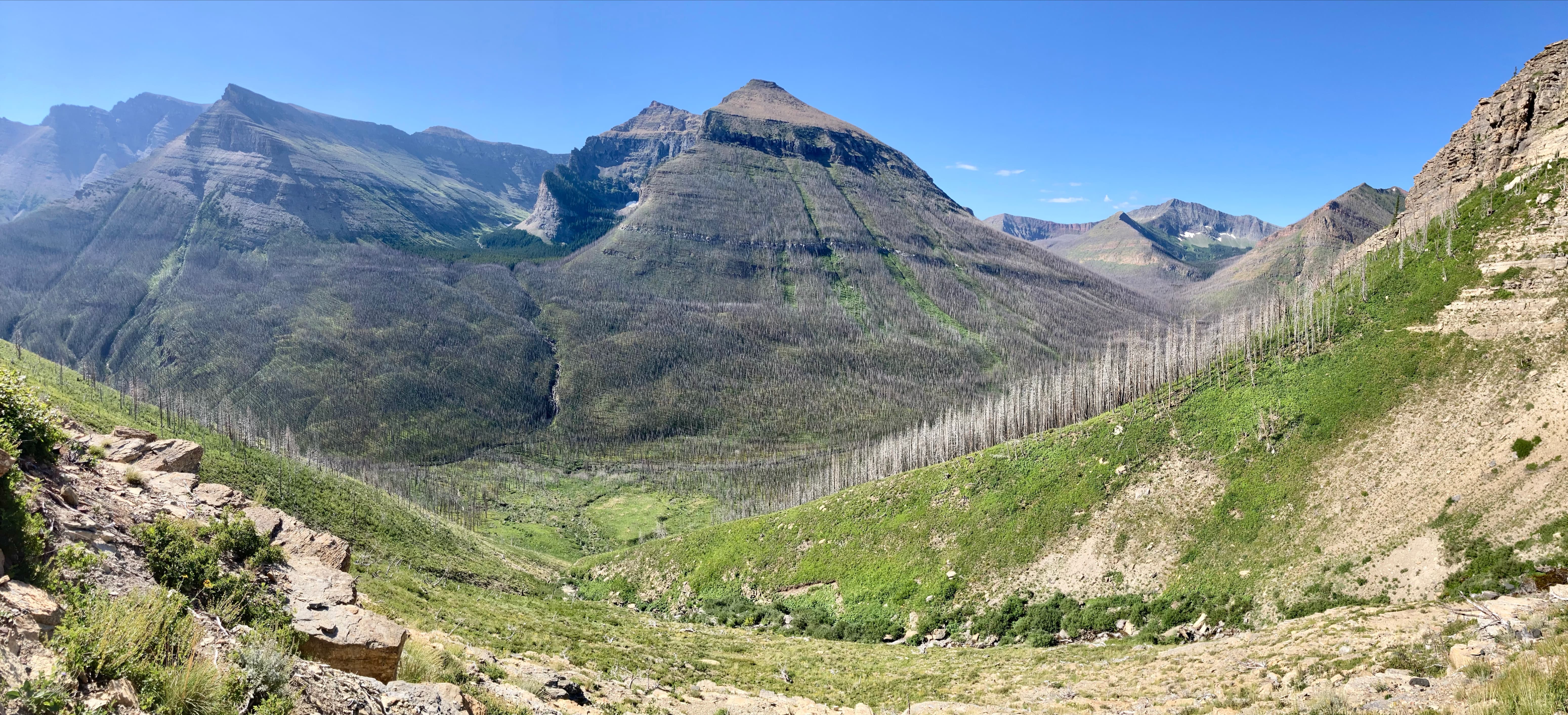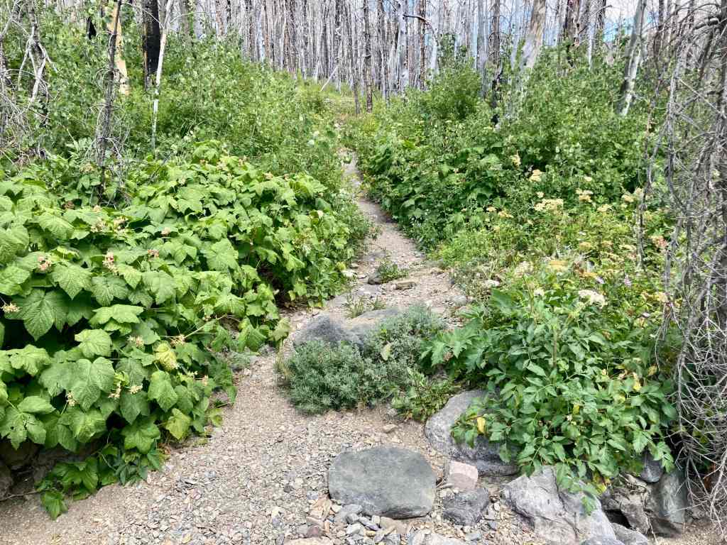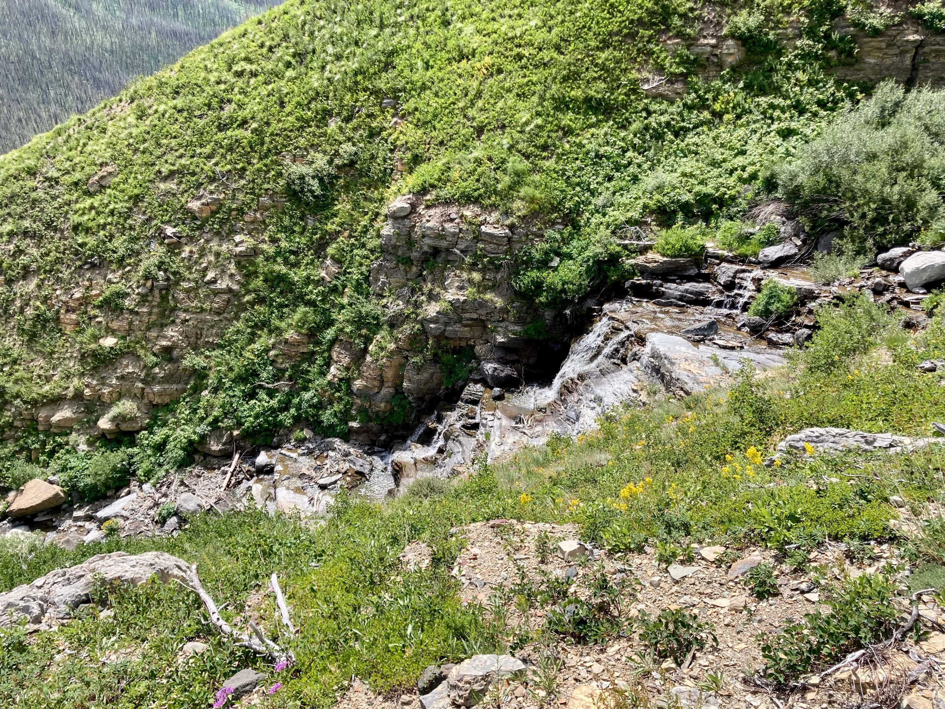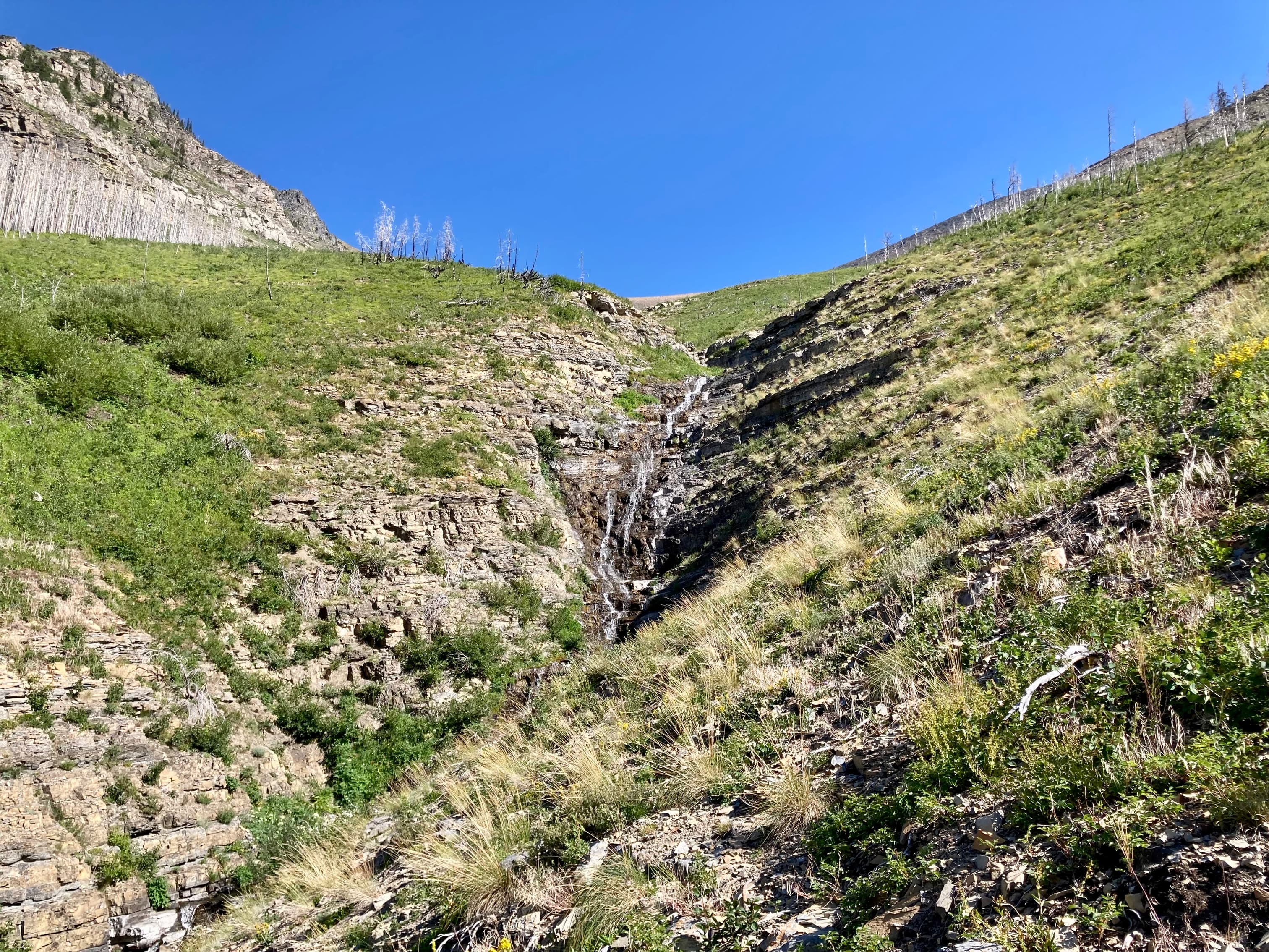 Access is from the Red Rock Parkway in Waterton. After parking at the Red Rock Canyon parking lot I followed the Blakiston Creek Trail west for a little under 5 km to the 3rd major drainage coming down from the slopes to the north. I left the trail there and bushwhacked a bit, following alongside a dried creek bed. I crossed over to the right side and after crashing through low bushes for a time was on clear slopes and ascending. Pretty soon I found myself down on the rocky part of the drainage since there was bare rock there that was easy to ascend. I did this for as long as possible before finally having to climb up alongside the drainage again on the right side.