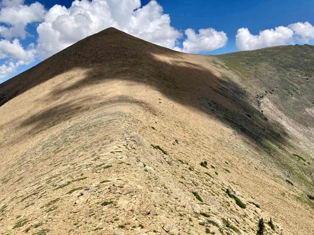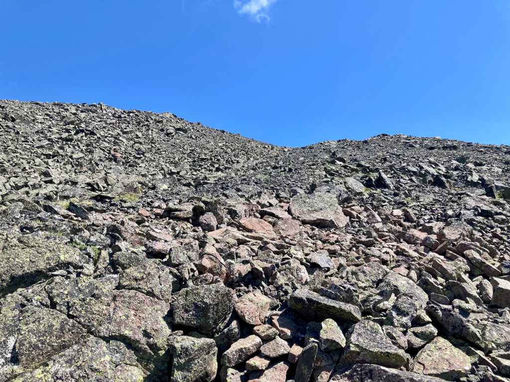 The summit is not visible from the ascent slope. I chose a line and started ascending. The terrain was steeply sloped and generally had poor footing. To try to reduce the slog I found myself in a subsidiary drainage that gently angled me to climber’s right. The usual route doesn’t veer right, but I’m not sure that would have been any easier (or harder). Near the summit ridge I got onto the usual black rubble that is near the tops of most mountains in the area. The slope was steep but the rocks were pretty stable, they just made for tricky footing. After some more arduous climbing I was on top of the ridge and could see the summit a few hundred metres to my left. A slight descent then some steep hiking got me to the summit of Anderson Peak. It took 3 hours 47 minutes to this point.