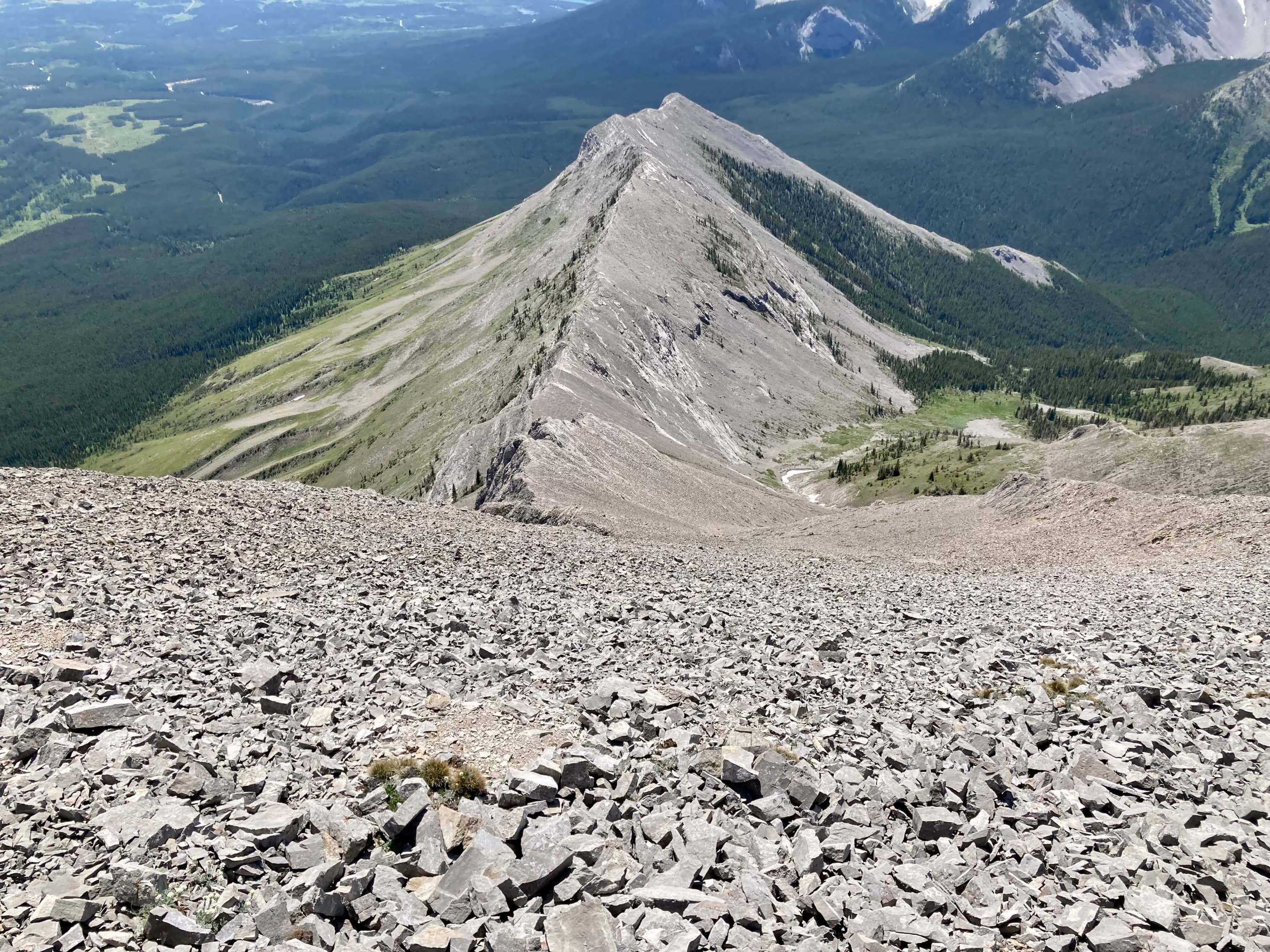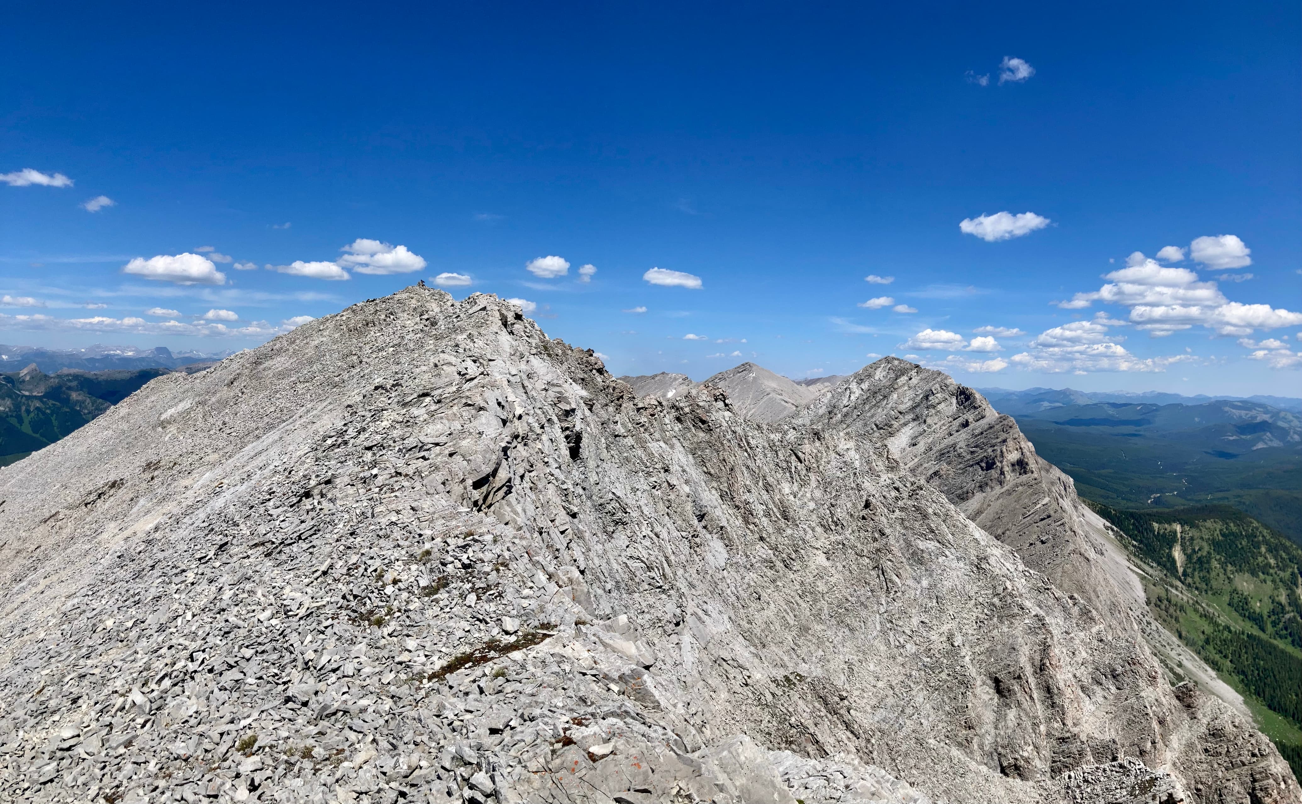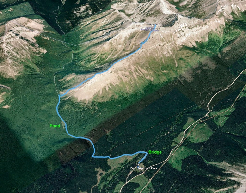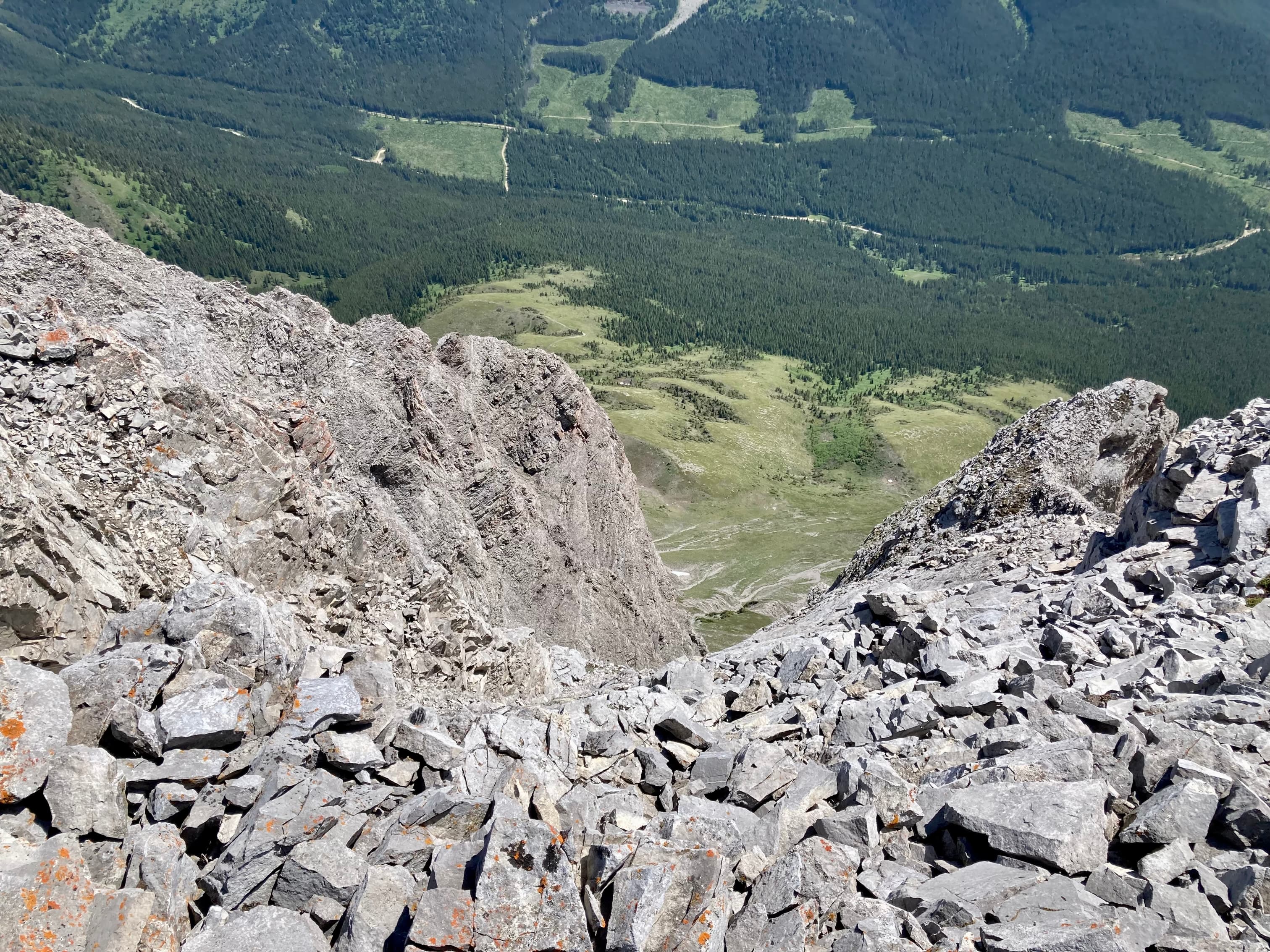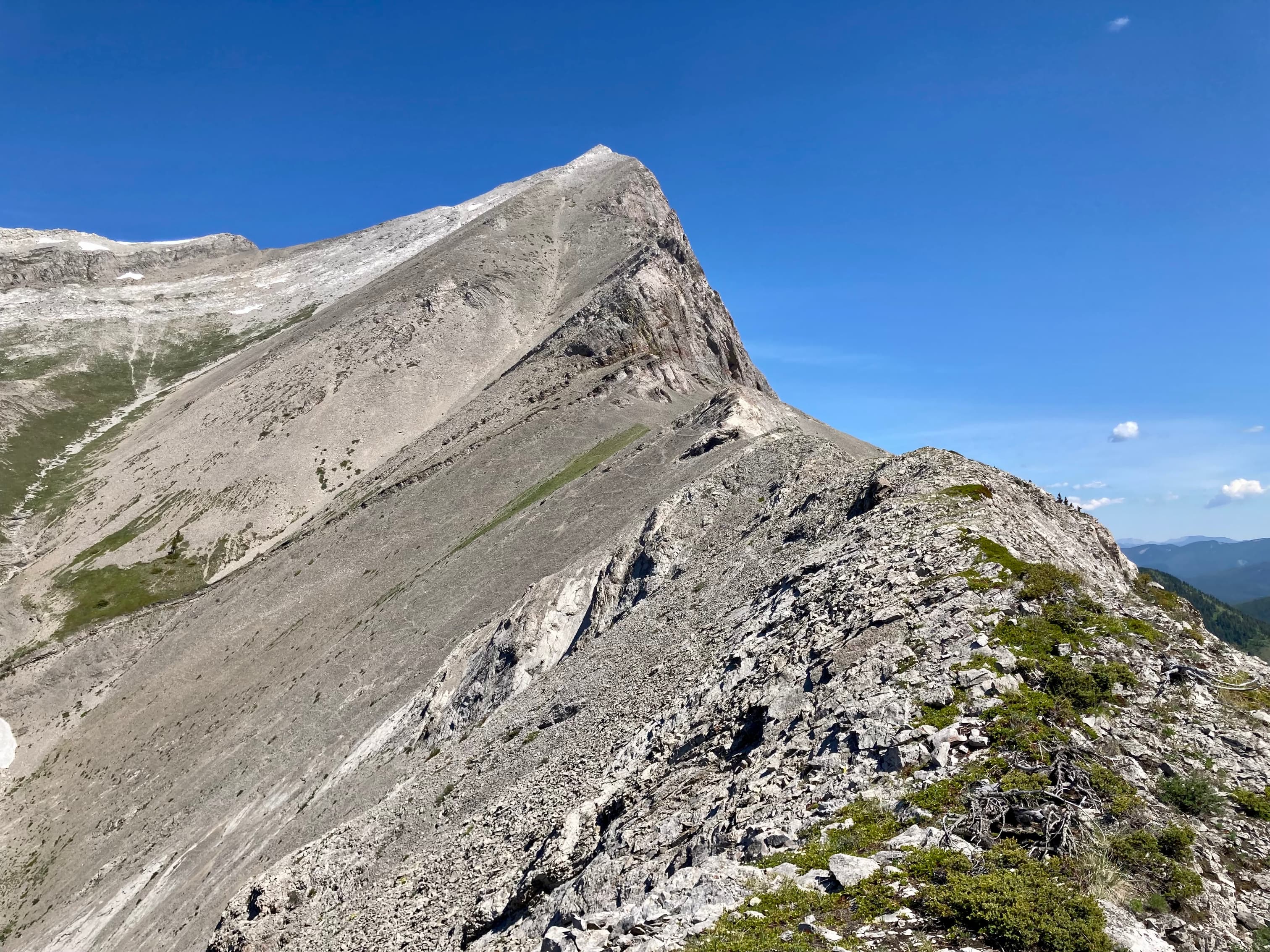 Route overview. The approach is fairly long, but it’s easy hiking.You can see how there are two avalanche pathways. The first one you come to (waking in from the right of this picture) is partly blocked off from the 2nd one by trees that stretch half way up the slope. McMurray went up the first one. Nugara’s book and Nakagama’s trip report show pictures of the 2nd one. I went up and down the 2nd one.The area of the mountain just below the summit. You can see where I moved off the main ascent ridge to the left, to ascend another ridge which was well away from the sheer cliffs.Checking out the objective from the parking area.Following the ATV trail north, I very quickly came to this fork. I went left over the bridge.The next fork – I went left again.The third fork. Left again.The trail descends a bit and the mountain comes into view briefly. A short distance beyond here another, slightly narrower ATV trail cuts across this one and goes steeply uphill. Continue straight ahead.The trail passes a pond before reaching the avalanche pathway. Moose tracks are visible in the area, including in the mud at the bottom of the pond. I was lucky enough to see more than the tracks.She noticed me, but didn’t seem too bothered.She eventually waded to the edge of the pond then wandered into the woods above the trail.The first avalanche pathway. I wanted to have more direct access to the ridge, so I walked another 30 meters to the next one.The second avalanche pathway. I decided to ascend here so I could more directly head to the ridge on the left. The terrain here was steep, crumbly, and covered in shrubs and small trees.Out of the avalanche pathway and onto the broad ridge.On the ascent, it was easiest to stick to the grippy slabs wherever possible. To the climber’s left there’s more scree and debris. Sometimes, a slab was lurking just below the scree which made the descent tricky in places.Looking to my right on the ascent.Looking back down.Continuing upwards. More slabs and rubble.As I got near to the ridge top, Crowsnest Mountain suddenly came into view.Finally at the ridge top. The long ridge walk and the summit are in view. There was a concrete marker here, which I assume was for surveying purposes once upon a time.Looking south from the concrete marker. Mount Tecumseh, Phillips Peak and an unnamed peak are across the valley.Setting off on the ridge walk. Conditions were very calm, and this was a very enjoyable walk.One of two cairns that I found along the ridge. This one was on a high point. The other didn’t seem to mark anything in particular.Looking south again.Continuing along the ridge.The grassy col eventually came into view at the base of the rock bands. I started to ponder how I was going to climb this thing.I took this shot at the end of the day, so the light is a little different. The route is approximate, but the main points are: There are decent scrambling paths through the rock bands. Difficulties can be avoided by going left, but it’s a good idea to go right again to stay close to the ridge. There’ an obvious place where the ridge crumbles away to a sheer drop and you can see steep rubble slopes above that lead directly to cliffs. At this point, looking left, there’s another ridge rising out of the scree across a shallow gully/scree field. It’s a good idea to head left and follow that ridge to the top. On descent, remember you’ll die if you slip and slide above the cliffs, so angle away.Looking at the start of the rock bands from the grassy col.Scrambling up the rock bands.Looking back.More scrambling up rock bands.Crowsnest Mountain through a gap in the ridge.Some more decent scrambling terrain.Above the main rock bands the summit comes back into view. It was pretty easy to stick near to the ridge here.Taking a peek at the sheer drop to the right.Some nice rock scenery.Here’s where the main ascent ridge changes character. Loose rubble and scree above this point seemed to lead directly to the cliffs – no more raised solid rock between scree and open air. I headed left towards a another ridge across the scree field.Cutting left across the scree towards another ridge.The summit finally came into view.Looking back down. You can see where the main ascent ridge (centre) is interrupted by a large crack.At the right of this frame is the ridge I used for the last part of the ascent.The final walk to the summit. A black bird (I don’t know if it was a crow or raven) was sitting on the cairn.He seemed to be enjoying his solitude before I came along. The summit of Deadman Peak. There was a register in a small Nalgene bottle in the cairn. Nobody else had recorded an ascent so far in 2023.Immediately adjacent to the cairn is this drop all the way to the valley floor. So don’t get too caught up in your picture taking and forget to look where you’re stepping.Panorama to the south.Panorama to the west.Panorama to the north.Panorama to the east.Telephoto view looking west at the Fernie area.The air quality didn’t lend itself well to such a distant shot, but I could see Mount Fisher far to the west.Time to descend. Making sure to stay right.Almost back to the grassy col.Taking a little break at the col.A C-130 passed over the area as I walked back along the ridge.There was a search-and-rescue training exercise in the area.Airplanes and mountains are my two favourite things, so this was pretty great.One more shot of Crowsnest Mountain and Seven Sisters.Descending back to the level of the avalanche pathway. On descent I stayed right and tried to steer away from rubble covered slabs. It wasn’t always possible.Back at the avalanche pathway. Descending this was actually really tricky. I fell pretty hard but didn’t do any major damage.I managed to survive the rest of the walk back to my car. Looking over my shoulder while I was packing my gear away, I had this great view of Crowsnest Mountain and a picturesque sky.