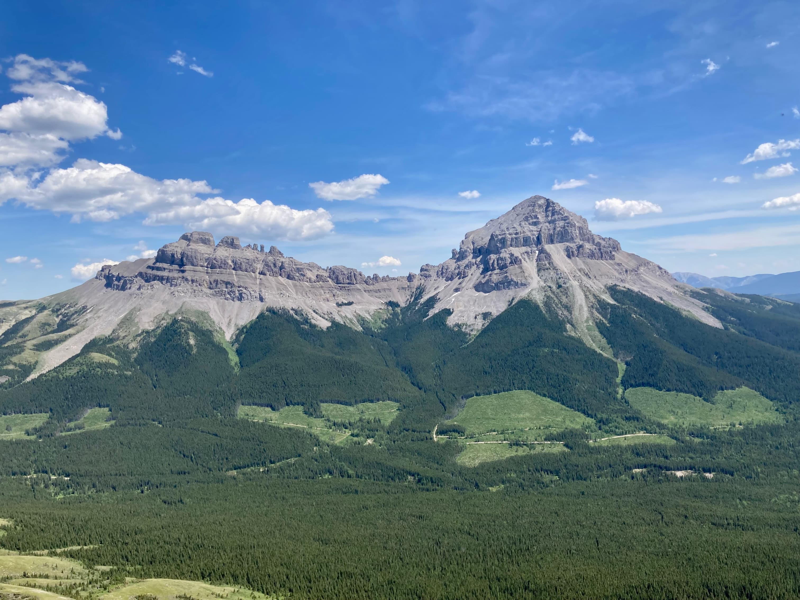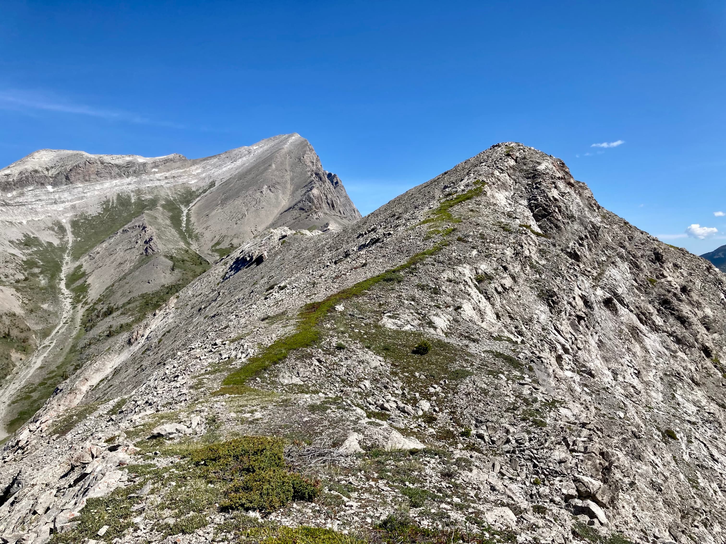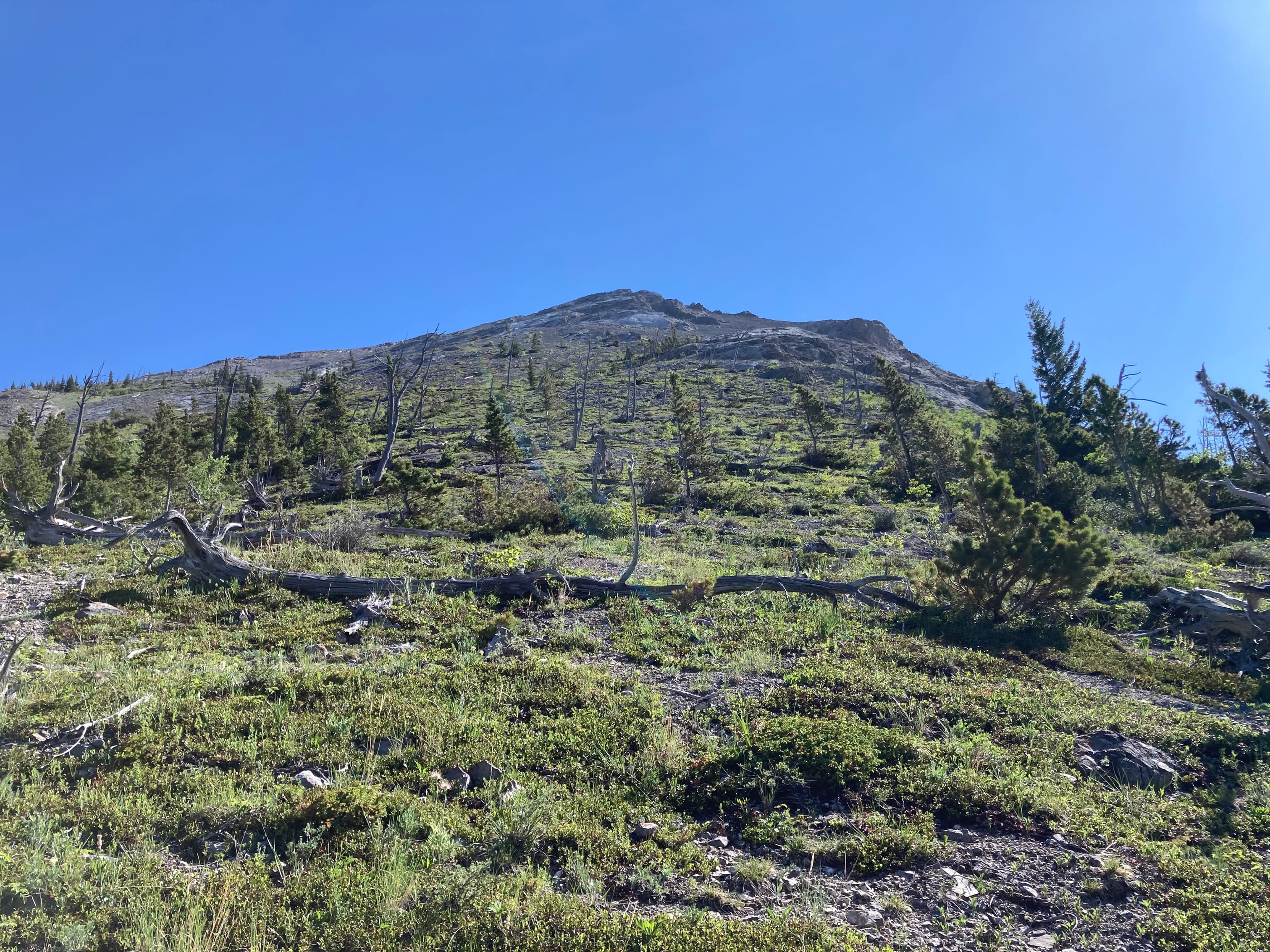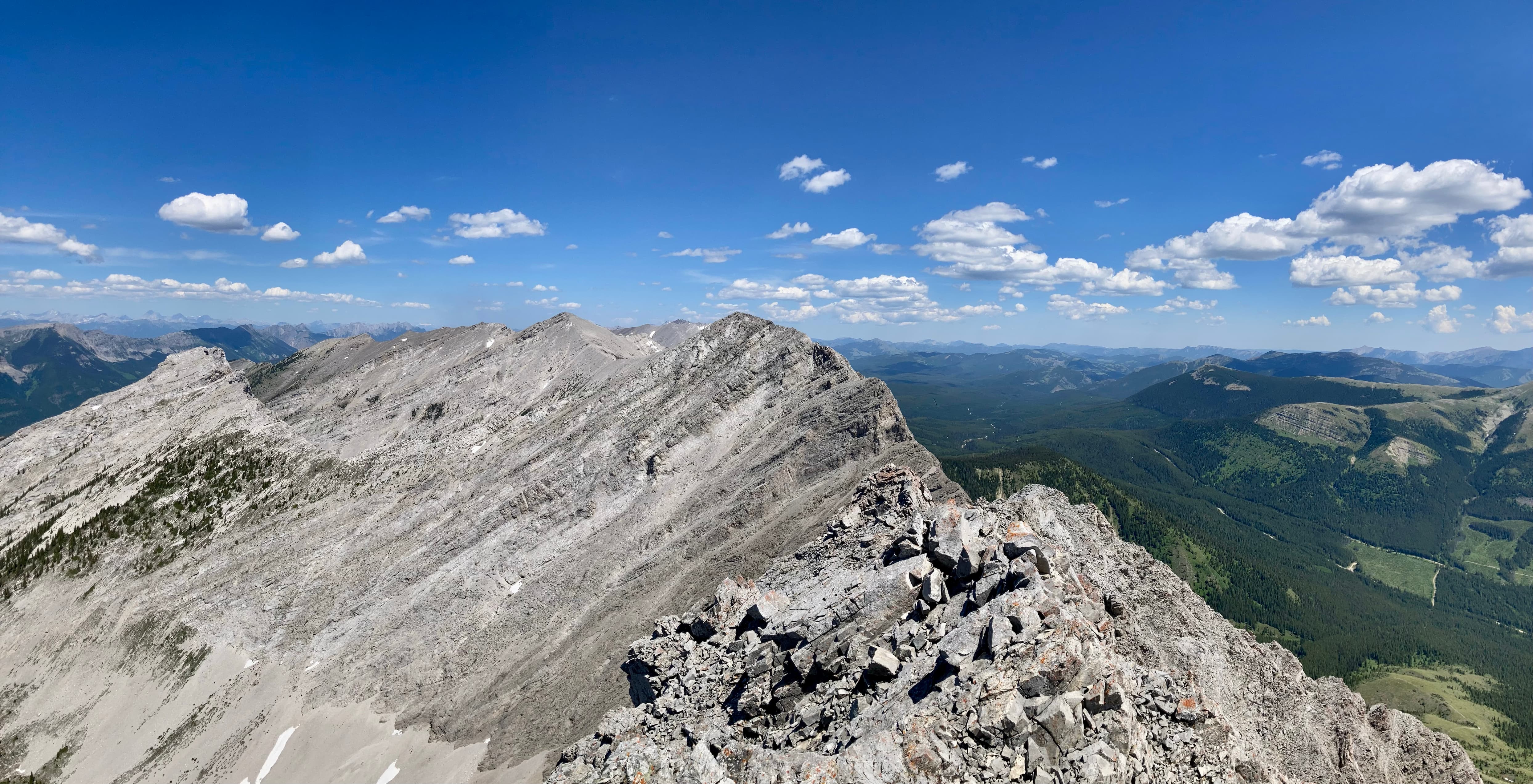 Route overview. The approach is fairly long, but it’s easy hiking.You can see how there are two avalanche pathways. The first one you come to (waking in from the right of this picture) is partly blocked off from the 2nd one by trees that stretch half way up the slope. McMurray went up the first one. Nugara’s book and Nakagama’s trip report show pictures of the 2nd one. I went up and down the 2nd one.The area of the mountain just below the summit. You can see where I moved off the main ascent ridge to the left, to ascend another ridge which was well away from the sheer cliffs.Checking out the objective from the parking area.Following the ATV trail north, I very quickly came to this fork. I went left over the bridge.The next fork – I went left again.The third fork. Left again.The trail descends a bit and the mountain comes into view briefly. A short distance beyond here another, slightly narrower ATV trail cuts across this one and goes steeply uphill. Continue straight ahead.The trail passes a pond before reaching the avalanche pathway. Moose tracks are visible in the area, including in the mud at the bottom of the pond. I was lucky enough to see more than the tracks.She noticed me, but didn’t seem too bothered.She eventually waded to the edge of the pond then wandered into the woods above the trail.The first avalanche pathway. I wanted to have more direct access to the ridge, so I walked another 30 meters to the next one.The second avalanche pathway. I decided to ascend here so I could more directly head to the ridge on the left. The terrain here was steep, crumbly, and covered in shrubs and small trees.Out of the avalanche pathway and onto the broad ridge.On the ascent, it was easiest to stick to the grippy slabs wherever possible. To the climber’s left there’s more scree and debris. Sometimes, a slab was lurking just below the scree which made the descent tricky in places.Looking to my right on the ascent.Looking back down.Continuing upwards. More slabs and rubble.As I got near to the ridge top, Crowsnest Mountain suddenly came into view.Finally at the ridge top. The long ridge walk and the summit are in view. There was a concrete marker here, which I assume was for surveying purposes once upon a time.Looking south from the concrete marker. Mount Tecumseh, Phillips Peak and an unnamed peak are across the valley.Setting off on the ridge walk. Conditions were very calm, and this was a very enjoyable walk.One of two cairns that I found along the ridge. This one was on a high point. The other didn’t seem to mark anything in particular.Looking south again.Continuing along the ridge.The grassy col eventually came into view at the base of the rock bands. I started to ponder how I was going to climb this thing.I took this shot at the end of the day, so the light is a little different. The route is approximate, but the main points are: There are decent scrambling paths through the rock bands. Difficulties can be avoided by going left, but it’s a good idea to go right again to stay close to the ridge. There’ an obvious place where the ridge crumbles away to a sheer drop and you can see steep rubble slopes above that lead directly to cliffs. At this point, looking left, there’s another ridge rising out of the scree across a shallow gully/scree field. It’s a good idea to head left and follow that ridge to the top. On descent, remember you’ll die if you slip and slide above the cliffs, so angle away.Looking at the start of the rock bands from the grassy col.Scrambling up the rock bands.Looking back.More scrambling up rock bands.Crowsnest Mountain through a gap in the ridge.Some more decent scrambling terrain.Above the main rock bands the summit comes back into view. It was pretty easy to stick near to the ridge here.Taking a peek at the sheer drop to the right.Some nice rock scenery.Here’s where the main ascent ridge changes character. Loose rubble and scree above this point seemed to lead directly to the cliffs – no more raised solid rock between scree and open air. I headed left towards a another ridge across the scree field.Cutting left across the scree towards another ridge.The summit finally came into view.Looking back down. You can see where the main ascent ridge (centre) is interrupted by a large crack.At the right of this frame is the ridge I used for the last part of the ascent.The final walk to the summit. A black bird (I don’t know if it was a crow or raven) was sitting on the cairn.He seemed to be enjoying his solitude before I came along. The summit of Deadman Peak. There was a register in a small Nalgene bottle in the cairn. Nobody else had recorded an ascent so far in 2023.Immediately adjacent to the cairn is this drop all the way to the valley floor. So don’t get too caught up in your picture taking and forget to look where you’re stepping.Panorama to the south.Panorama to the west.Panorama to the north.Panorama to the east.Telephoto view looking west at the Fernie area.The air quality didn’t lend itself well to such a distant shot, but I could see Mount Fisher far to the west.Time to descend. Making sure to stay right.Almost back to the grassy col.Taking a little break at the col.A C-130 passed over the area as I walked back along the ridge.There was a search-and-rescue training exercise in the area.Airplanes and mountains are my two favourite things, so this was pretty great.One more shot of Crowsnest Mountain and Seven Sisters.Descending back to the level of the avalanche pathway. On descent I stayed right and tried to steer away from rubble covered slabs. It wasn’t always possible.Back at the avalanche pathway. Descending this was actually really tricky. I fell pretty hard but didn’t do any major damage.I managed to survive the rest of the walk back to my car. Looking over my shoulder while I was packing my gear away, I had this great view of Crowsnest Mountain and a picturesque sky.
