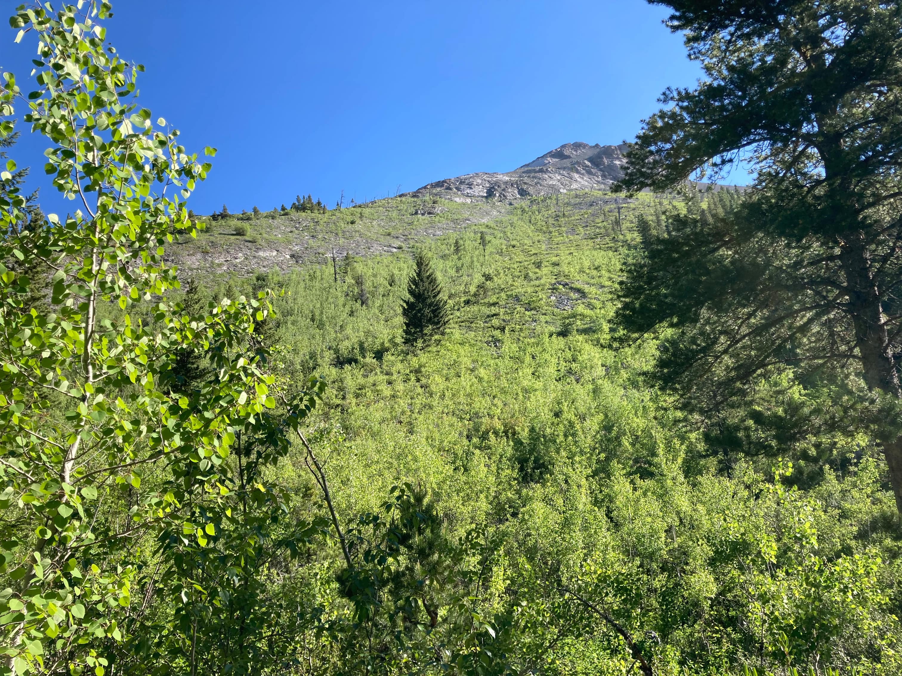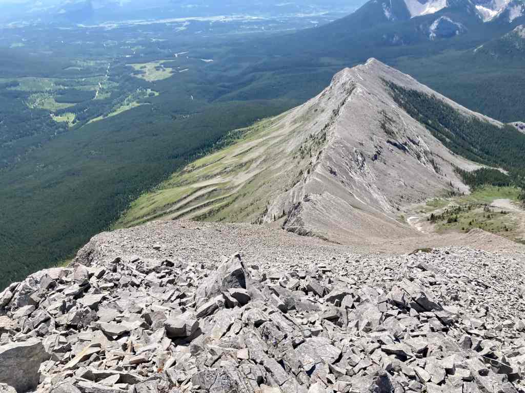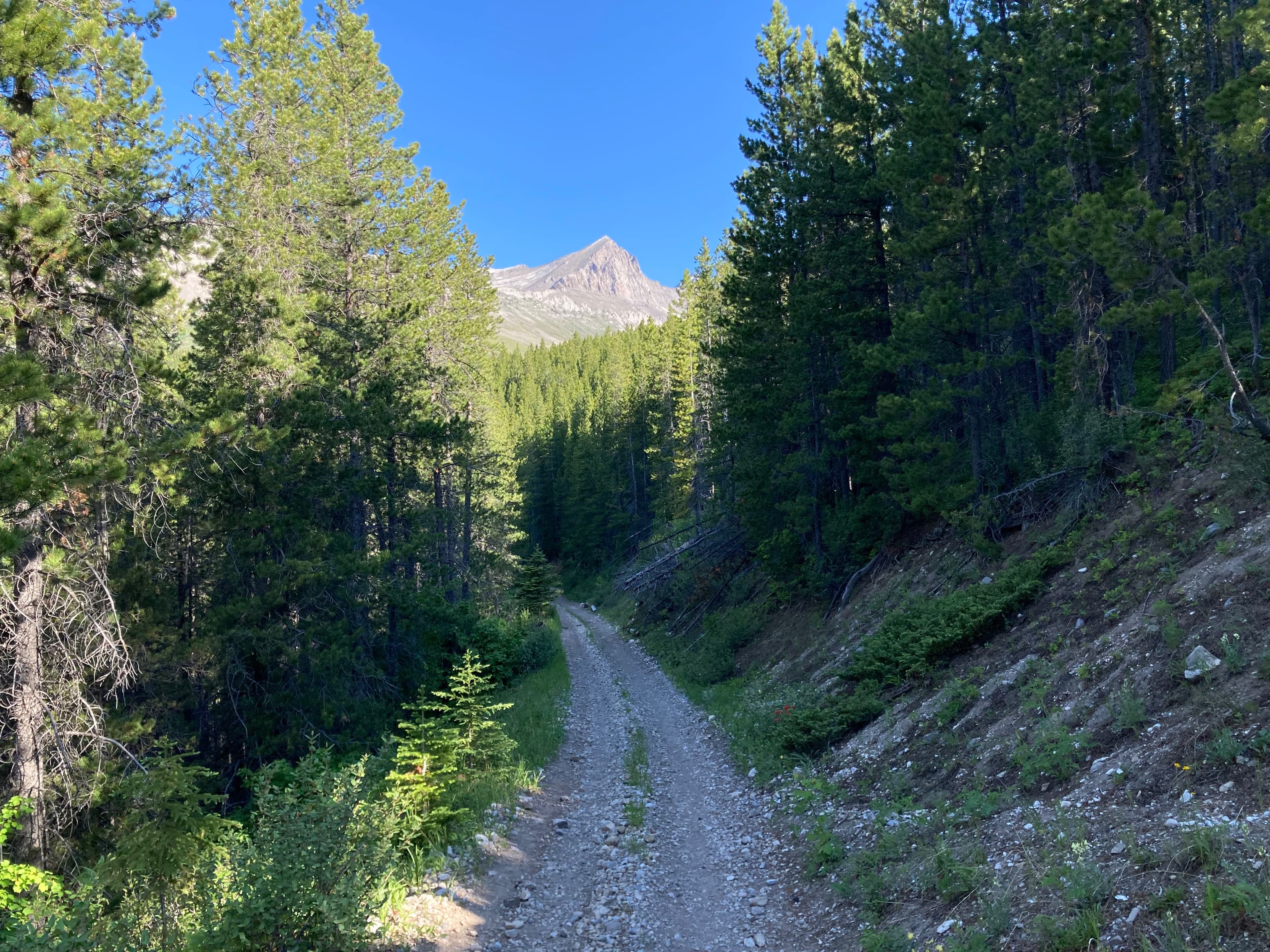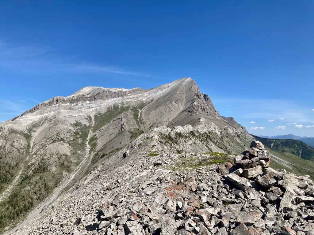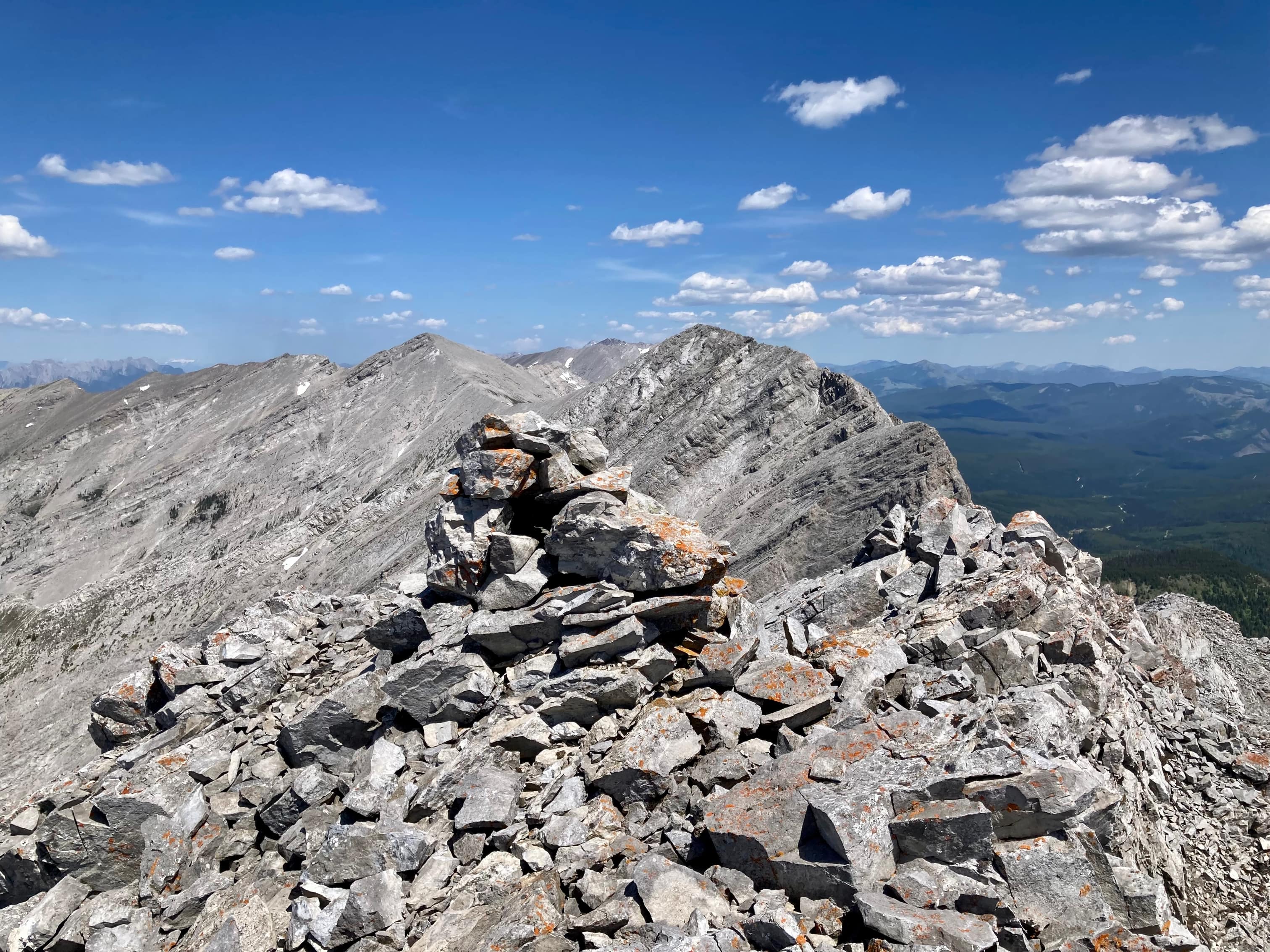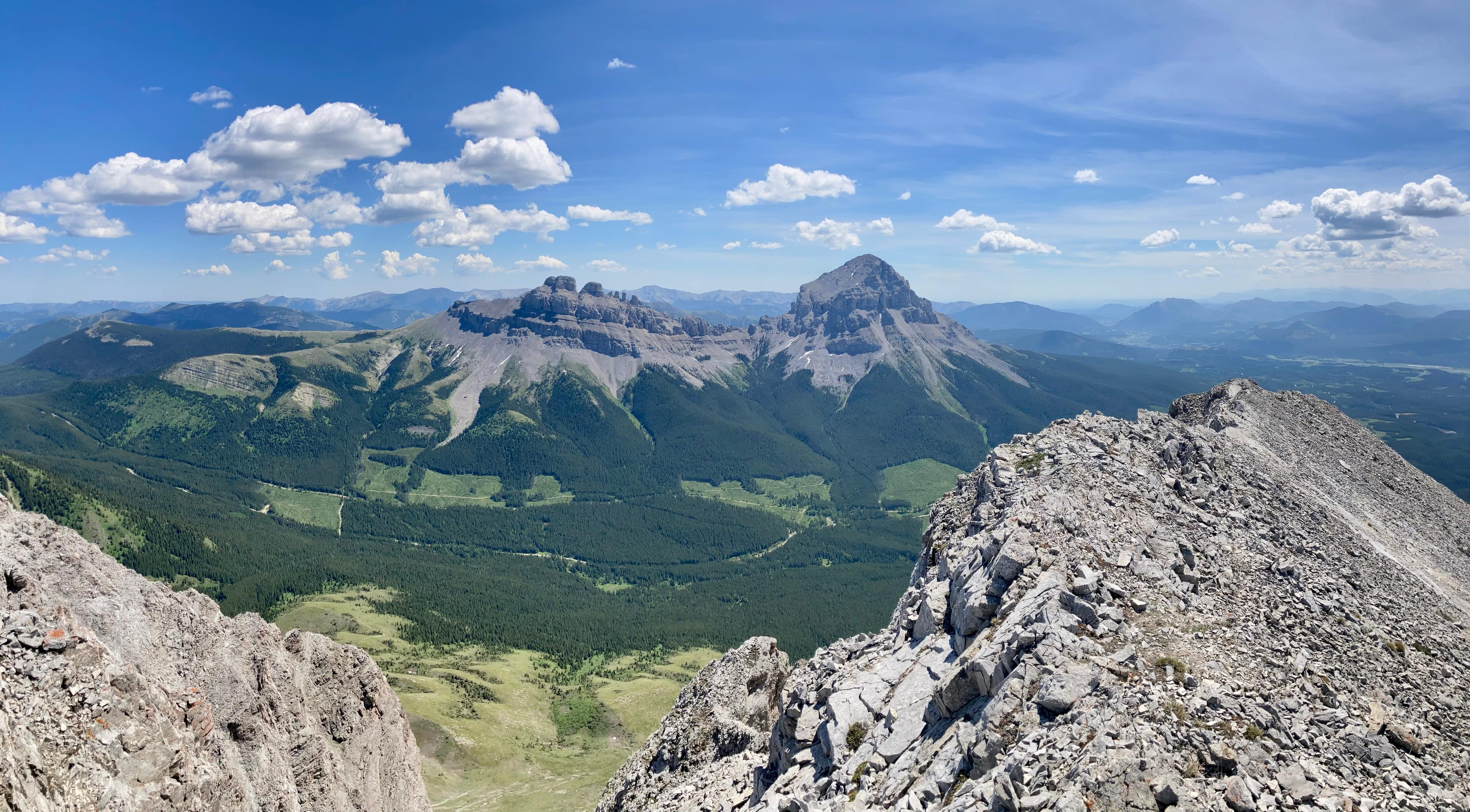 Route overview. The approach is fairly long, but it’s easy hiking.You can see how there are two avalanche pathways. The first one you come to (waking in from the right of this picture) is partly blocked off from the 2nd one by trees that stretch half way up the slope. McMurray went up the first one. Nugara’s book and Nakagama’s trip report show pictures of the 2nd one. I went up and down the 2nd one.The area of the mountain just below the summit. You can see where I moved off the main ascent ridge to the left, to ascend another ridge which was well away from the sheer cliffs.Checking out the objective from the parking area.Following the ATV trail north, I very quickly came to this fork. I went left over the bridge.The next fork – I went left again.The third fork. Left again.The trail descends a bit and the mountain comes into view briefly. A short distance beyond here another, slightly narrower ATV trail cuts across this one and goes steeply uphill. Continue straight ahead.The trail passes a pond before reaching the avalanche pathway. Moose tracks are visible in the area, including in the mud at the bottom of the pond. I was lucky enough to see more than the tracks.She noticed me, but didn’t seem too bothered.She eventually waded to the edge of the pond then wandered into the woods above the trail.The first avalanche pathway. I wanted to have more direct access to the ridge, so I walked another 30 meters to the next one.The second avalanche pathway. I decided to ascend here so I could more directly head to the ridge on the left. The terrain here was steep, crumbly, and covered in shrubs and small trees.Out of the avalanche pathway and onto the broad ridge.On the ascent, it was easiest to stick to the grippy slabs wherever possible. To the climber’s left there’s more scree and debris. Sometimes, a slab was lurking just below the scree which made the descent tricky in places.Looking to my right on the ascent.Looking back down.Continuing upwards. More slabs and rubble.As I got near to the ridge top, Crowsnest Mountain suddenly came into view.Finally at the ridge top. The long ridge walk and the summit are in view. There was a concrete marker here, which I assume was for surveying purposes once upon a time.Looking south from the concrete marker. Mount Tecumseh, Phillips Peak and an unnamed peak are across the valley.Setting off on the ridge walk. Conditions were very calm, and this was a very enjoyable walk.One of two cairns that I found along the ridge. This one was on a high point. The other didn’t seem to mark anything in particular.Looking south again.Continuing along the ridge.The grassy col eventually came into view at the base of the rock bands. I started to ponder how I was going to climb this thing.I took this shot at the end of the day, so the light is a little different. The route is approximate, but the main points are: There are decent scrambling paths through the rock bands. Difficulties can be avoided by going left, but it’s a good idea to go right again to stay close to the ridge. There’ an obvious place where the ridge crumbles away to a sheer drop and you can see steep rubble slopes above that lead directly to cliffs. At this point, looking left, there’s another ridge rising out of the scree across a shallow gully/scree field. It’s a good idea to head left and follow that ridge to the top. On descent, remember you’ll die if you slip and slide above the cliffs, so angle away.Looking at the start of the rock bands from the grassy col.Scrambling up the rock bands.Looking back.More scrambling up rock bands.Crowsnest Mountain through a gap in the ridge.Some more decent scrambling terrain.Above the main rock bands the summit comes back into view. It was pretty easy to stick near to the ridge here.Taking a peek at the sheer drop to the right.Some nice rock scenery.Here’s where the main ascent ridge changes character. Loose rubble and scree above this point seemed to lead directly to the cliffs – no more raised solid rock between scree and open air. I headed left towards a another ridge across the scree field.Cutting left across the scree towards another ridge.The summit finally came into view.Looking back down. You can see where the main ascent ridge (centre) is interrupted by a large crack.At the right of this frame is the ridge I used for the last part of the ascent.The final walk to the summit. A black bird (I don’t know if it was a crow or raven) was sitting on the cairn.He seemed to be enjoying his solitude before I came along. The summit of Deadman Peak. There was a register in a small Nalgene bottle in the cairn. Nobody else had recorded an ascent so far in 2023.Immediately adjacent to the cairn is this drop all the way to the valley floor. So don’t get too caught up in your picture taking and forget to look where you’re stepping.Panorama to the south.Panorama to the west.Panorama to the north.Panorama to the east.Telephoto view looking west at the Fernie area.The air quality didn’t lend itself well to such a distant shot, but I could see Mount Fisher far to the west.Time to descend. Making sure to stay right.Almost back to the grassy col.Taking a little break at the col.A C-130 passed over the area as I walked back along the ridge.There was a search-and-rescue training exercise in the area.Airplanes and mountains are my two favourite things, so this was pretty great.One more shot of Crowsnest Mountain and Seven Sisters.Descending back to the level of the avalanche pathway. On descent I stayed right and tried to steer away from rubble covered slabs. It wasn’t always possible.Back at the avalanche pathway. Descending this was actually really tricky. I fell pretty hard but didn’t do any major damage.I managed to survive the rest of the walk back to my car. Looking over my shoulder while I was packing my gear away, I had this great view of Crowsnest Mountain and a picturesque sky.