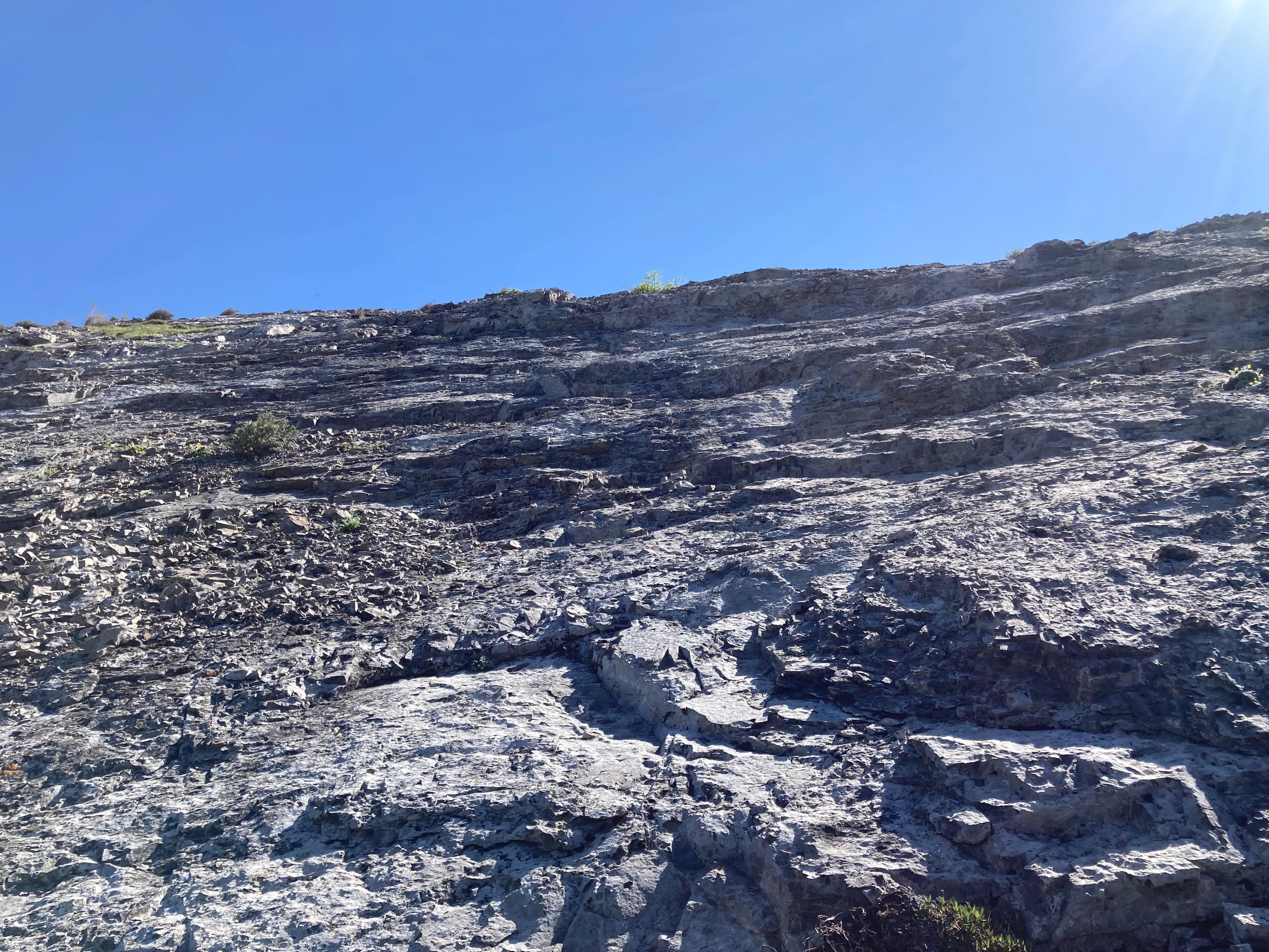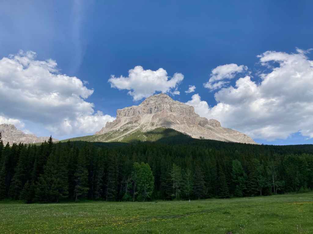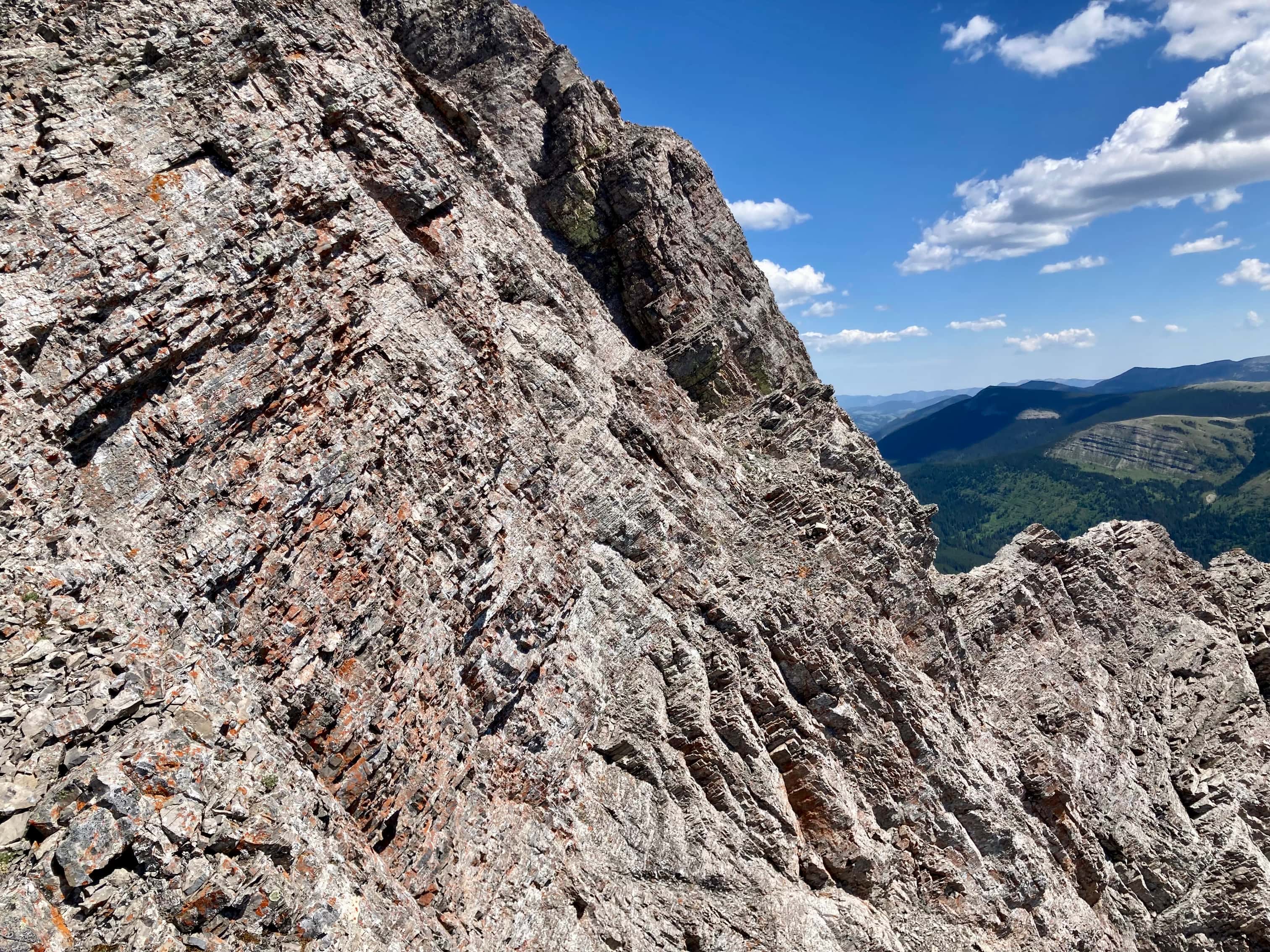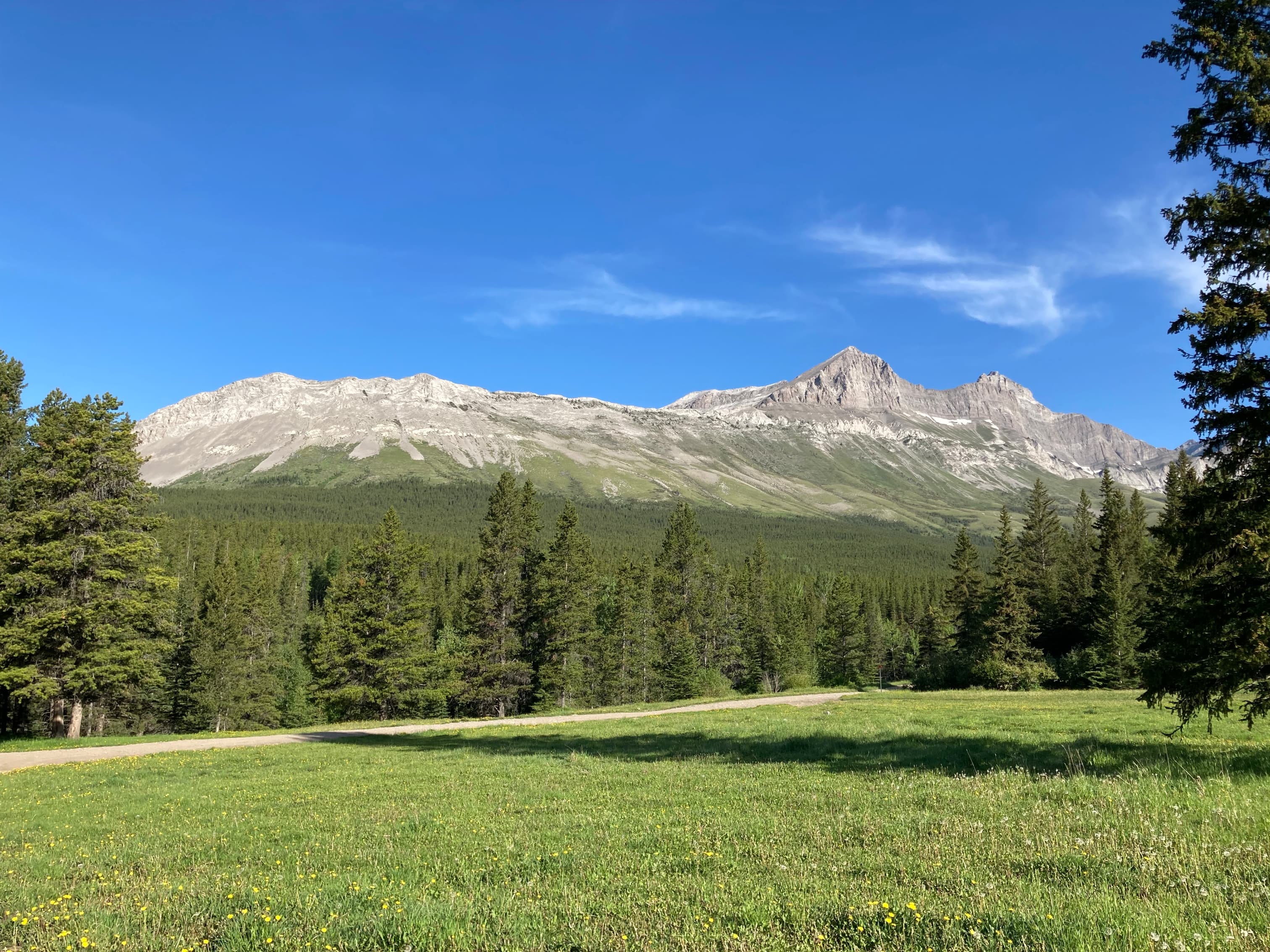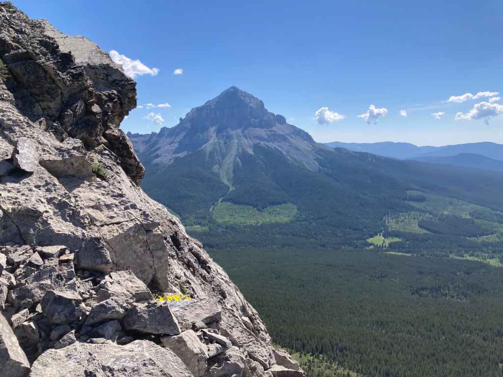 Route overview. The approach is fairly long, but it’s easy hiking.You can see how there are two avalanche pathways. The first one you come to (waking in from the right of this picture) is partly blocked off from the 2nd one by trees that stretch half way up the slope. McMurray went up the first one. Nugara’s book and Nakagama’s trip report show pictures of the 2nd one. I went up and down the 2nd one.The area of the mountain just below the summit. You can see where I moved off the main ascent ridge to the left, to ascend another ridge which was well away from the sheer cliffs.Checking out the objective from the parking area.Following the ATV trail north, I very quickly came to this fork. I went left over the bridge.The next fork – I went left again.The third fork. Left again.The trail descends a bit and the mountain comes into view briefly. A short distance beyond here another, slightly narrower ATV trail cuts across this one and goes steeply uphill. Continue straight ahead.The trail passes a pond before reaching the avalanche pathway. Moose tracks are visible in the area, including in the mud at the bottom of the pond. I was lucky enough to see more than the tracks.She noticed me, but didn’t seem too bothered.She eventually waded to the edge of the pond then wandered into the woods above the trail.The first avalanche pathway. I wanted to have more direct access to the ridge, so I walked another 30 meters to the next one.The second avalanche pathway. I decided to ascend here so I could more directly head to the ridge on the left. The terrain here was steep, crumbly, and covered in shrubs and small trees.Out of the avalanche pathway and onto the broad ridge.On the ascent, it was easiest to stick to the grippy slabs wherever possible. To the climber’s left there’s more scree and debris. Sometimes, a slab was lurking just below the scree which made the descent tricky in places.Looking to my right on the ascent.Looking back down.Continuing upwards. More slabs and rubble.As I got near to the ridge top, Crowsnest Mountain suddenly came into view.Finally at the ridge top. The long ridge walk and the summit are in view. There was a concrete marker here, which I assume was for surveying purposes once upon a time.Looking south from the concrete marker. Mount Tecumseh, Phillips Peak and an unnamed peak are across the valley.Setting off on the ridge walk. Conditions were very calm, and this was a very enjoyable walk.One of two cairns that I found along the ridge. This one was on a high point. The other didn’t seem to mark anything in particular.Looking south again.Continuing along the ridge.The grassy col eventually came into view at the base of the rock bands. I started to ponder how I was going to climb this thing.I took this shot at the end of the day, so the light is a little different. The route is approximate, but the main points are: There are decent scrambling paths through the rock bands. Difficulties can be avoided by going left, but it’s a good idea to go right again to stay close to the ridge. There’ an obvious place where the ridge crumbles away to a sheer drop and you can see steep rubble slopes above that lead directly to cliffs. At this point, looking left, there’s another ridge rising out of the scree across a shallow gully/scree field. It’s a good idea to head left and follow that ridge to the top. On descent, remember you’ll die if you slip and slide above the cliffs, so angle away.Looking at the start of the rock bands from the grassy col.Scrambling up the rock bands.Looking back.More scrambling up rock bands.Crowsnest Mountain through a gap in the ridge.Some more decent scrambling terrain.Above the main rock bands the summit comes back into view. It was pretty easy to stick near to the ridge here.Taking a peek at the sheer drop to the right.Some nice rock scenery.Here’s where the main ascent ridge changes character. Loose rubble and scree above this point seemed to lead directly to the cliffs – no more raised solid rock between scree and open air. I headed left towards a another ridge across the scree field.Cutting left across the scree towards another ridge.The summit finally came into view.Looking back down. You can see where the main ascent ridge (centre) is interrupted by a large crack.At the right of this frame is the ridge I used for the last part of the ascent.The final walk to the summit. A black bird (I don’t know if it was a crow or raven) was sitting on the cairn.He seemed to be enjoying his solitude before I came along. The summit of Deadman Peak. There was a register in a small Nalgene bottle in the cairn. Nobody else had recorded an ascent so far in 2023.Immediately adjacent to the cairn is this drop all the way to the valley floor. So don’t get too caught up in your picture taking and forget to look where you’re stepping.Panorama to the south.Panorama to the west.Panorama to the north.Panorama to the east.Telephoto view looking west at the Fernie area.The air quality didn’t lend itself well to such a distant shot, but I could see Mount Fisher far to the west.Time to descend. Making sure to stay right.Almost back to the grassy col.Taking a little break at the col.A C-130 passed over the area as I walked back along the ridge.There was a search-and-rescue training exercise in the area.Airplanes and mountains are my two favourite things, so this was pretty great.One more shot of Crowsnest Mountain and Seven Sisters.Descending back to the level of the avalanche pathway. On descent I stayed right and tried to steer away from rubble covered slabs. It wasn’t always possible.Back at the avalanche pathway. Descending this was actually really tricky. I fell pretty hard but didn’t do any major damage.I managed to survive the rest of the walk back to my car. Looking over my shoulder while I was packing my gear away, I had this great view of Crowsnest Mountain and a picturesque sky.