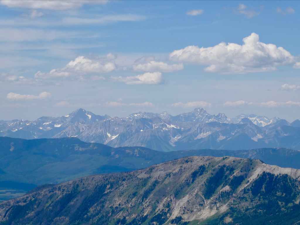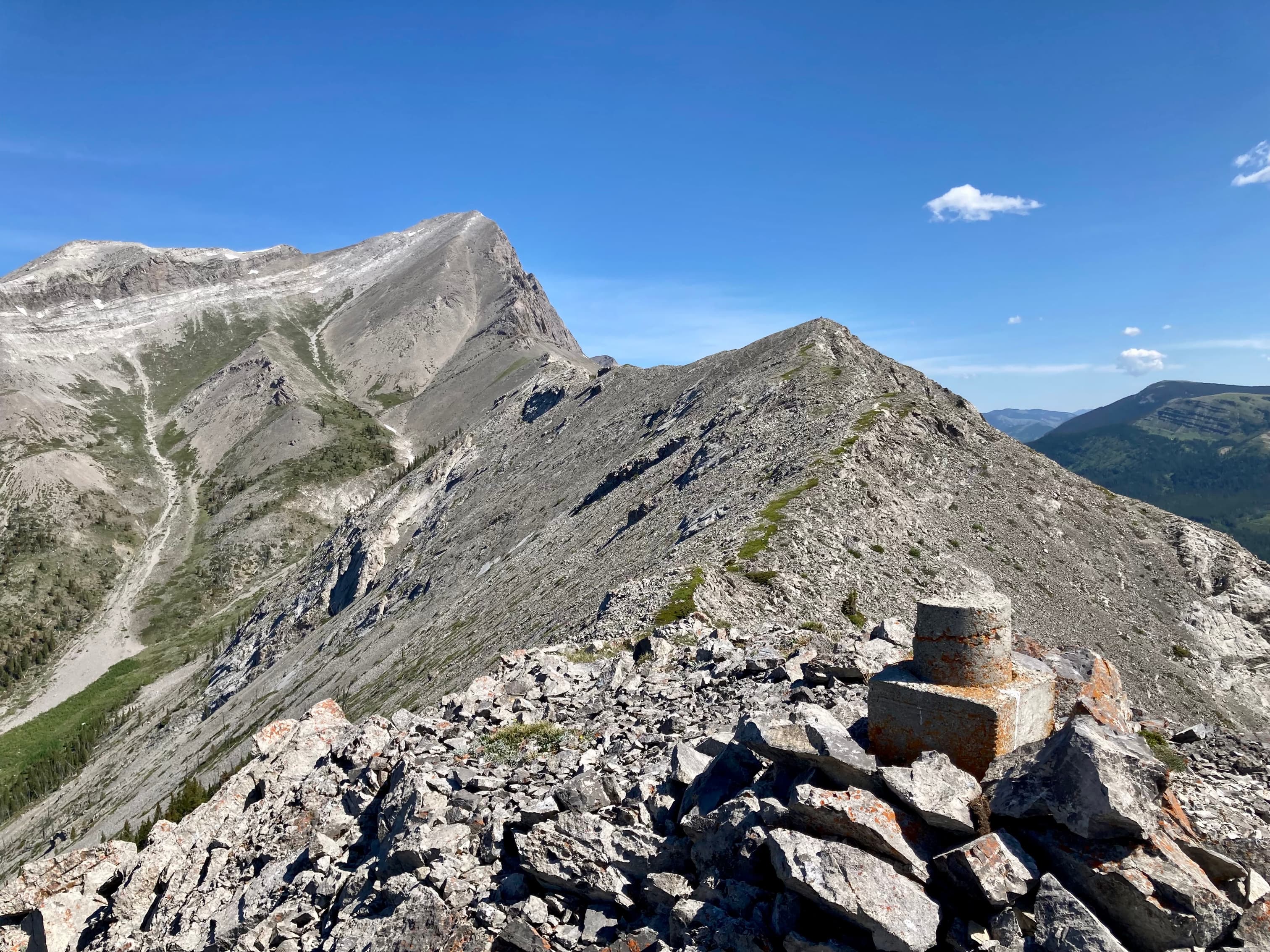 The summit was almost windless, and views were only slightly marred by thin smoke in the air. The summit is on the Alberta/BC border, so there are great views into the area of Fernie and even as far as Mount Fisher. Mount Tecumseh, Phillips Peak, Crowsnest Mountain, and Seven Sisters dominated the view closer by.