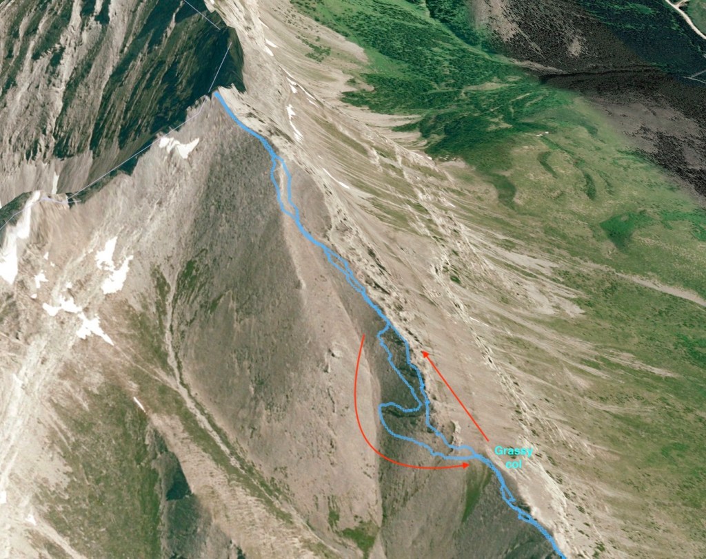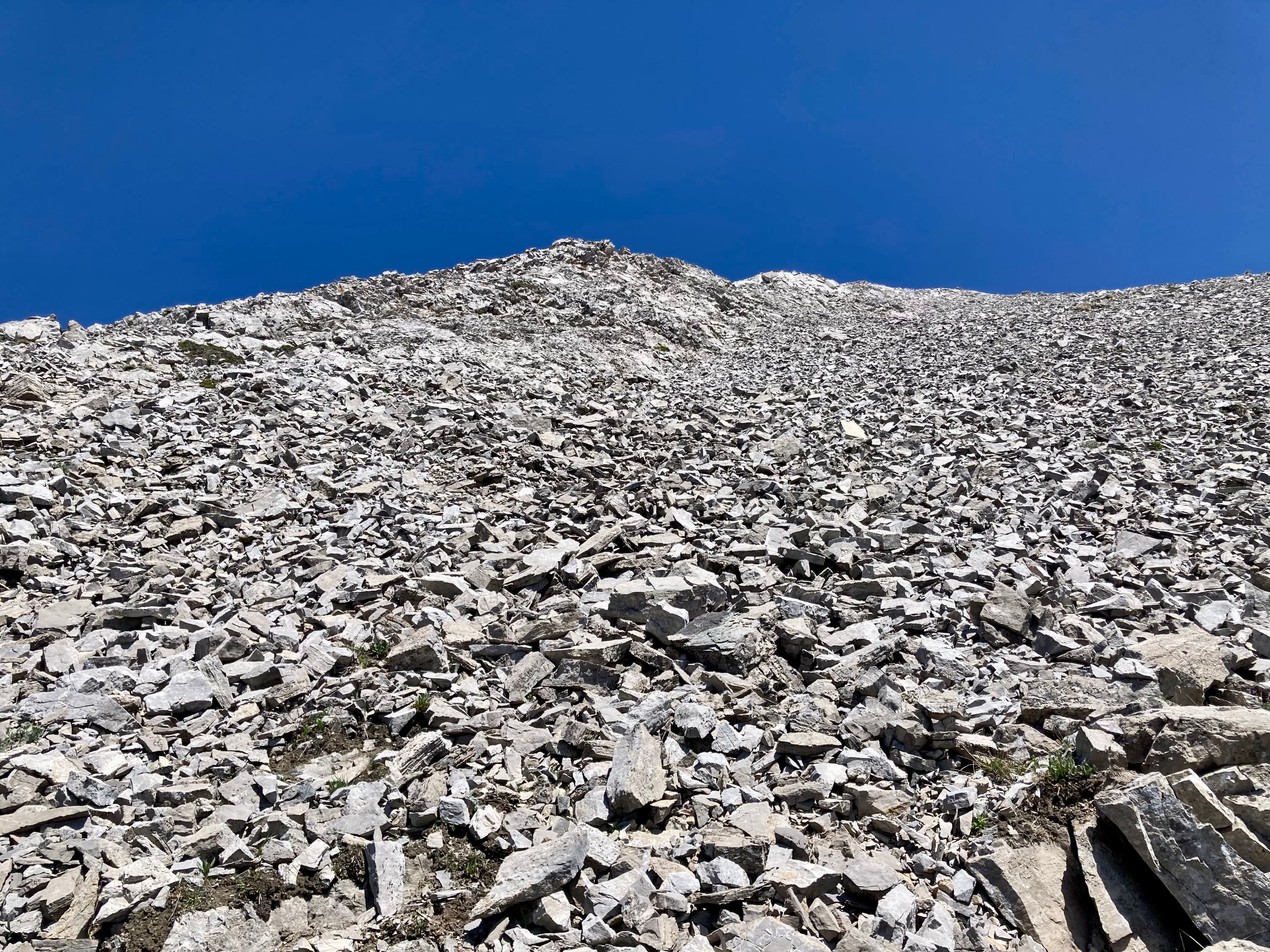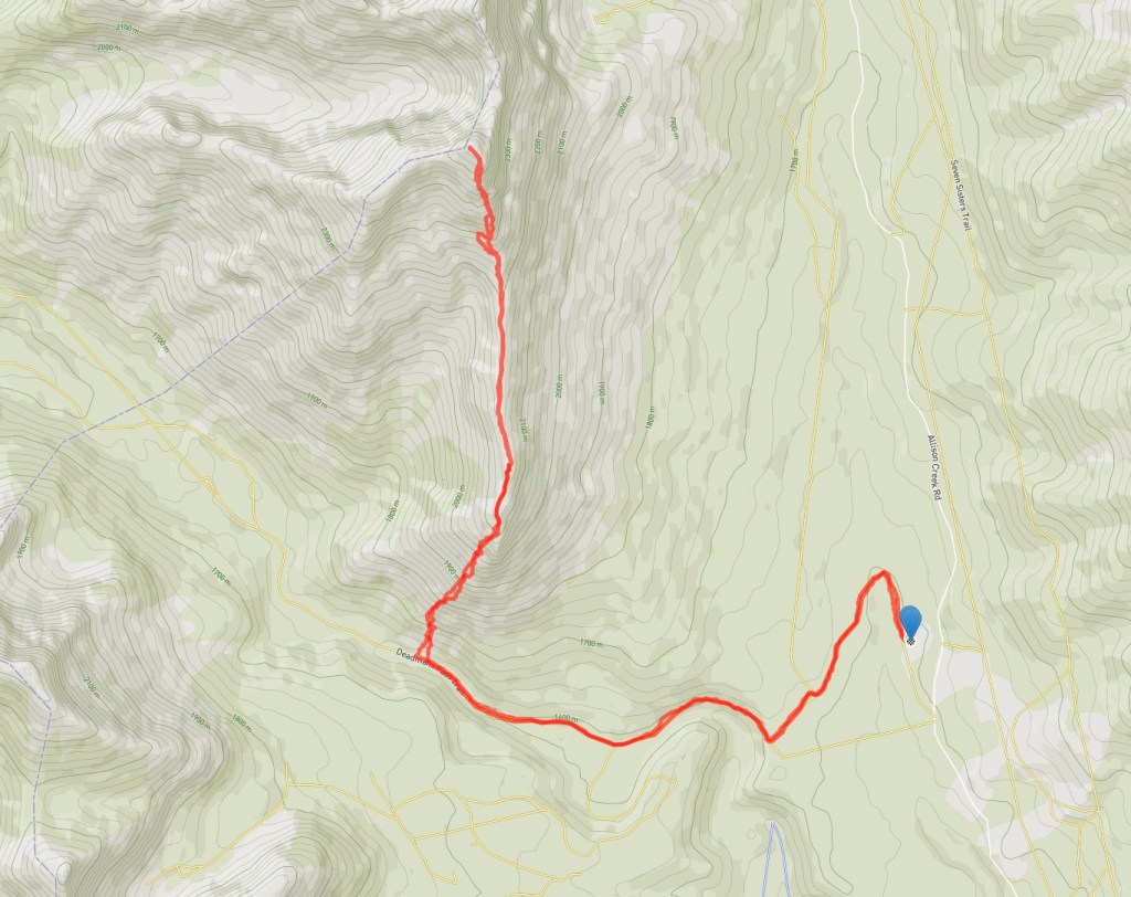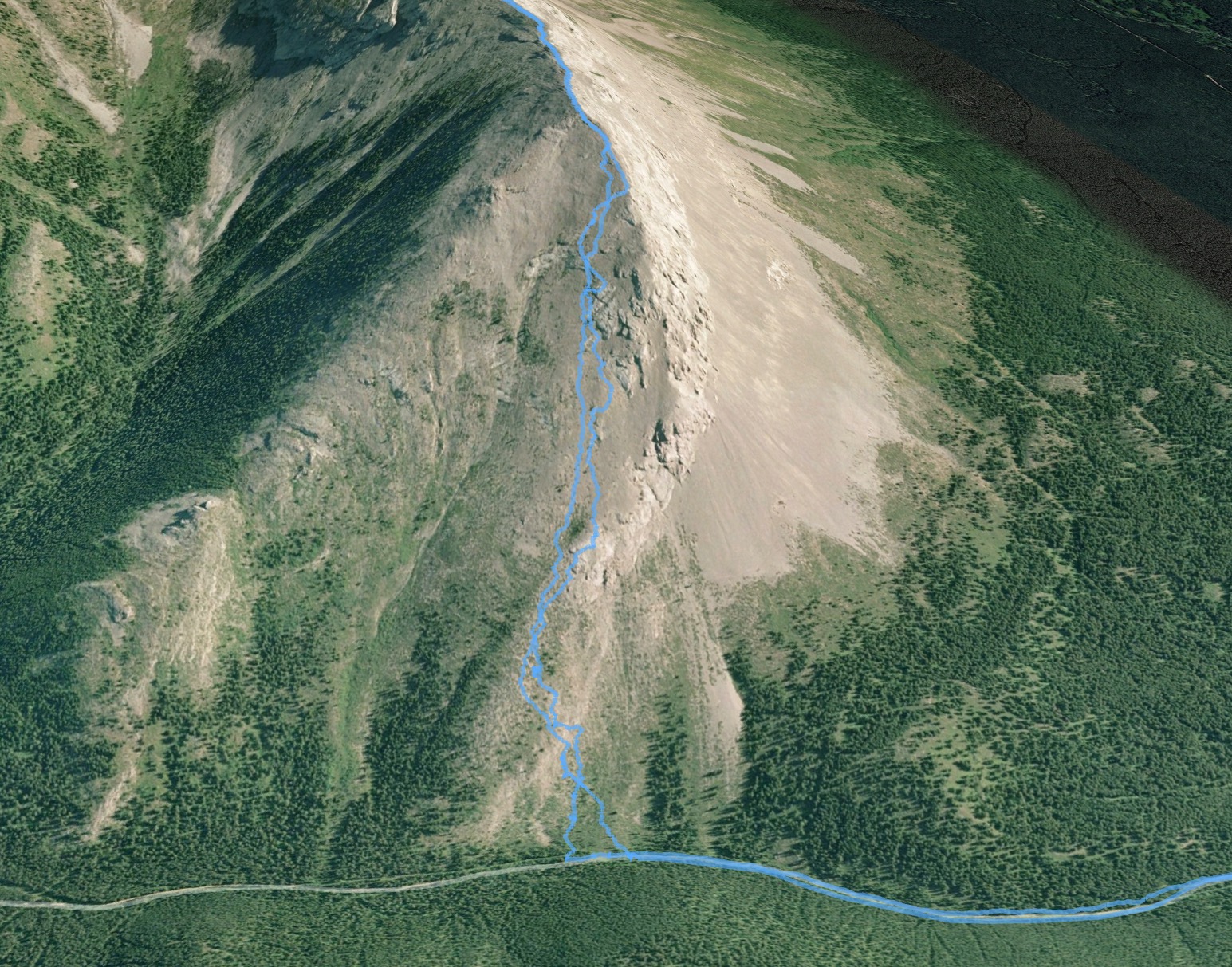 After a leisurely lunch, I returned along the same path. For my initial descent I stayed to skier’s right so I’d be nowhere near the cliffs. I avoided the rock bands or down climbed at easy spots. In retrospect, I might have been able to rapidly go down the middle of the scree gully and just kept my eye out for the grassy col, cutting over when it came into view. I then followed the ridge back to the avalanche pathway and got myself back to the ATV trail. I fell as I came off the ridge onto the avalanche pathway but managed to avoid major injury. After I picked myself up I imagine I looked pretty sad slipping, tripping, and sliding my way down to the trail. If there’s a graceful way to descend terrain like that I’d like to know what it is.