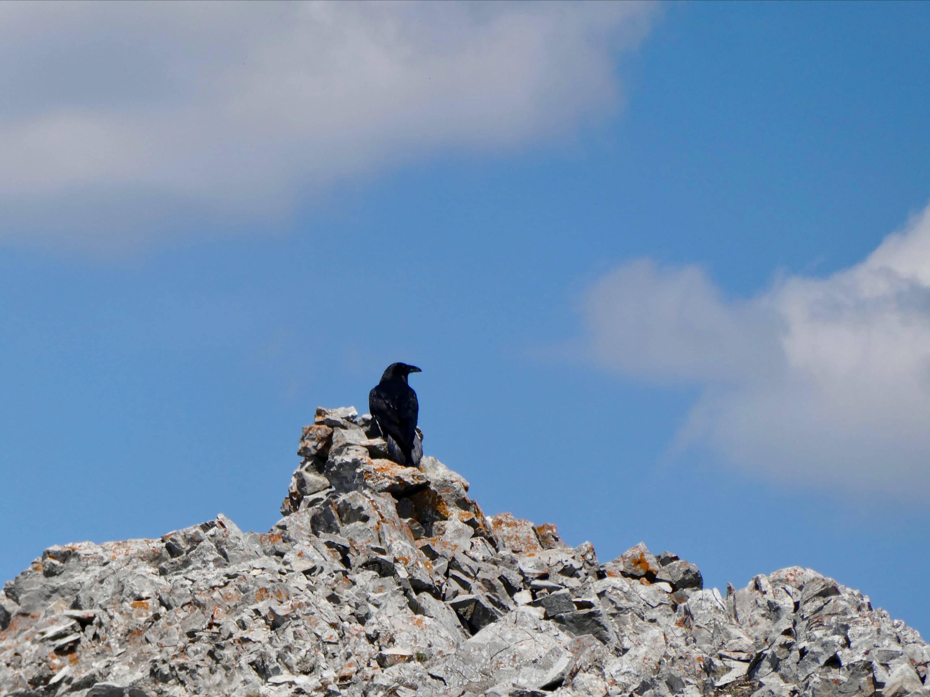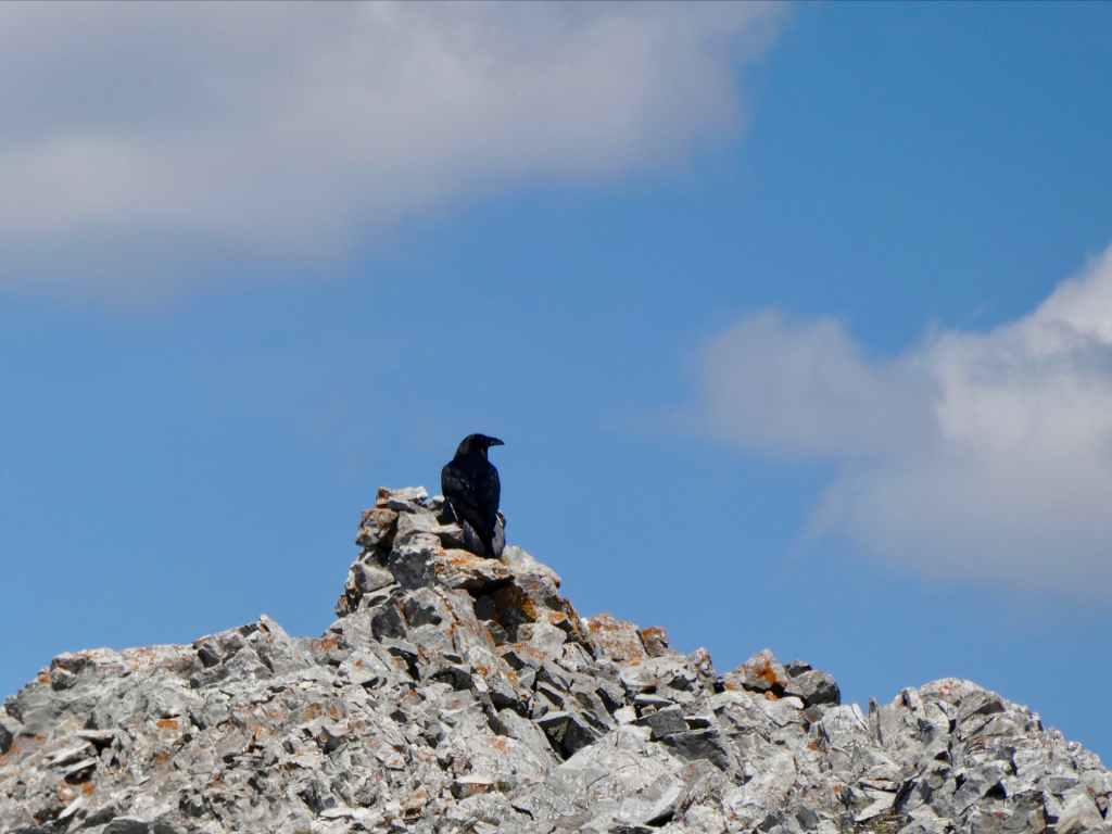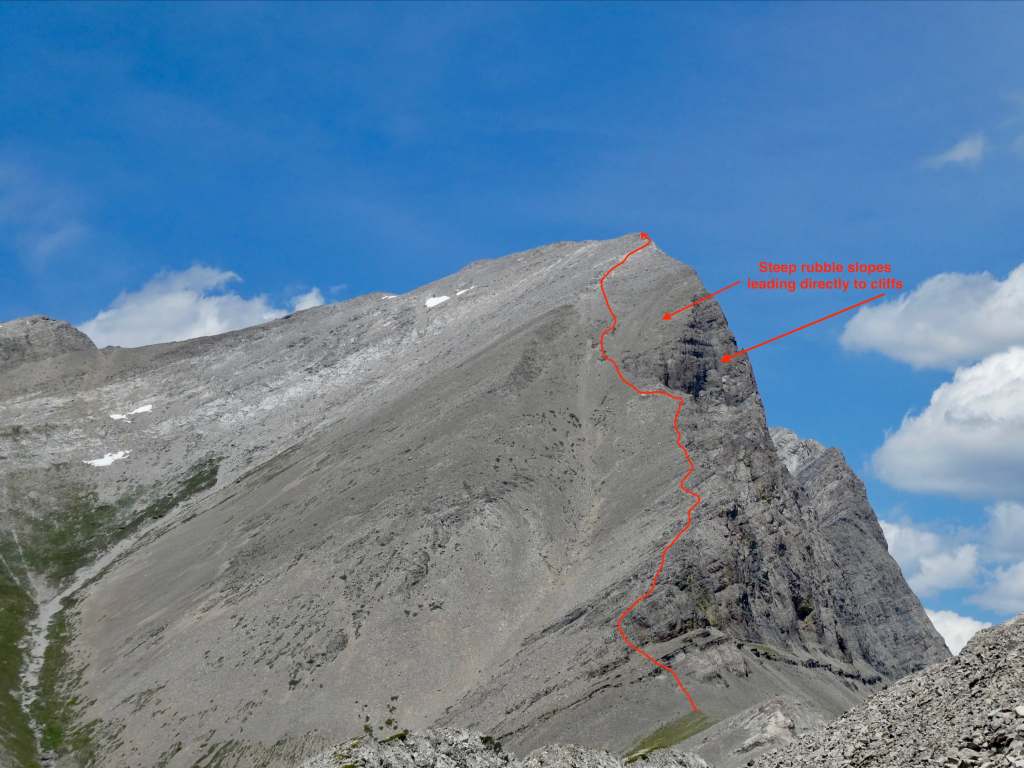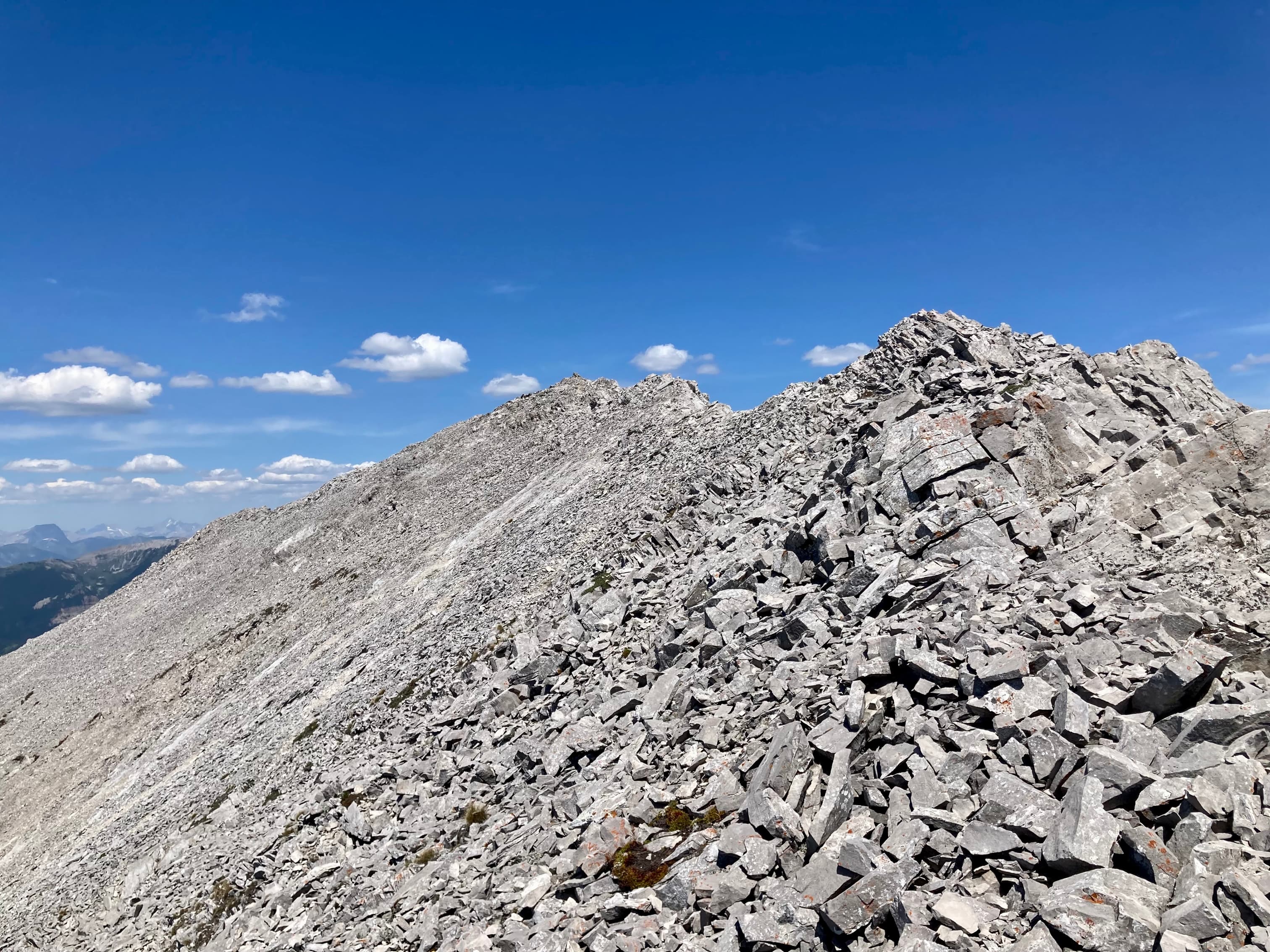 I eventually reached the ridge top and took in the view of the summit to the north. I followed the top of the ridge and enjoyed about a kilometre of great ridge walking. Eventually, I reached a small grassy col which marks the foot of the final ascent. Straight ahead were impressive rock bands. To the left was steep scree in a wide gully. I picked a route through the rock bands, drifting left whenever the terrain seemed to challenging but avoiding actually trying to climb the scree. Any time I did have to detour left I’d cut to the right again to stay close to the ridge. I was on “moderate” scrambling terrain for most of it. Just below the summit, the rocky ridge ends and a cliff wall beneath steep, loose rubble slopes is straight ahead. I veered left here, envisioning the nightmare of slowly sliding down that rubble slope and over the cliff. I could see a short rib or ridge of solid rock that appears at this point on the other side of the scree field. I made my way to it and climbed the rest of the way to the summit.
