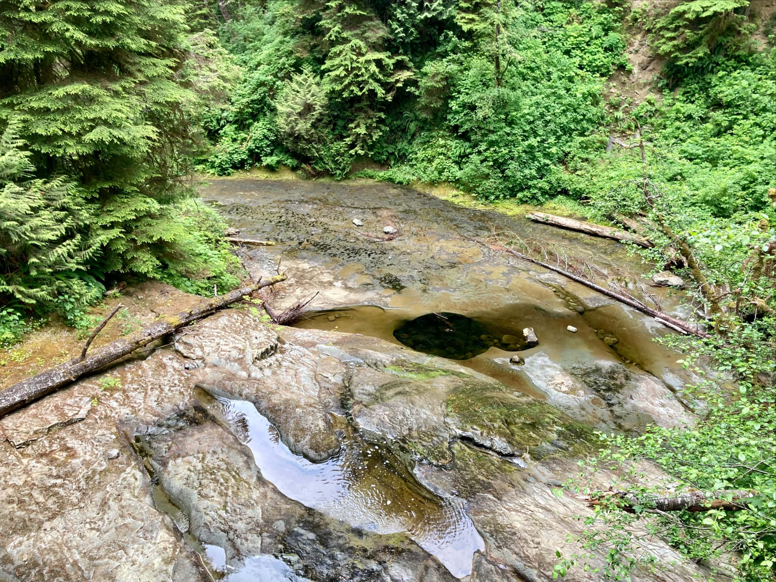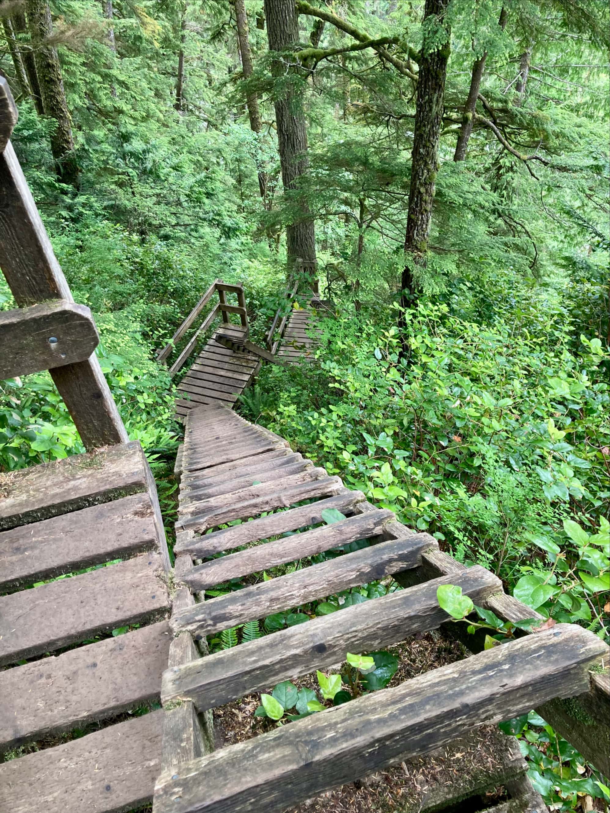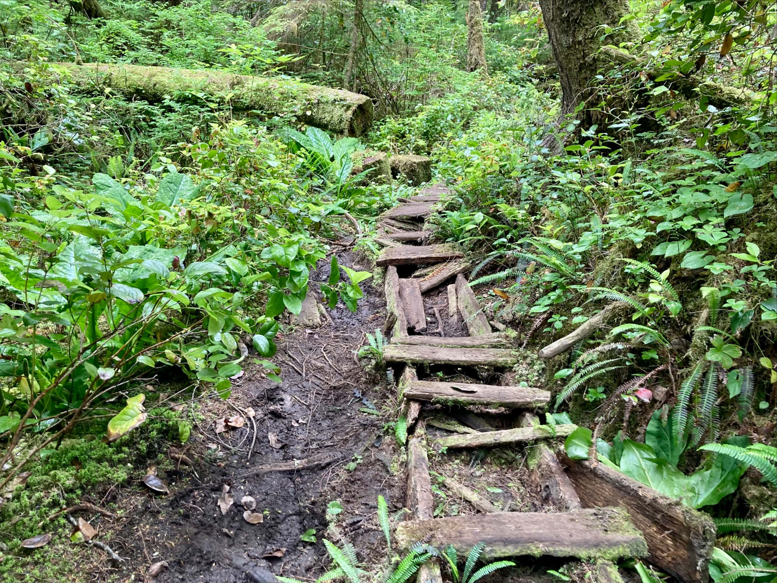 The portion of the trail to Camper Bay to Walbran Creek is notable because of its many, many ladders. It can also, apparently, become extremely muddy. Vancouver Island was in the middle of a drought during our visit, though, so while there were a few mud holes they were few and far between. Aside from the ladders, the other interesting thing about this part of the trail is the existence of multiple paths through certain areas. There might be a bit of a depression with more than one log plus a boardwalk traversing it, along with a path that descends into it and back out. Some places felt like a bit of a tumbled down playground lost in the rainforest.