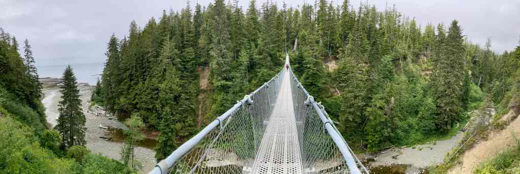 Beyond Cullite Creek we came to an area where the trees thinned out and a white-coloured boardwalk went on for a long distance over somewhat stunted vegetation. This area is apparently usually a bog. However, it was absolutely dry when we passed though. Along the way we met a group of young men coming the other way. We exchanged greetings and information about what lay ahead for each group. Most importantly, they told us that Nytom (the burger hut) at Carmanah Point and the Crab Shack at Nitinaht Narrows were both open. After the last 3 days of exertion, the thought of real food and cold beer helped keep my feet moving. We carried on, eventually reaching the spectacular suspension bridge over Logan Creek. A short time later we arrived at the Gordon Creek campsite.