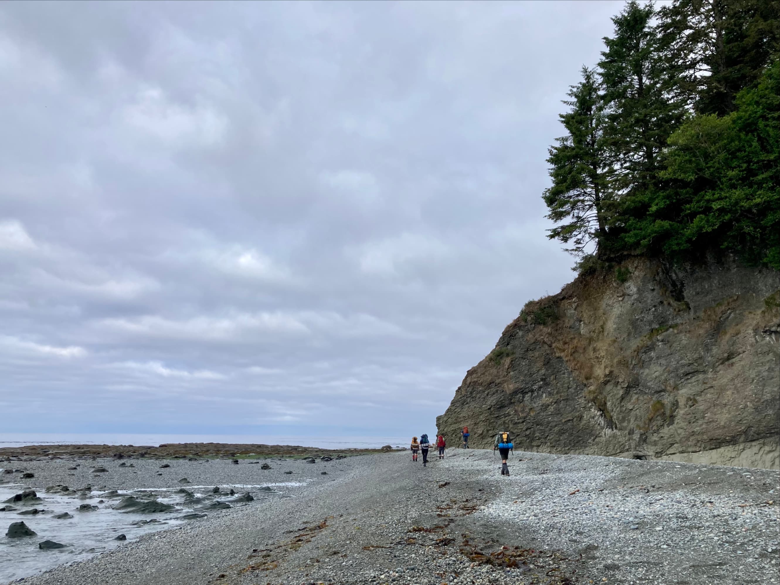 Walbran Creek was a very spacious campsite. A large, cold pool sat at the mouth of the creek that some brave folks took a plunge into. I wanted to keep my bandages dry so I had to skip out on swimming. A little upstream of there was a decent place to get drinking water. It wasn’t sunny, but it was warm so we had a chance to dry out some gear. At our evening meeting, we looked ahead to day 4. We were looking forward to it. At this point we’d left the most strenuous parts of the trail behind, and the tides were favourable for us to make the entire trip to Cribs Creek on the beach.