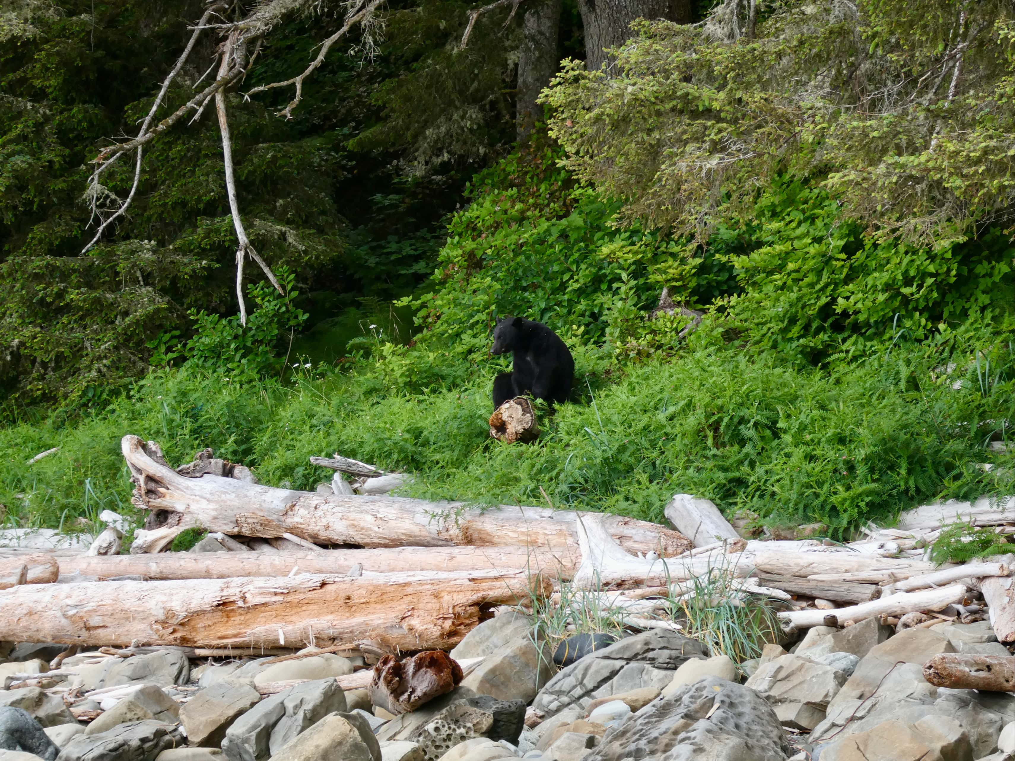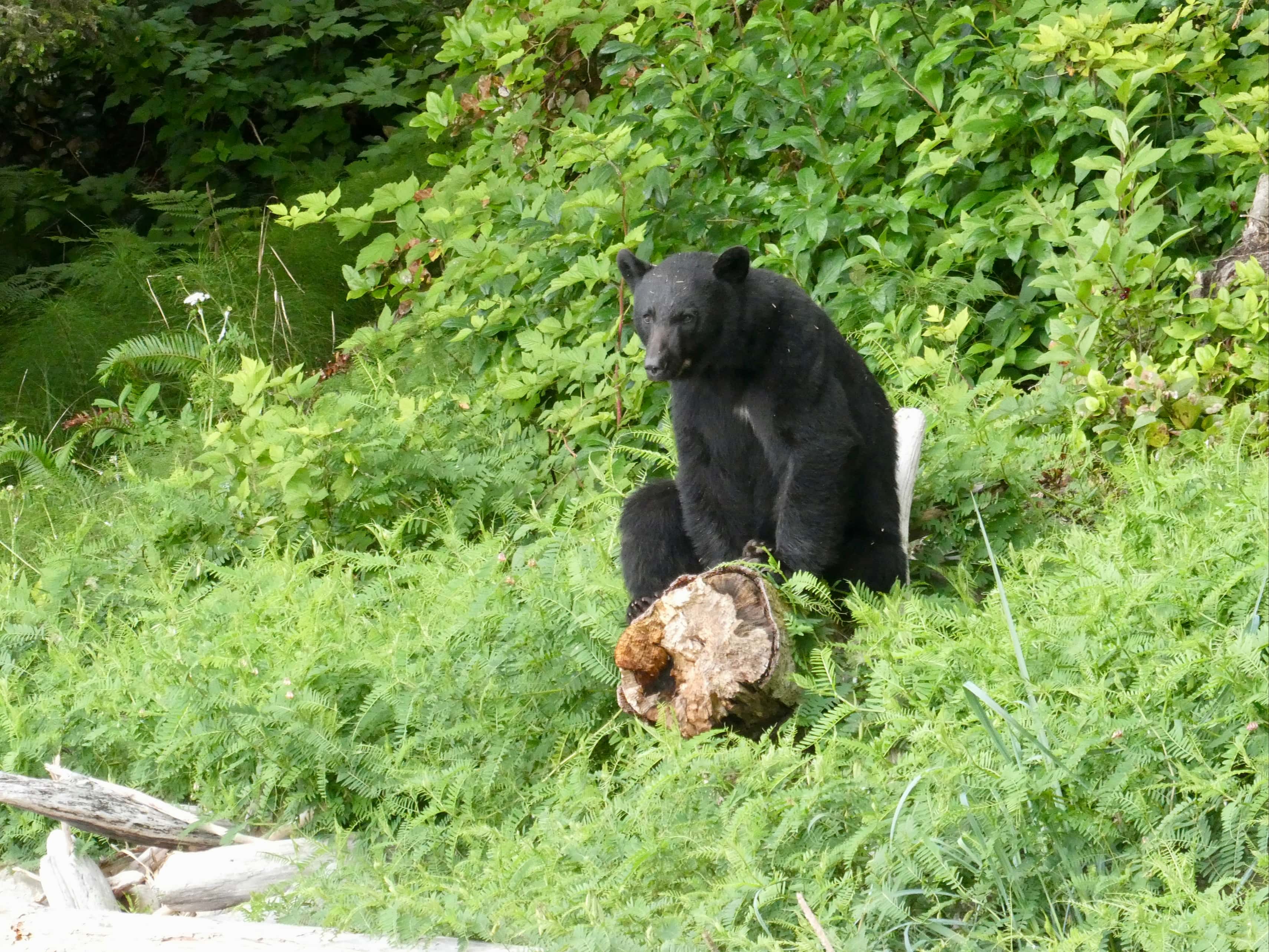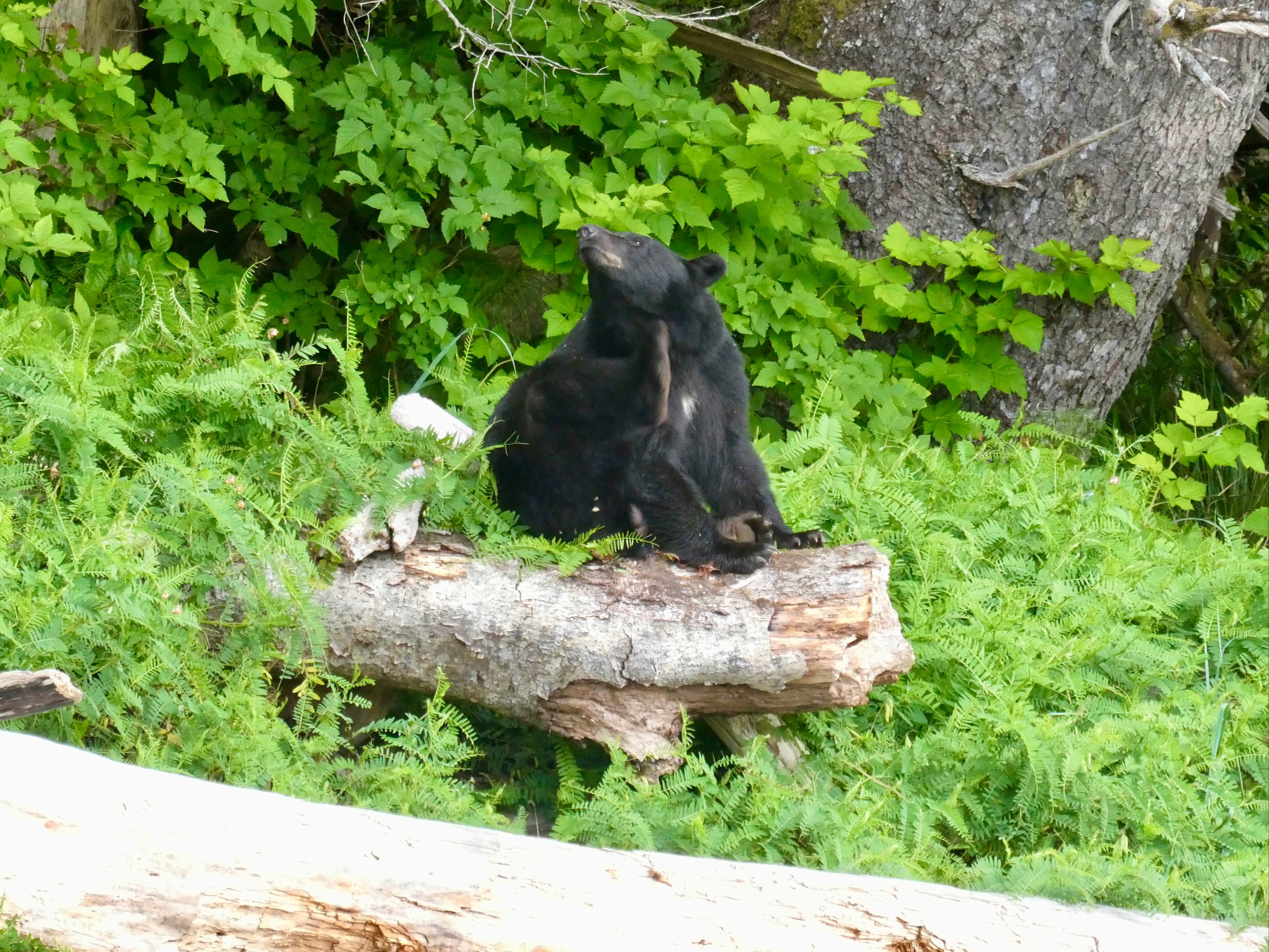 Within about half an hour of setting out, we came across a black bear perched on the end of a log at the edge of the trees. He seemed to be resting and watching the world go by. Anna, who was in the lead, walked by without noticing him. I happened to look up and there he was. I held up a hand and warned the group. Once everyone had their eyes on the bear we slowly moved past at a safe distance. I got my camera out as we did this.
