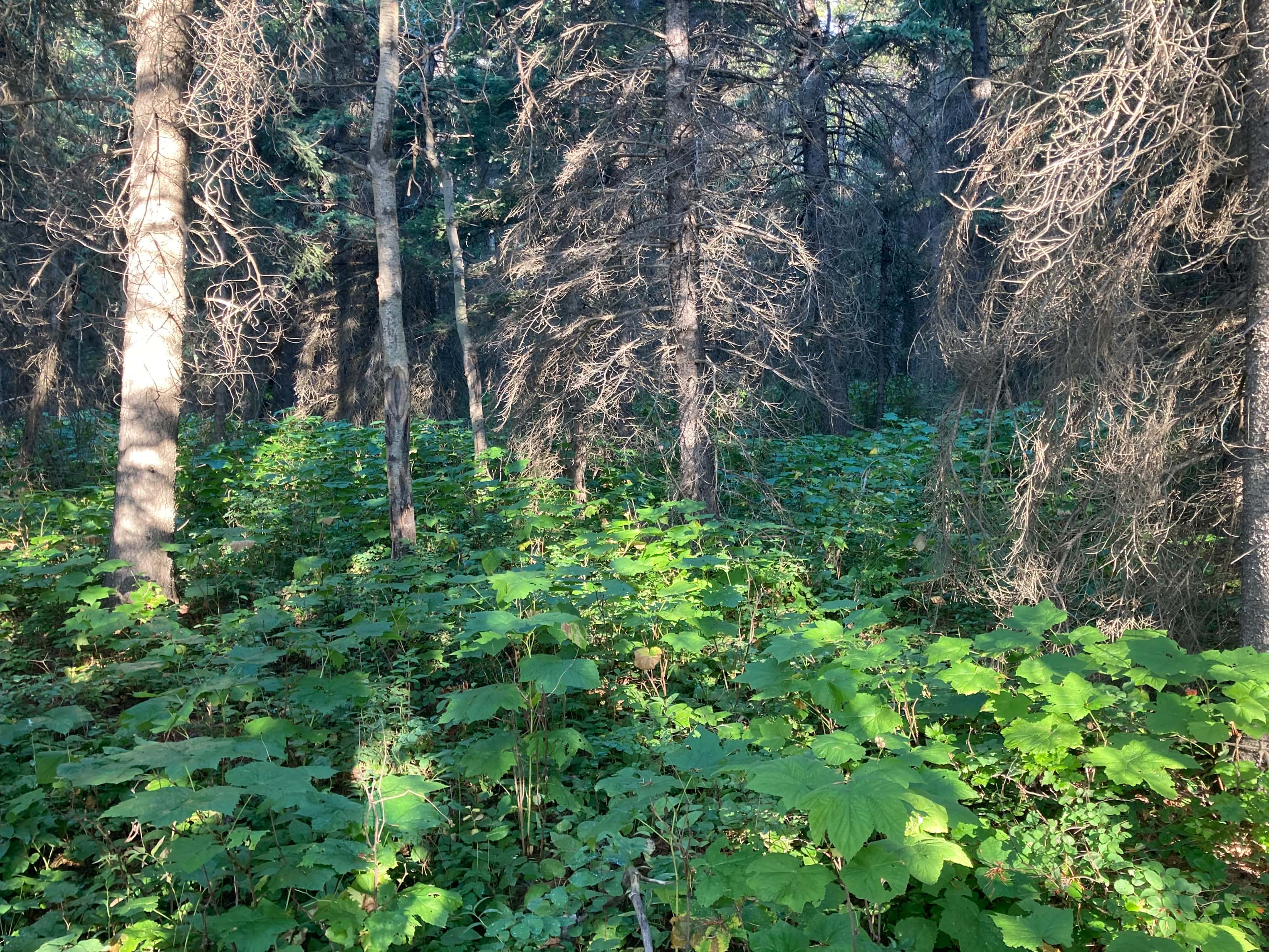 To get started, I drove towards the Castle Mountain Ski Resort and parked at the Syncline Barnaby Staging area. It’s a few years old now but still doesn’t appear if you search its name on Google Maps. Click here to see where it is. As of this writing the satellite picture shows the parking lot and Google Maps acknowledges that it is the new trailhead for the Southfork Lakes trail, but doesn’t have it referenced by name or show it as the trailhead for the Syncline Brook Trail. Once I’d parked, I walked back up the highway to the northeast for about 1 km, looking for the place to begin passing through the forest to get to the bottom of the ascent ridge of Syncline Mountain. A GPS track in Topomaps Canada was useful in this regard. There was a tiny bit of flagging on a branch where the GPS track indicated I should enter the forest. I also noticed that this spot was very close to the 2nd blue metal cage I encountered along the roadside which protected some bits of utility infrastructure.