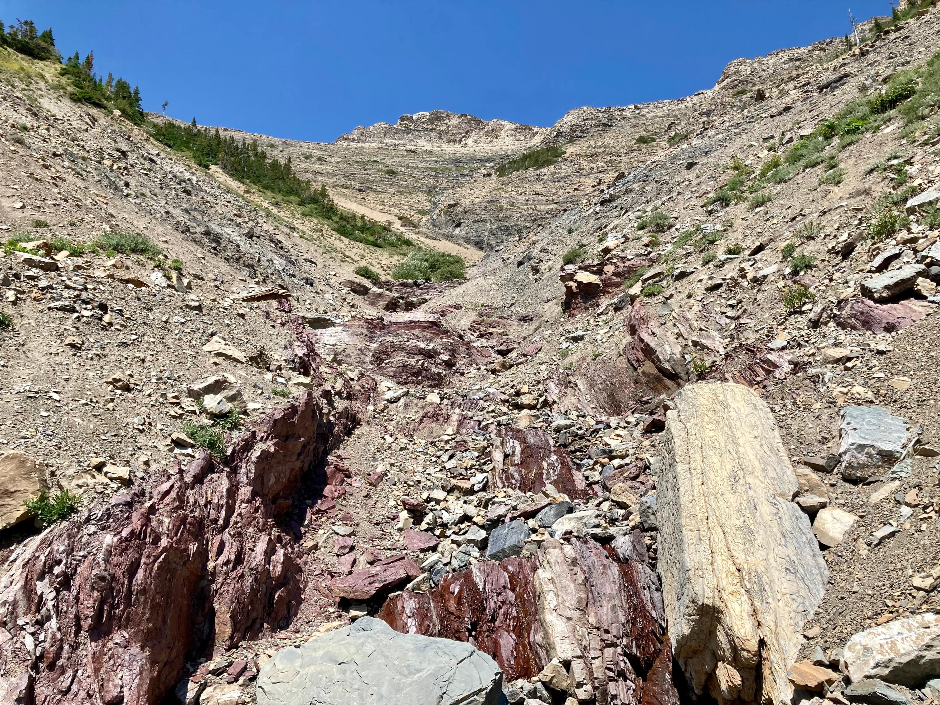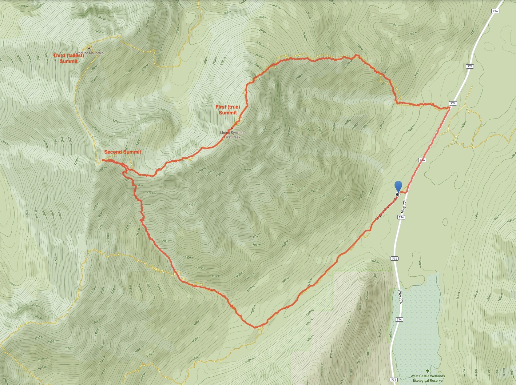 Nugara describes the route for Syncline Mountain in More Scrambles in the Canadian Rockies 3rd edition. The mountain has 3 summits, and the eastern-most is the true summit. It’s also the lowest of the three. I’m not sure how the lowest summit becomes the true summit, and Google hasn’t been helpful in this regard. Proceeding clockwise along the connecting ridges, one can go from the first to the second summit after bypassing some large intervening rocky outcrops. From there, the route involves areas of difficult but avoidable scrambling before reaching the third summit. I paid particular attention to Nugara’s suggested descent routes. If one was planning to go beyond the first/true summit, then simply retracing your steps was not ideal. If you made it all the way around to the third summit, one option was to descend into the valley south of that peak and follow the cheerfully named Suicide Creek to some ATV trails. Doing so, apparently, would involve some nasty bushwhacking. Another option was to return from the third summit to the col between the first and second summits, then drop into the valley south of the col and follow the drainage down to Syncline Brook Trail, which would easily lead back to the highway. Of course, this was also the best descent if one only made it as far as the second summit. This descent route seemed a much better option to me. I’d been down in that drainage and followed Syncline Brook Trail before when I climbed St. Eloi Mountain.